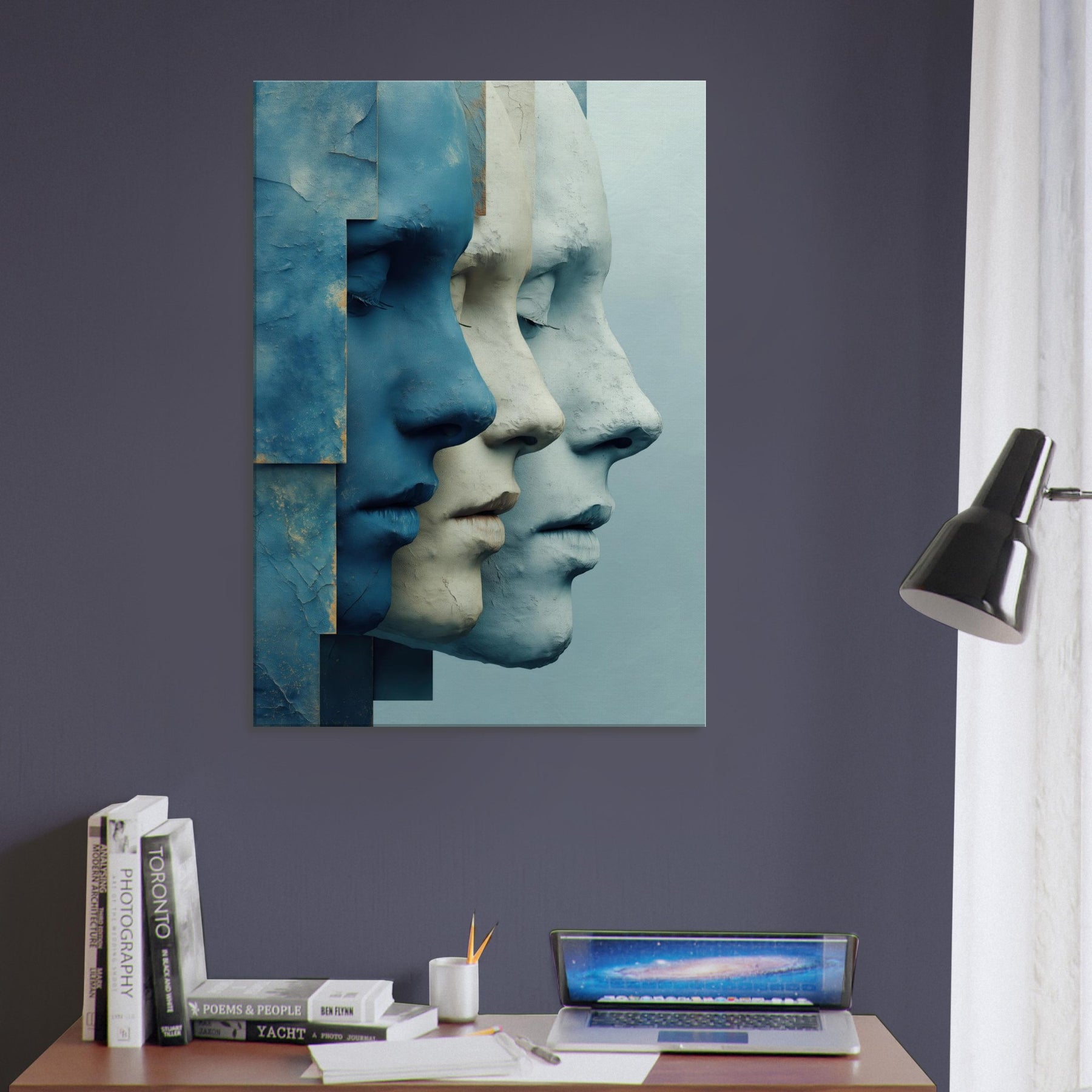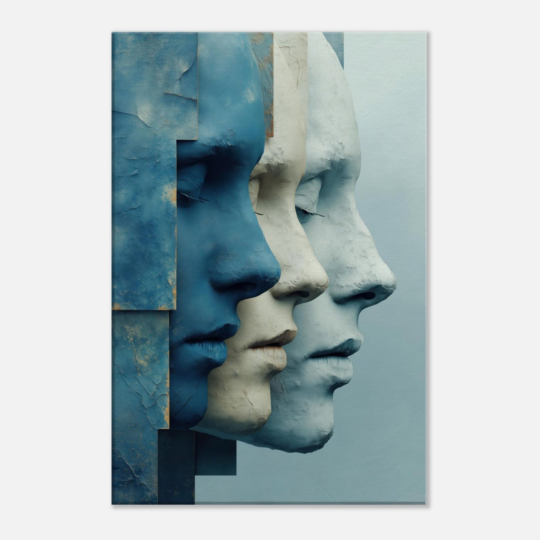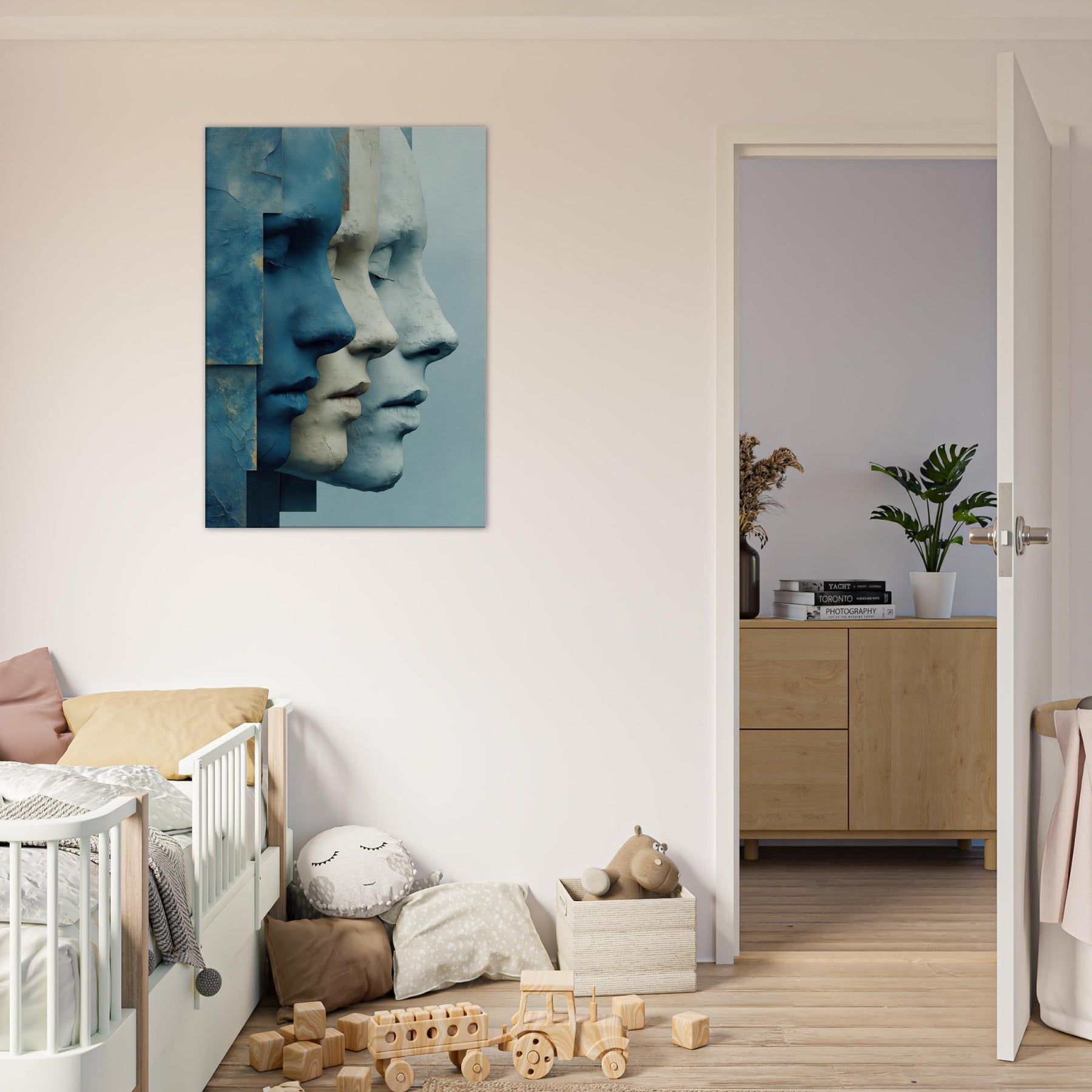 Bauhaus Blocks unfolds as a quiet procession of sculpted profiles, where architectural blocks meet human form in a surreal, dreamlike sequence. The Primary Subject, Bauhaus Blocks, is rendered in cool blues and ivory with weathered texture, inviting a slow, tactile gaze. In a living space, this piece softens hard edges with its layered rhythm, casting calm shadows and a sense of depth that elevates a sofa or console. It pairs geometric precision with lyrical mood, perfect for thoughtful, modern interiors.