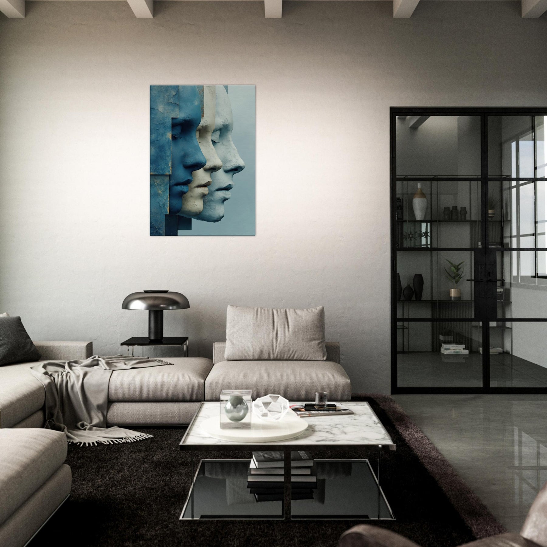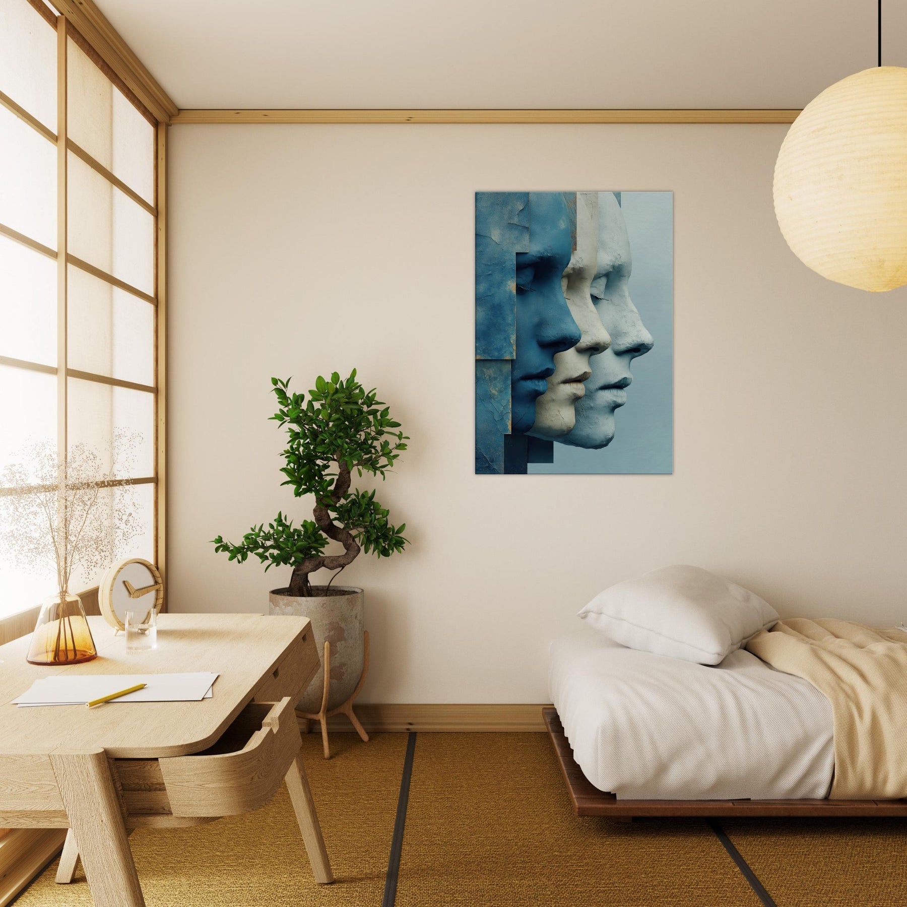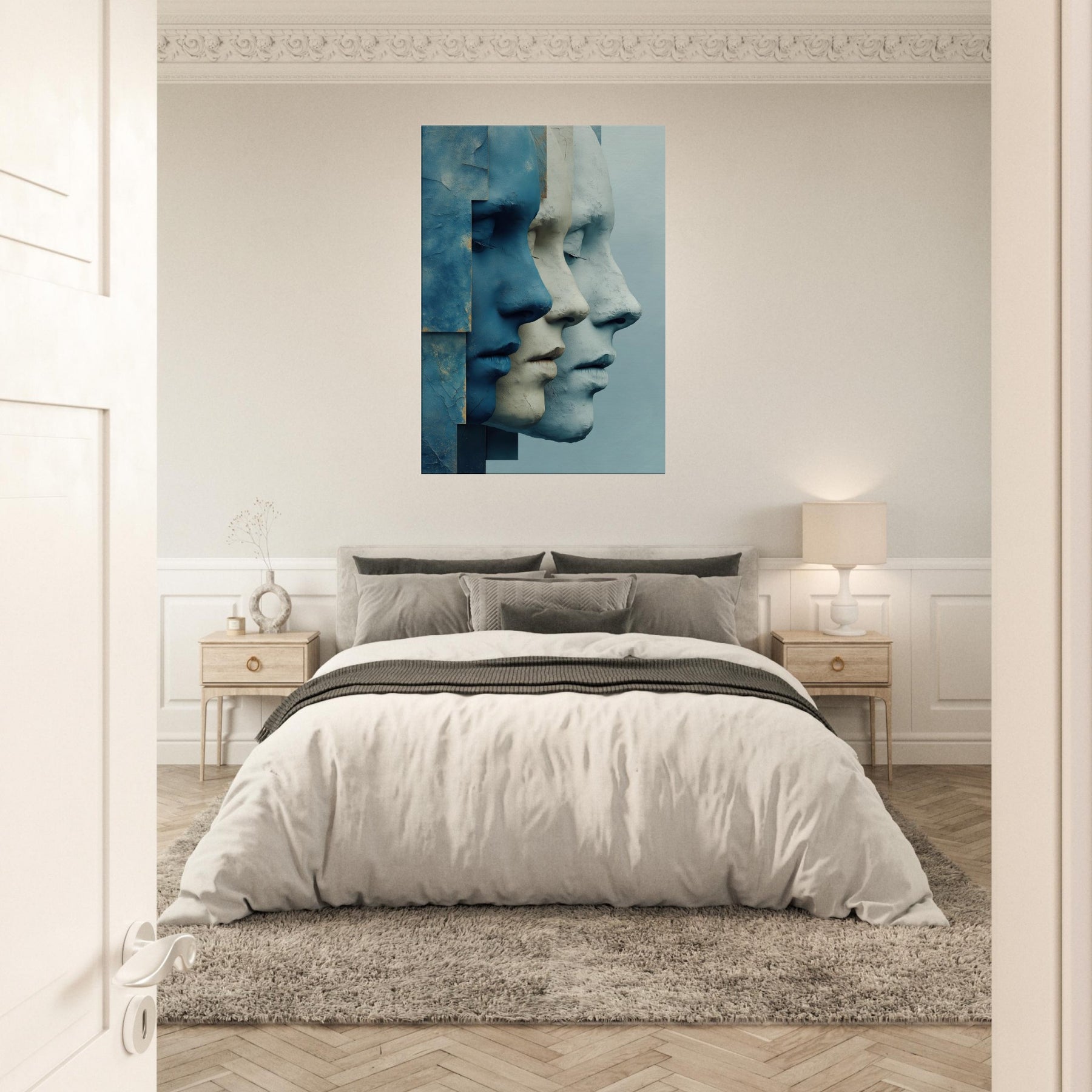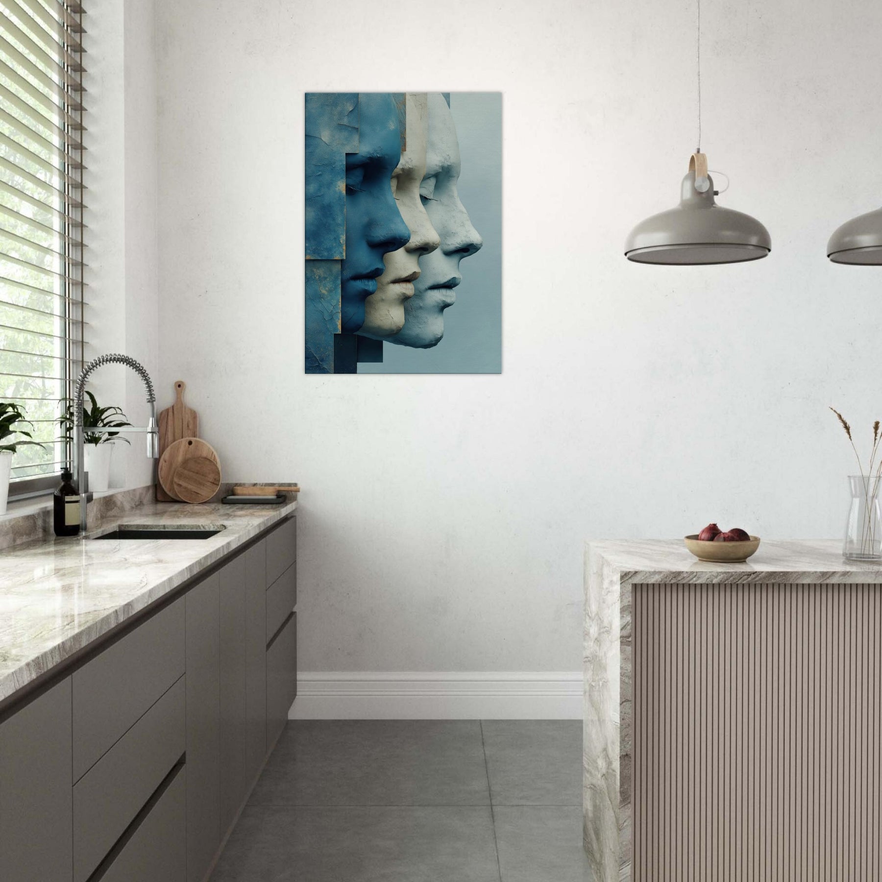 Bauhaus Blocks unfolds as a quiet procession of sculpted profiles, where architectural blocks meet human form in a surreal, dreamlike sequence. The Primary Subject, Bauhaus Blocks, is rendered in cool blues and ivory with weathered texture, inviting a slow, tactile gaze. In a living space, this piece softens hard edges with its layered rhythm, casting calm shadows and a sense of depth that elevates a sofa or console. It pairs geometric precision with lyrical mood, perfect for thoughtful, modern interiors.