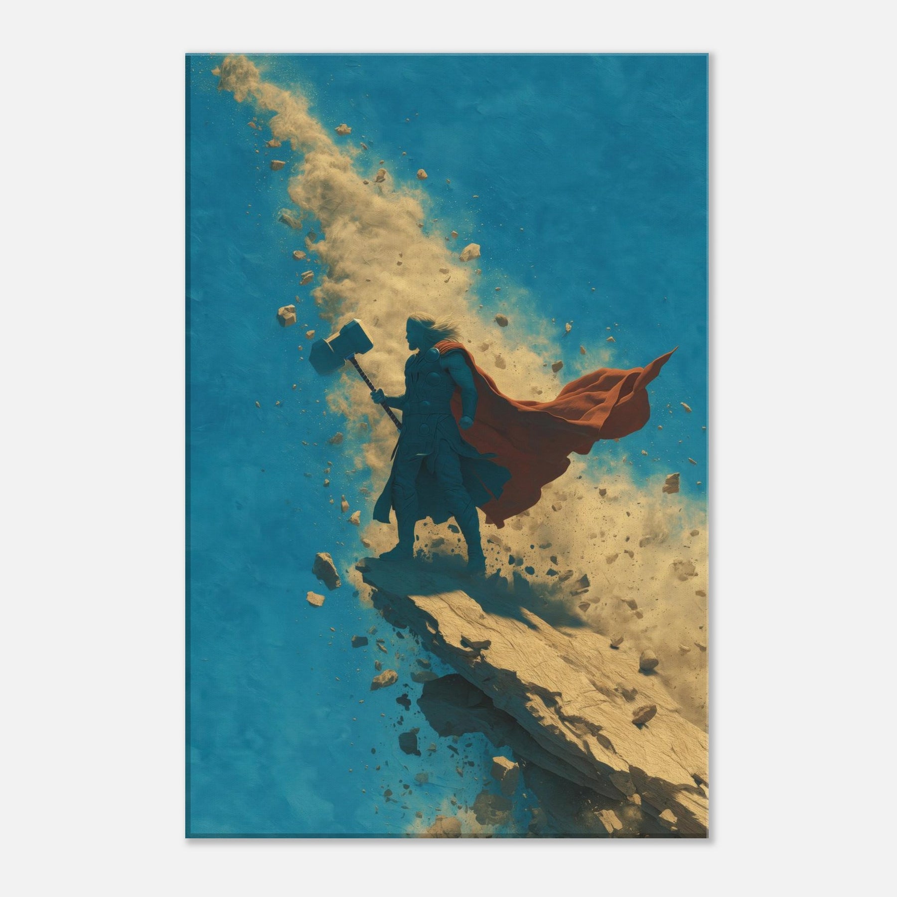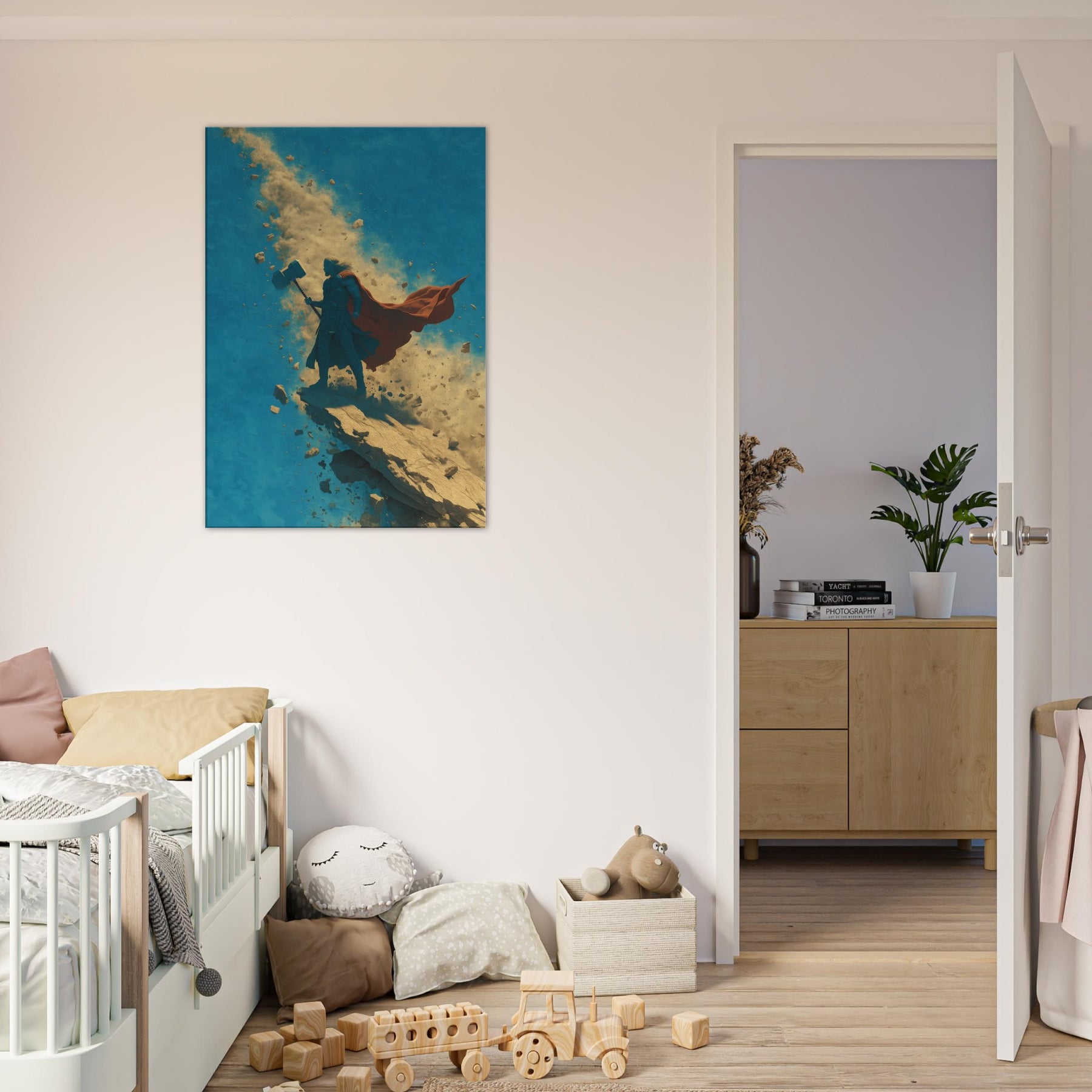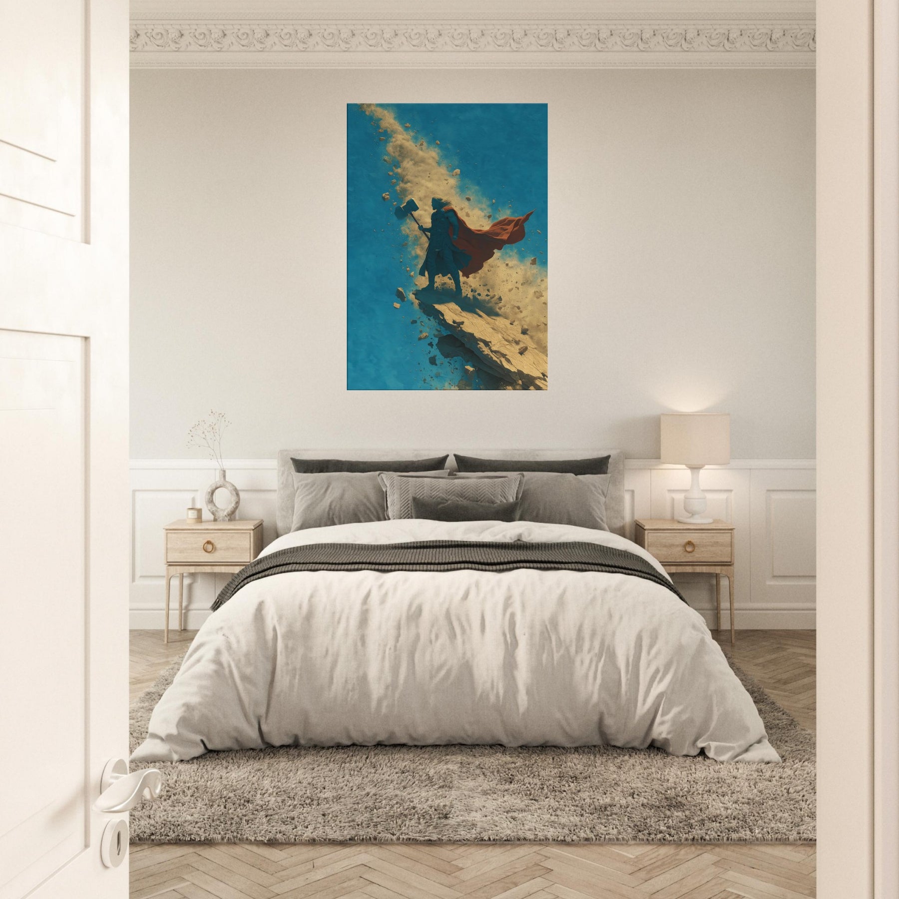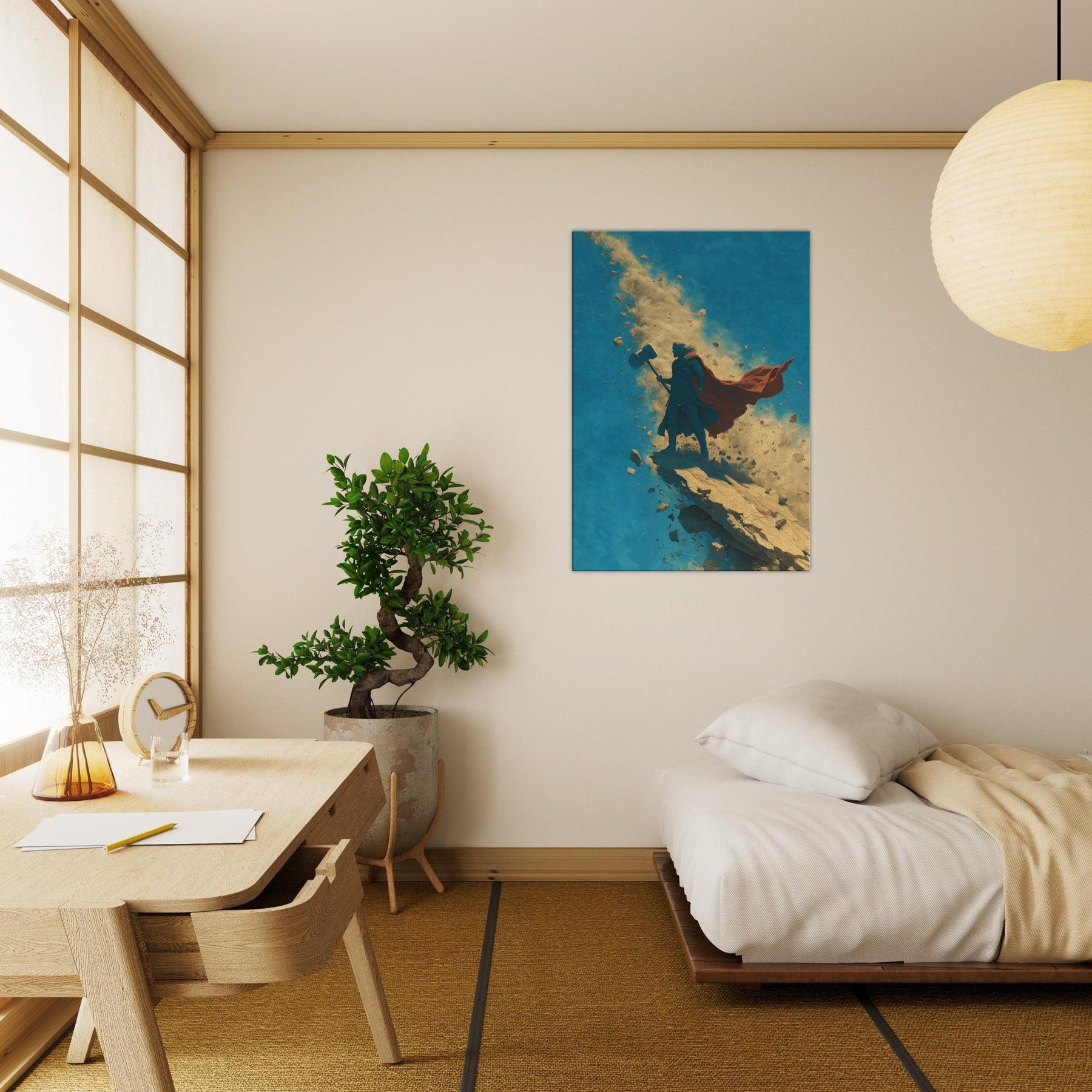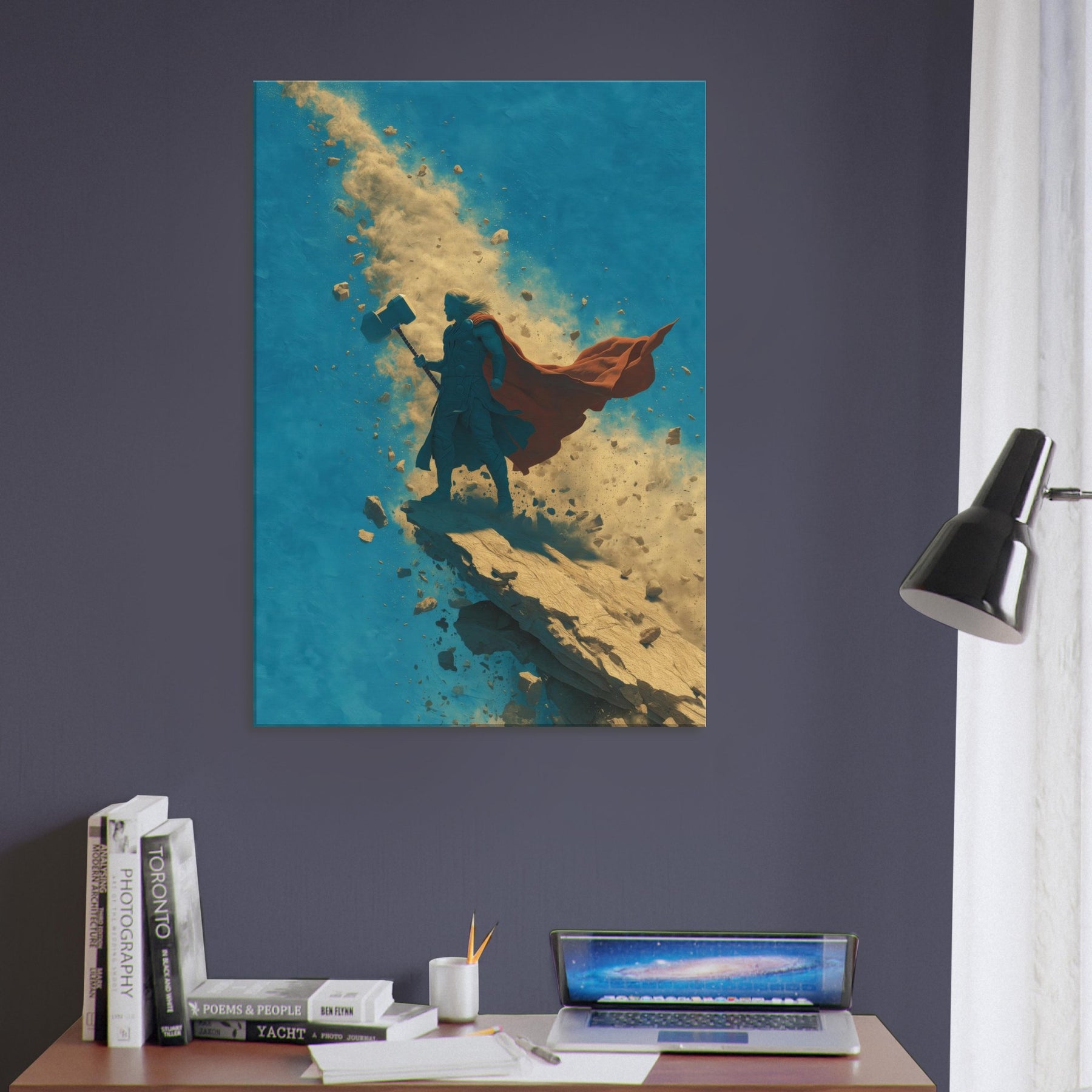 Thor, God of Thunder Wielding Mjölnir strides along a jagged precipice, cape catching the wind as a storm of light and dust swirls behind him. This surreal vision folds myth and imagination into a single moment of power and quiet resolve. The artwork invites a space to breathe between awe and contemplation, a living room or study bathed in color and shadow where the impossible feels near. Let Thor anchor your space with mythic energy, hinting at storms you can almost hear.