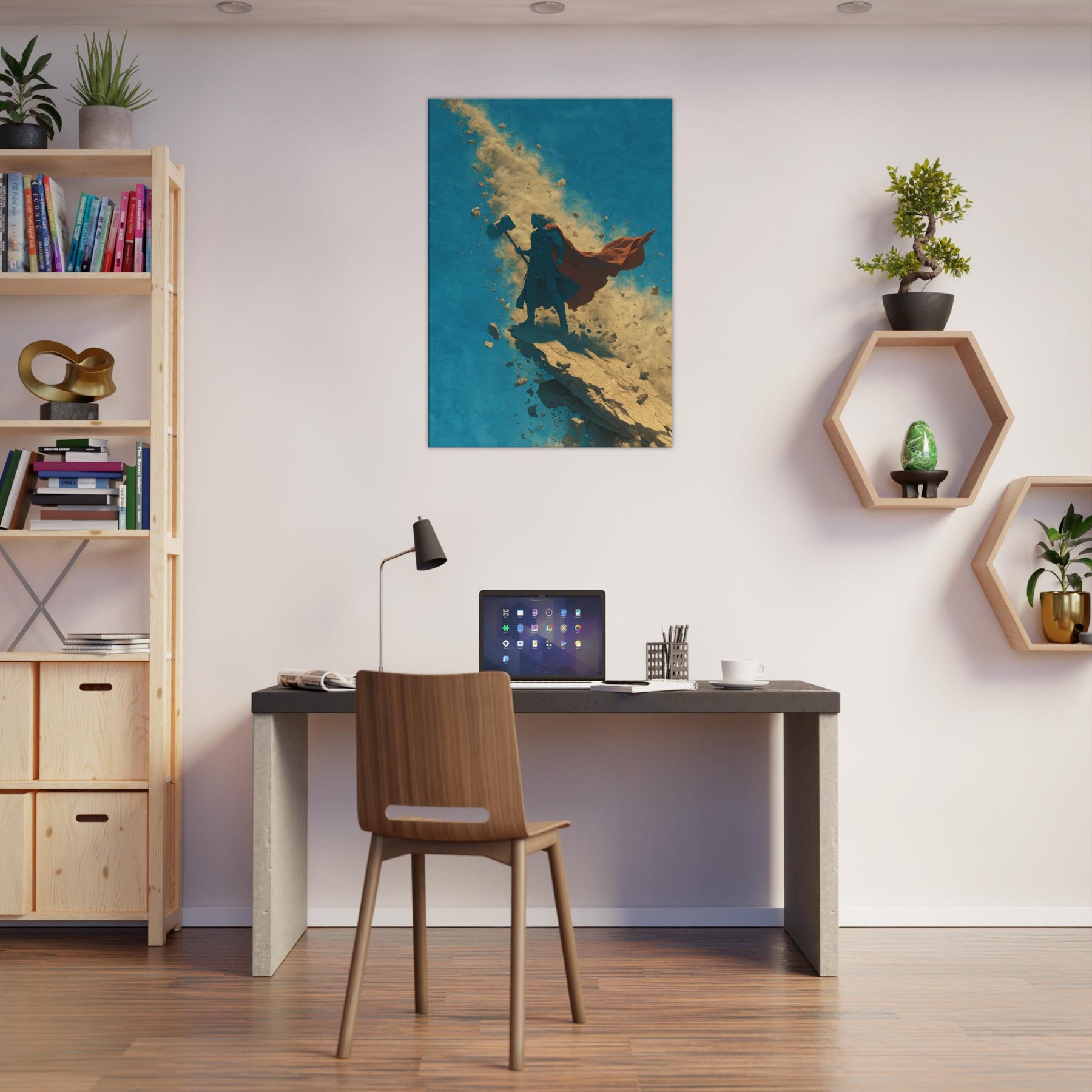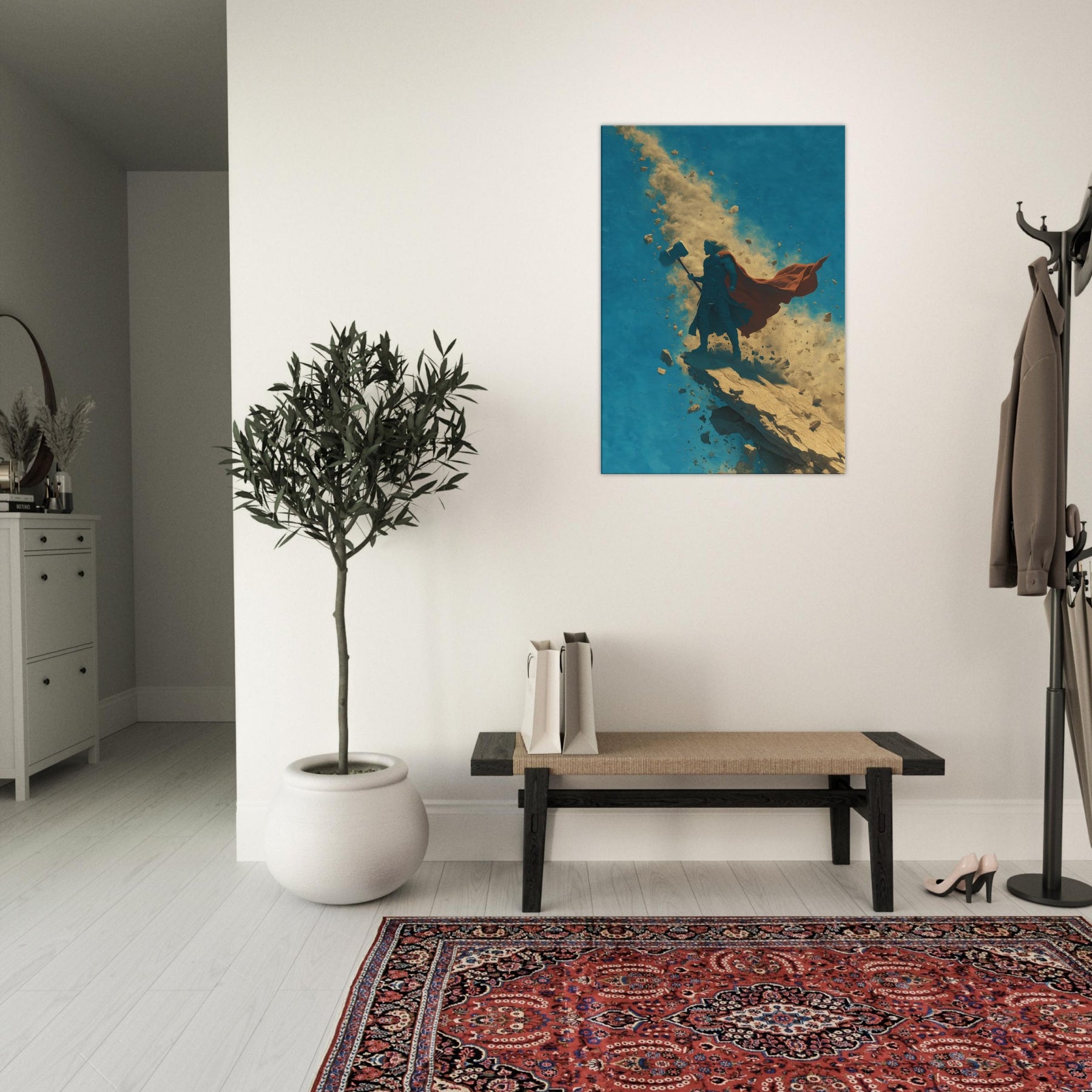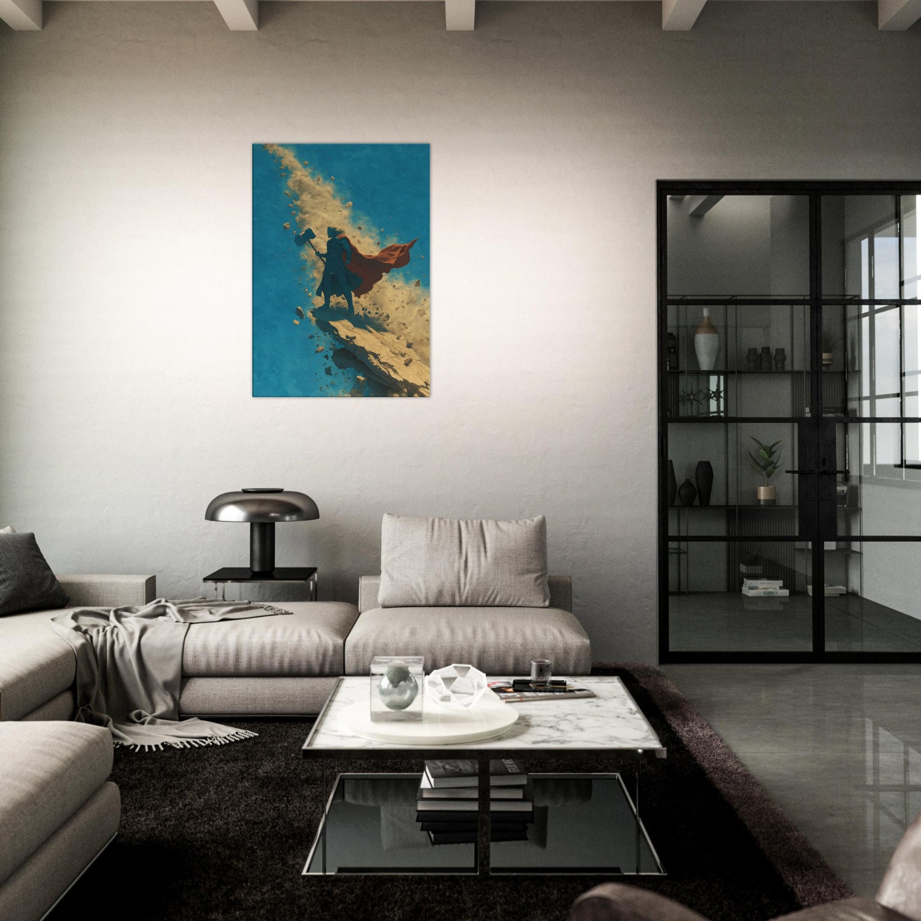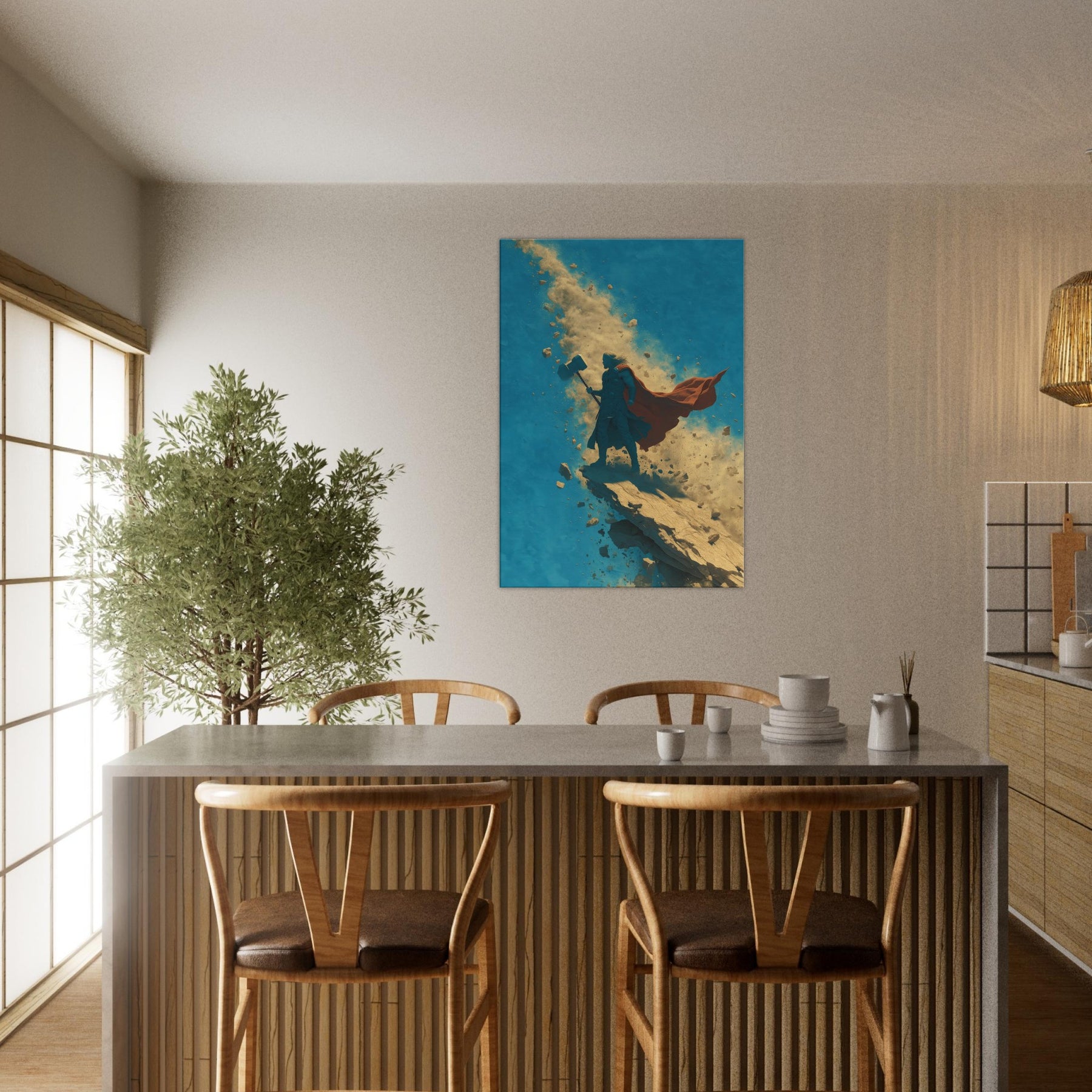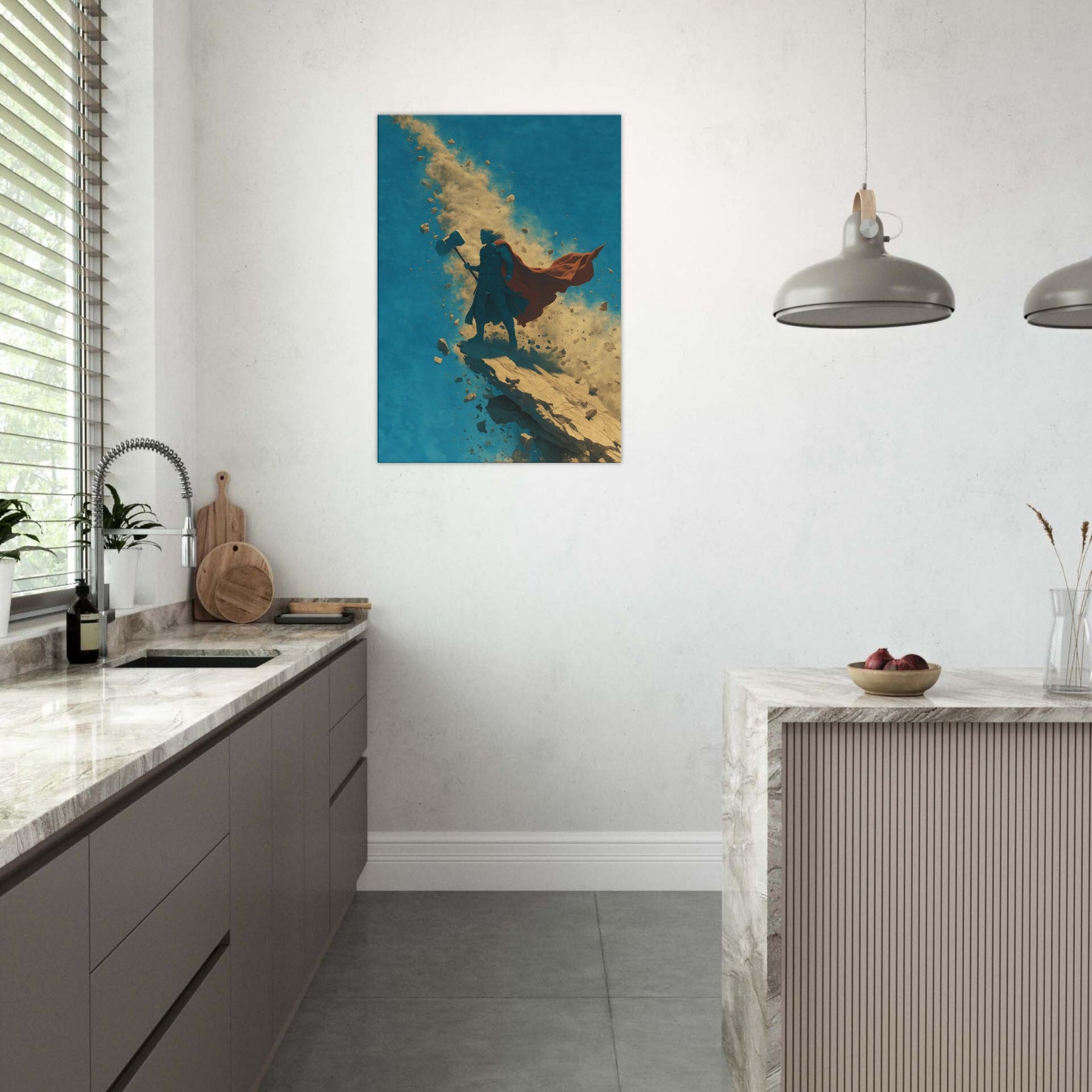 Thor, God of Thunder Wielding Mjölnir strides along a jagged precipice, cape catching the wind as a storm of light and dust swirls behind him. This surreal vision folds myth and imagination into a single moment of power and quiet resolve. The artwork invites a space to breathe between awe and contemplation, a living room or study bathed in color and shadow where the impossible feels near. Let Thor anchor your space with mythic energy, hinting at storms you can almost hear.