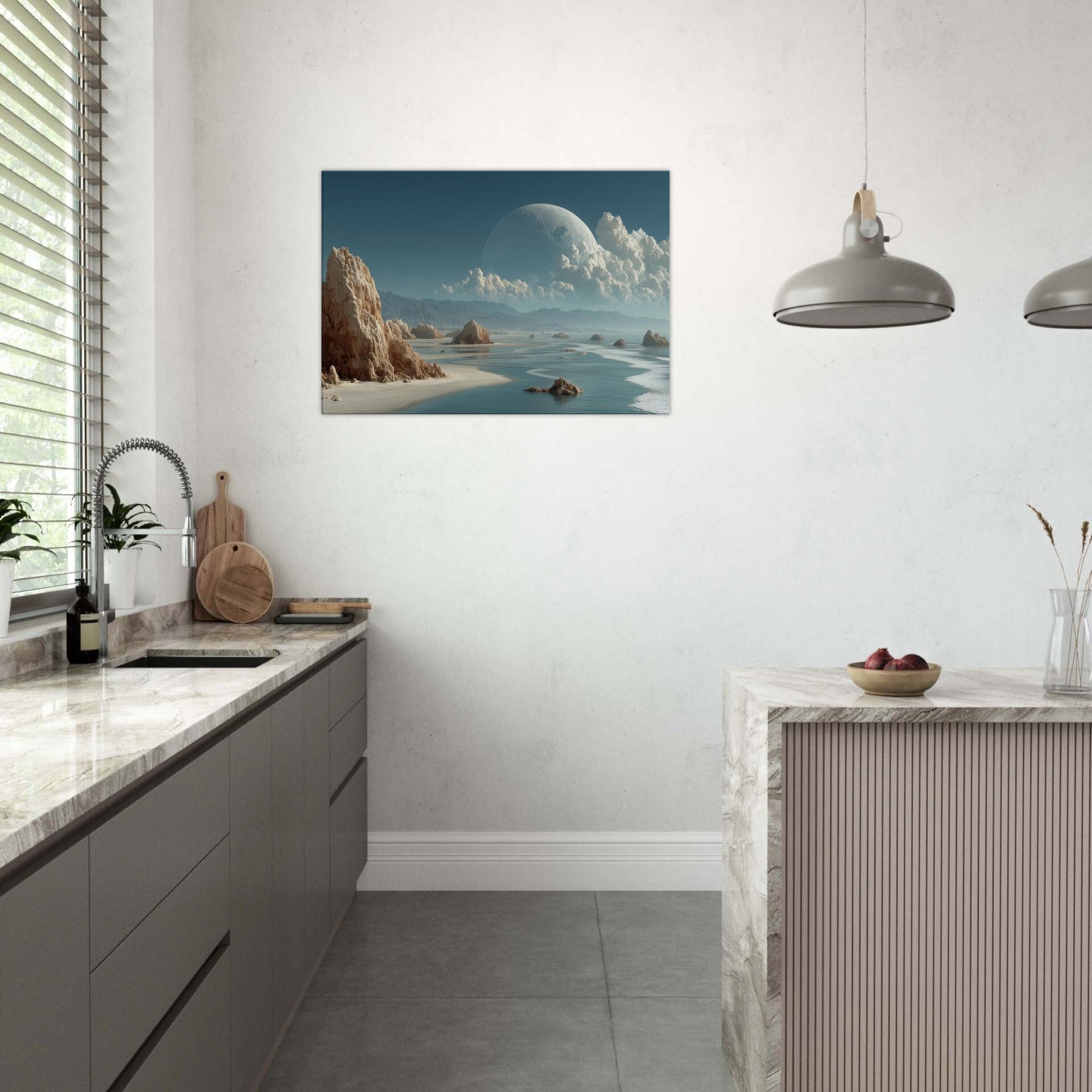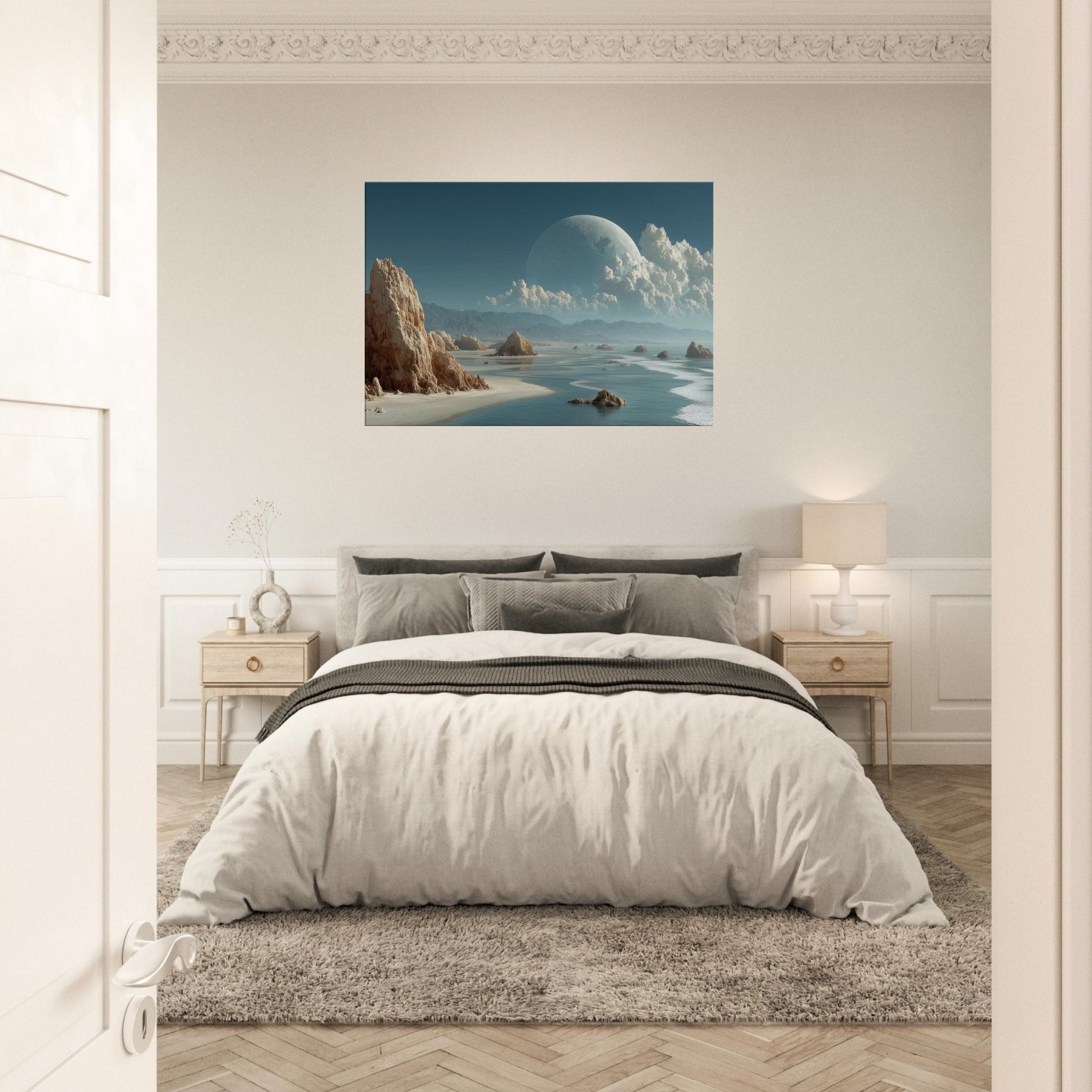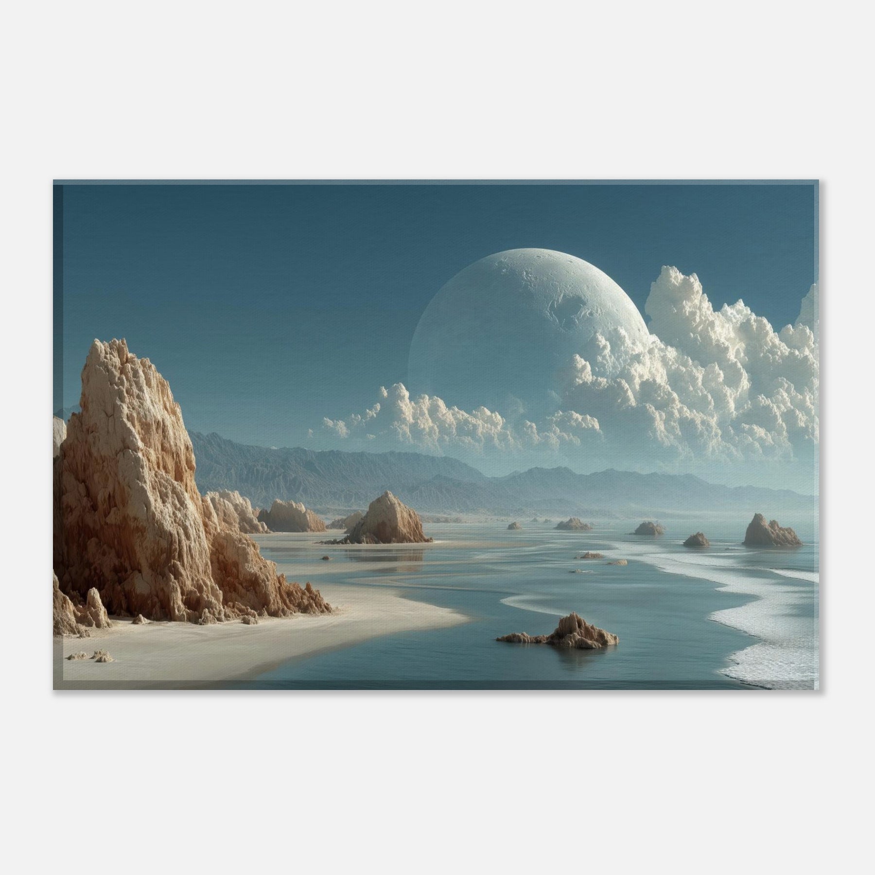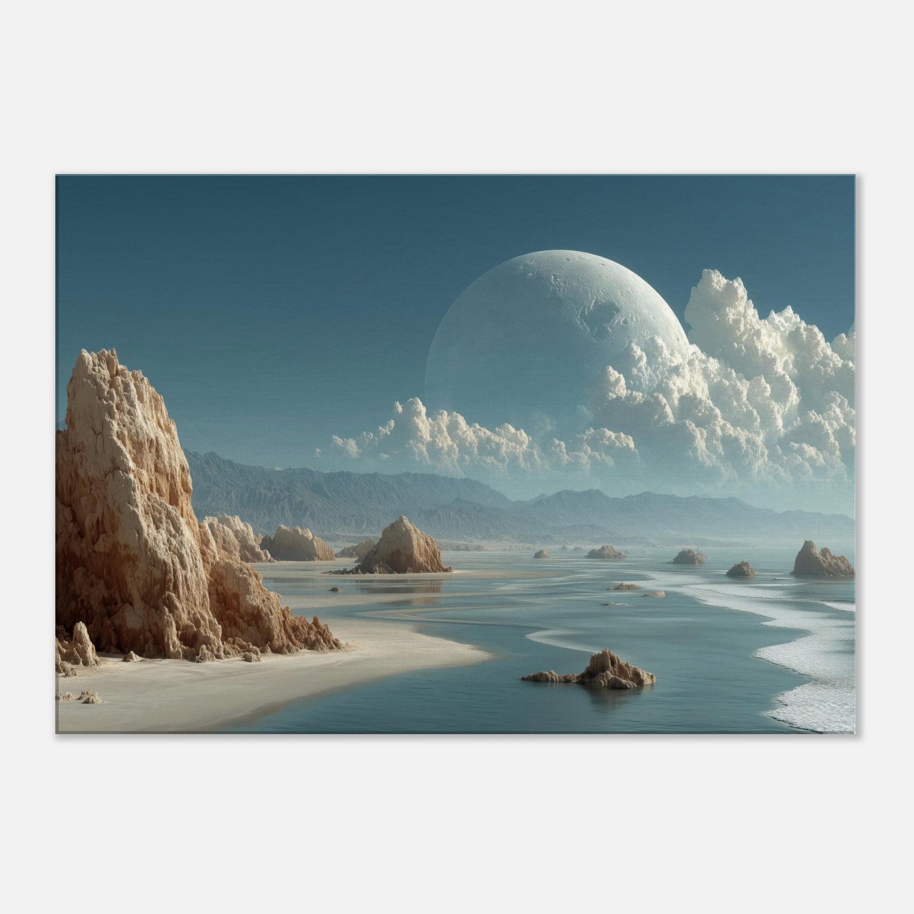 In this dreamlike scene, Coastal Dunes rise as weathered sentinels against a sea of glass and ash. The surreal composition threads a quiet coastline with a celestial horizon, a colossal pale orb hovering above billowing clouds, casting a tranquil, otherworldly glow. Texture and light mingle like salt and wind, inviting a meditative stillness that softens walls and sharpens breathing. Perfect for living rooms and studios alike, it slows the day, turning everyday space into a sanctuary of imagination and calm.