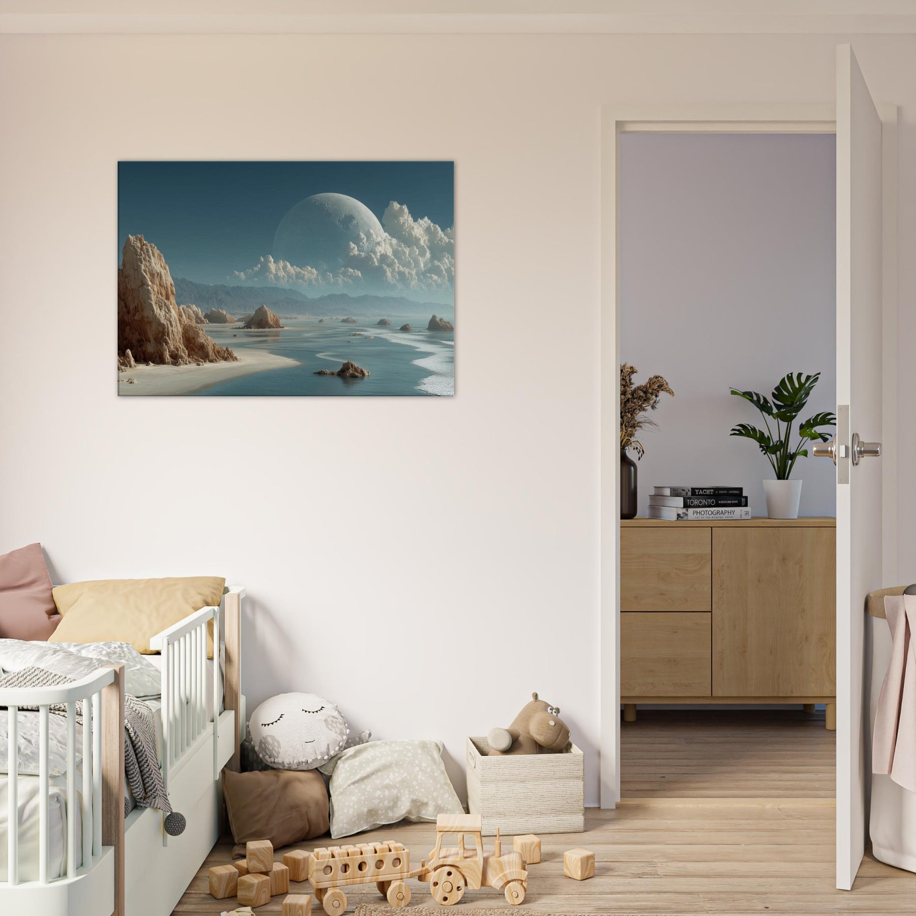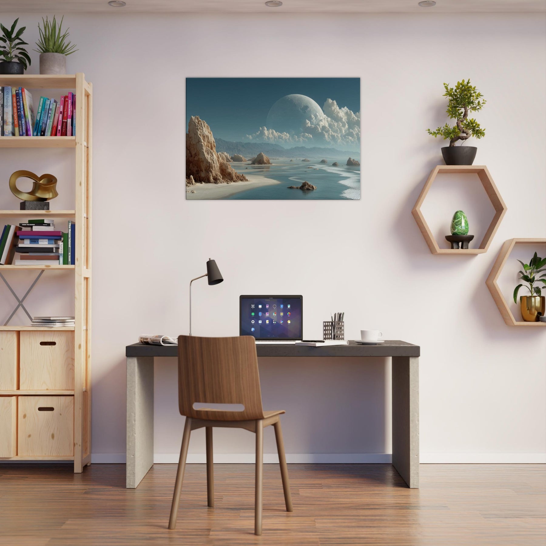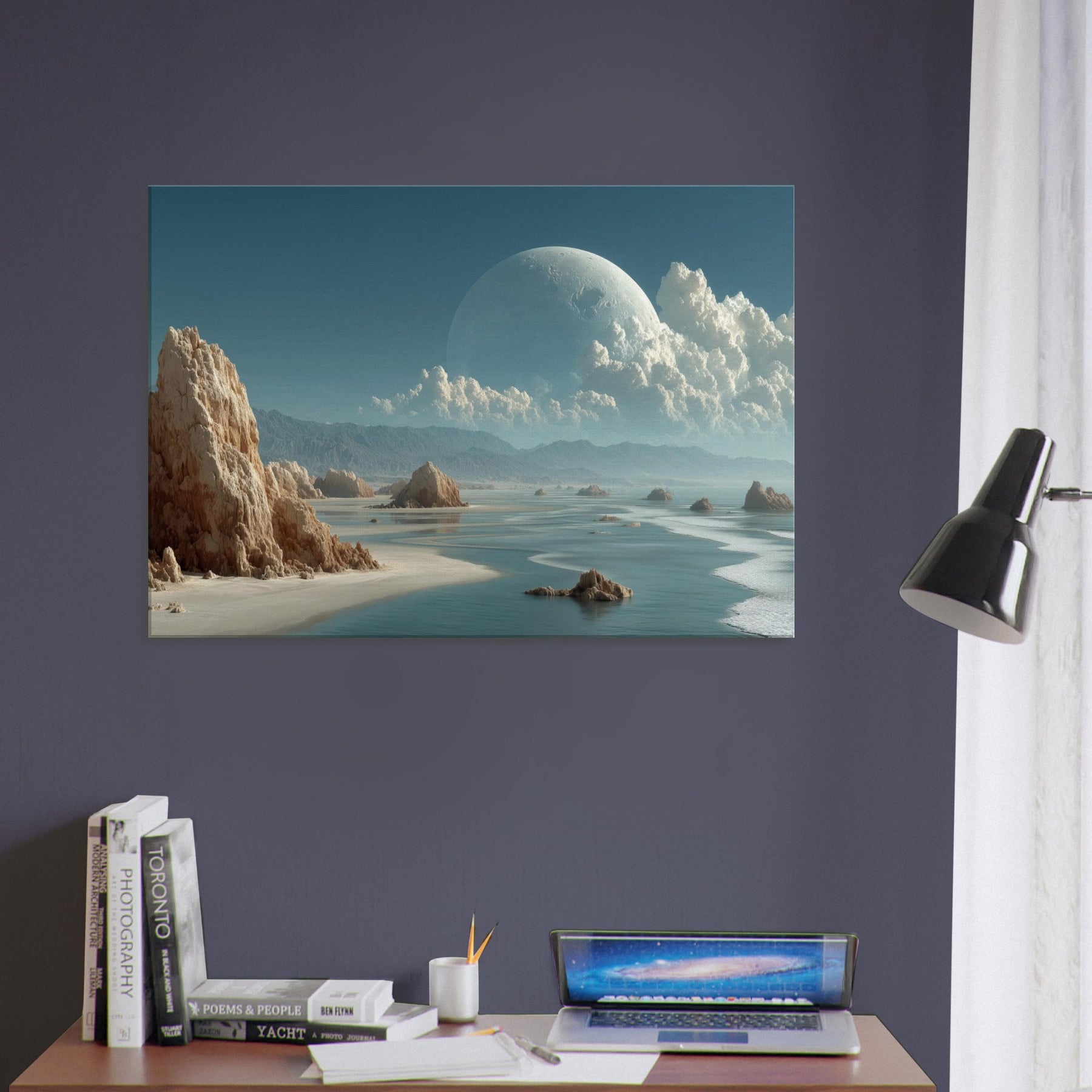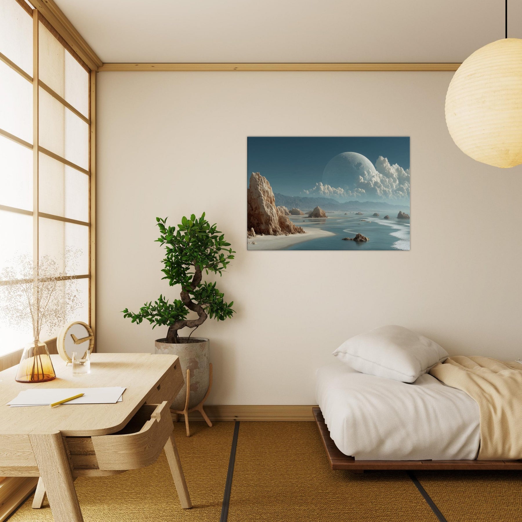 In this dreamlike scene, Coastal Dunes rise as weathered sentinels against a sea of glass and ash. The surreal composition threads a quiet coastline with a celestial horizon, a colossal pale orb hovering above billowing clouds, casting a tranquil, otherworldly glow. Texture and light mingle like salt and wind, inviting a meditative stillness that softens walls and sharpens breathing. Perfect for living rooms and studios alike, it slows the day, turning everyday space into a sanctuary of imagination and calm.