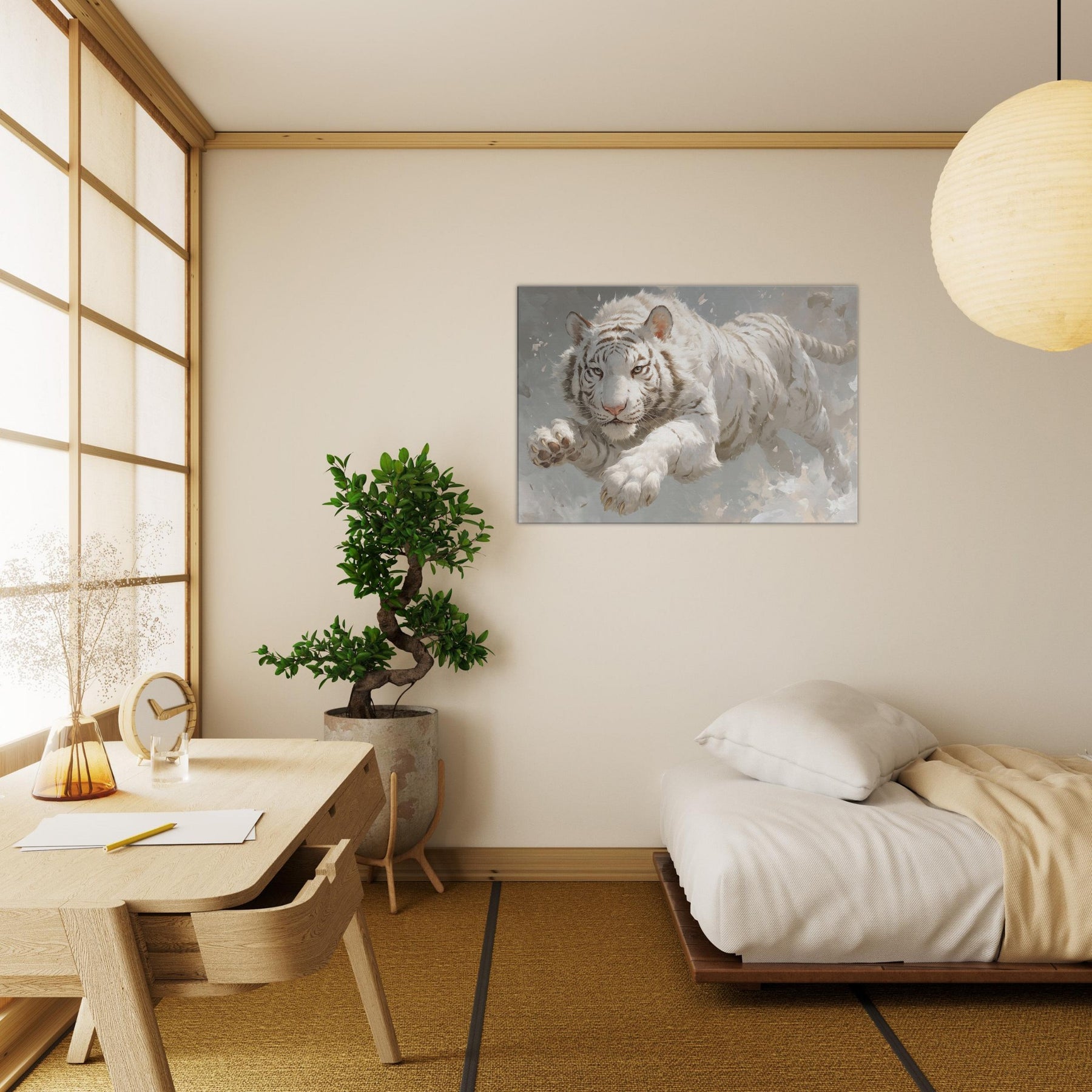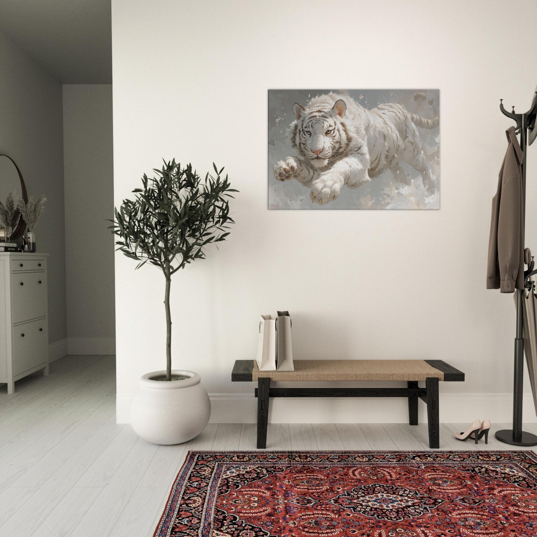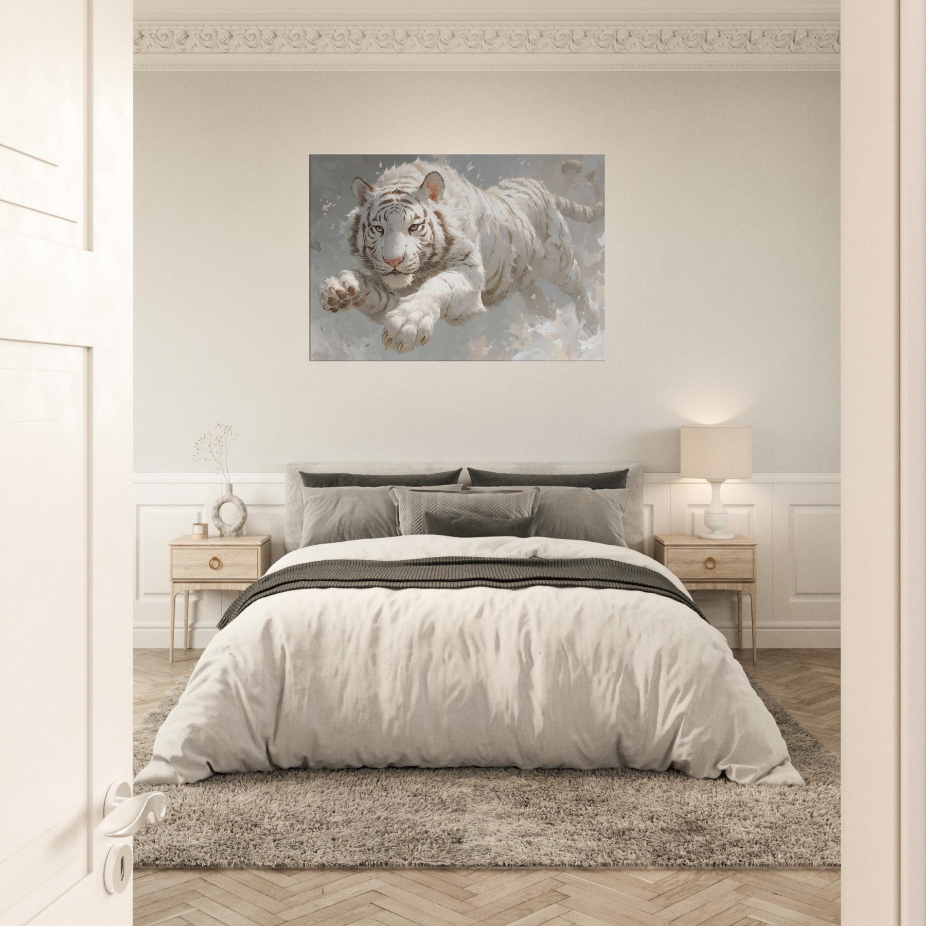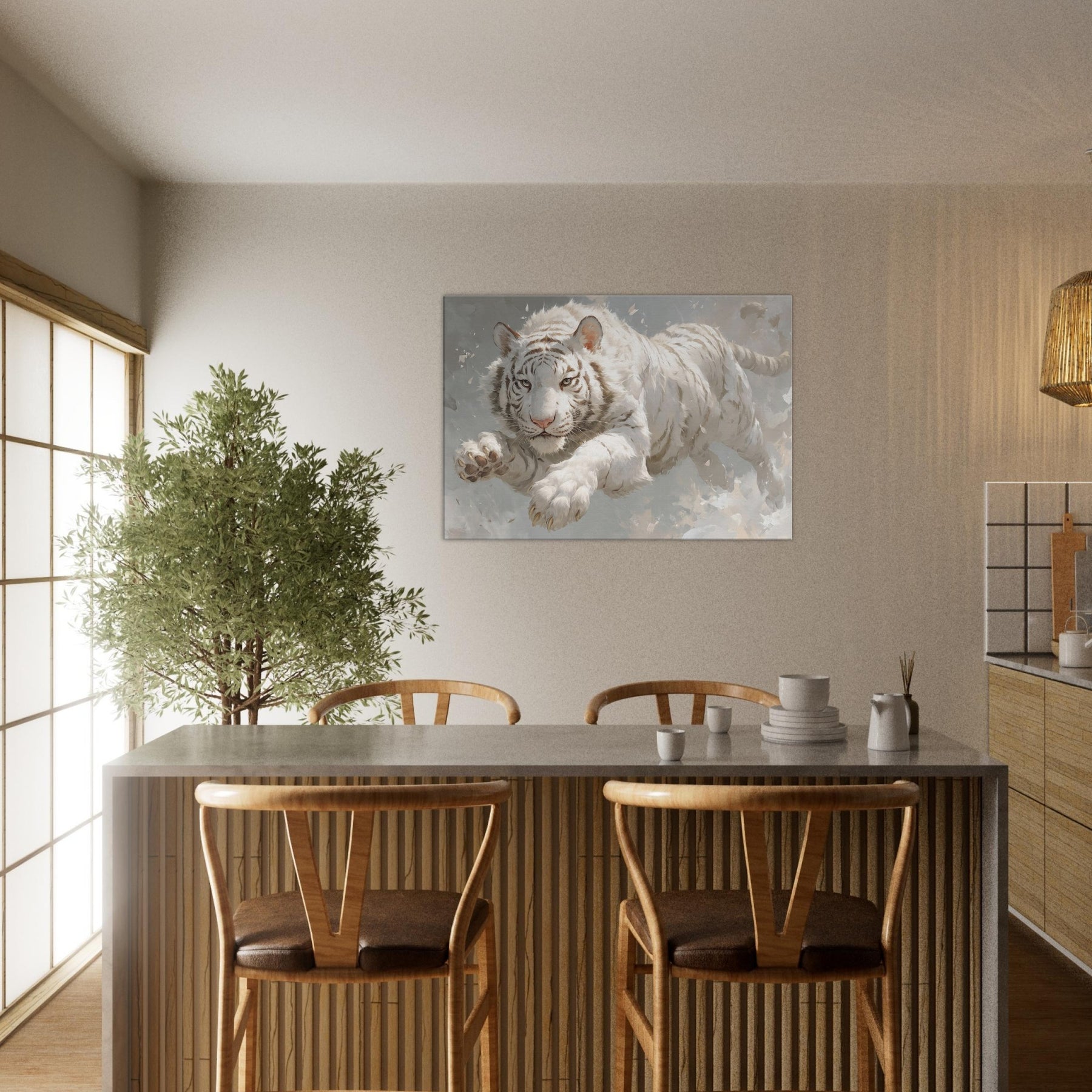 Let the White Tiger of the West, Celestial Guardian of Chinese Mythology, descend through mist and momentum. This surreal, dreamlike image envelops the room in soft, lunar light as the tiger glides toward you, paws outstretched and claws tucked. The painting breathes a hush of snowfall and ancient lore, turning a living space into a mythic sanctuary. Hang it in a lounge or bedroom to invite focus, protection, and wonder where the impossible feels near and every glance unlocks a new facet of calm.