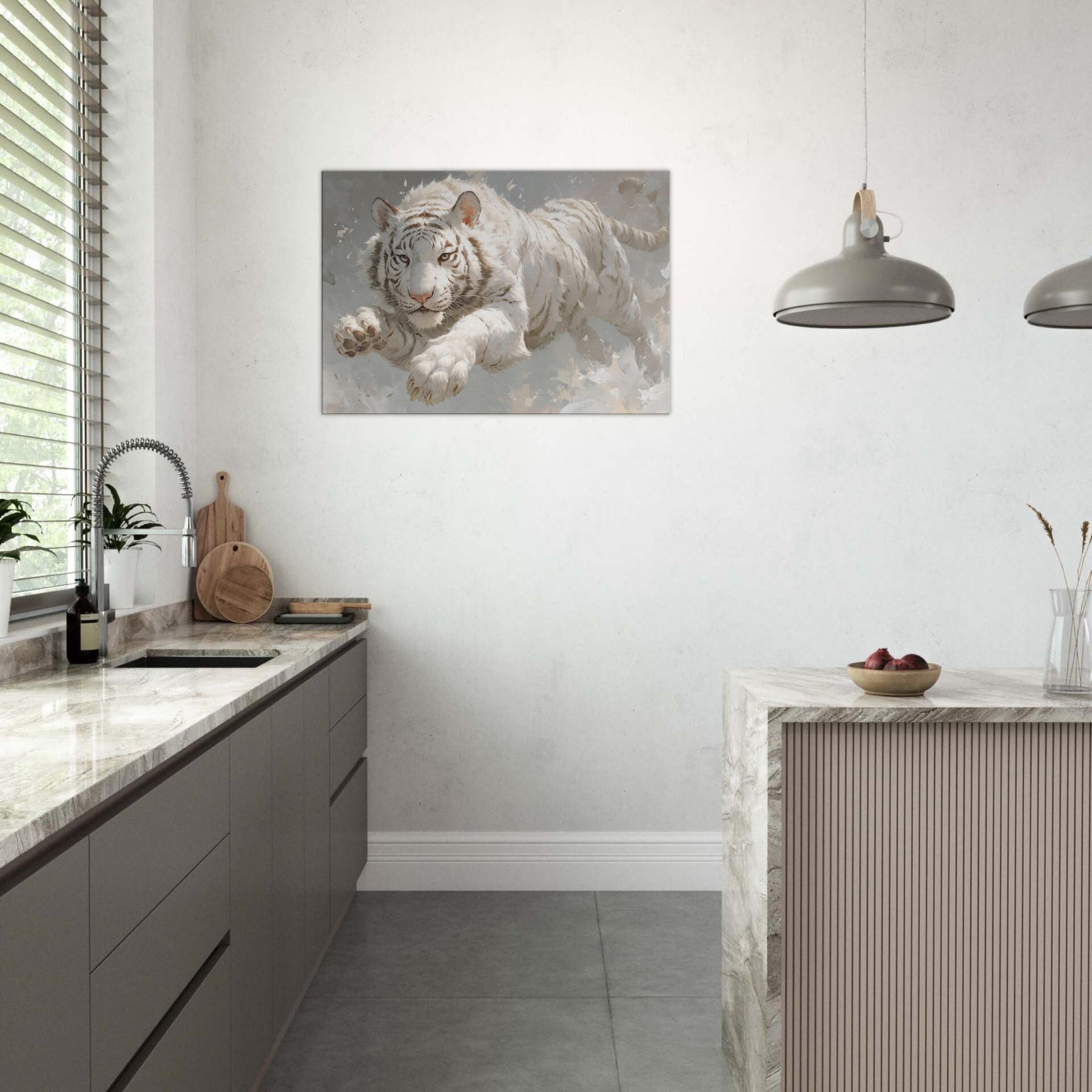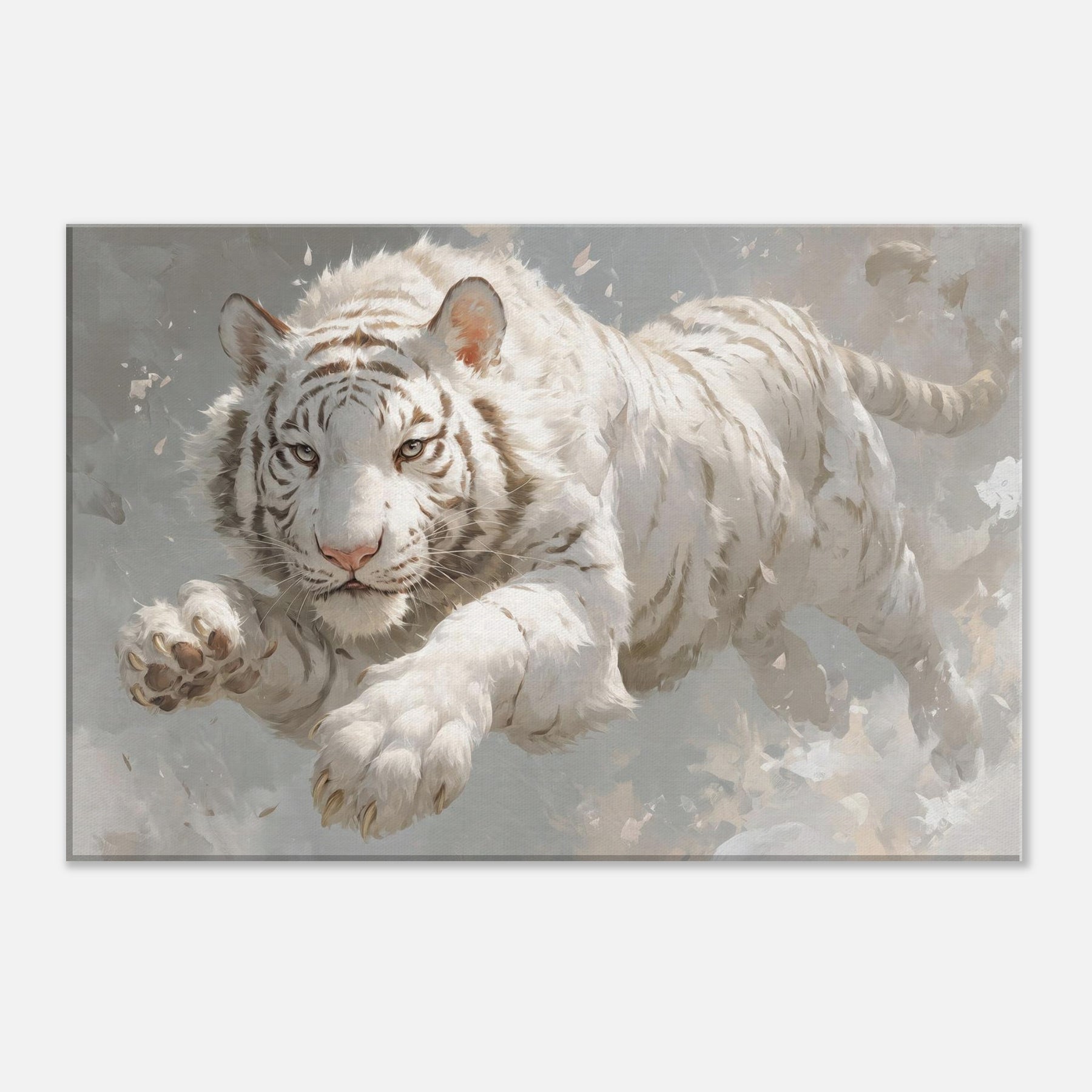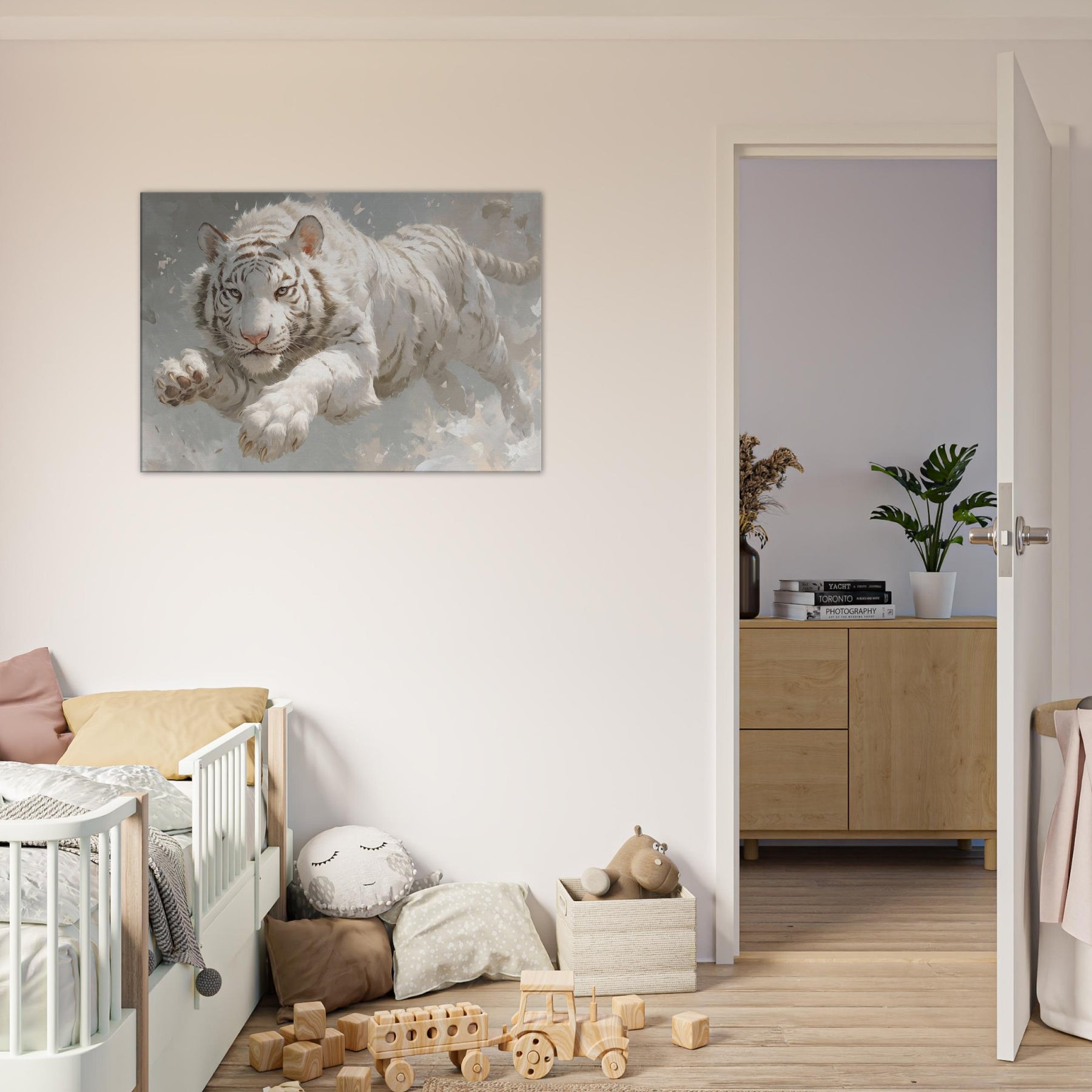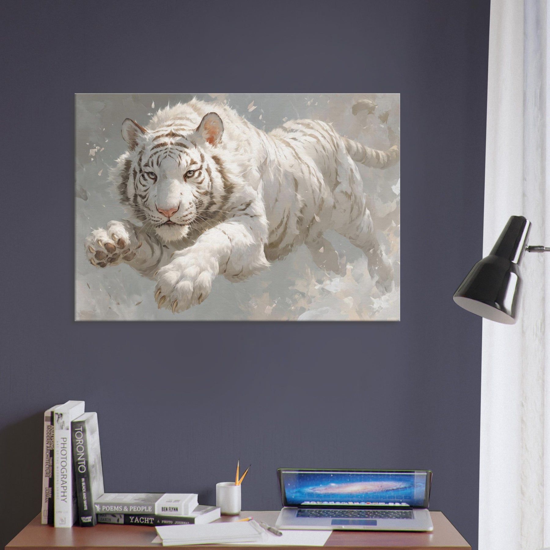 Let the White Tiger of the West, Celestial Guardian of Chinese Mythology, descend through mist and momentum. This surreal, dreamlike image envelops the room in soft, lunar light as the tiger glides toward you, paws outstretched and claws tucked. The painting breathes a hush of snowfall and ancient lore, turning a living space into a mythic sanctuary. Hang it in a lounge or bedroom to invite focus, protection, and wonder where the impossible feels near and every glance unlocks a new facet of calm.