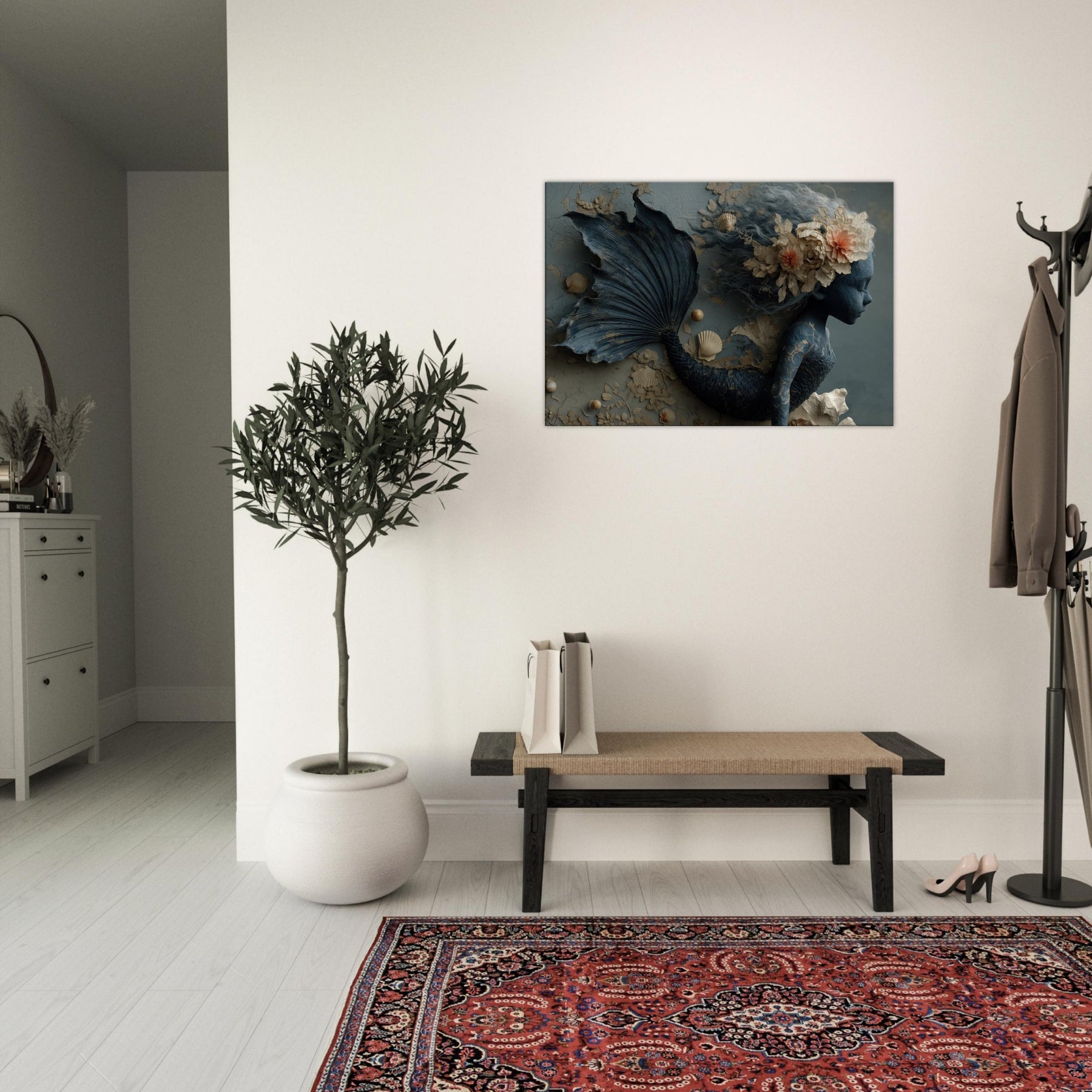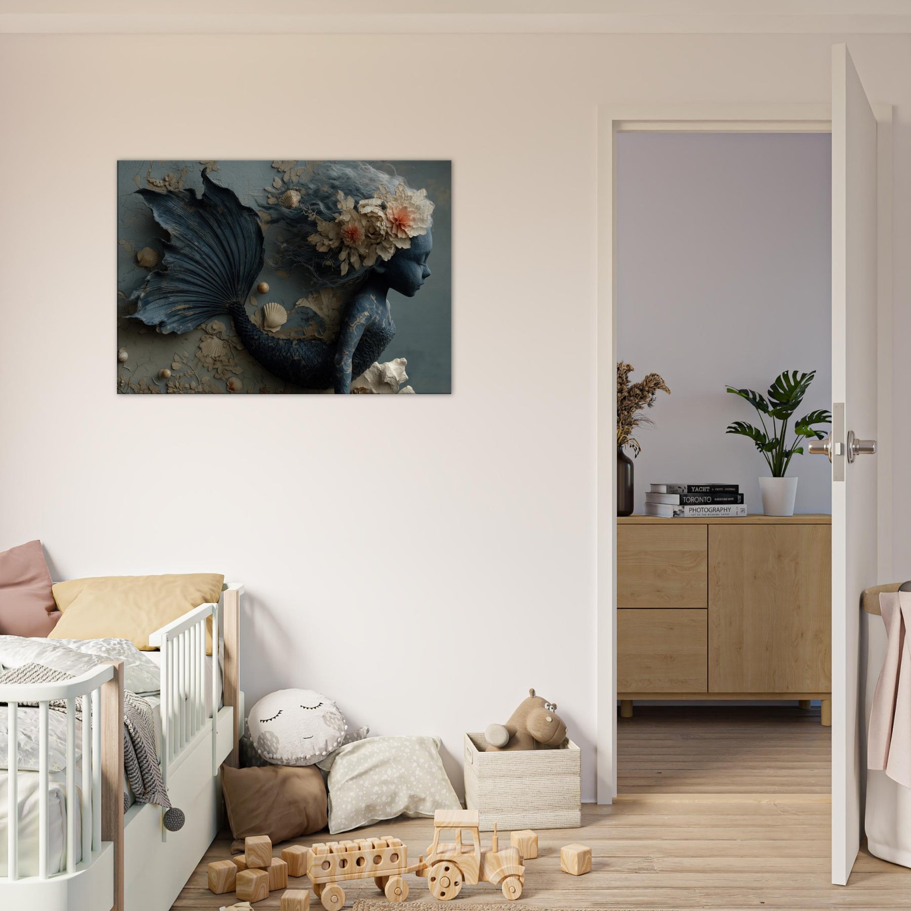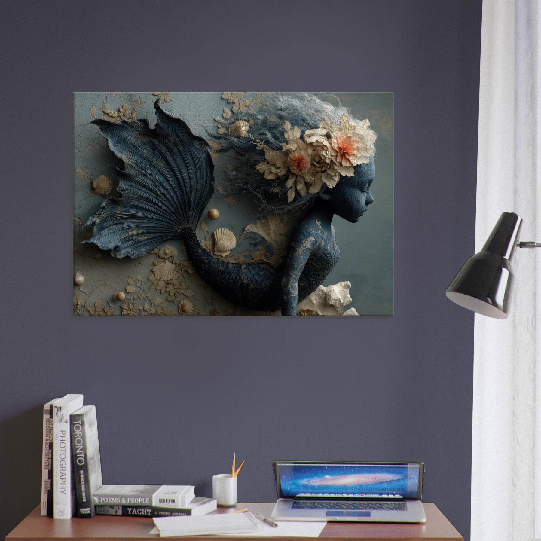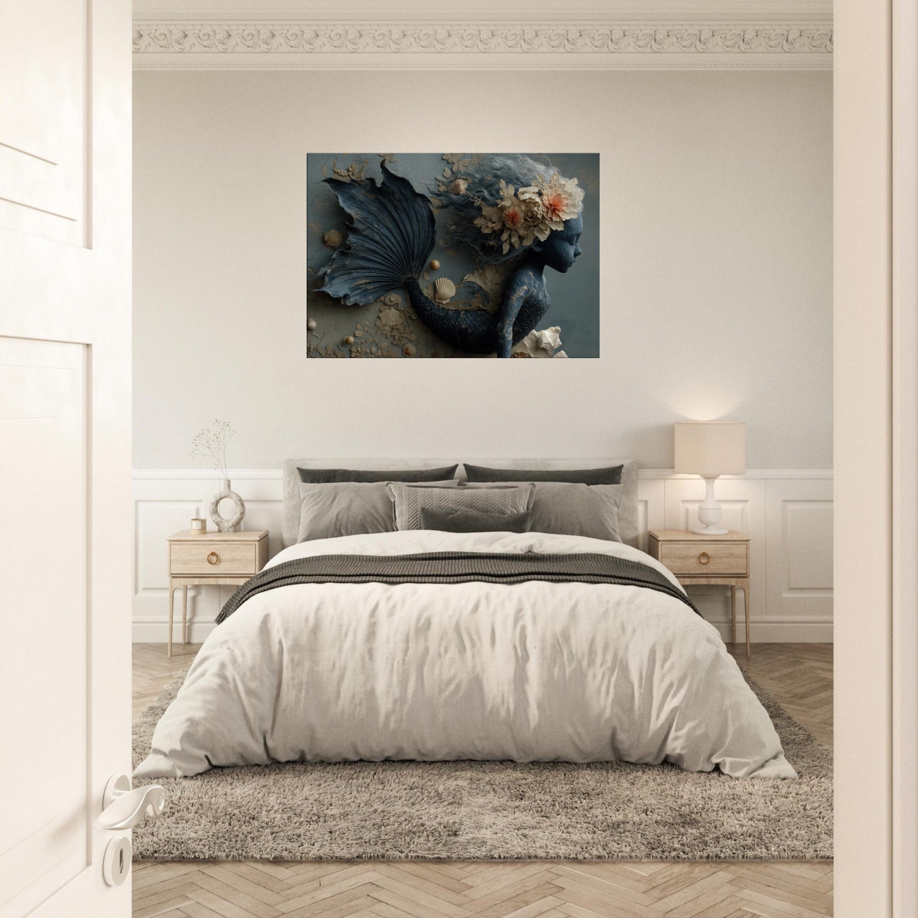 Delicately sculpted in sapphire and ash, this Enchanted Mermaid seems to drift between memory and tide. Her tail coils like a secret shoreline, while seashells and porcelain blooms entwine in her hair, catching the light as if they were breathing. The muted teal palette and tactile textures invite your room to slow, listen, and dream. Hang this piece where the living space meets the imagination, and let the ocean’s whisper linger a doorway to fantasy that feels both ancient and intimate.