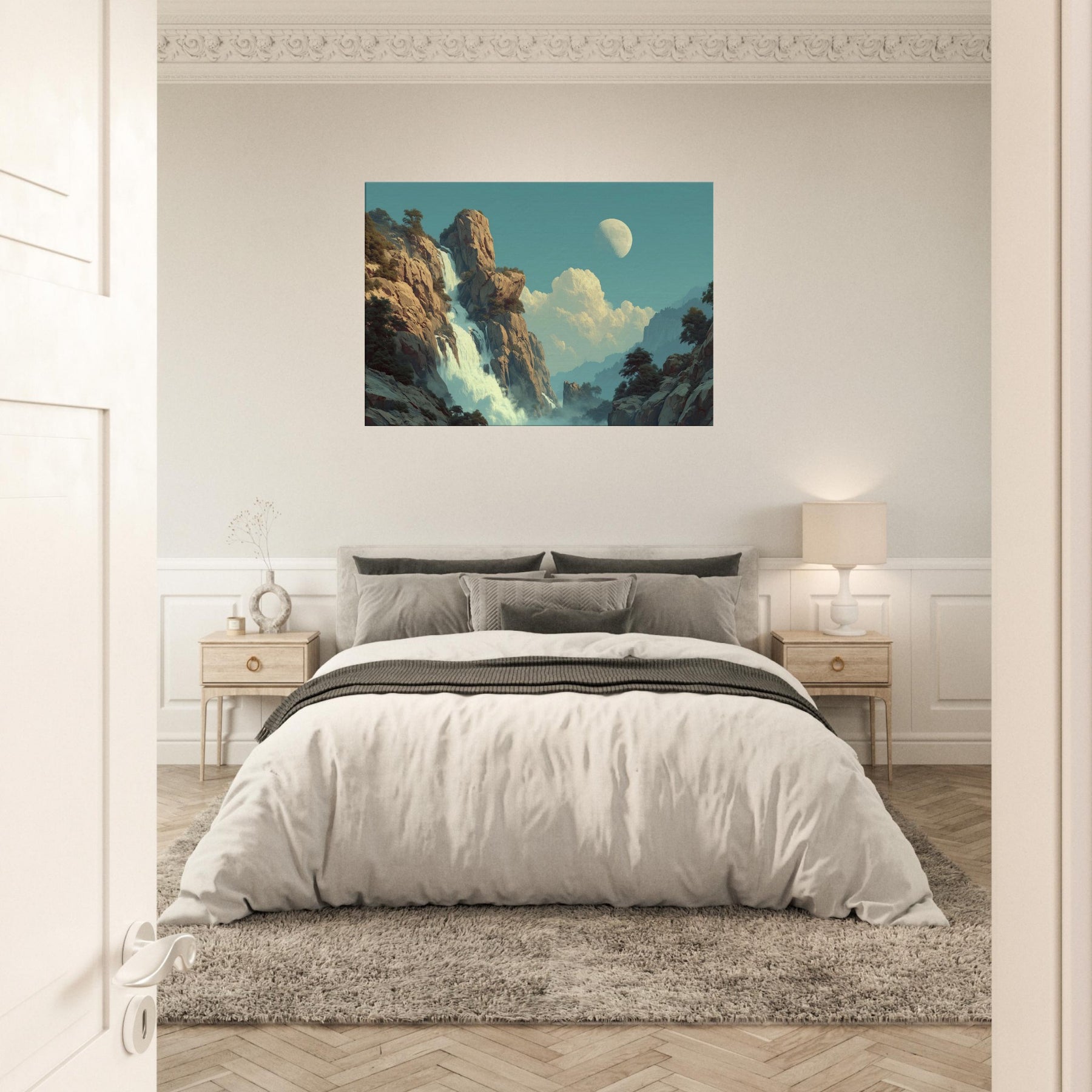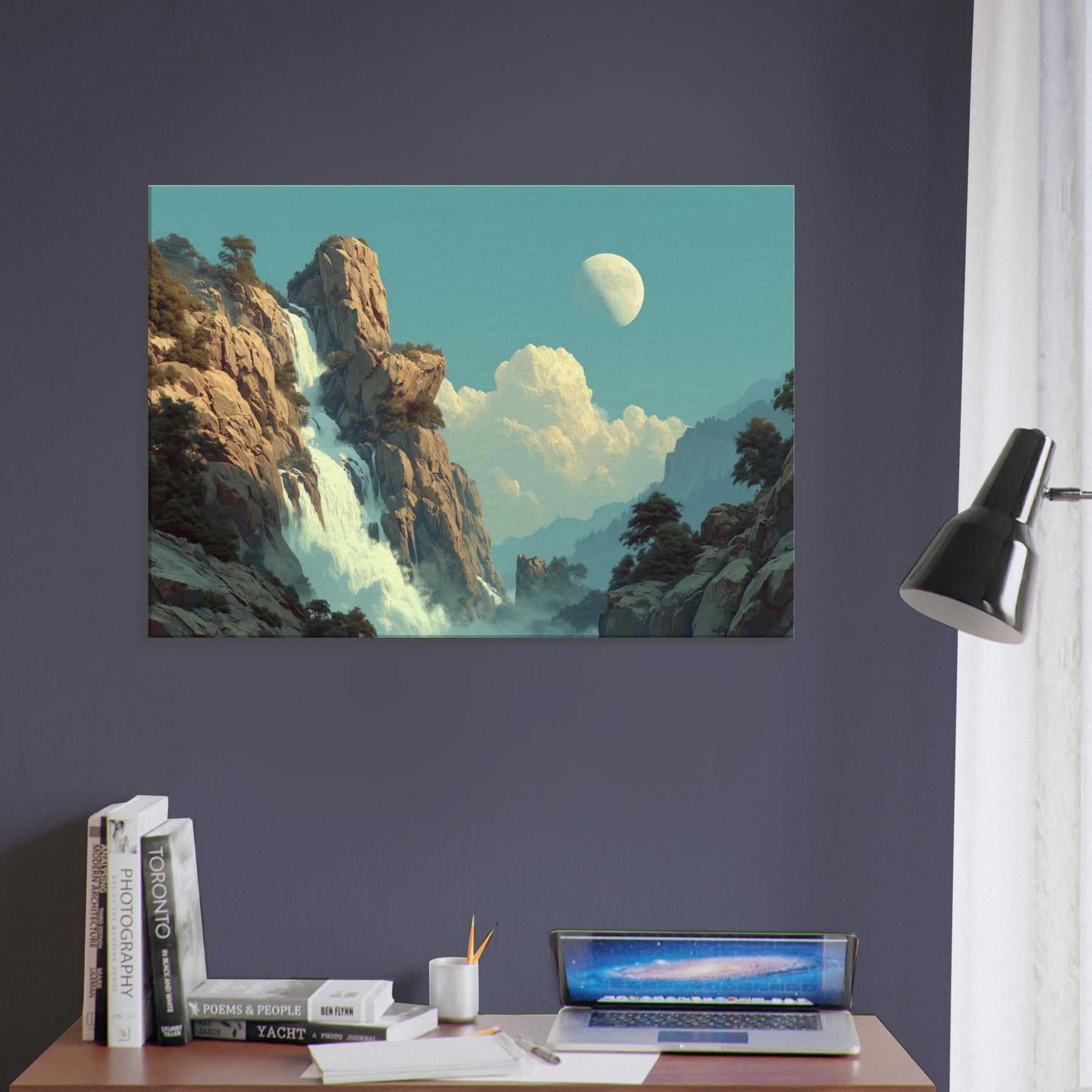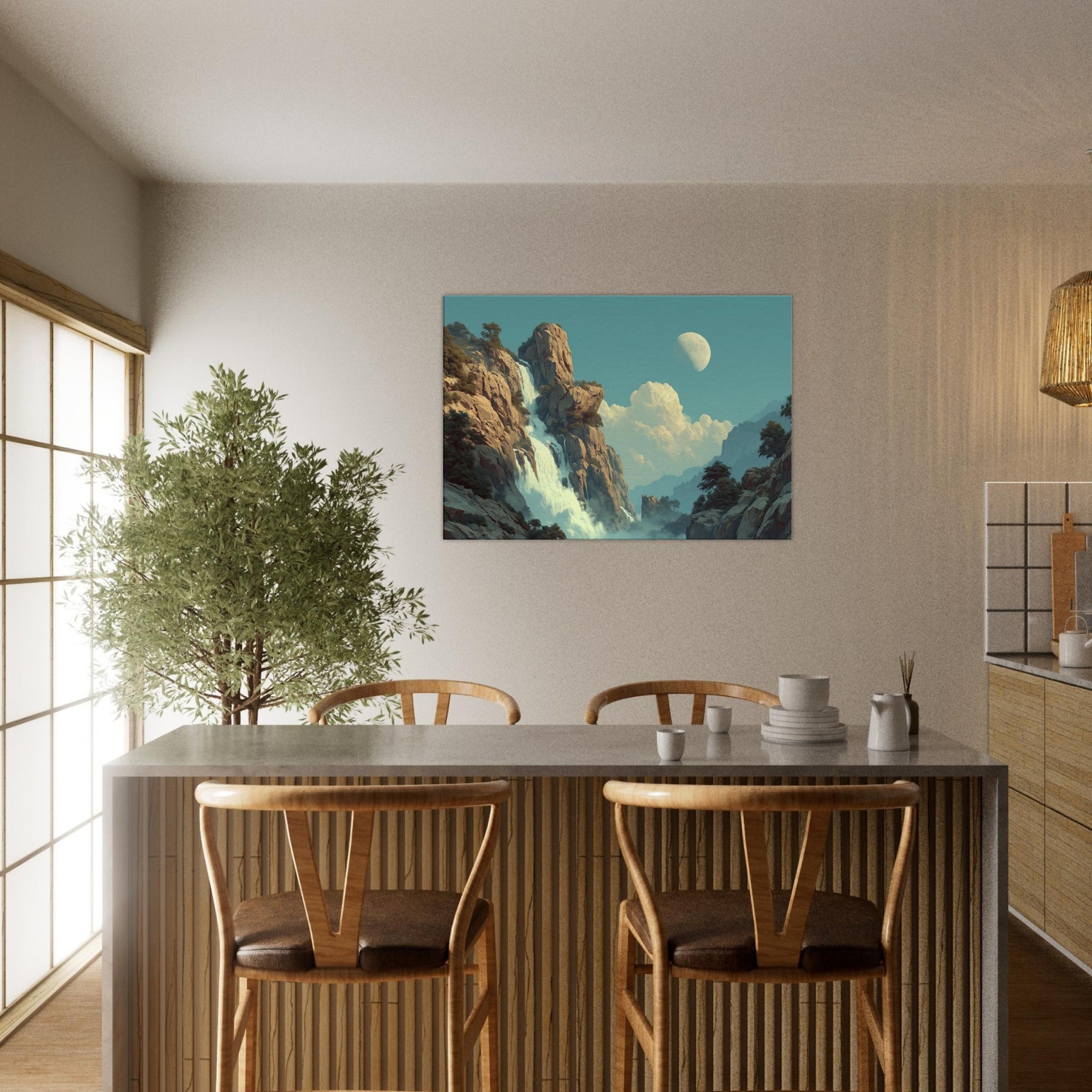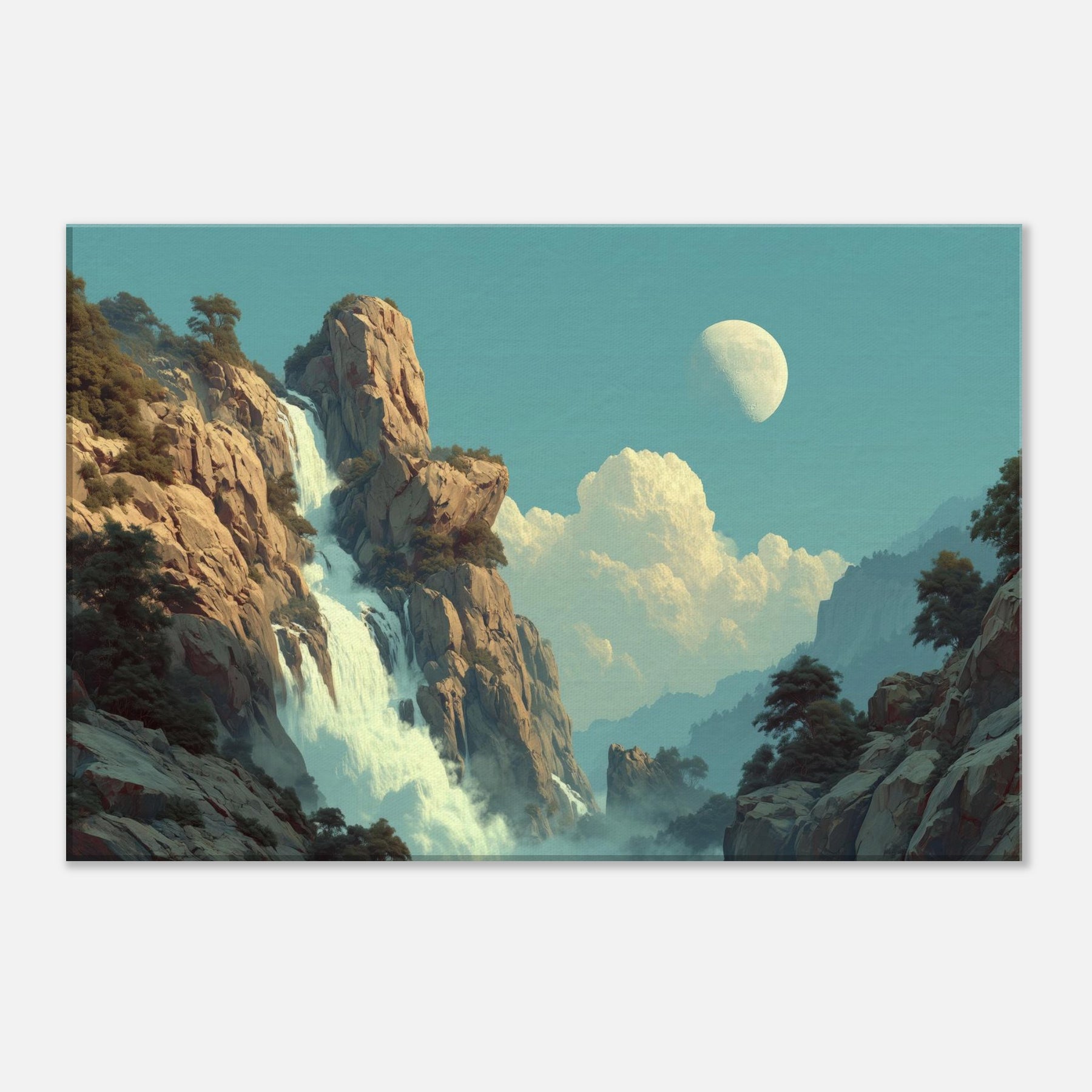 Tropical Rain unfolds as a dreamlike cascade that defies ordinary light. Amid towering cliffs and drifting mist, colors soften into a surreal pulse where rain becomes memory and light becomes water. This piece invites a living space to breathe a canopy of calm above daily bustle, with a cooling breeze of turquoise and moonlit glow. Its quiet drama, celestial hush, and lush texture coax reflection, conversation, and a slower pace, turning any room into a sanctuary of feeling.