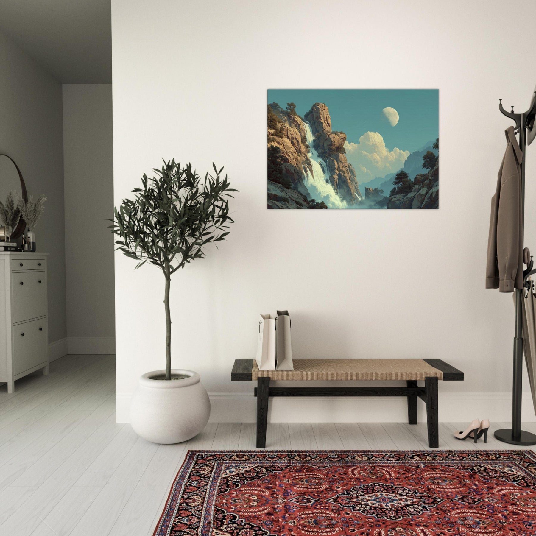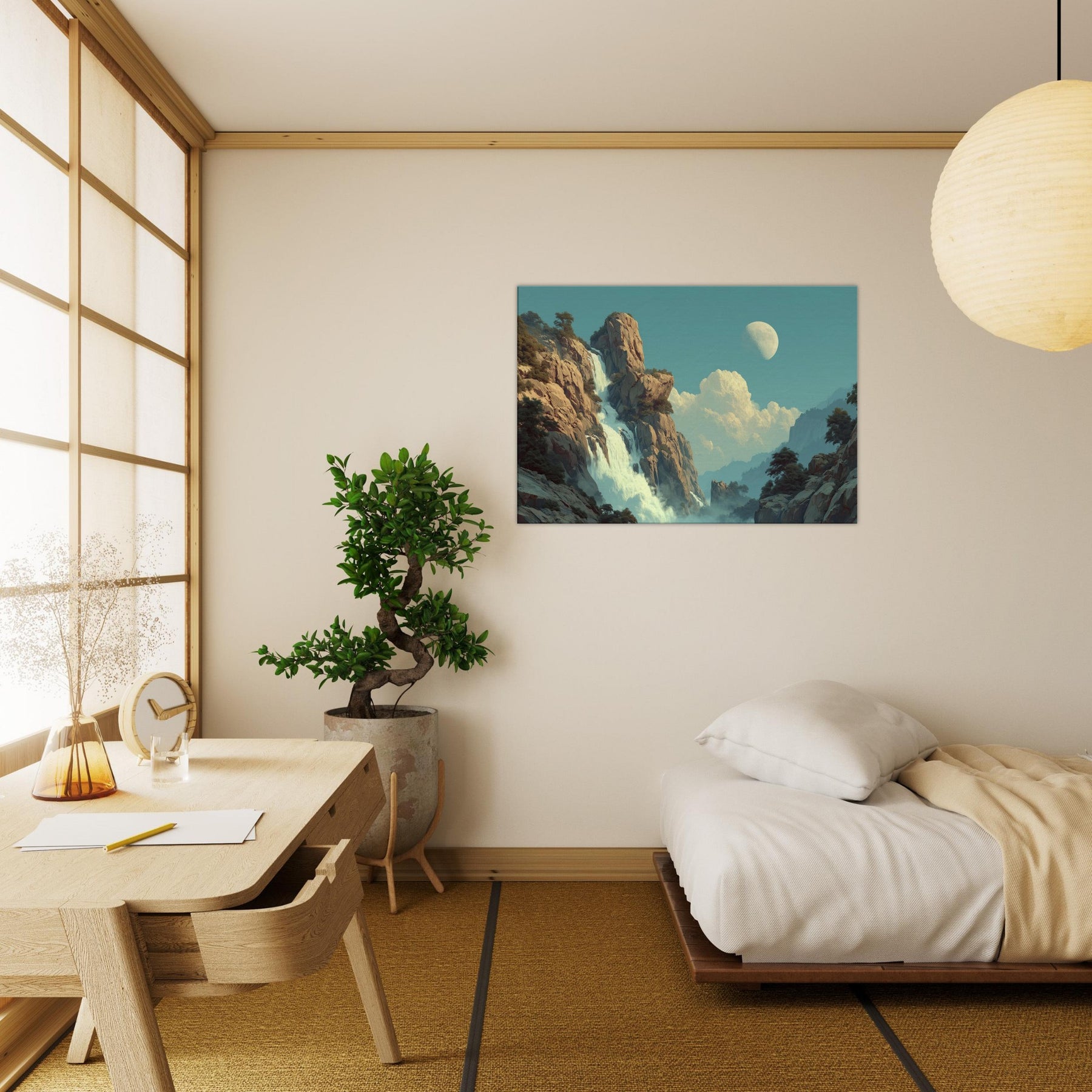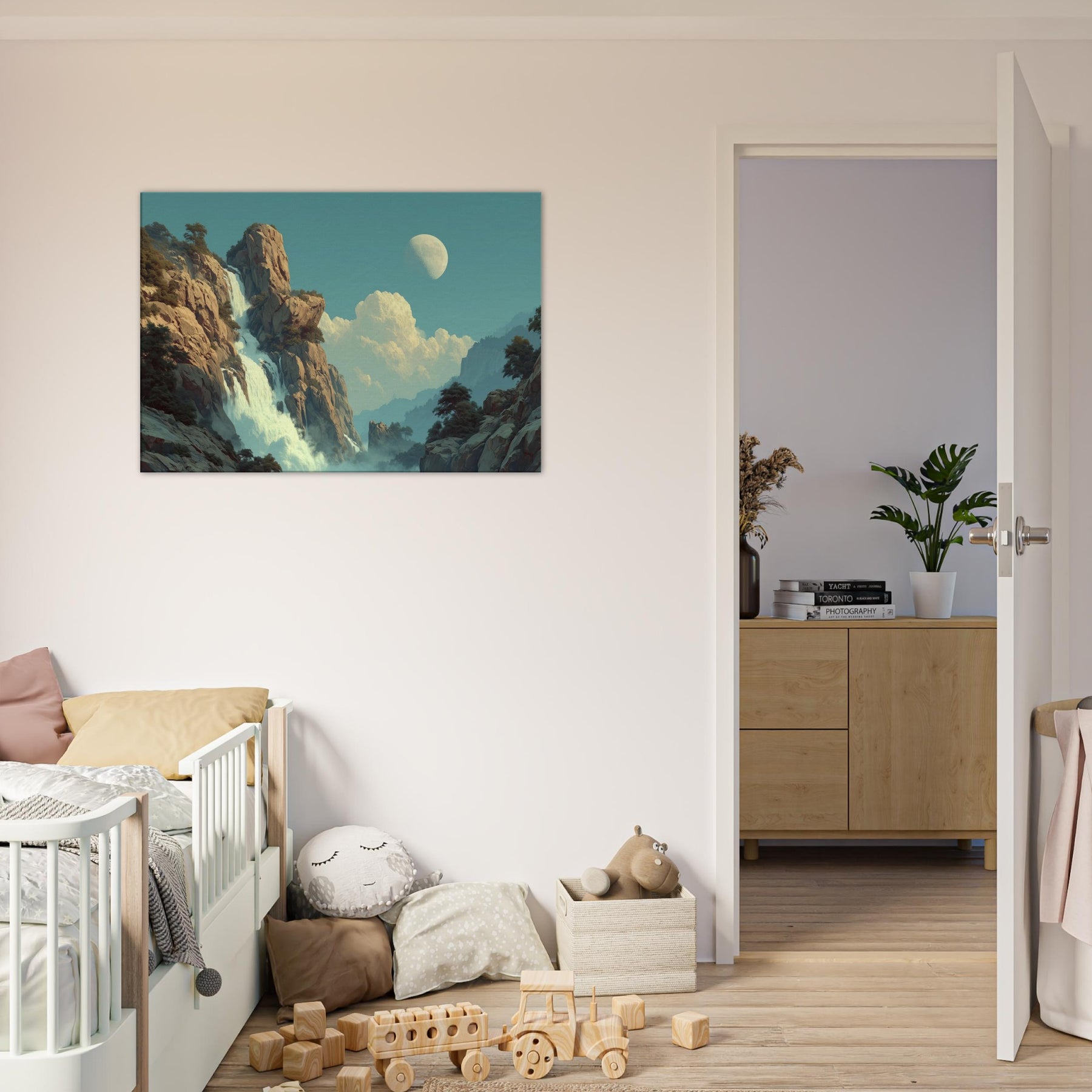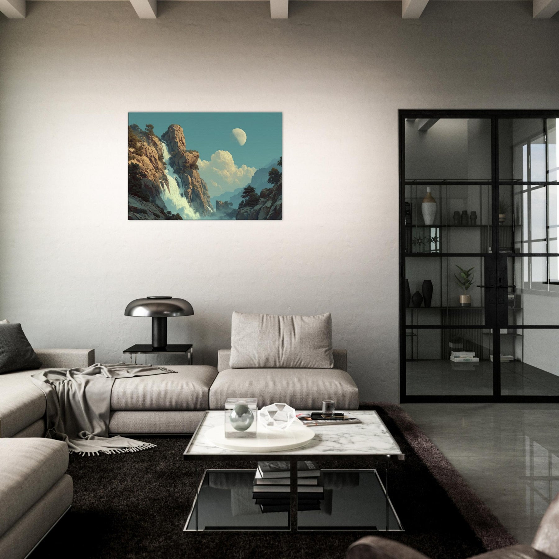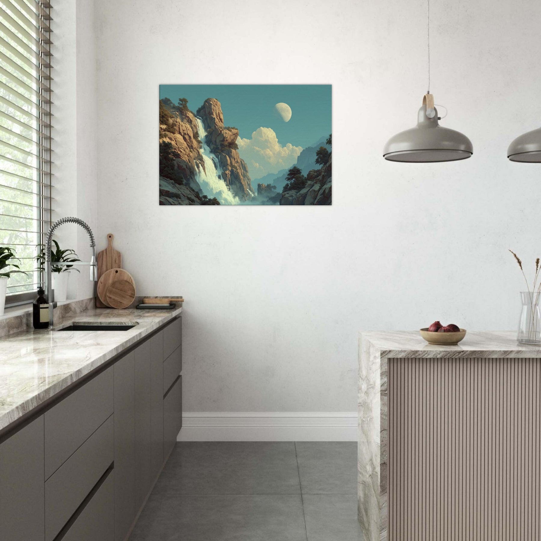 Tropical Rain unfolds as a dreamlike cascade that defies ordinary light. Amid towering cliffs and drifting mist, colors soften into a surreal pulse where rain becomes memory and light becomes water. This piece invites a living space to breathe a canopy of calm above daily bustle, with a cooling breeze of turquoise and moonlit glow. Its quiet drama, celestial hush, and lush texture coax reflection, conversation, and a slower pace, turning any room into a sanctuary of feeling.