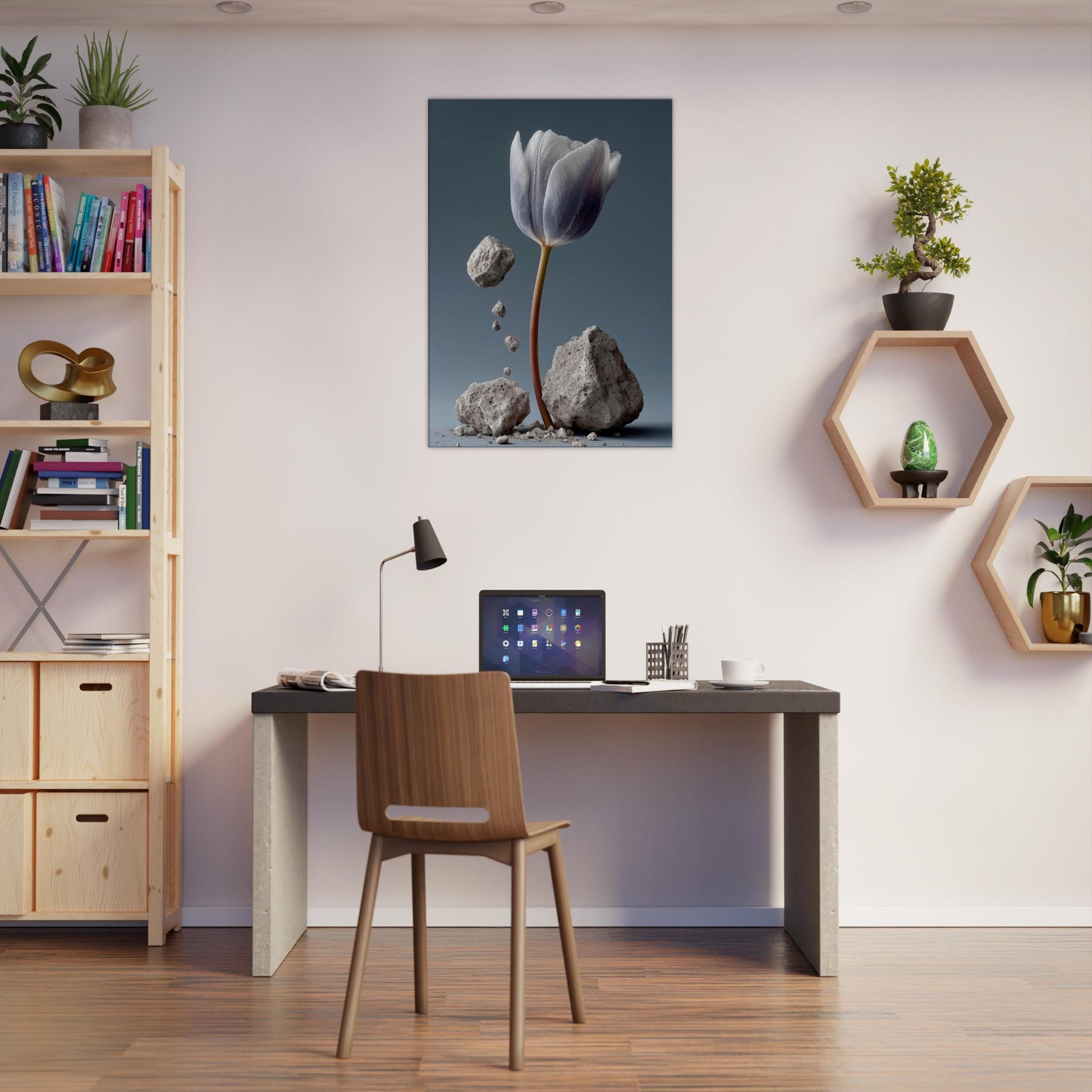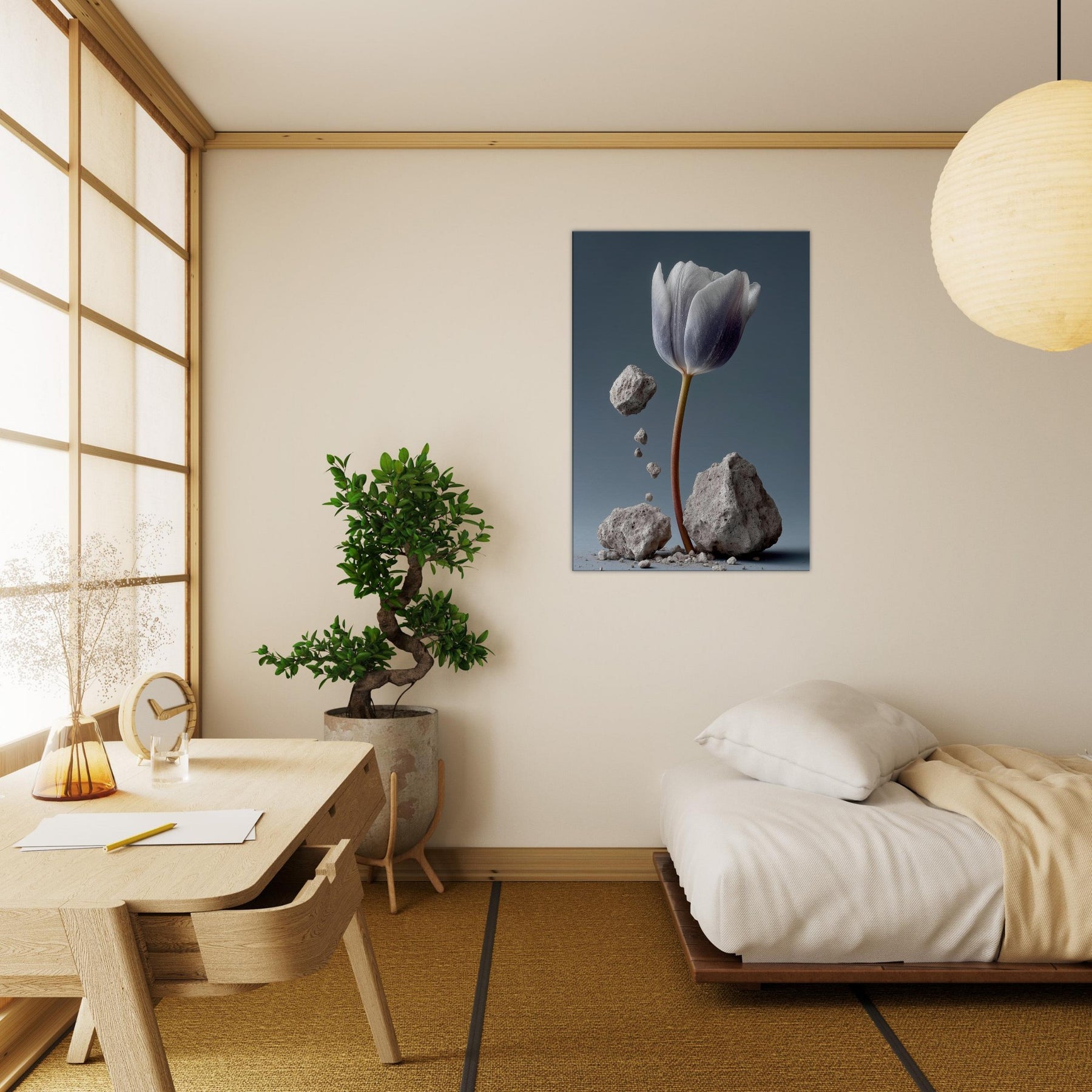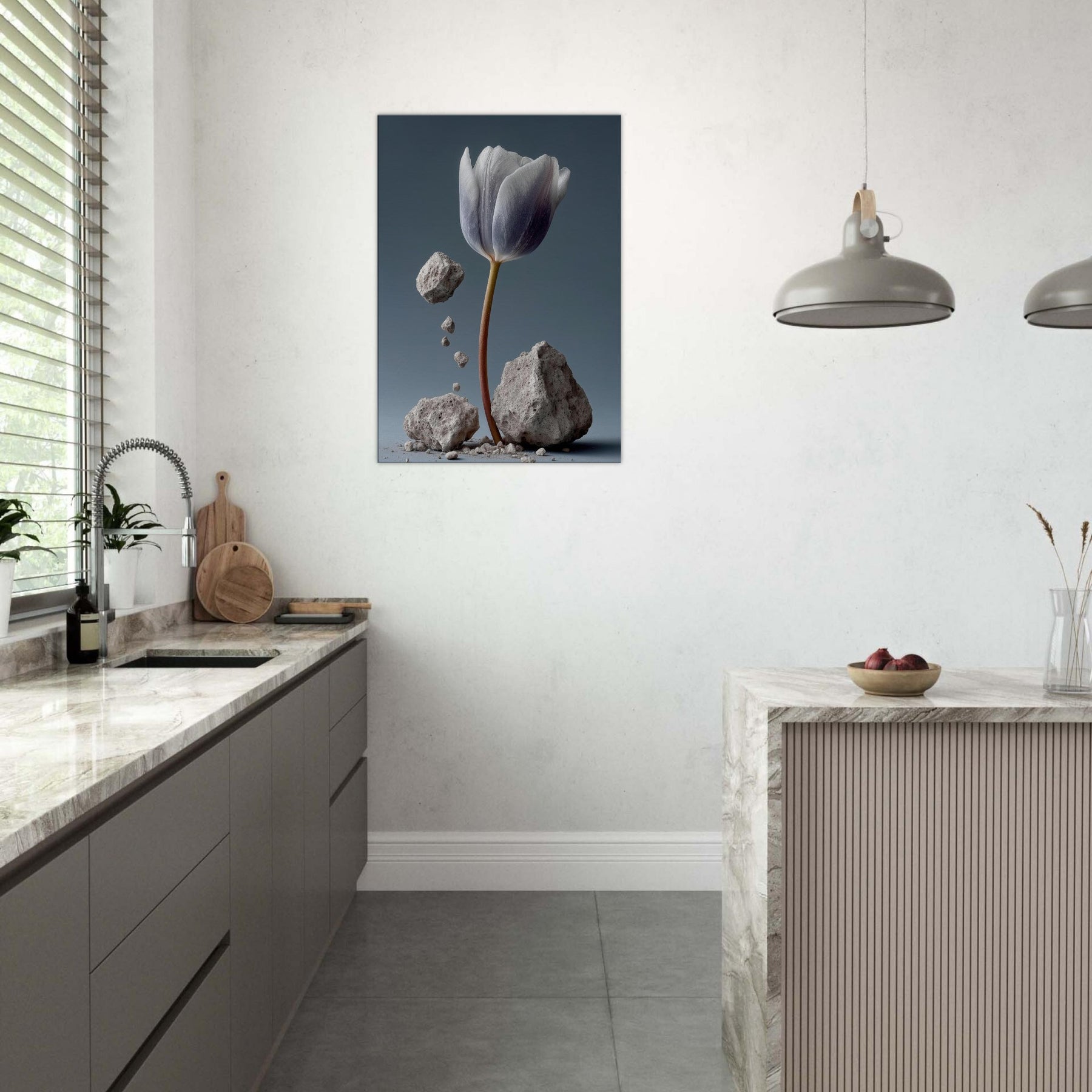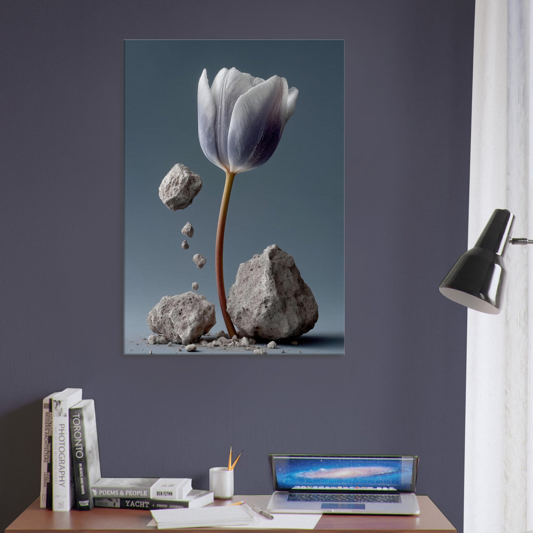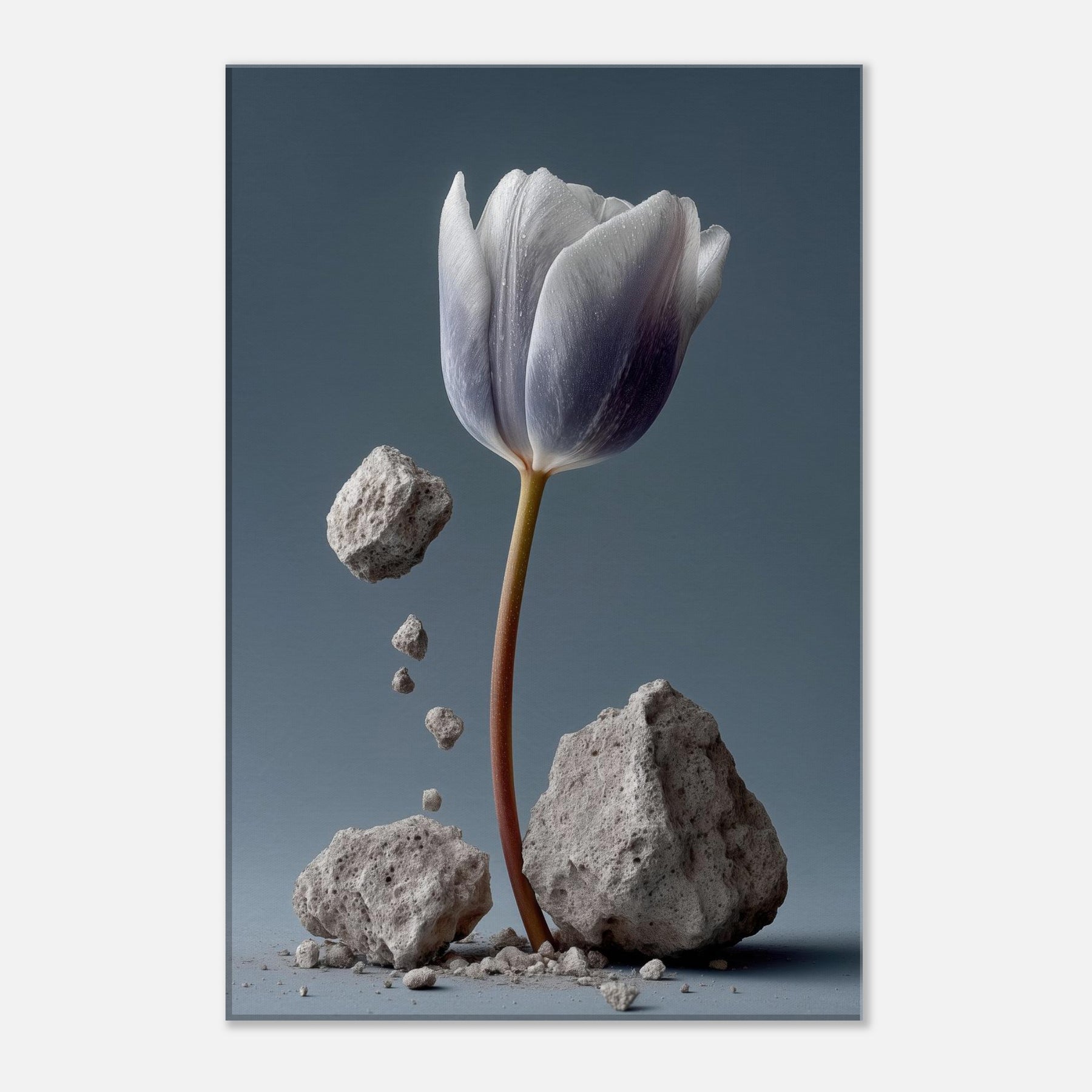 Let this Tulip rise from the dust of memory, a delicate plume of petals suspended between gravity and grace. In a surreal of stone and ash, color drifts from ivory to lavender along the stem's copper line. The scene invites contemplation and calm, turning a living room into a quiet atelier where imagination and nature mingle. Fragile yet resilient, it harmonizes with soft textures and muted palettes, inviting light to linger and rooms to breathe.
