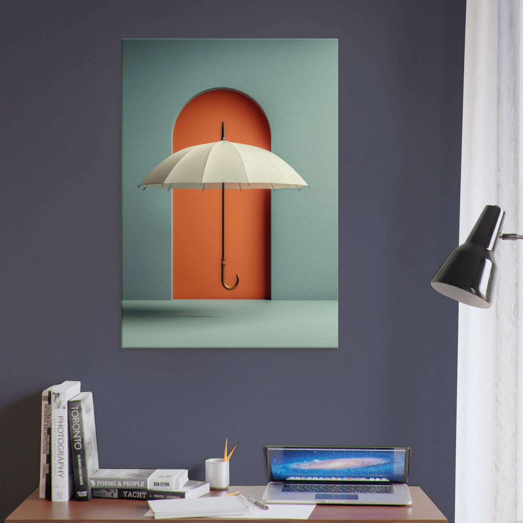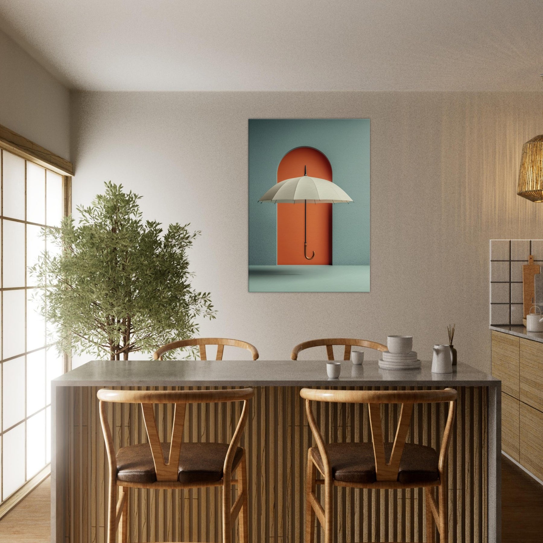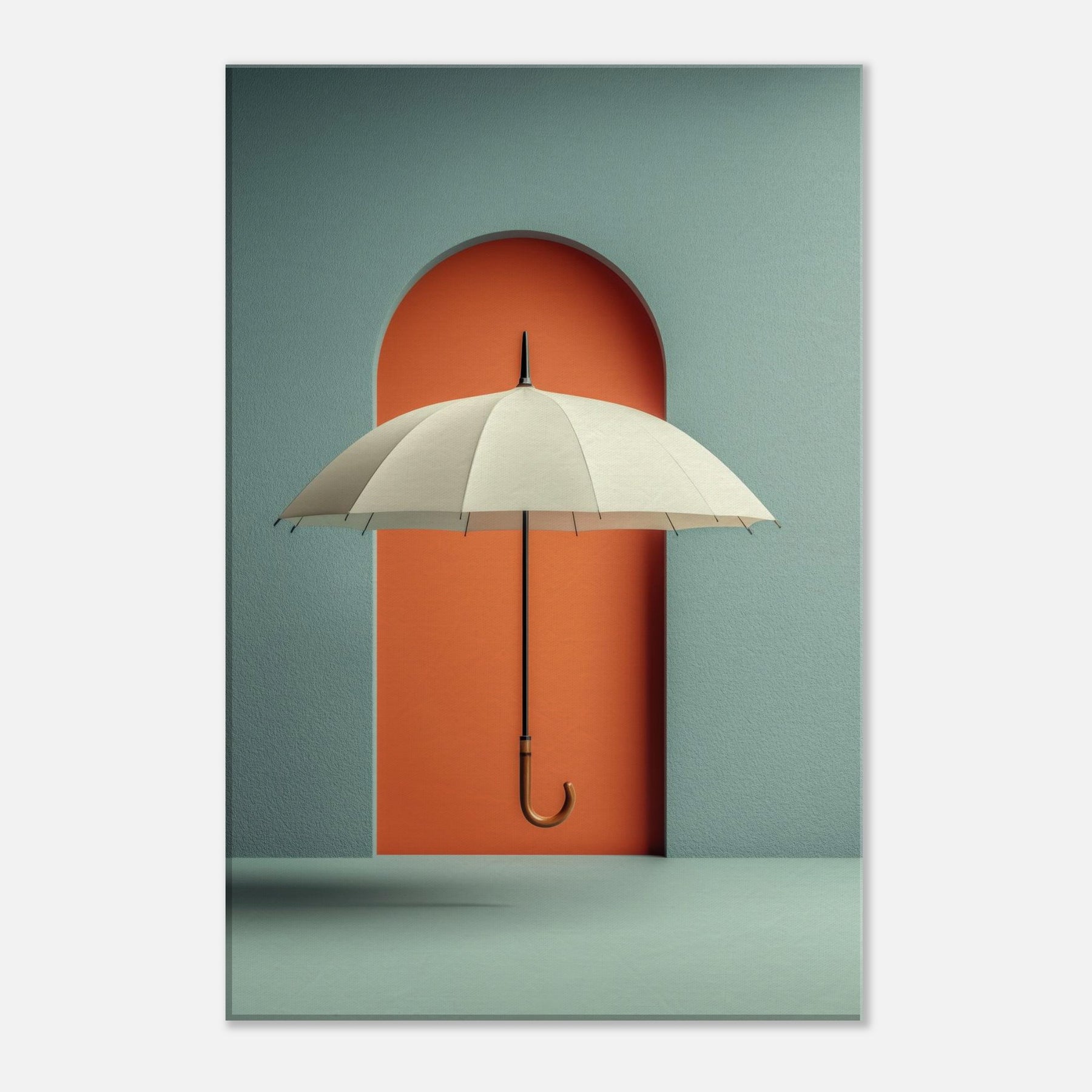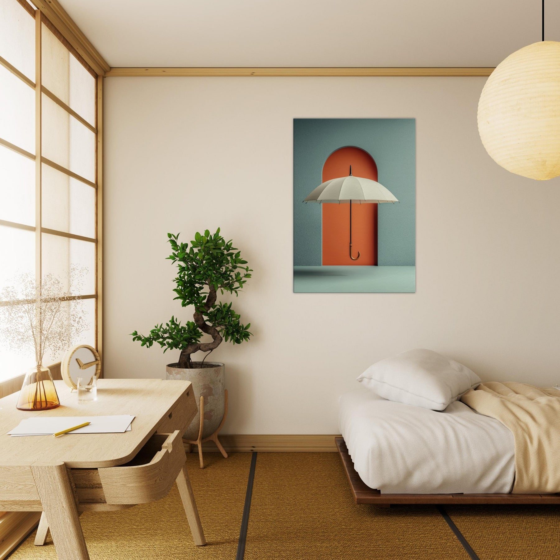 Paper Umbrella drifts against a bold coral doorway, inviting the eye to linger in a quiet, dreamlike space. This single object becomes a doorway to memory and imagination, where shade and light mingle in a soft, suspended moment. The composition cultivates a serene, modern atmosphere cool teal walls, warm lacquered orange, and a graceful arching form that anchors the room with subtle drama. Perfect for living rooms and studios craving poetic calm and visual intrigue.