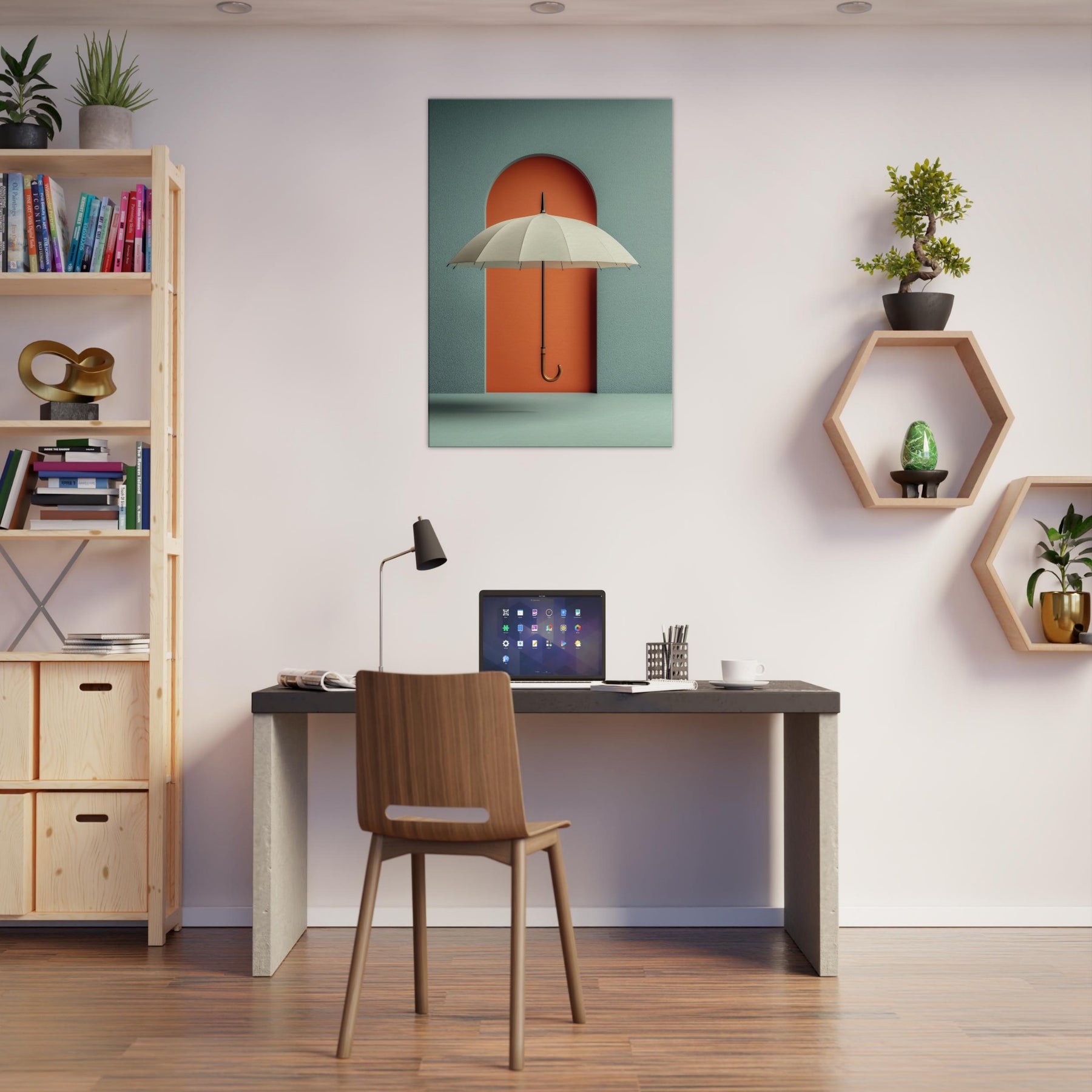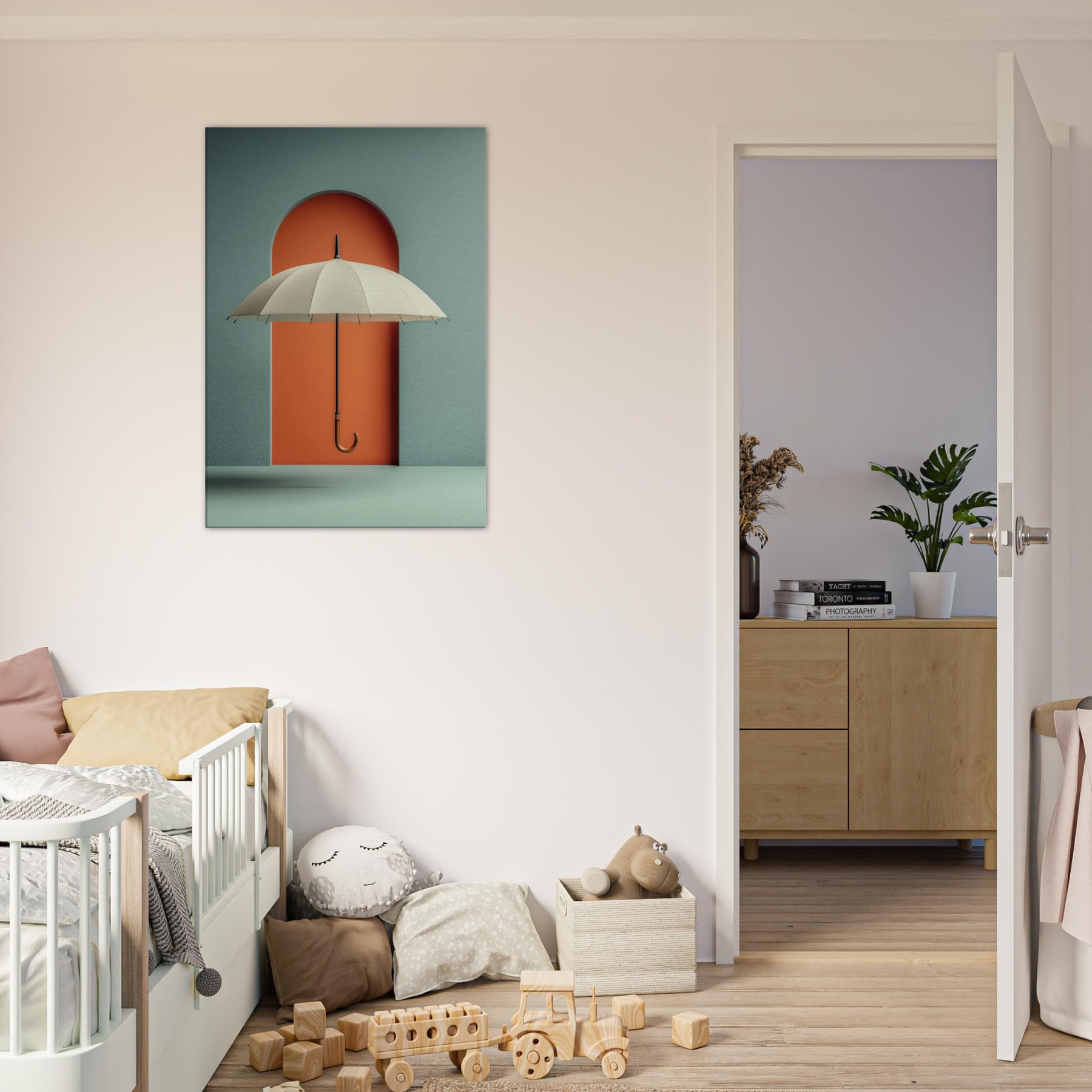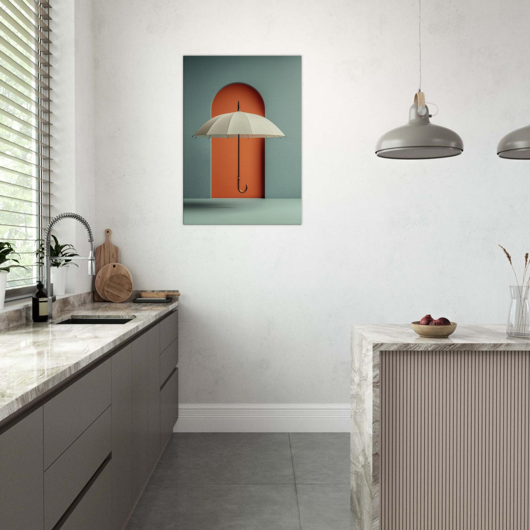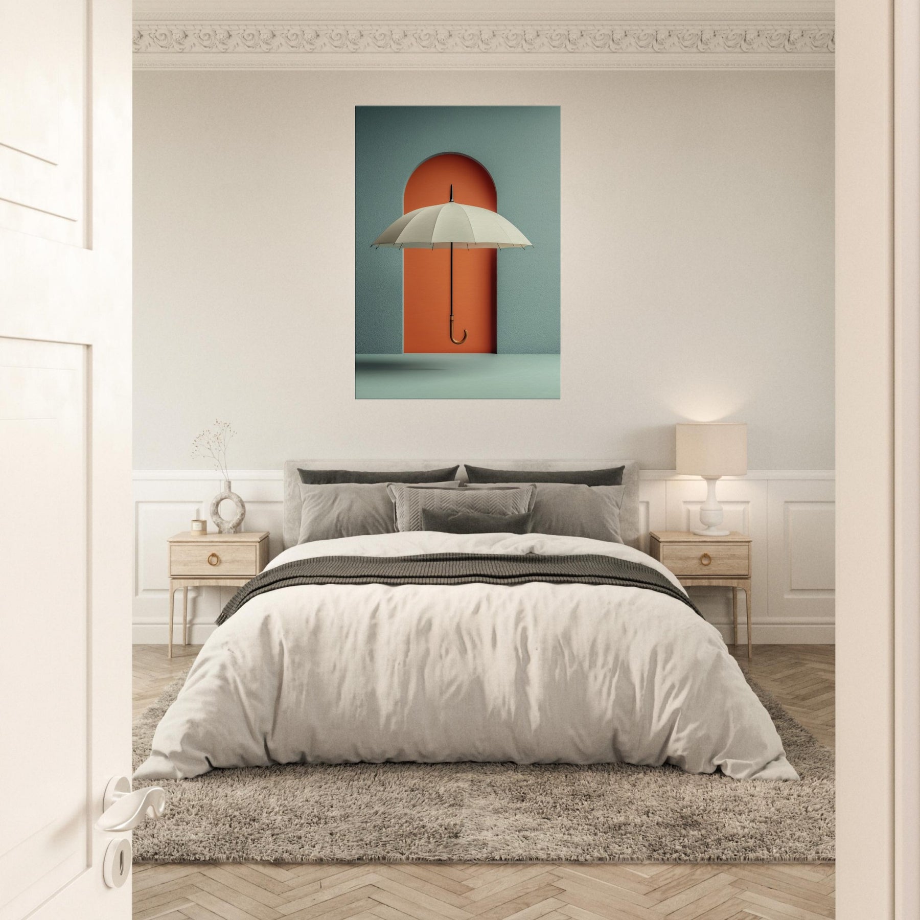 Paper Umbrella drifts against a bold coral doorway, inviting the eye to linger in a quiet, dreamlike space. This single object becomes a doorway to memory and imagination, where shade and light mingle in a soft, suspended moment. The composition cultivates a serene, modern atmosphere cool teal walls, warm lacquered orange, and a graceful arching form that anchors the room with subtle drama. Perfect for living rooms and studios craving poetic calm and visual intrigue.