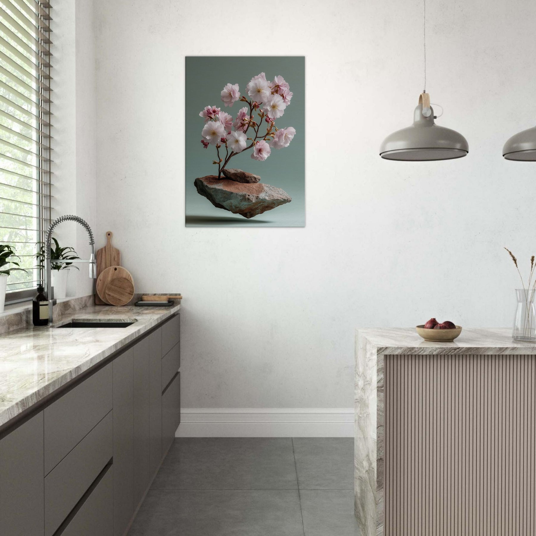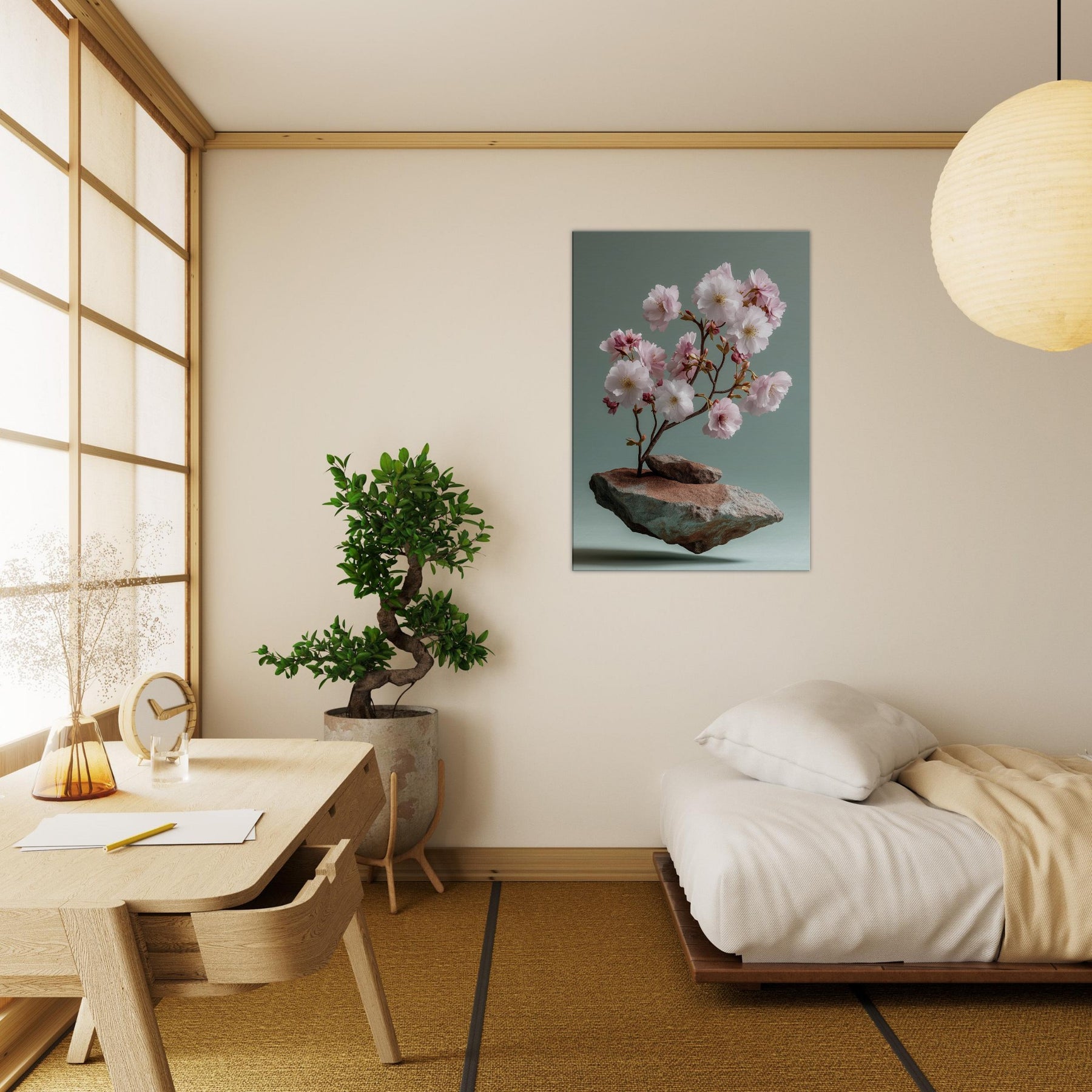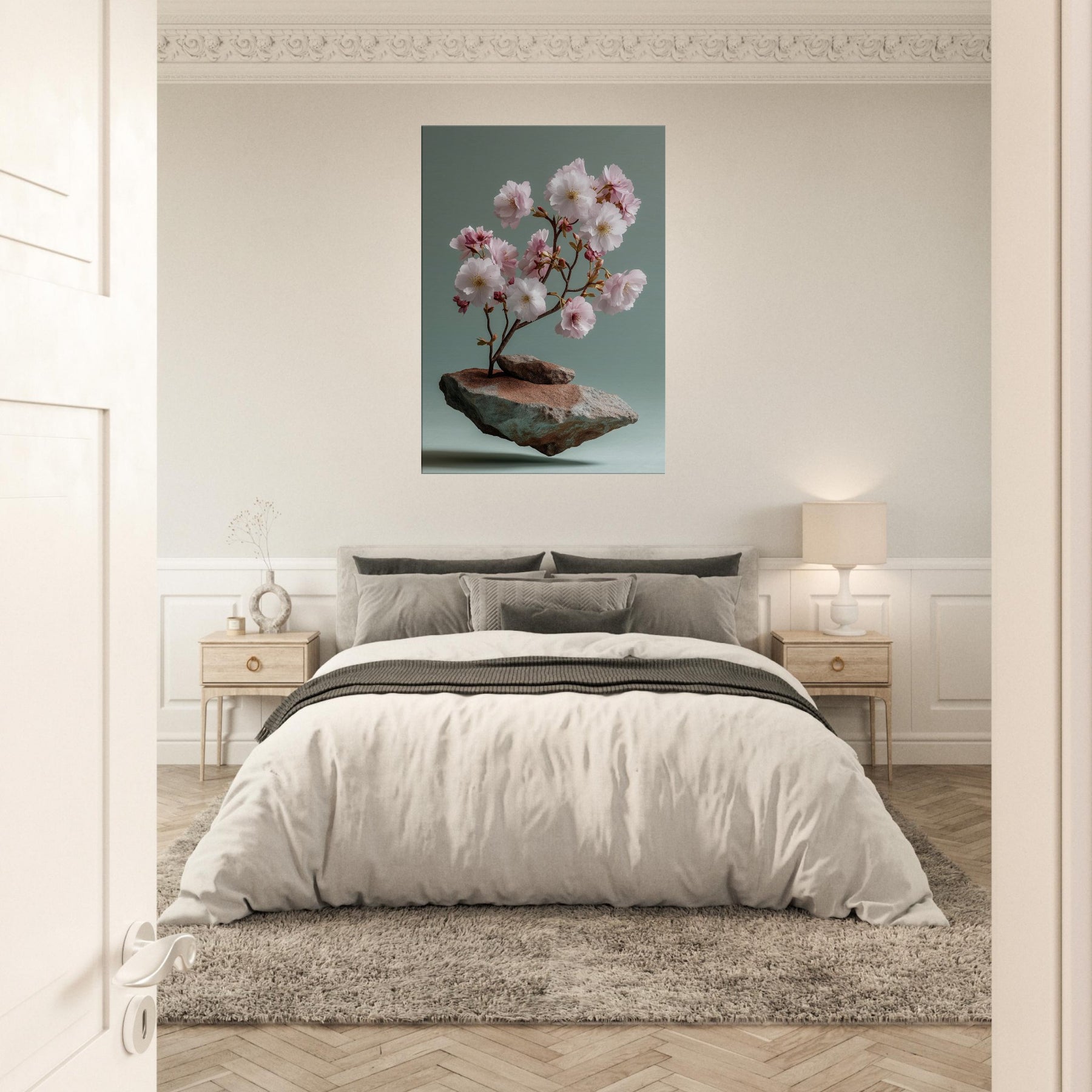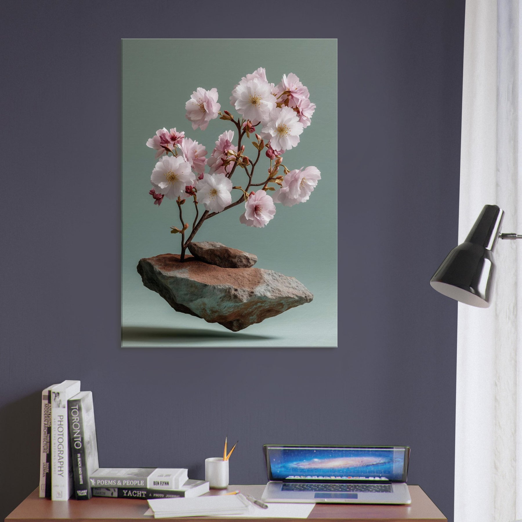 Cherry Blossom rests in paradox, its delicate blooms perched on a gravity defying stone. This dreamlike composition invites quiet reflection, where petals drift like soft lanterns against a calm, mineral horizon. The Primary Subject, the Cherry Blossom, becomes a whisper of renewal amid stillness, while the floating rock anchors the scene in a tangible calm. Hung in a living room or bedroom, it softens light and noise, turning walls into a serene window to nature's subtle, surreal pulse.