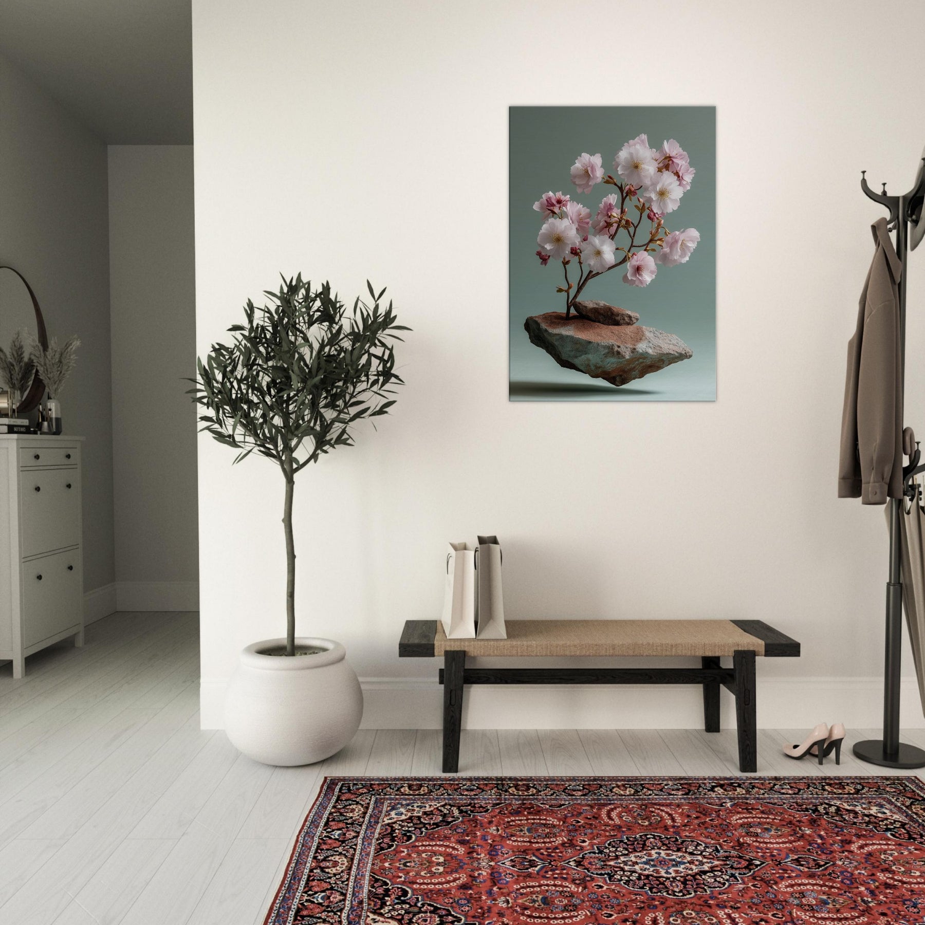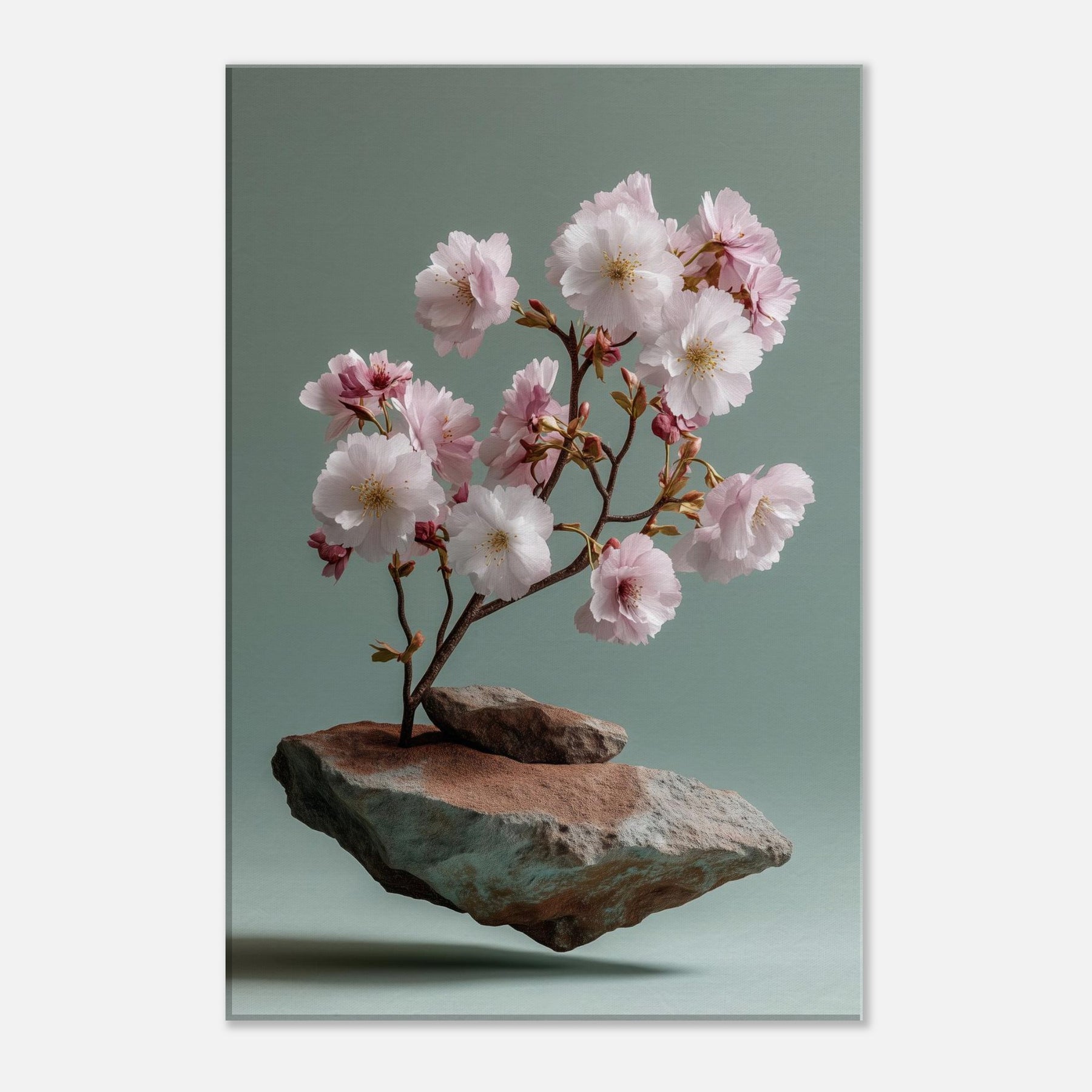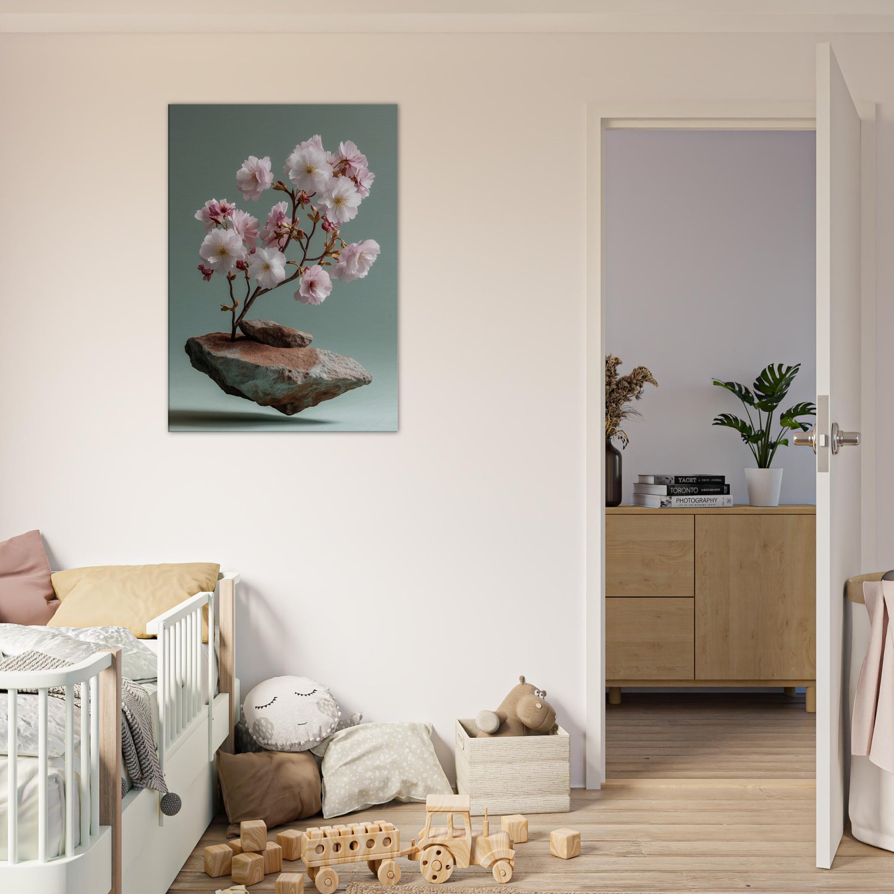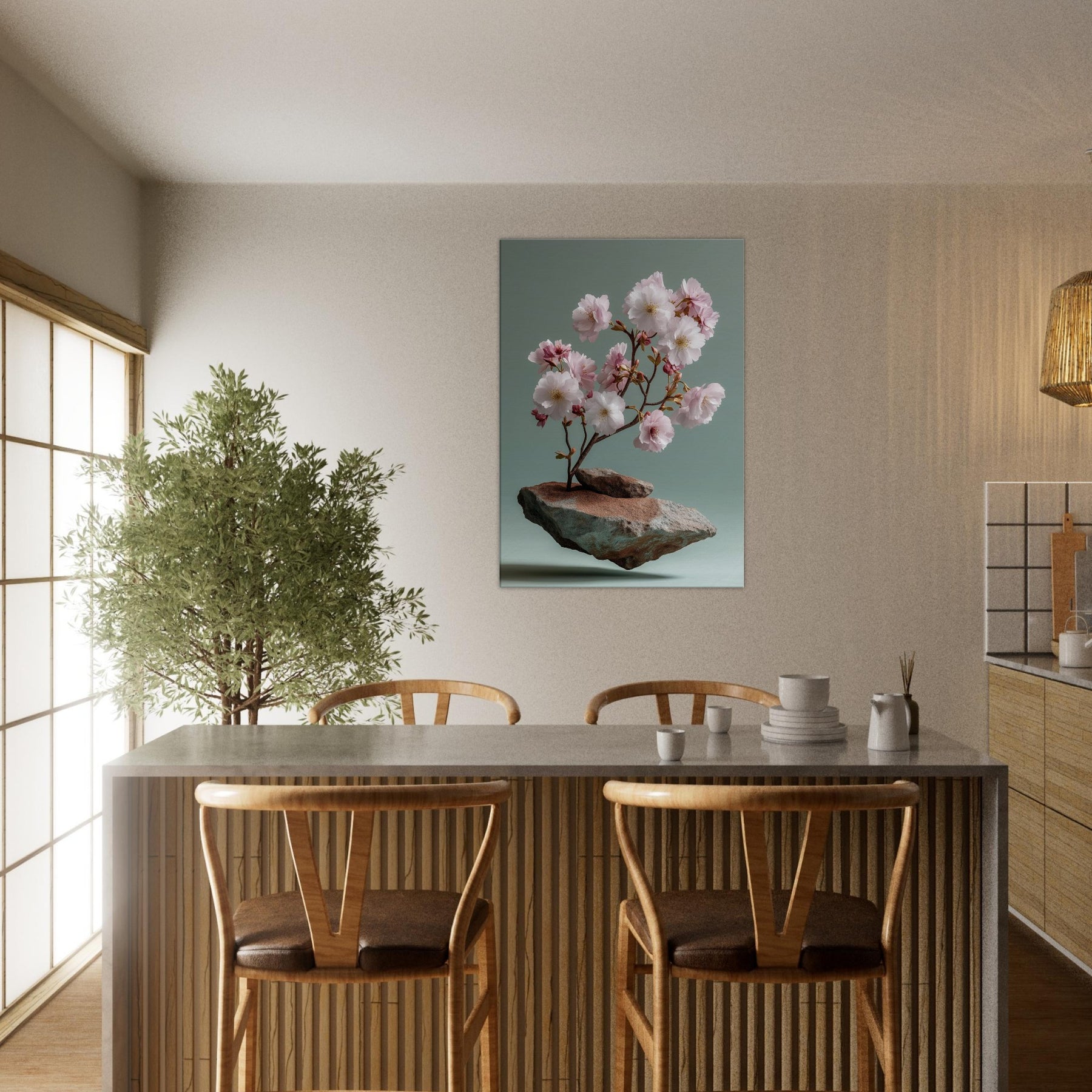 Cherry Blossom rests in paradox, its delicate blooms perched on a gravity defying stone. This dreamlike composition invites quiet reflection, where petals drift like soft lanterns against a calm, mineral horizon. The Primary Subject, the Cherry Blossom, becomes a whisper of renewal amid stillness, while the floating rock anchors the scene in a tangible calm. Hung in a living room or bedroom, it softens light and noise, turning walls into a serene window to nature's subtle, surreal pulse.