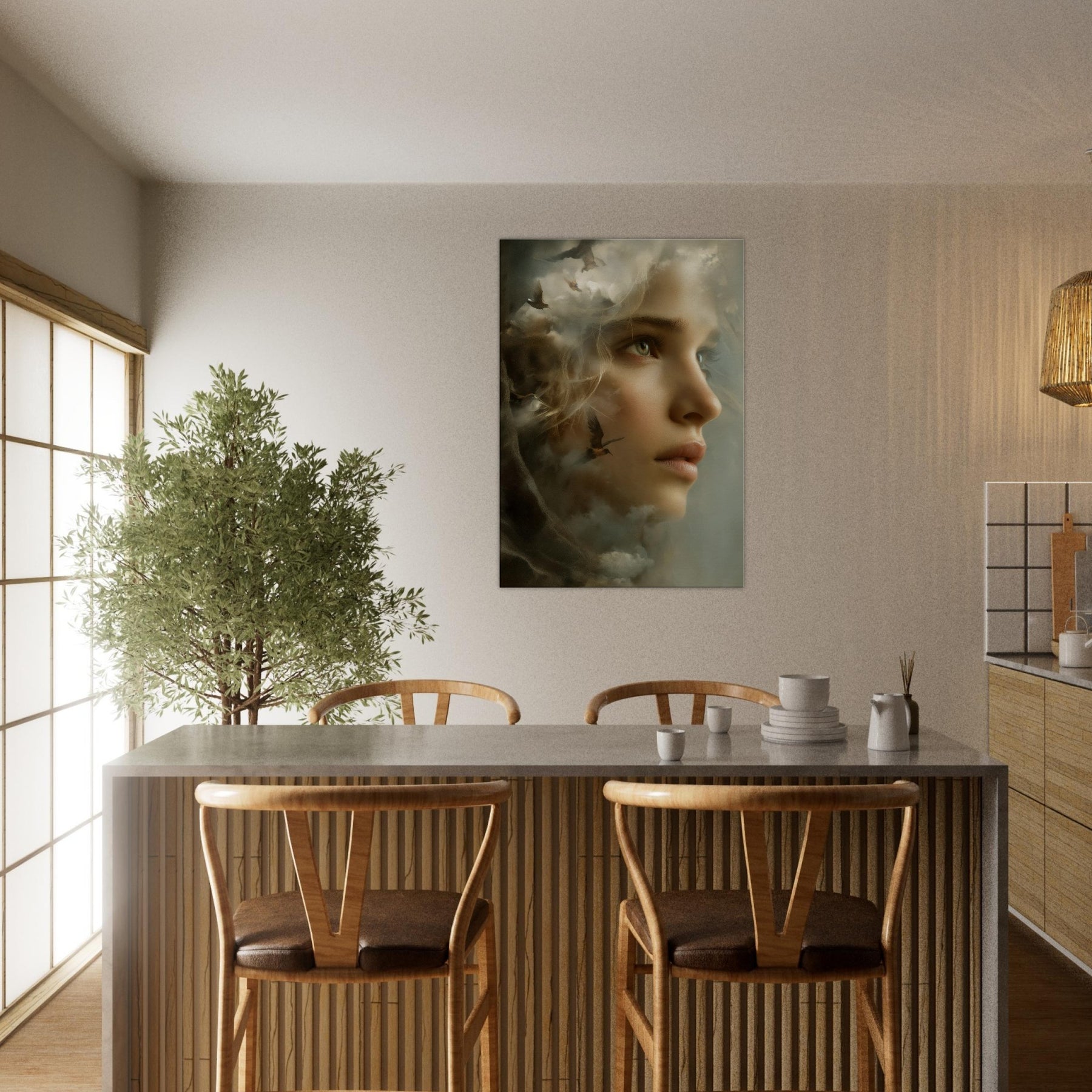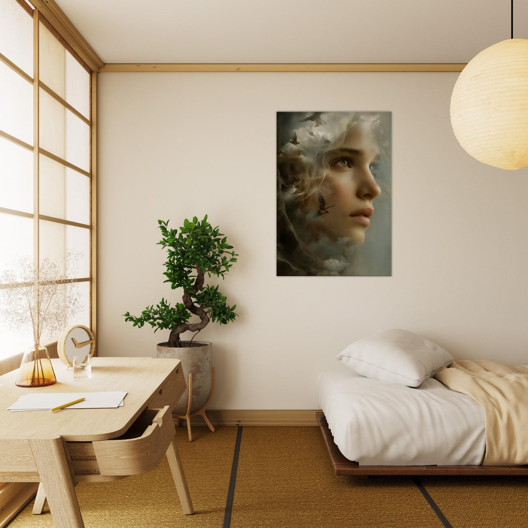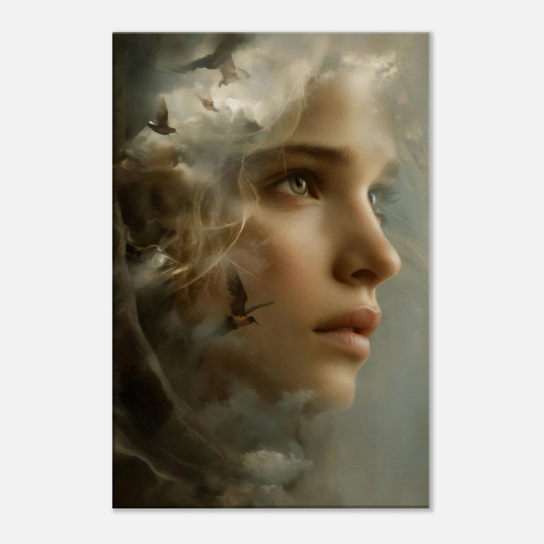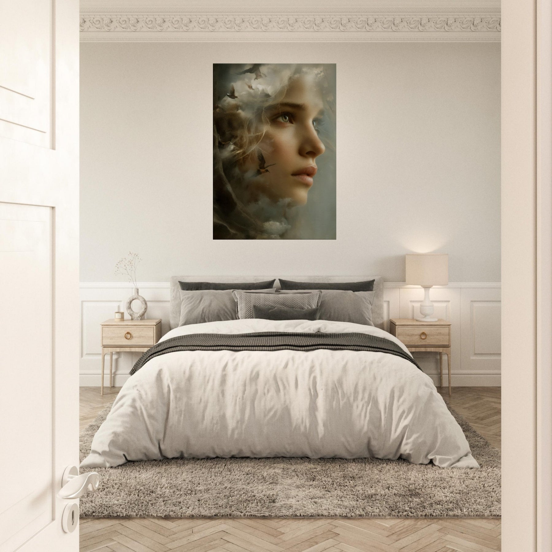 In Mythical Figures (Venus, David), a radiant profile dissolves into mist and migrating birds, as if memory and myth braid into a single gaze. The soft, luminous tones and feathered edges soften the room, turning a wall into a quiet portal between legend and everyday life. Light caresses the cheek, the halo like glow, and invites a moment of stillness. Perfect above a sofa or console, it sparks conversation while wrapping the space in dreamlike warmth.