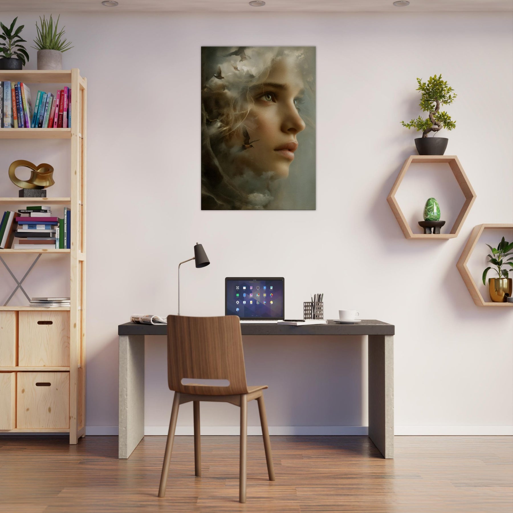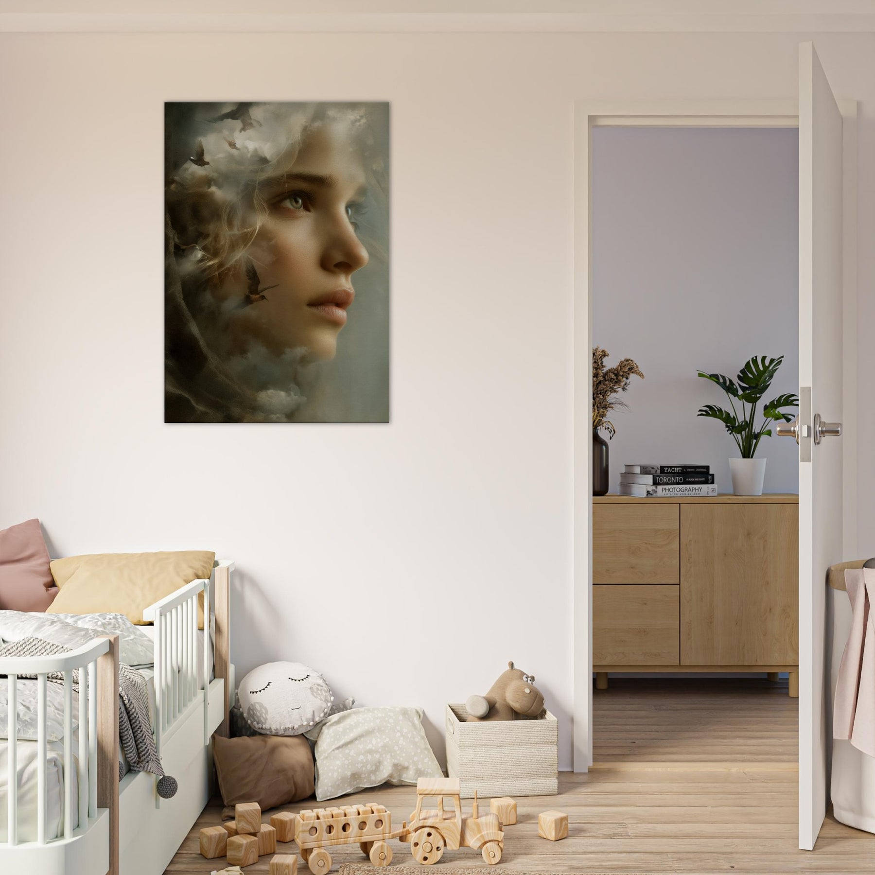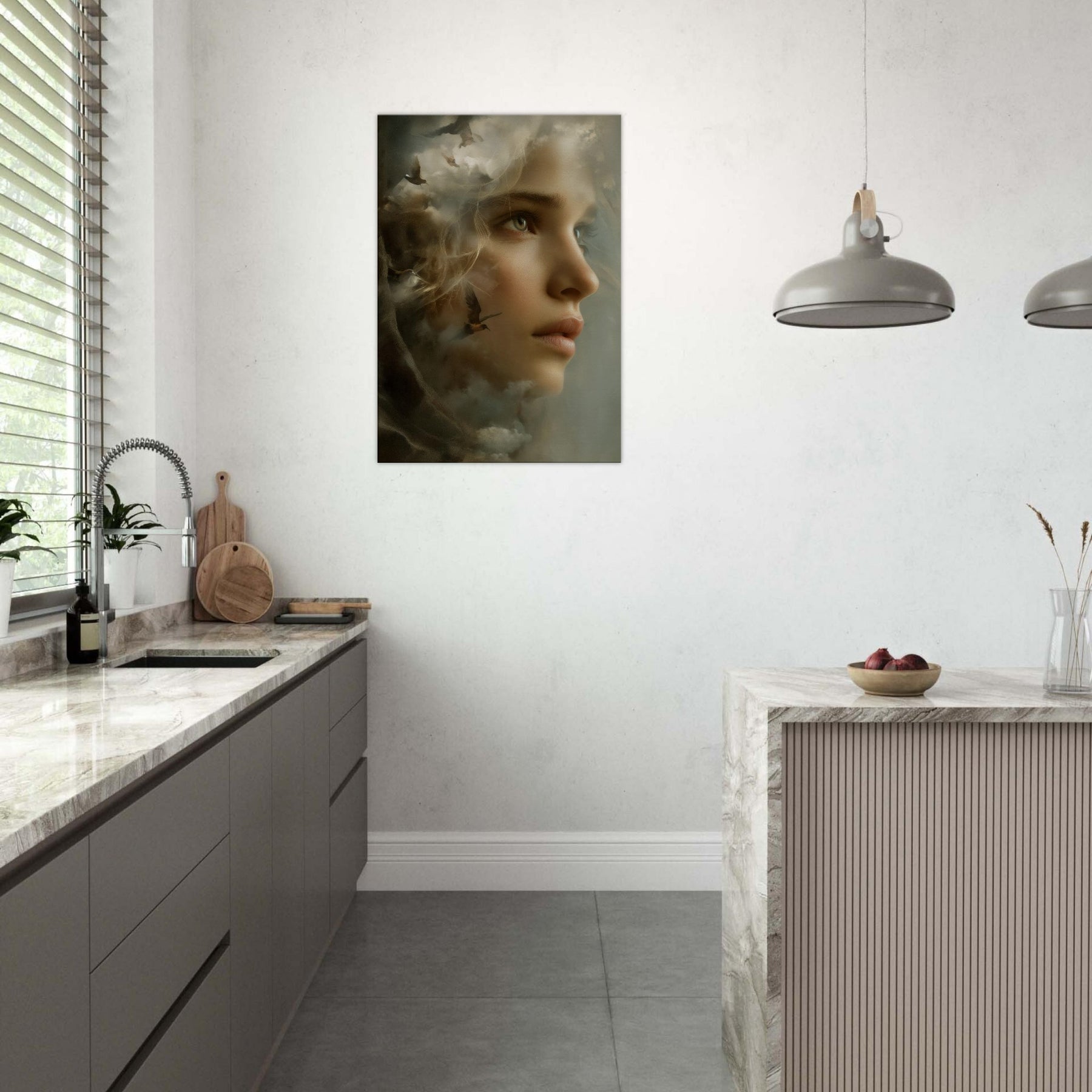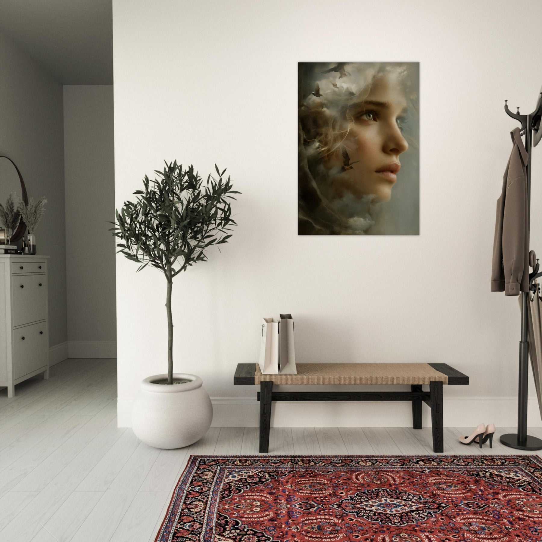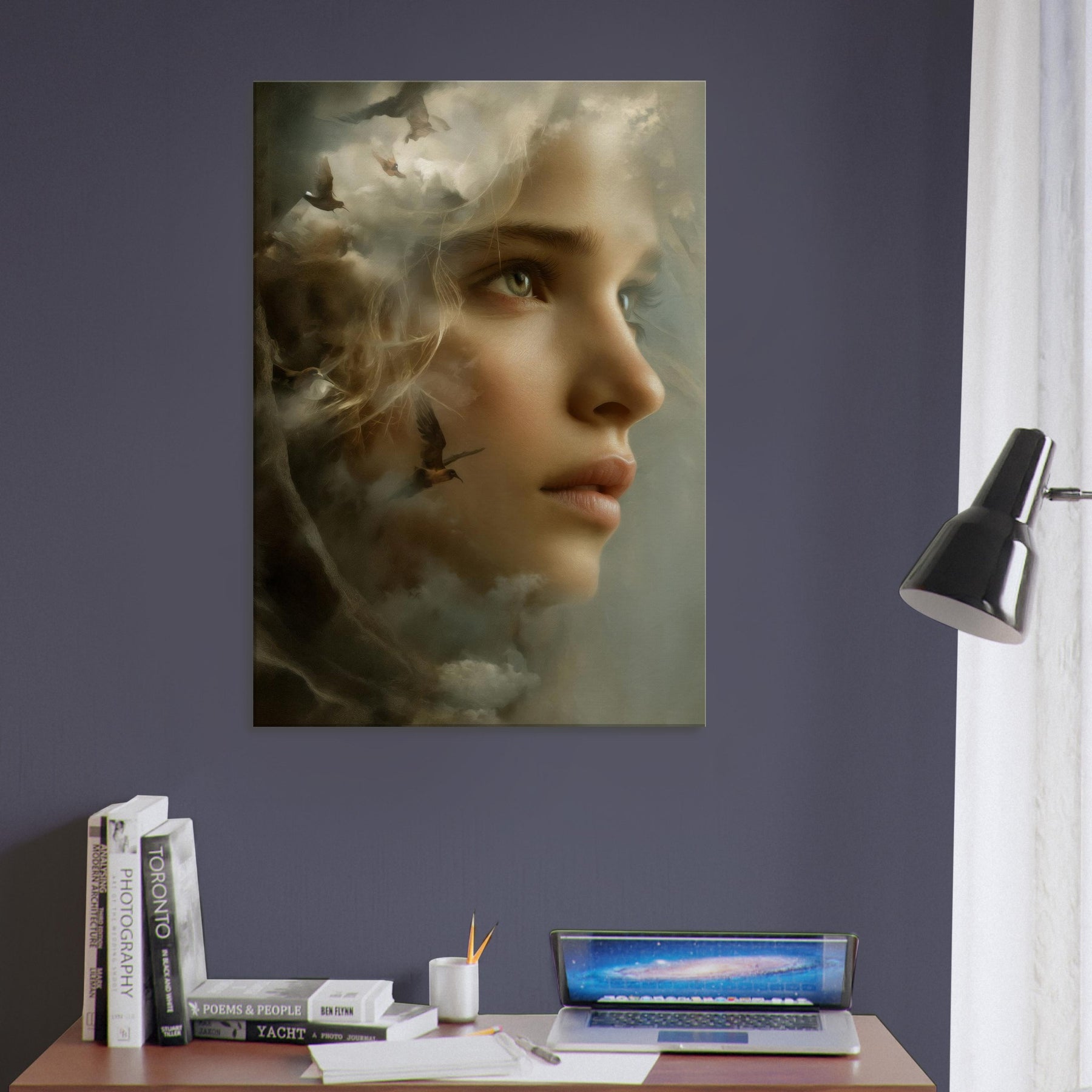 In Mythical Figures (Venus, David), a radiant profile dissolves into mist and migrating birds, as if memory and myth braid into a single gaze. The soft, luminous tones and feathered edges soften the room, turning a wall into a quiet portal between legend and everyday life. Light caresses the cheek, the halo like glow, and invites a moment of stillness. Perfect above a sofa or console, it sparks conversation while wrapping the space in dreamlike warmth.