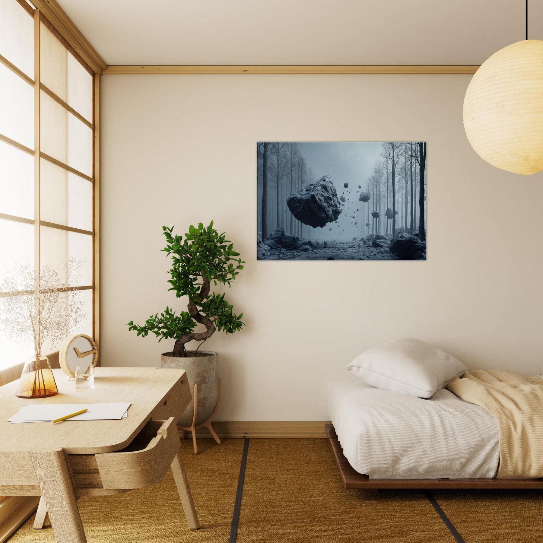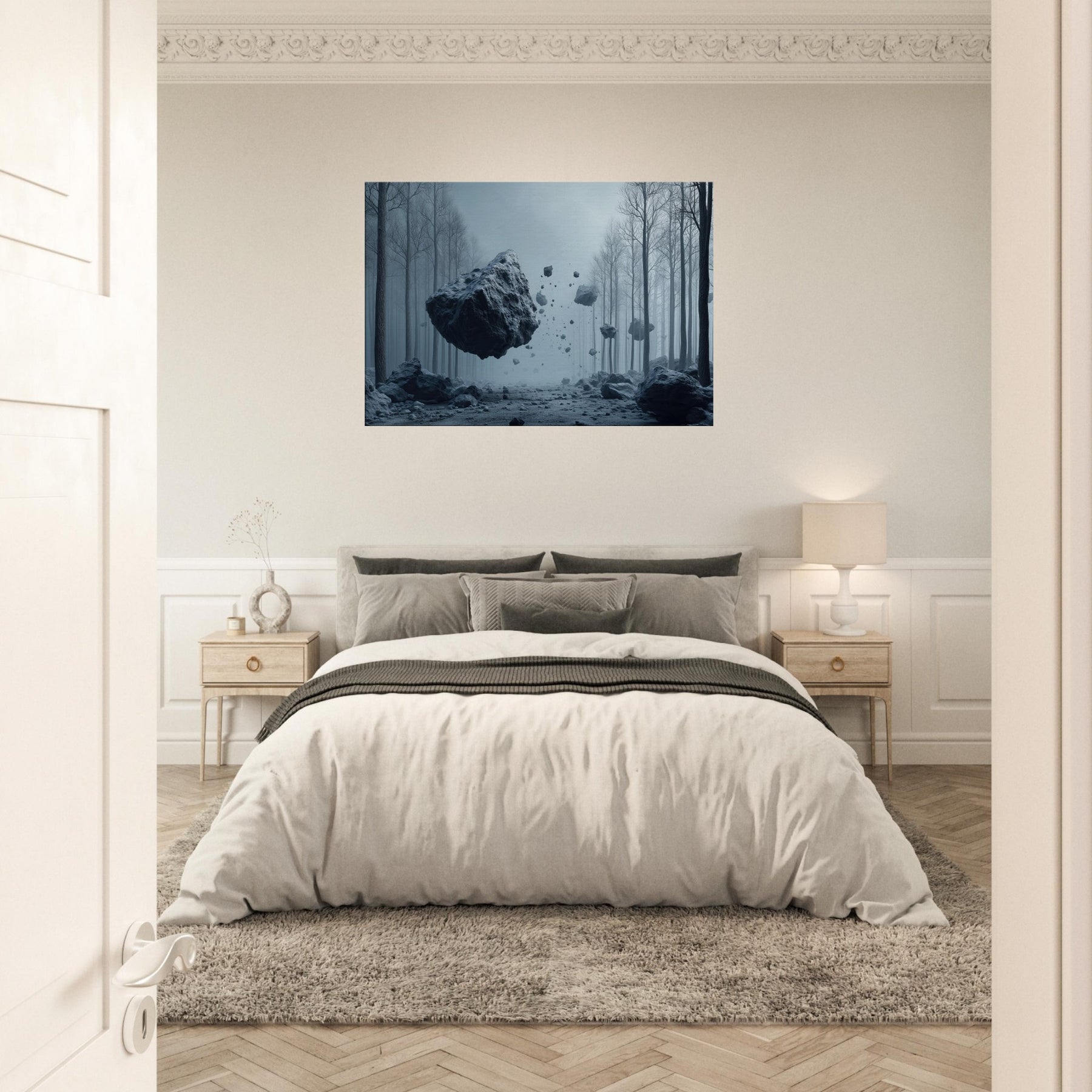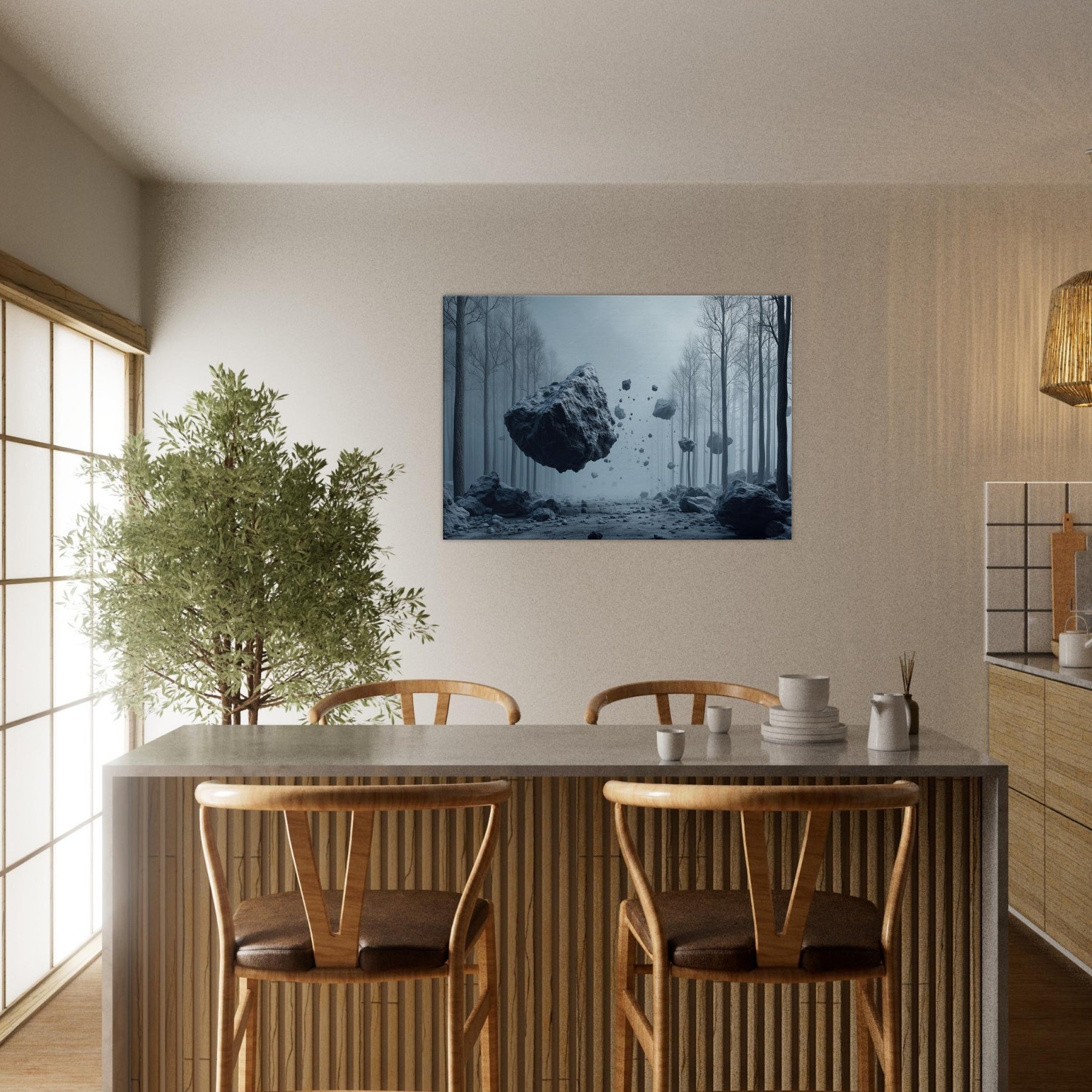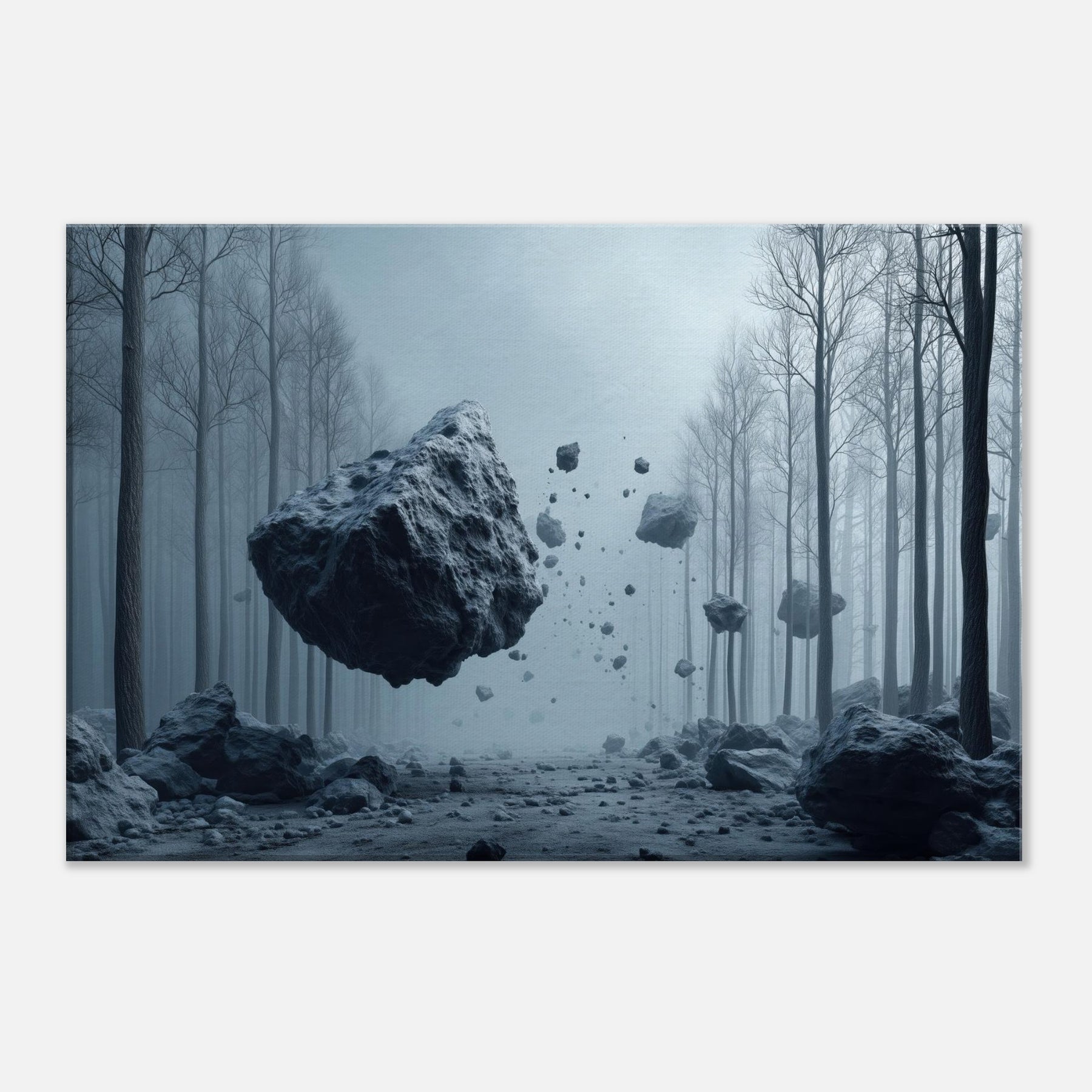 Step into a hush of blue tinted air where the Snowy Forest unfolds as a dream you can inhabit. This surreal composition threads weightless fragments of stone through a misty, frost laced path, inviting the senses to drift and listen. The space between trees becomes a memory of quiet, a room for reflection and slow breathing. Hang this piece to anchor a living space in wonder its cool, cinematic mood circulating light and stillness, turning every window into a portal.