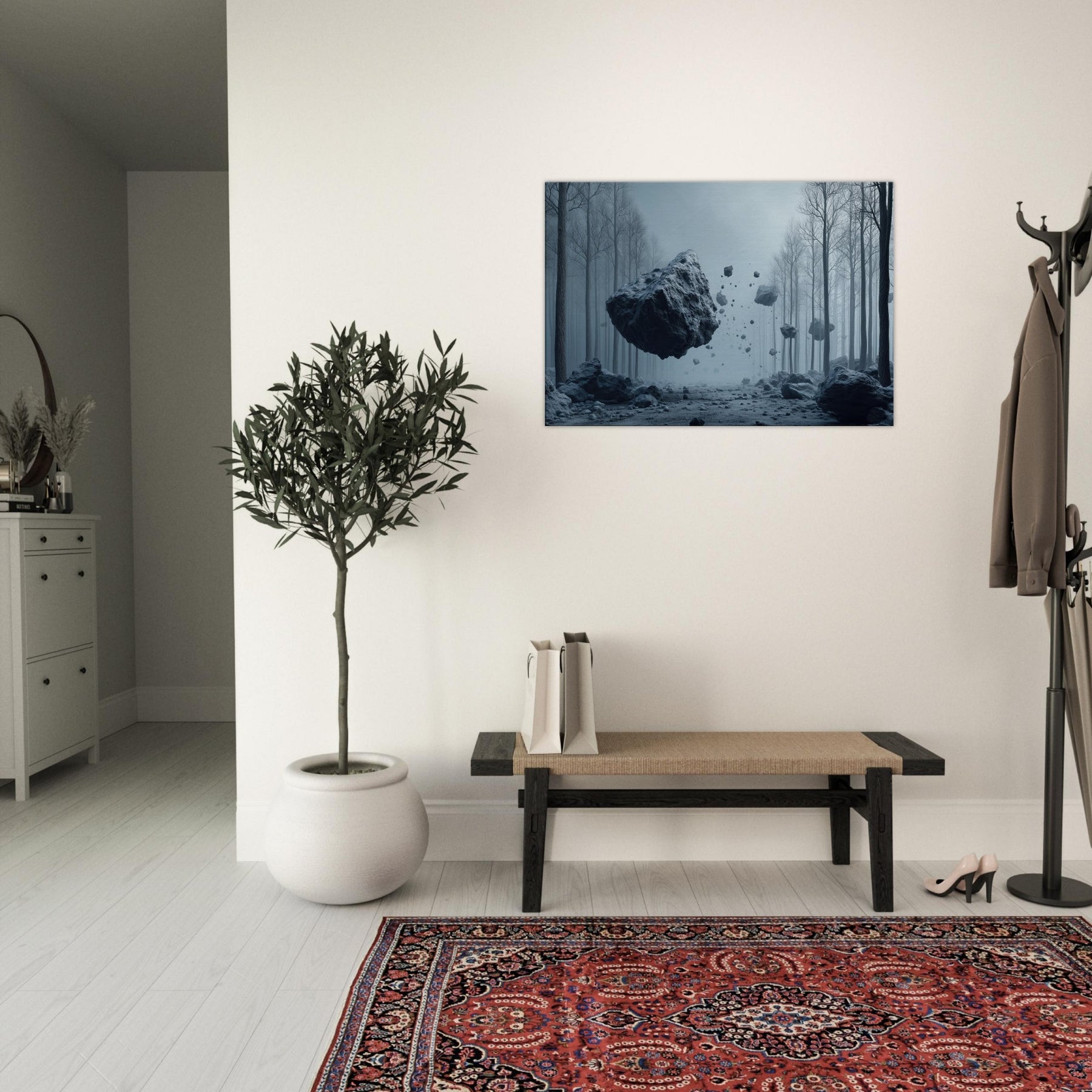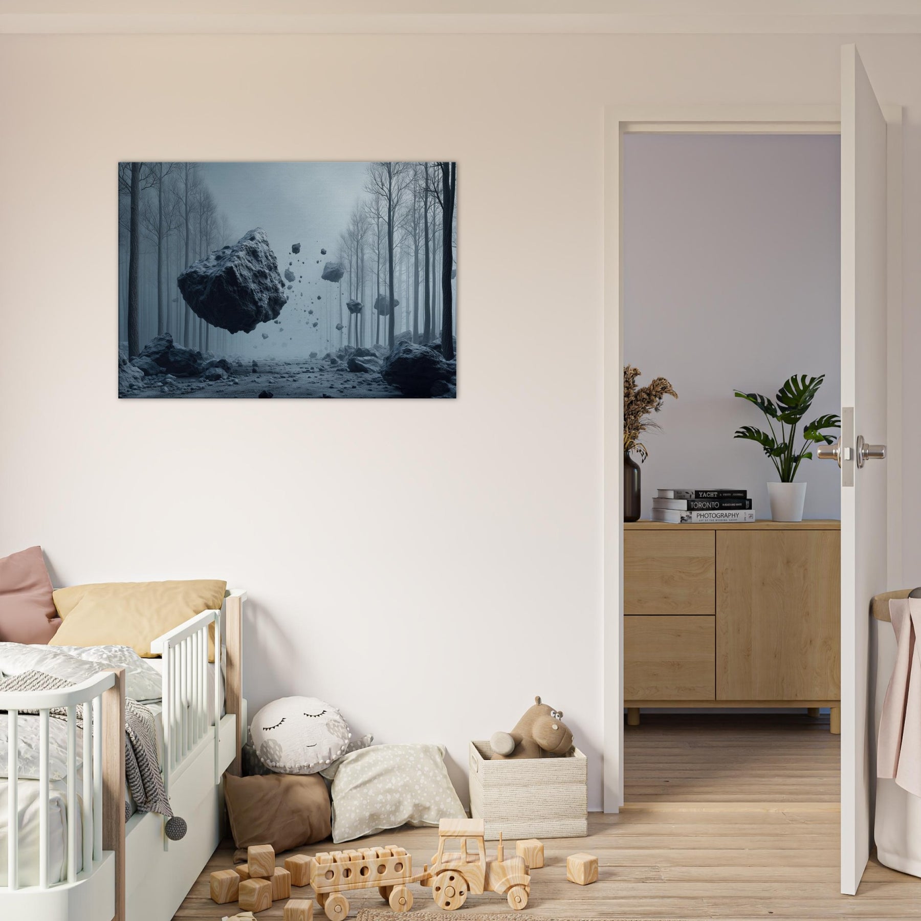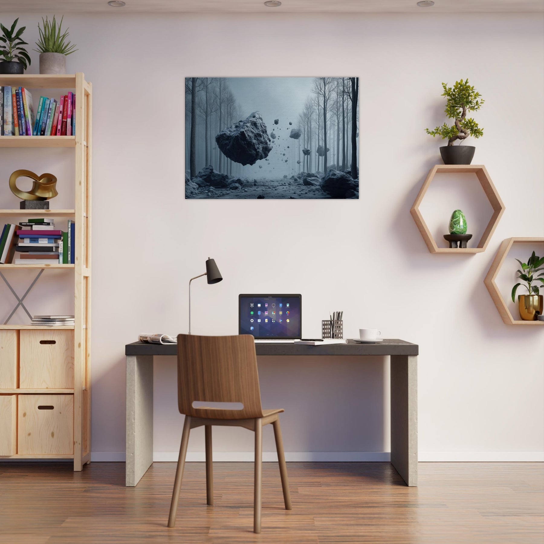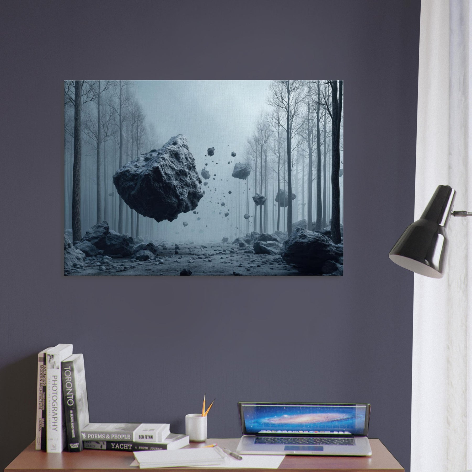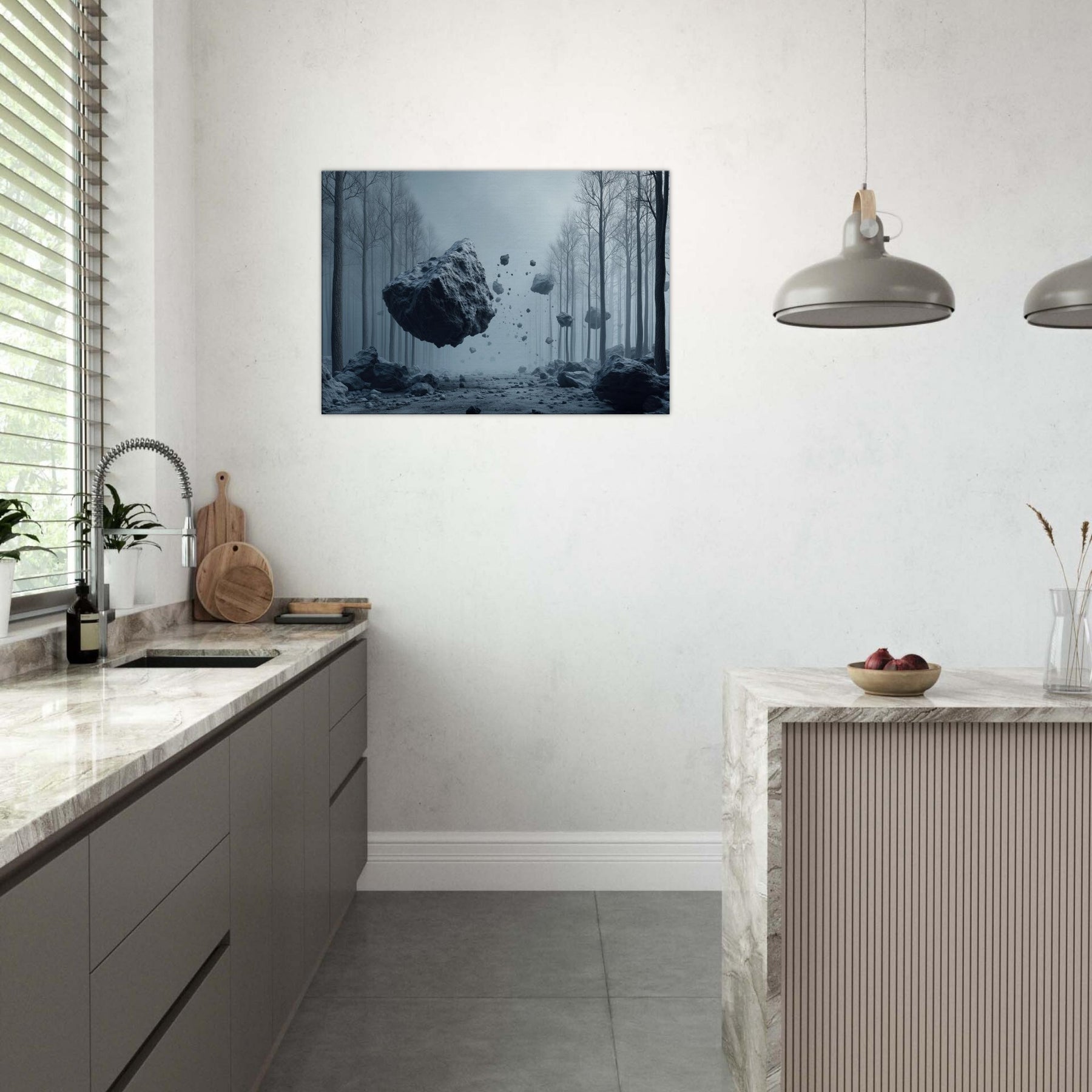 Step into a hush of blue tinted air where the Snowy Forest unfolds as a dream you can inhabit. This surreal composition threads weightless fragments of stone through a misty, frost laced path, inviting the senses to drift and listen. The space between trees becomes a memory of quiet, a room for reflection and slow breathing. Hang this piece to anchor a living space in wonder its cool, cinematic mood circulating light and stillness, turning every window into a portal.