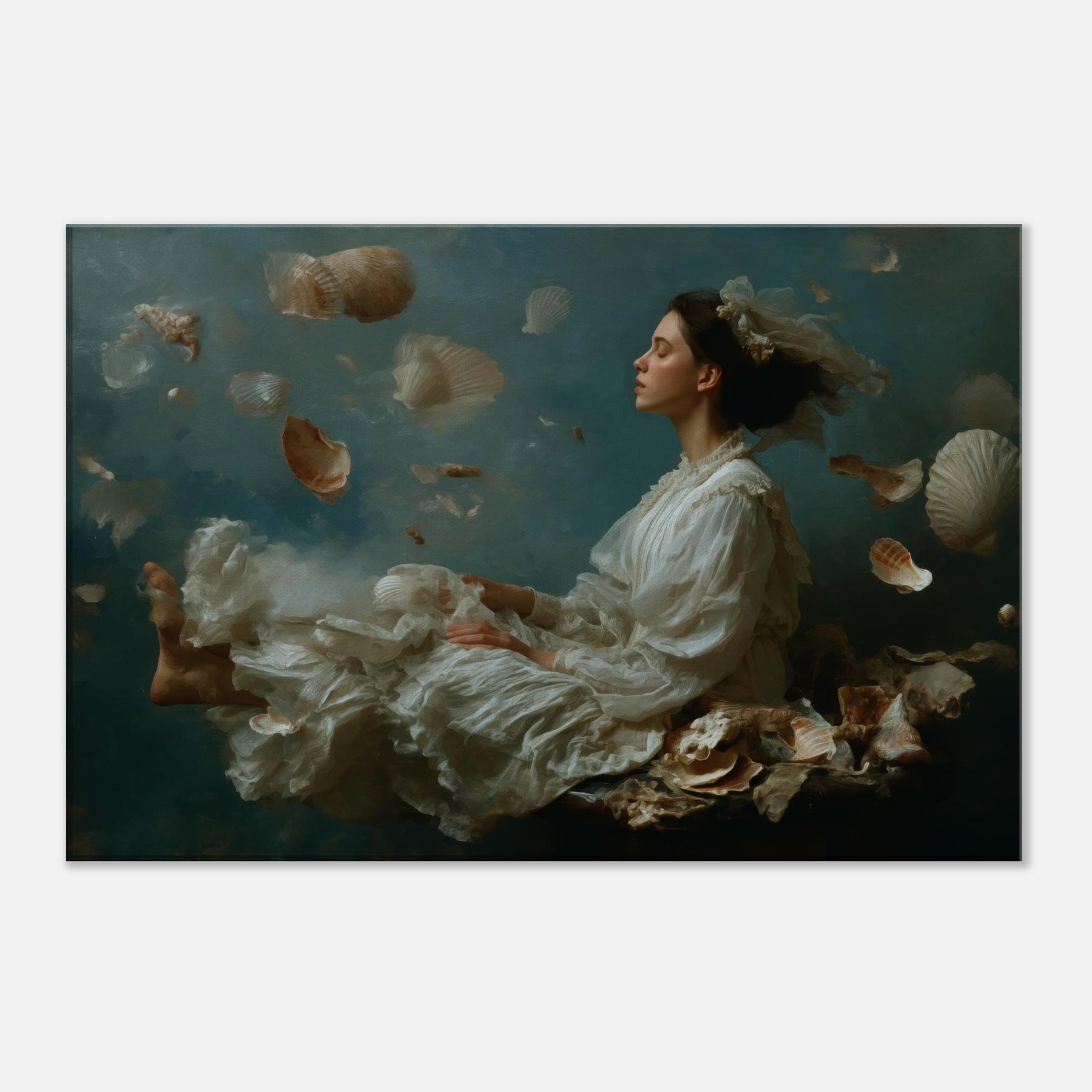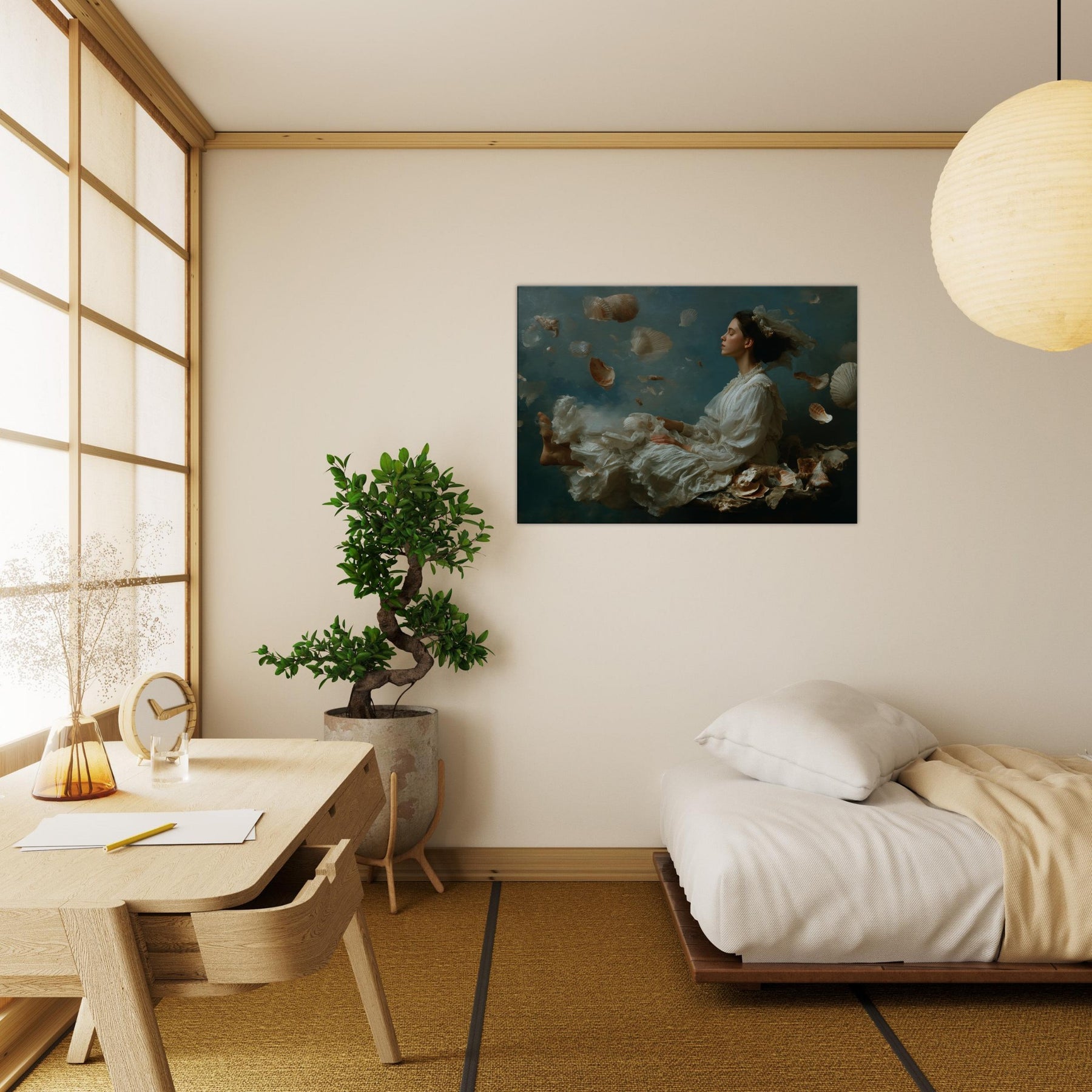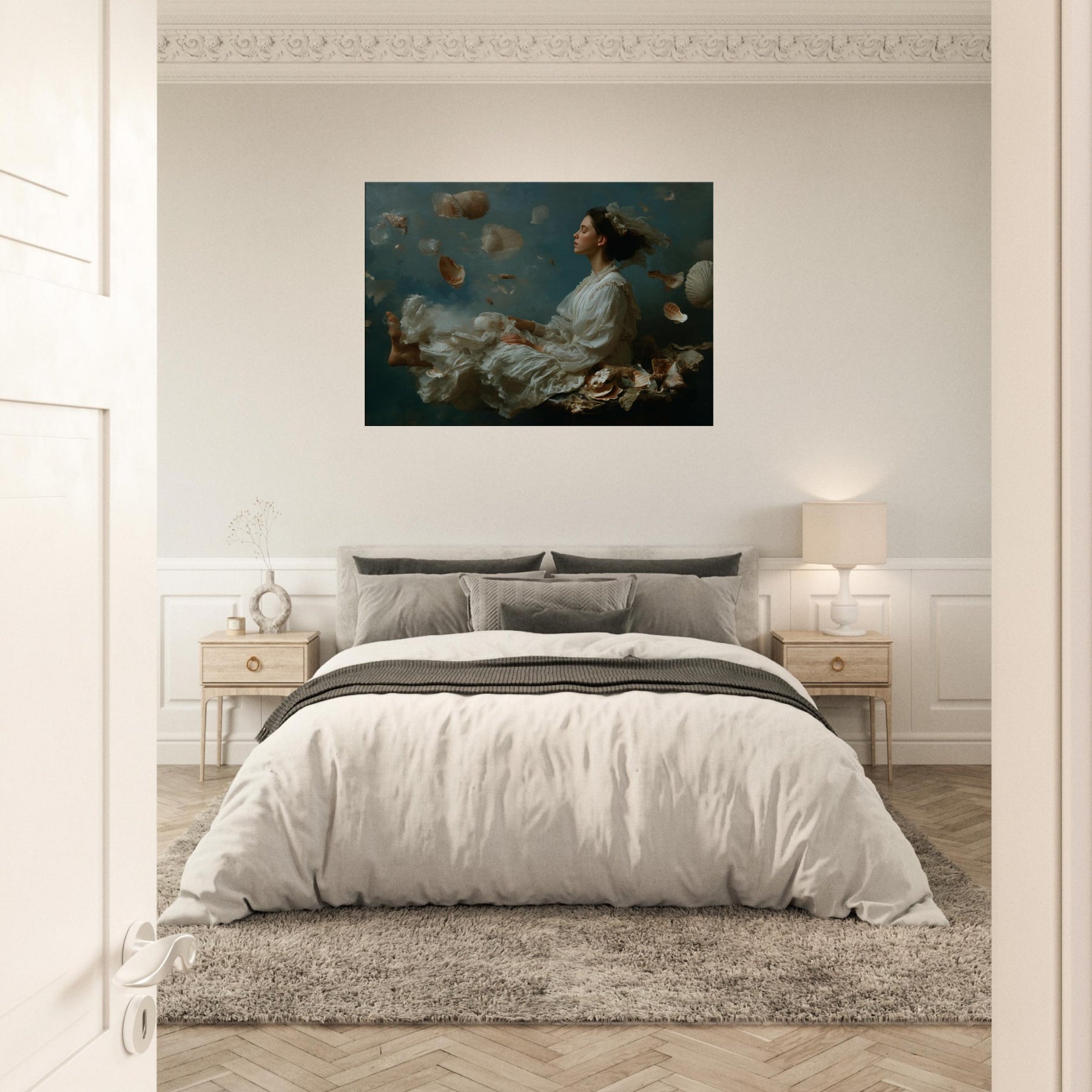 Step into a sea born reverie where the Enchanted Mermaid drifts among a cascade of seashells and pale, feathered fabric. The scene dissolves boundaries between dream and room, letting moonlit light caress silk, skin, and water washed textures. The atmosphere is tranquil, mysterious, and luminous, a sanctuary for the senses. Perfect for a living room or bedroom, it invites quiet contemplation and imaginative escape, turning walls into a flowing, mythic backdrop that softens evenings and elevates everyday moments with wonder.