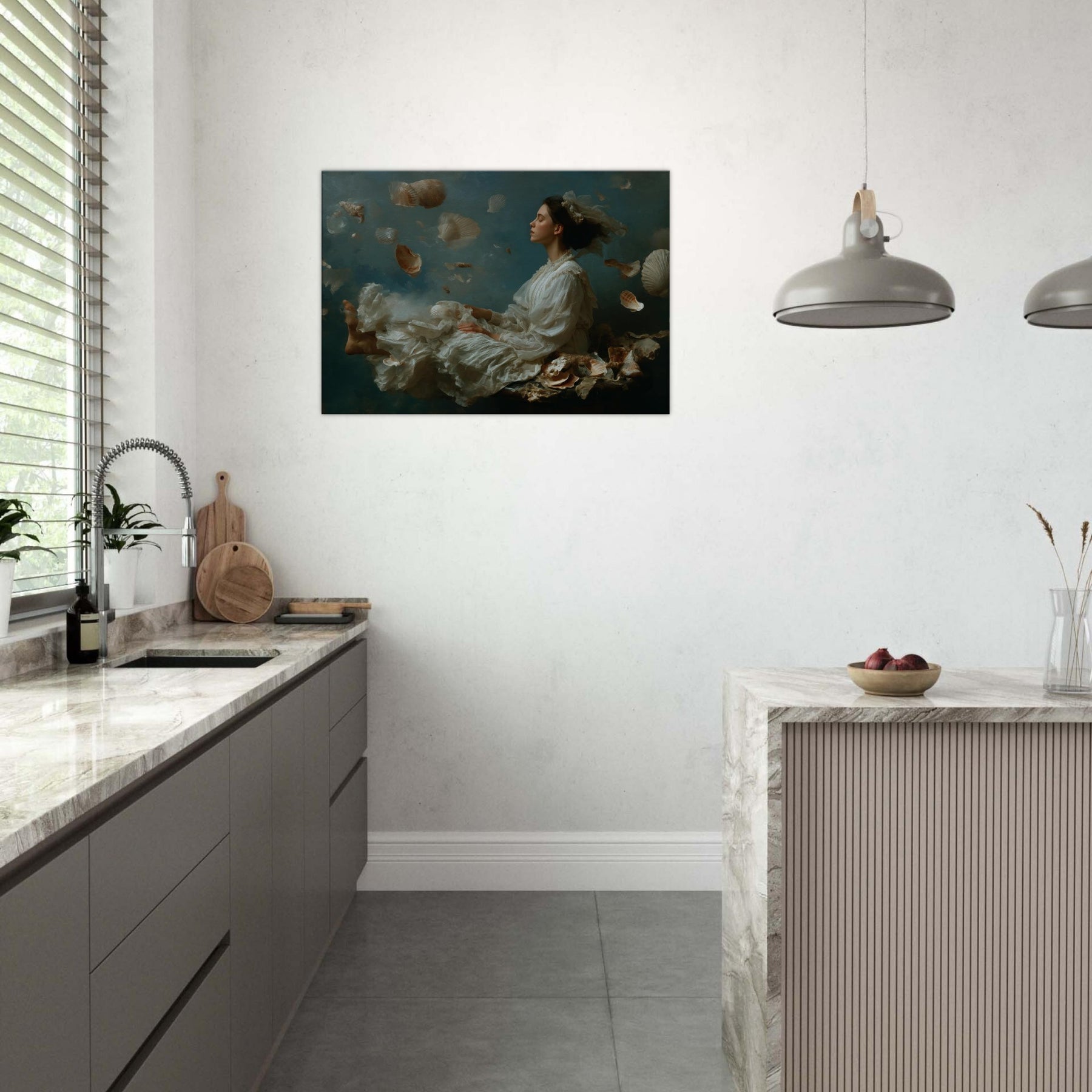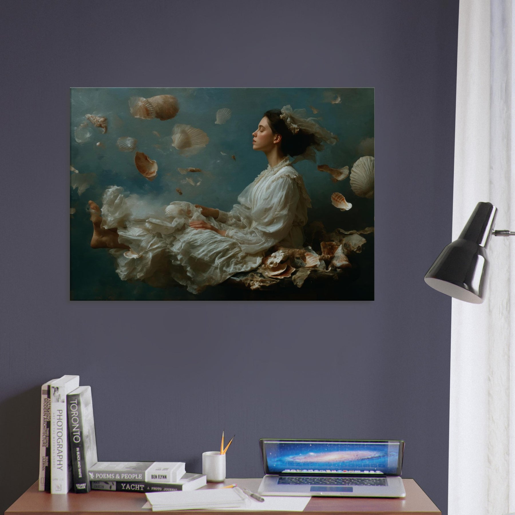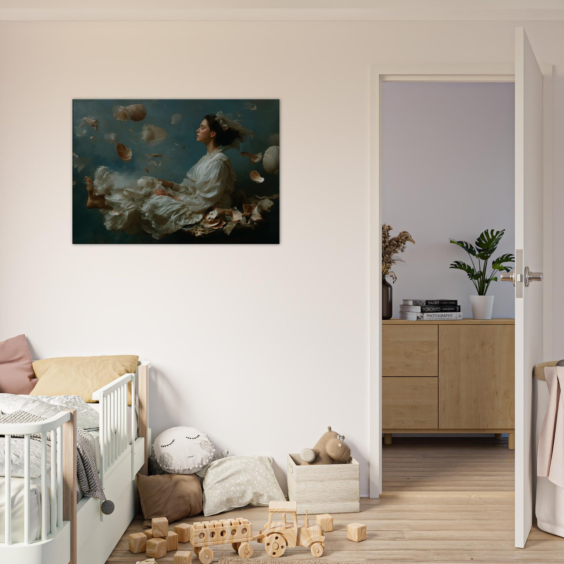 Step into a sea born reverie where the Enchanted Mermaid drifts among a cascade of seashells and pale, feathered fabric. The scene dissolves boundaries between dream and room, letting moonlit light caress silk, skin, and water washed textures. The atmosphere is tranquil, mysterious, and luminous, a sanctuary for the senses. Perfect for a living room or bedroom, it invites quiet contemplation and imaginative escape, turning walls into a flowing, mythic backdrop that softens evenings and elevates everyday moments with wonder.