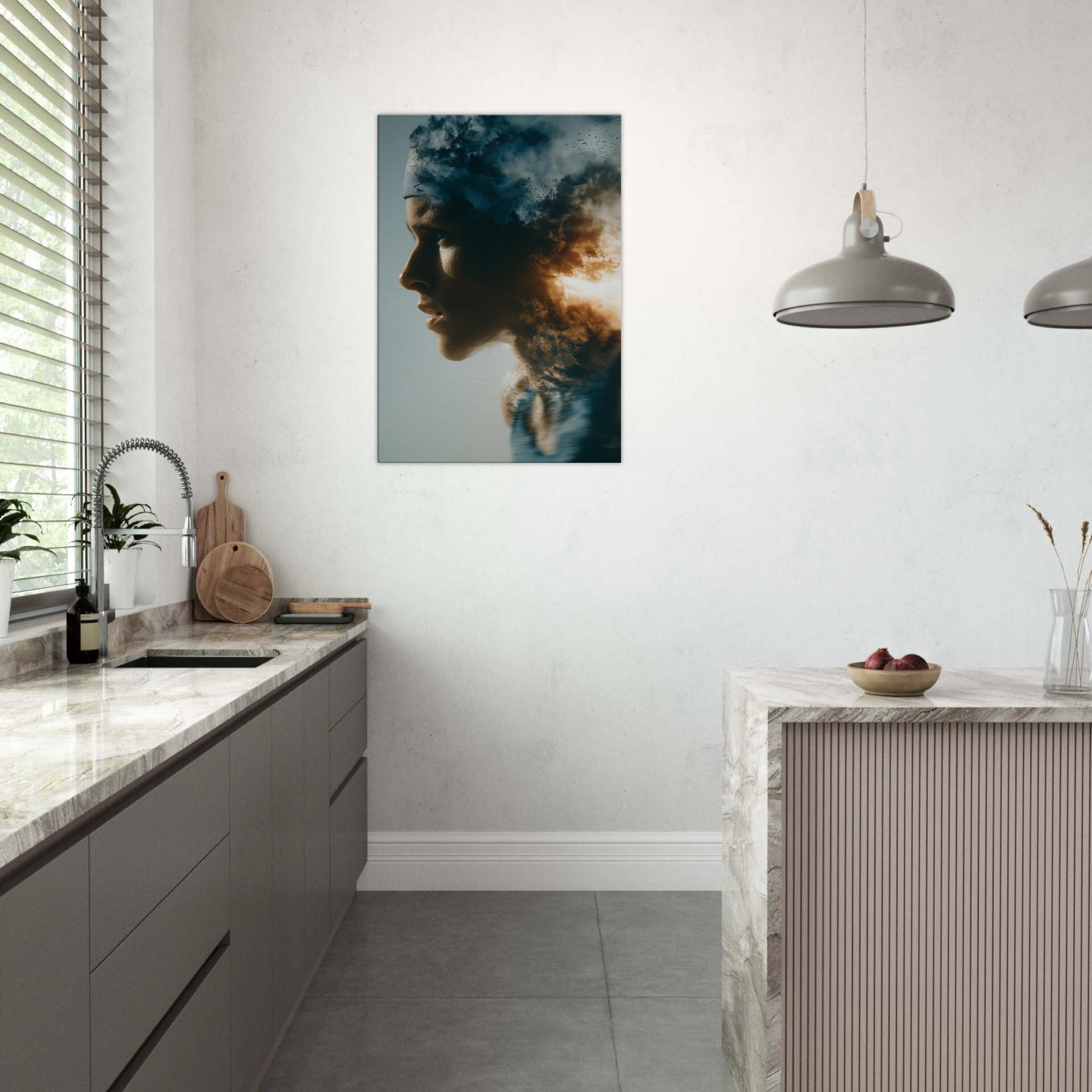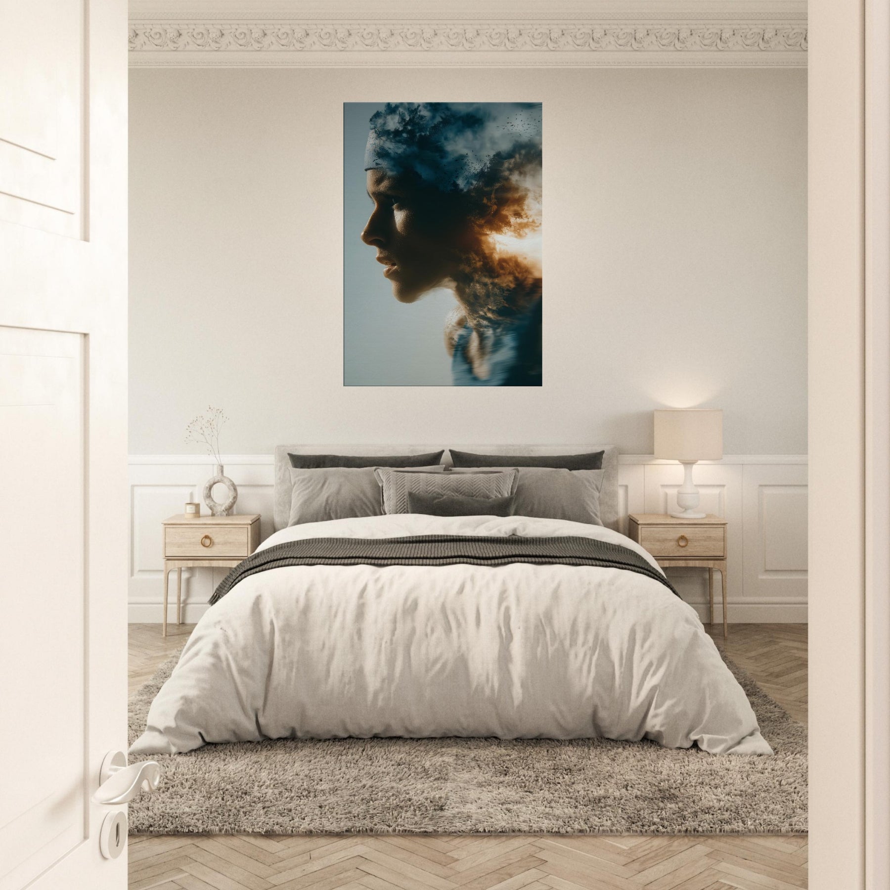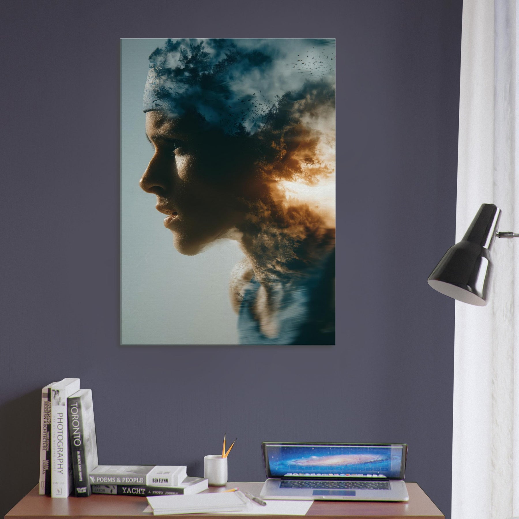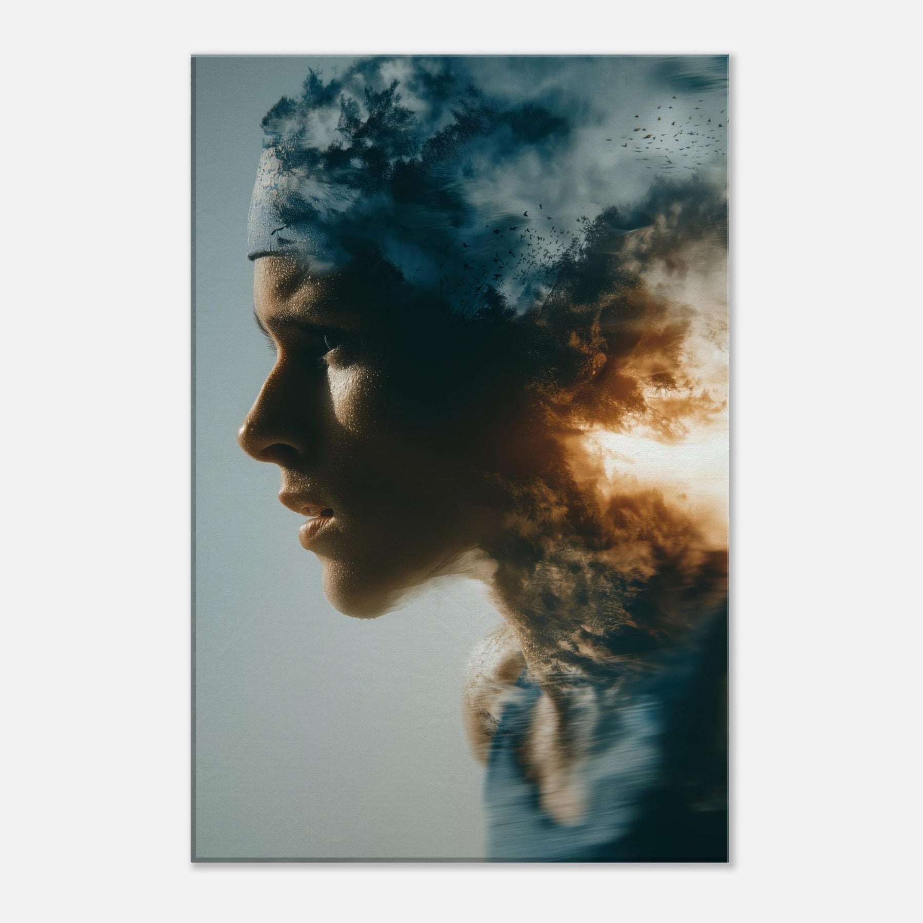 This painting folds a human profile into a shifting sky, where breath becomes weather and motion becomes memory. The Runner in Motion threads through clouds of dusk and sunlit flame, giving a sense of forward pull and quiet resilience. The surreal layering invites reflection as you enter a room, turning a wall into a corridor of emotion. It pairs soft flesh tones with high contrast light, making a living space feel expansive, intimate, and alive with movement.