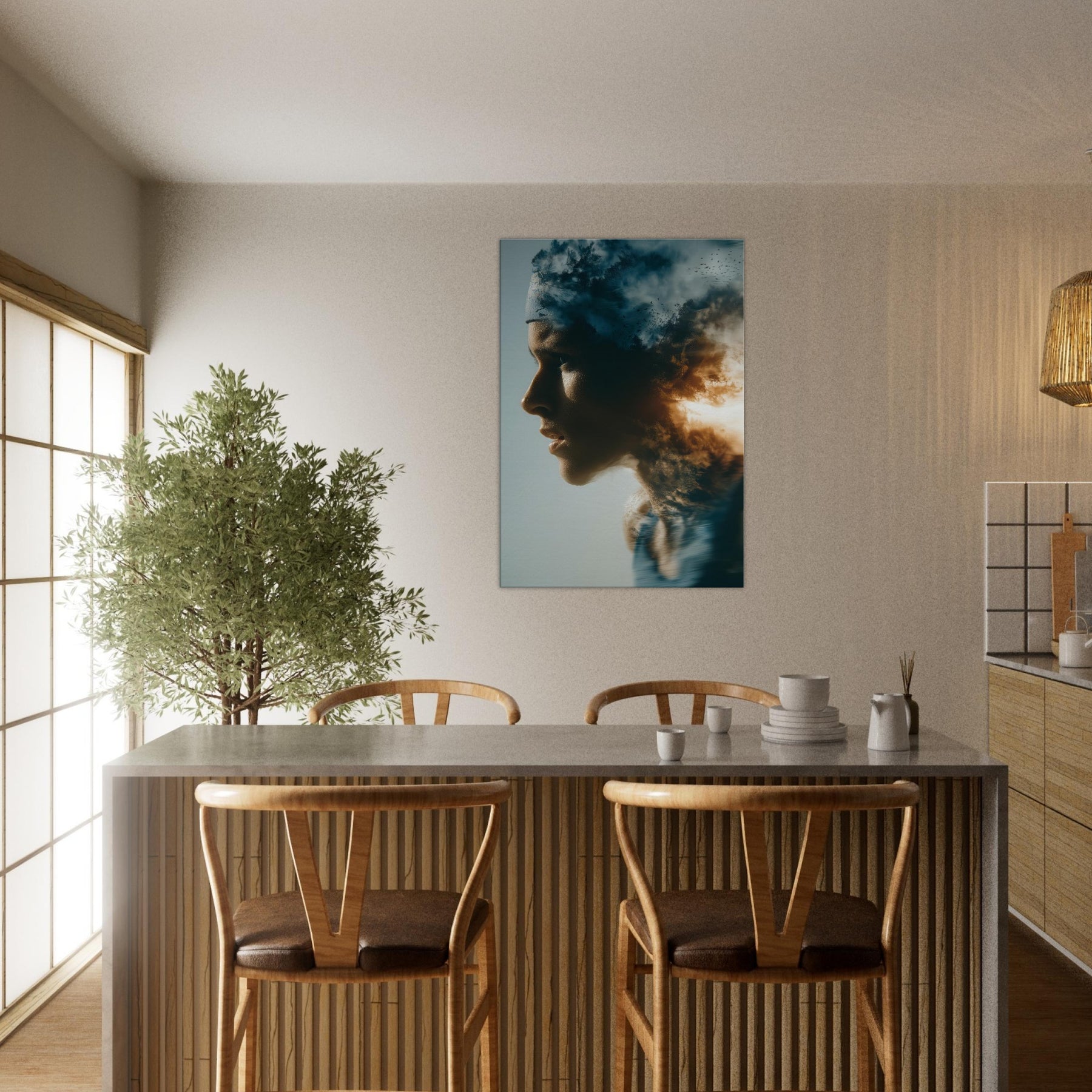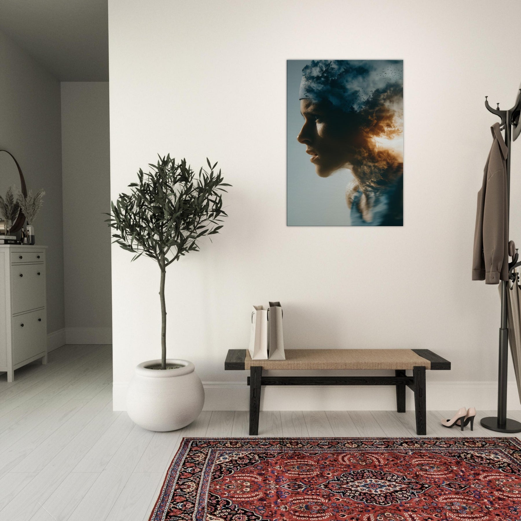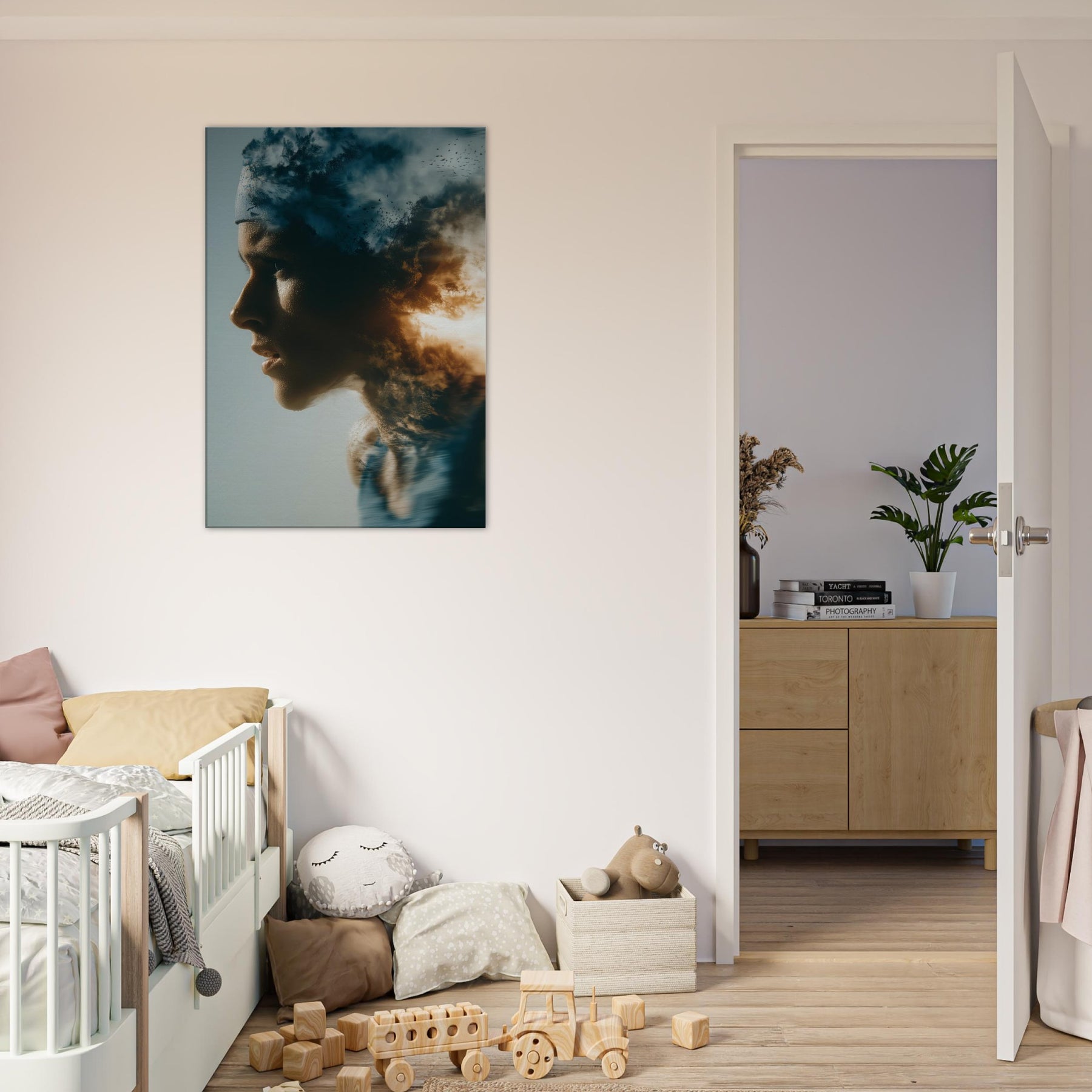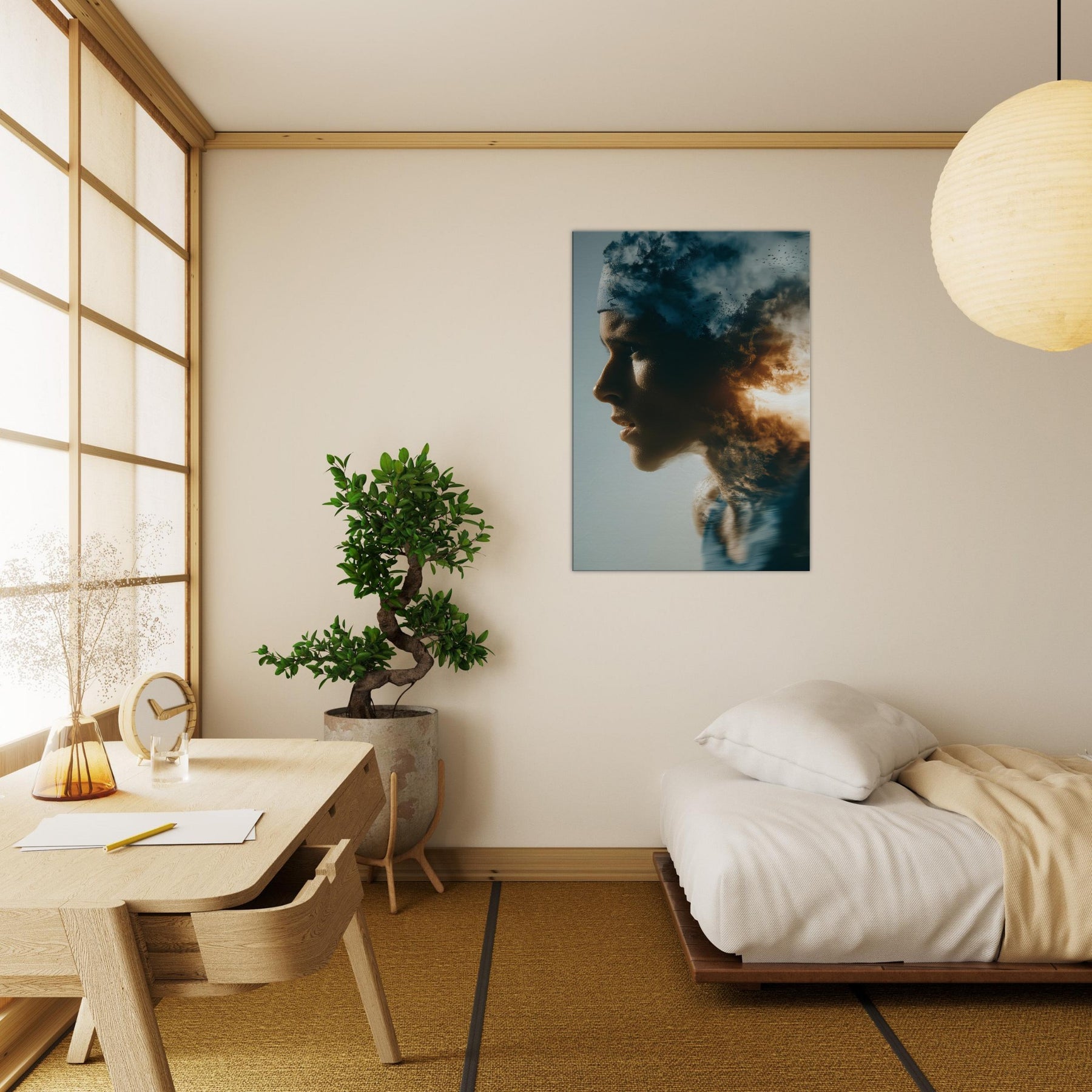 This painting folds a human profile into a shifting sky, where breath becomes weather and motion becomes memory. The Runner in Motion threads through clouds of dusk and sunlit flame, giving a sense of forward pull and quiet resilience. The surreal layering invites reflection as you enter a room, turning a wall into a corridor of emotion. It pairs soft flesh tones with high contrast light, making a living space feel expansive, intimate, and alive with movement.