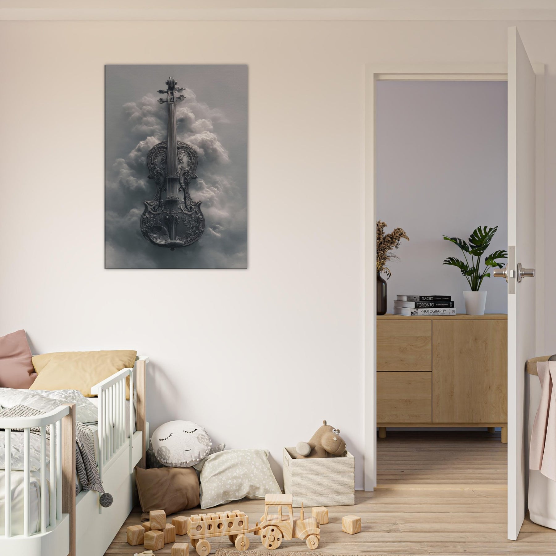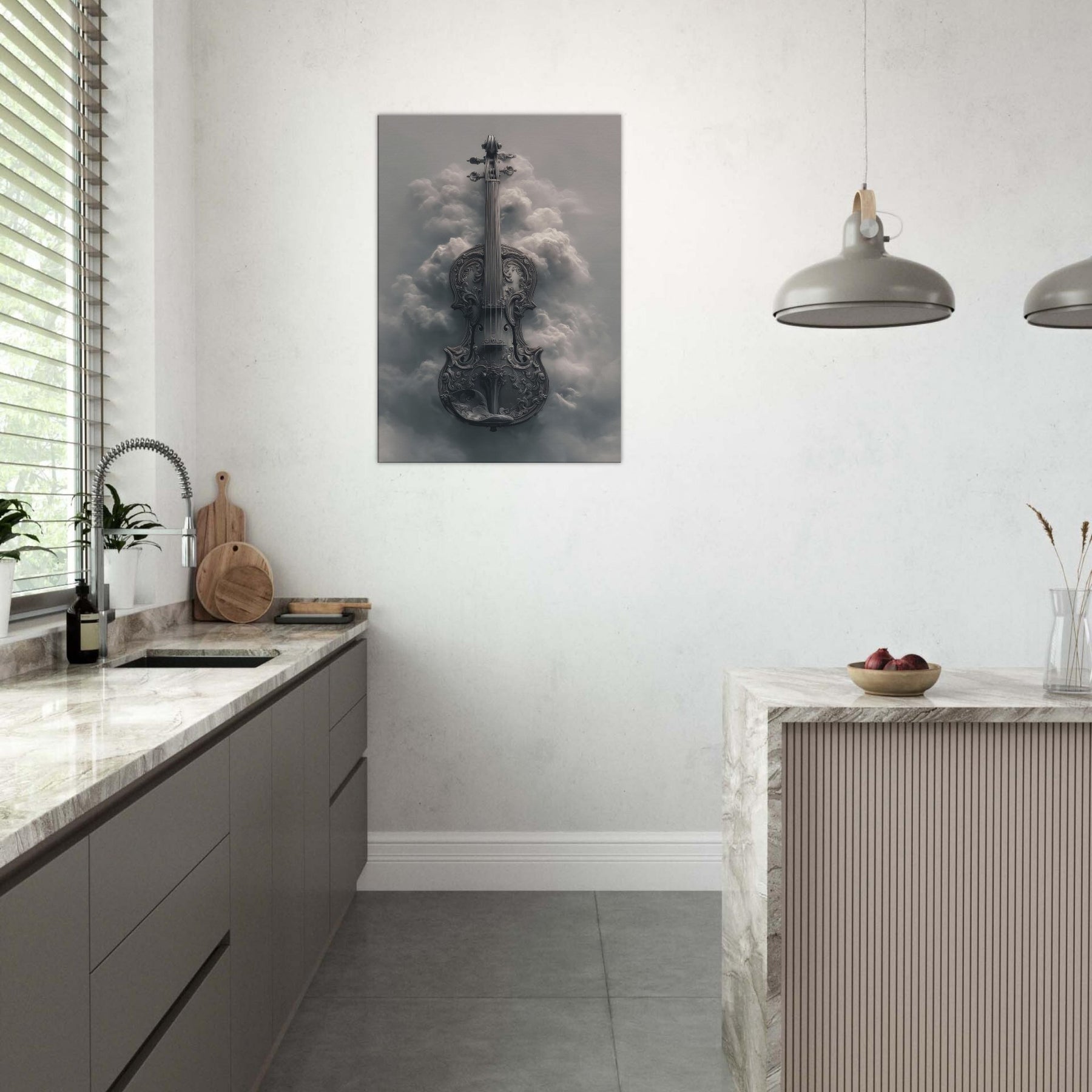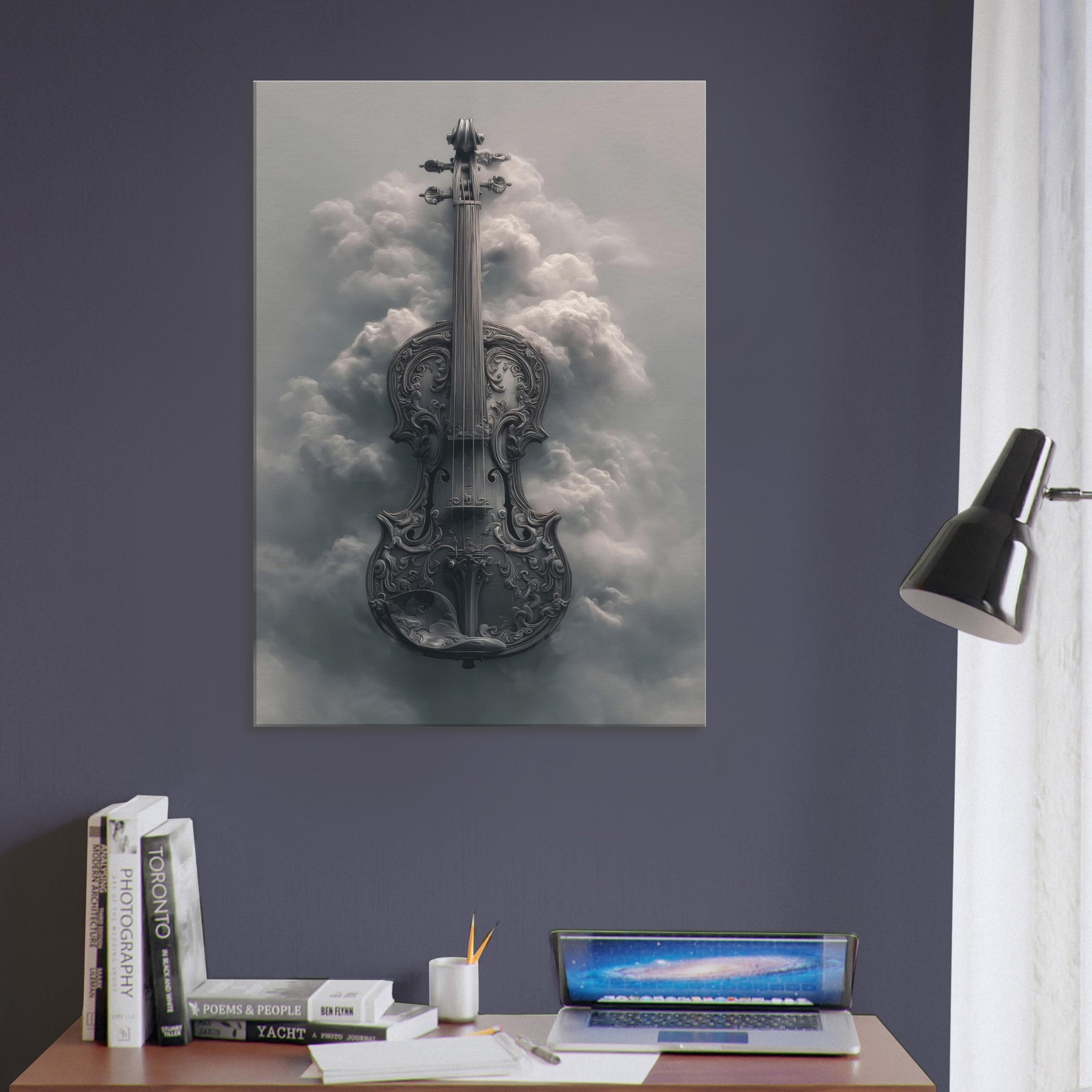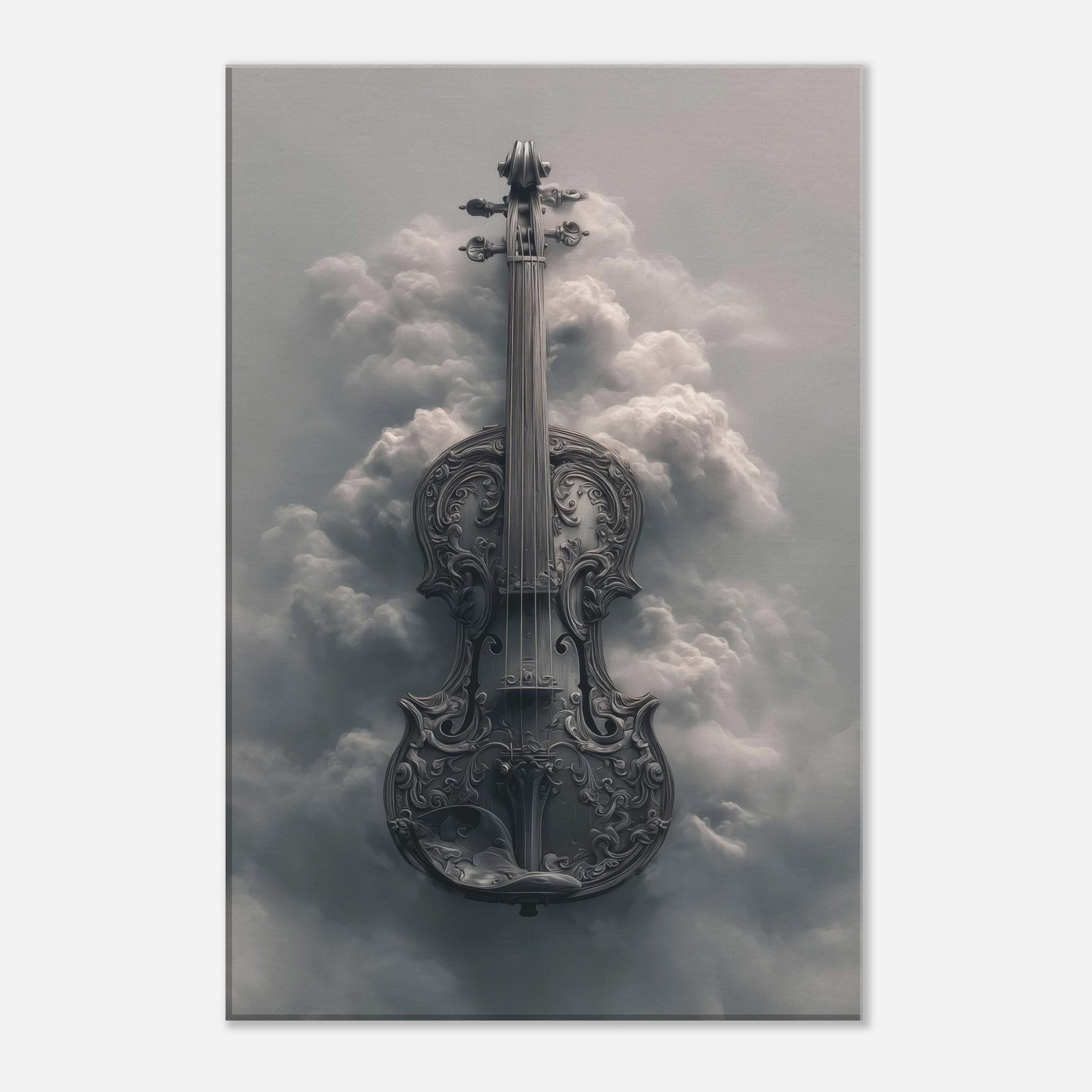 Suspended between stormlight and stillness, this image unfolds like a dream of music. The violin, carved with intricate scrollwork, dissolves into a ethereal cloudscape, each curve catching a sigh of wind and echoing through soft light. It invites a quiet reverie, turning a plain wall into a window of memory and possibility. Perfect for a living room or study, it adds atmosphere romance without nostalgia, discipline without dullness an artful reminder that beauty can hover in the margins of the day.