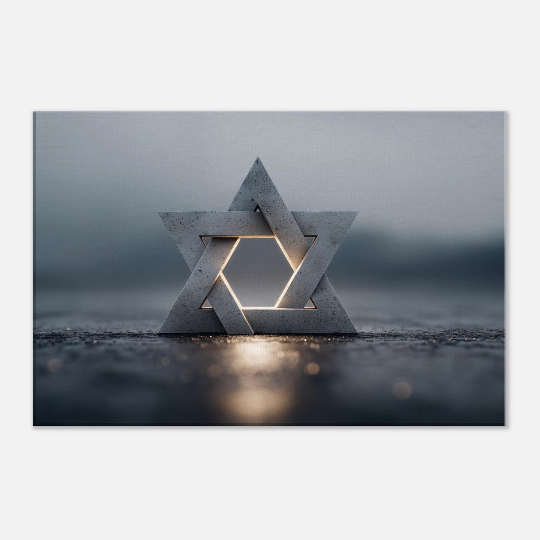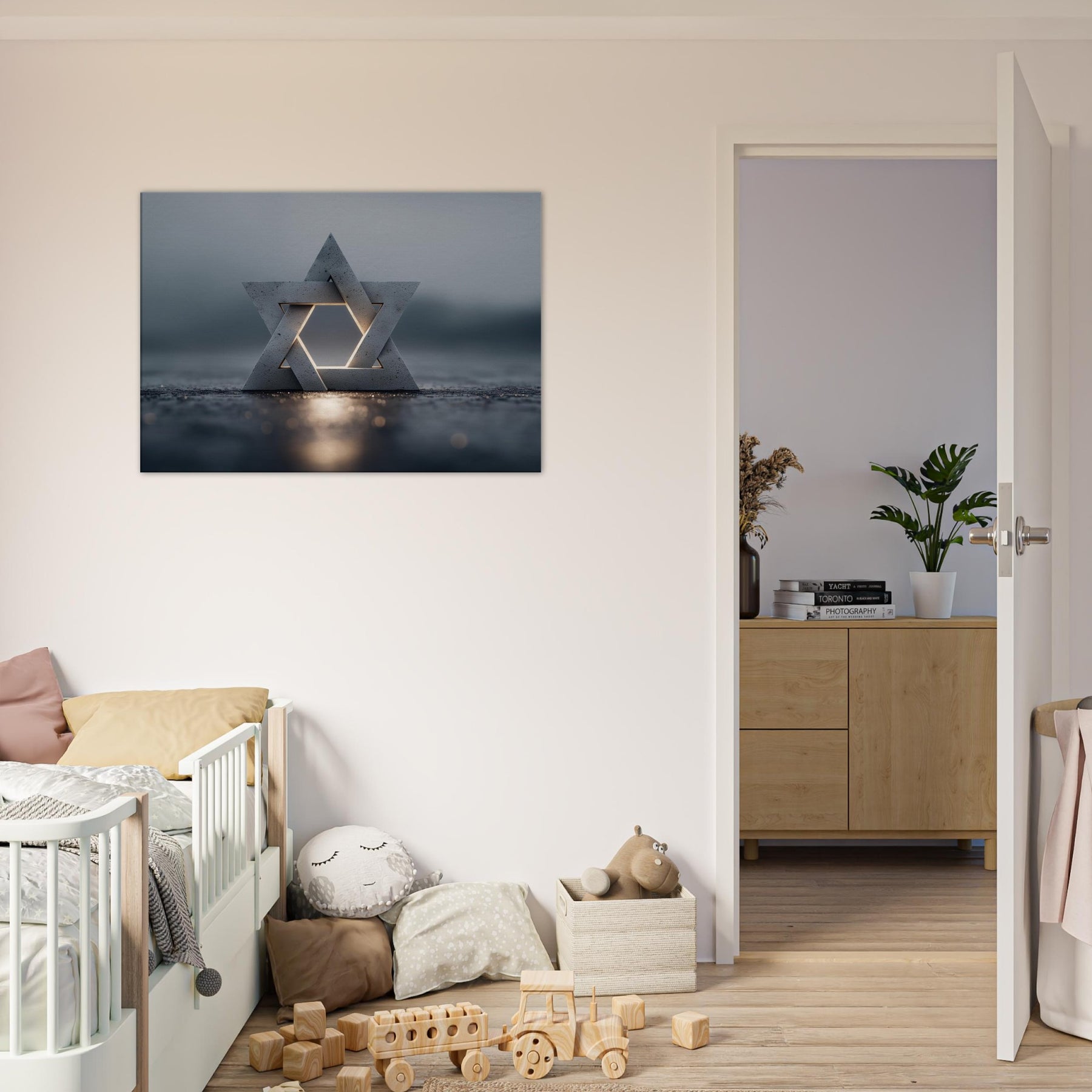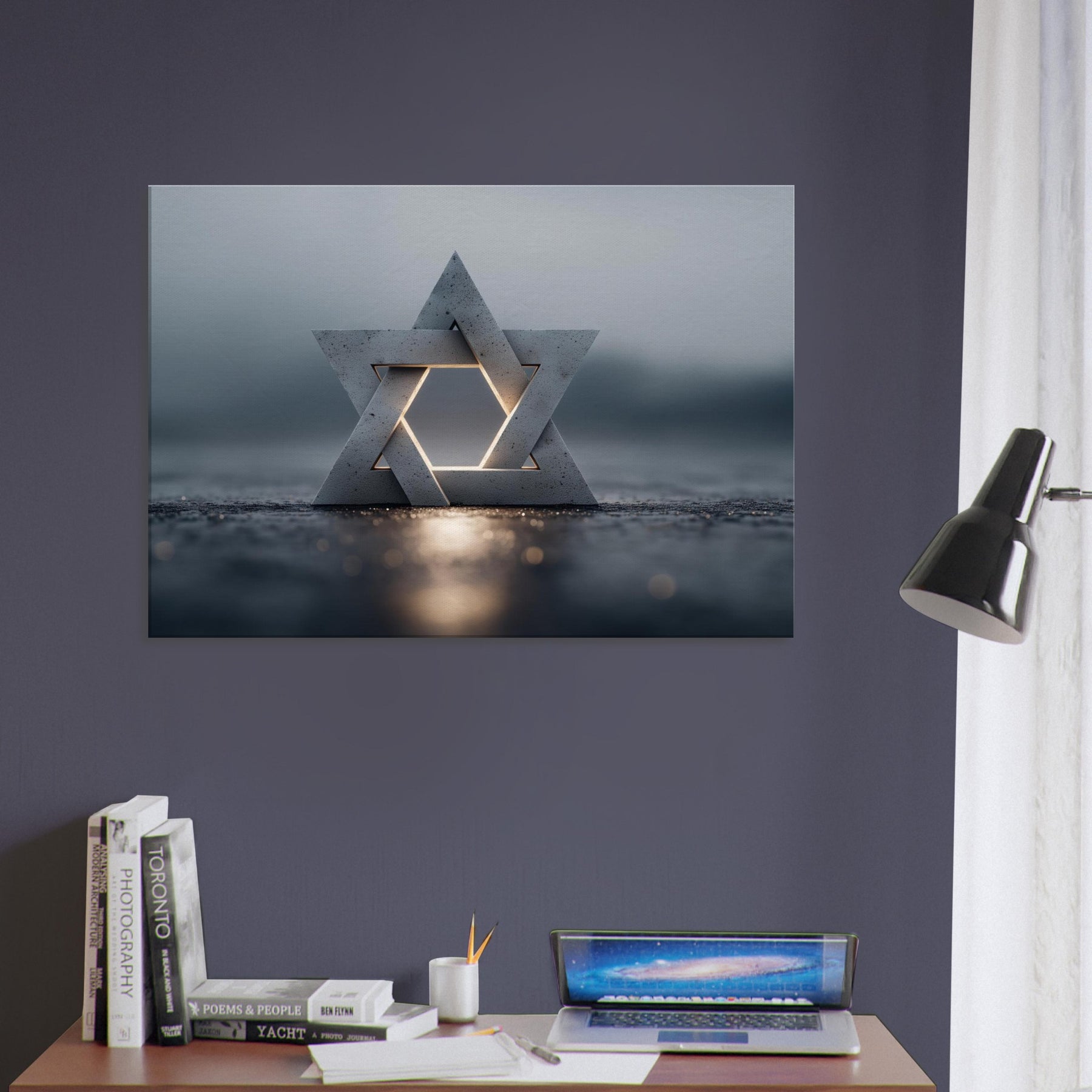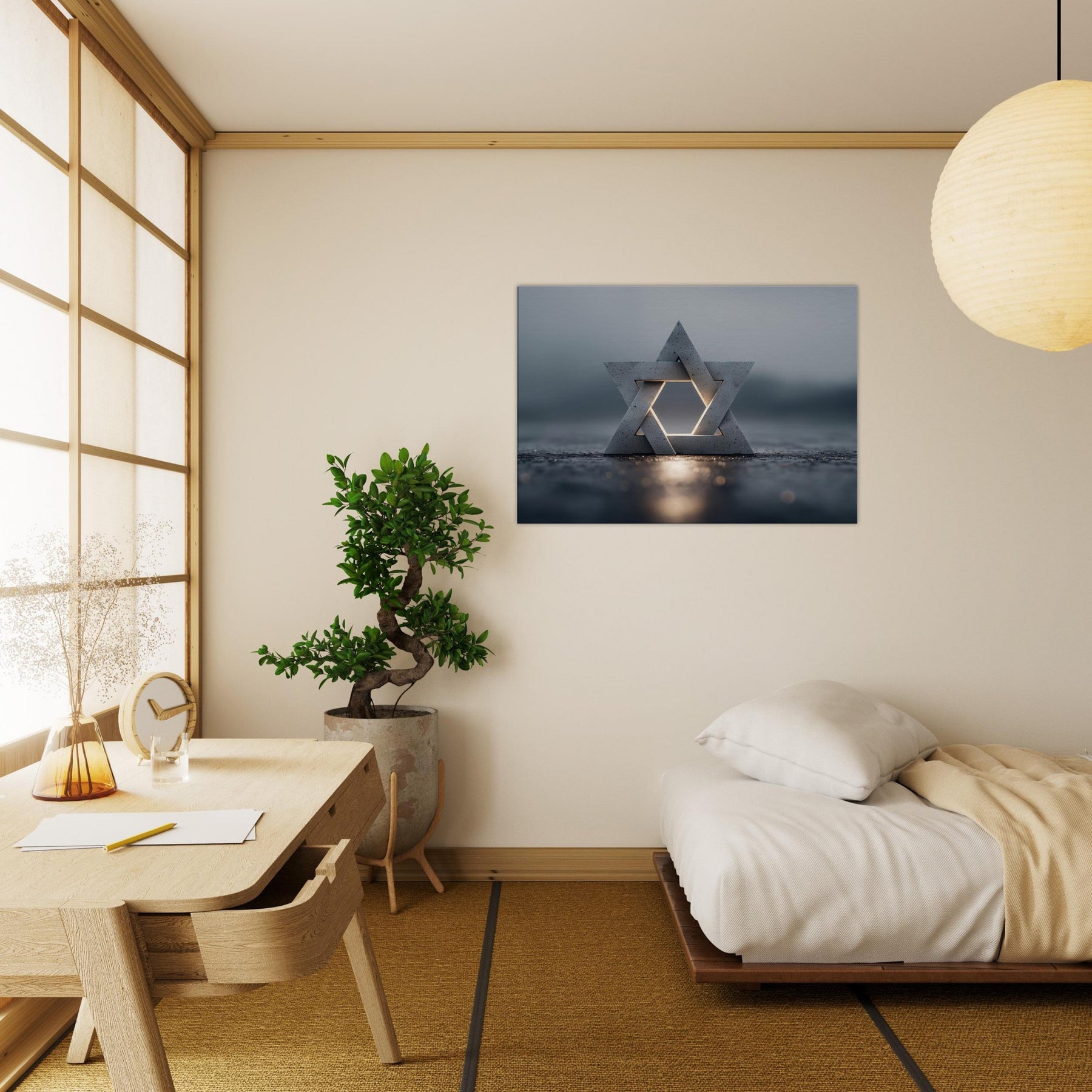 Featuring the Star of David (Minimal Line), this piece unfolds as two slender interlocking triangles that cast a gentle, inner glow. Surreal in its quiet geometry, it feels like a doorway rather than a symbol a mystical moment captured in concrete textured lines. The warm illumination against cool, stone like heft evokes dawn on a quiet horizon, inviting calm and contemplation. Perfect for a living space that breathes above a sofa, in a bedroom nook, or a study wall where texture, light, and intention converge in serene focus.