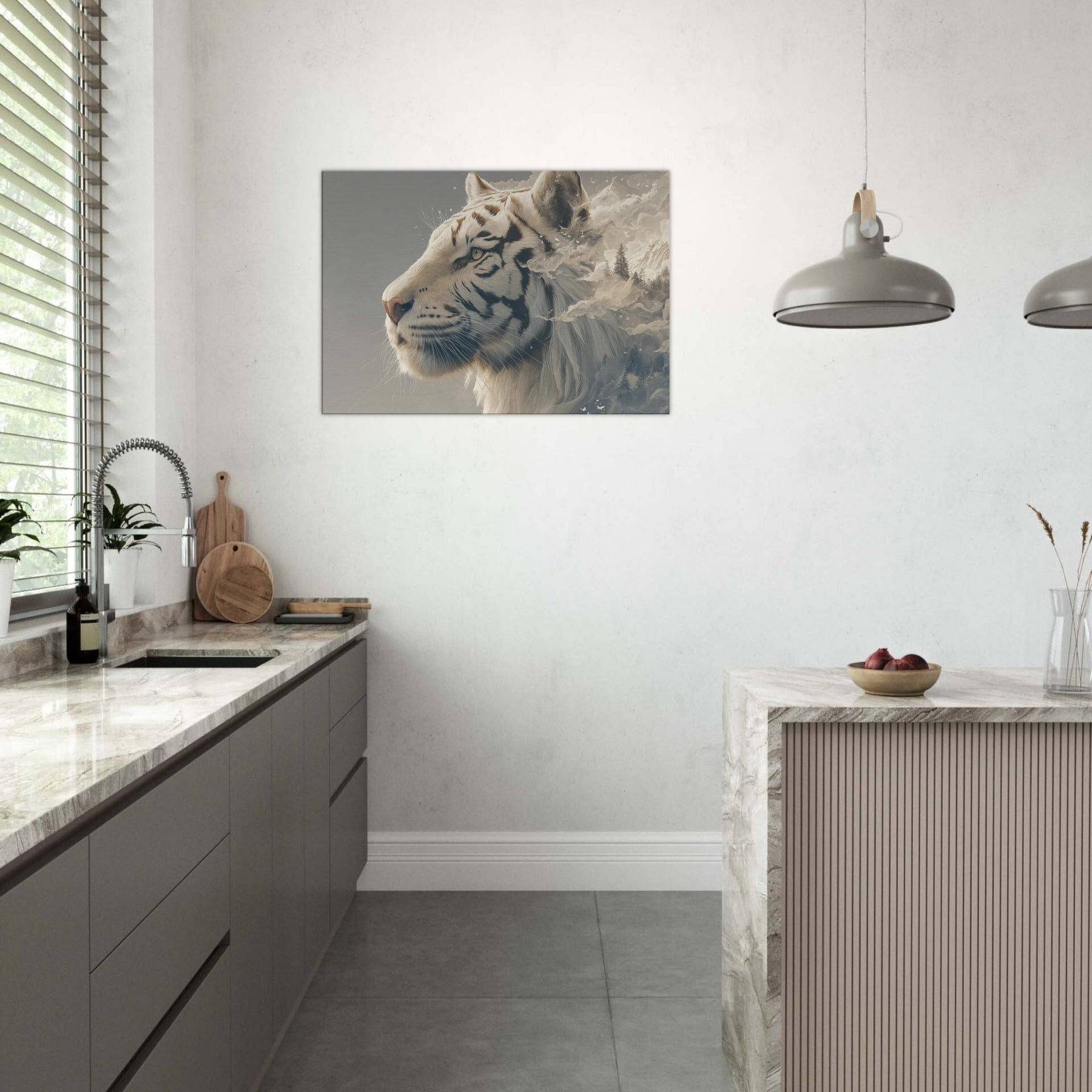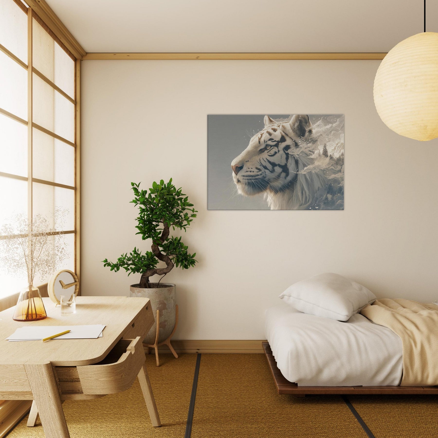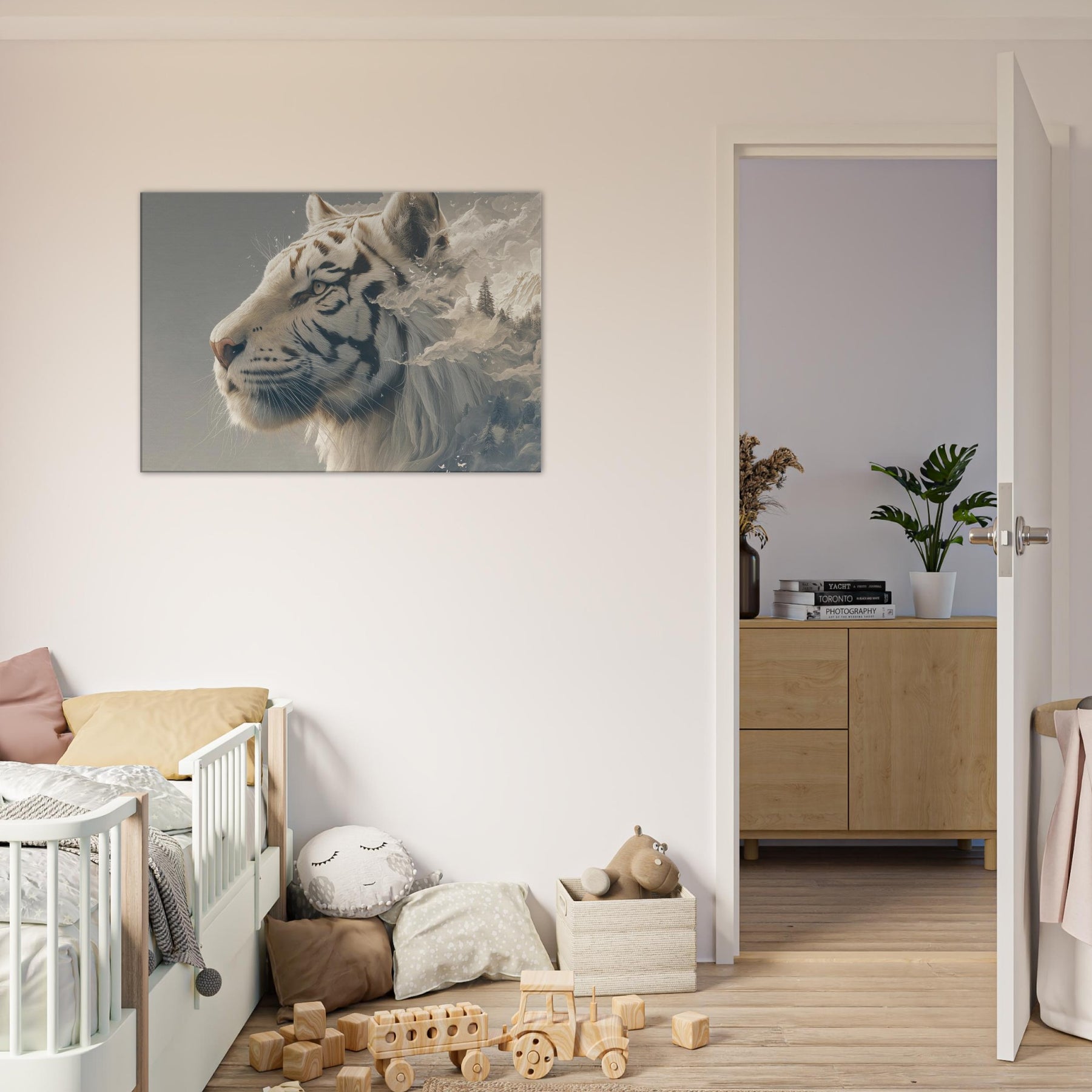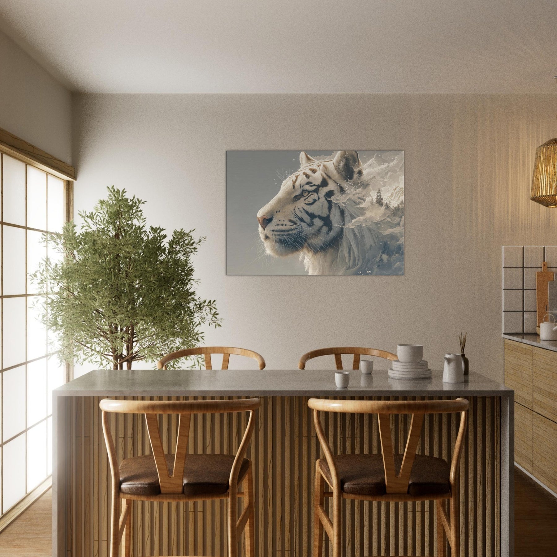 Immersed in a quiet dawn, this piece threads a Tiger through a hazy alpine dream. Wind swept fur glints with snowfall as mountains dissolve into soft smoke, creating a tension between wilderness and room. The image invites slow, thoughtful gazes, turning a living space into a contemplative . Hang it where light drifts across the wall, and let the tiger's calm, watchful presence echo in your lounge or study a reminder that strength can be graceful, and wildness can become art you live with daily.