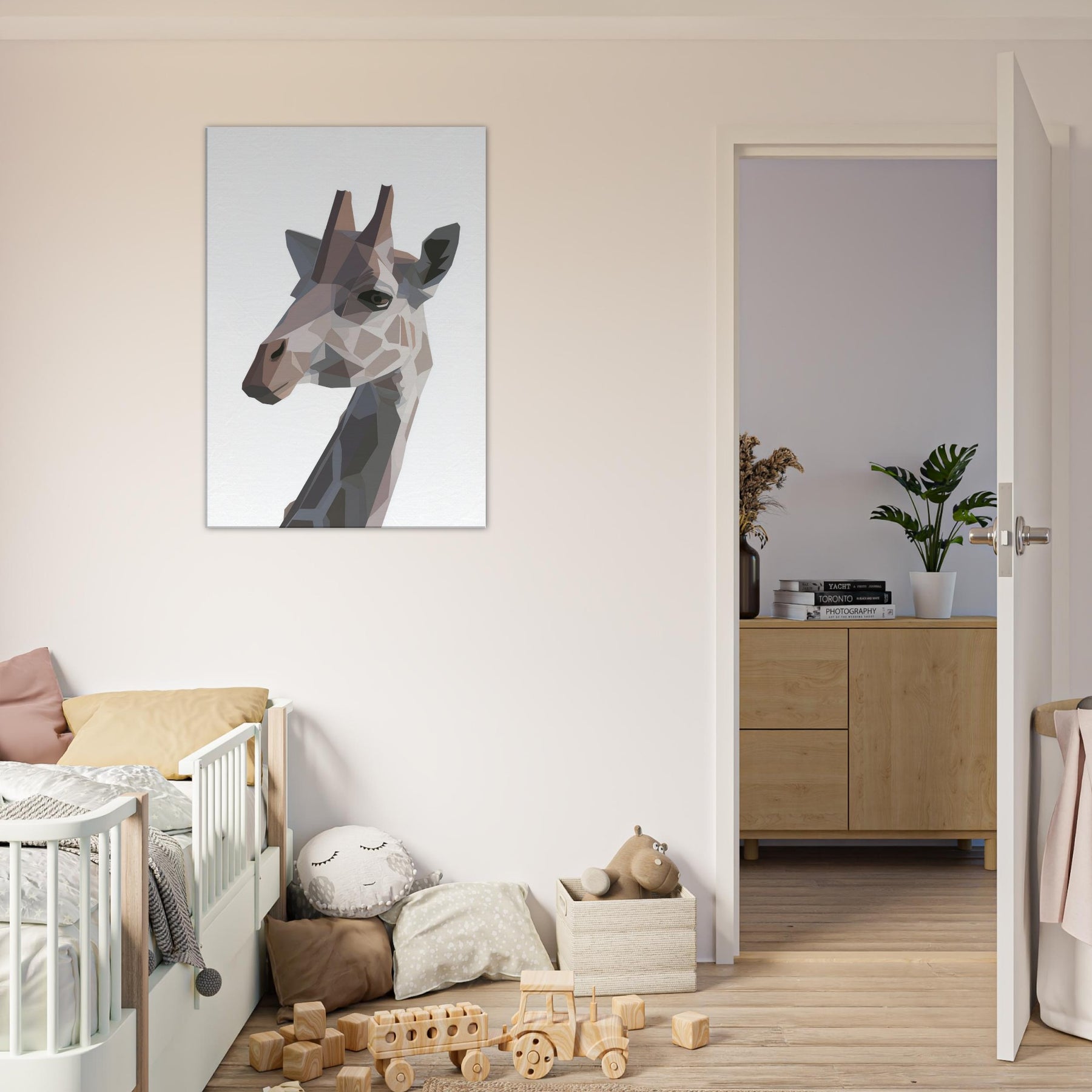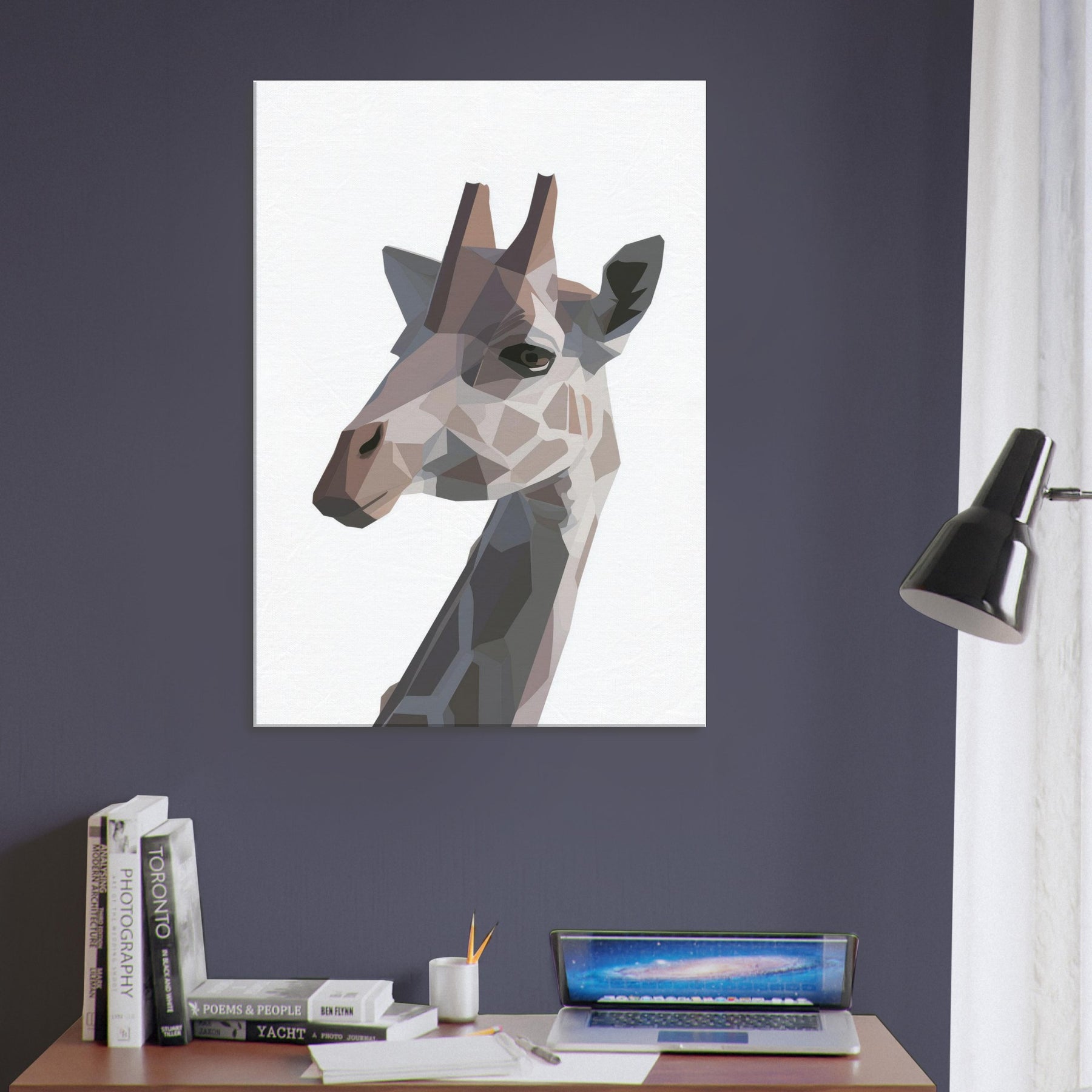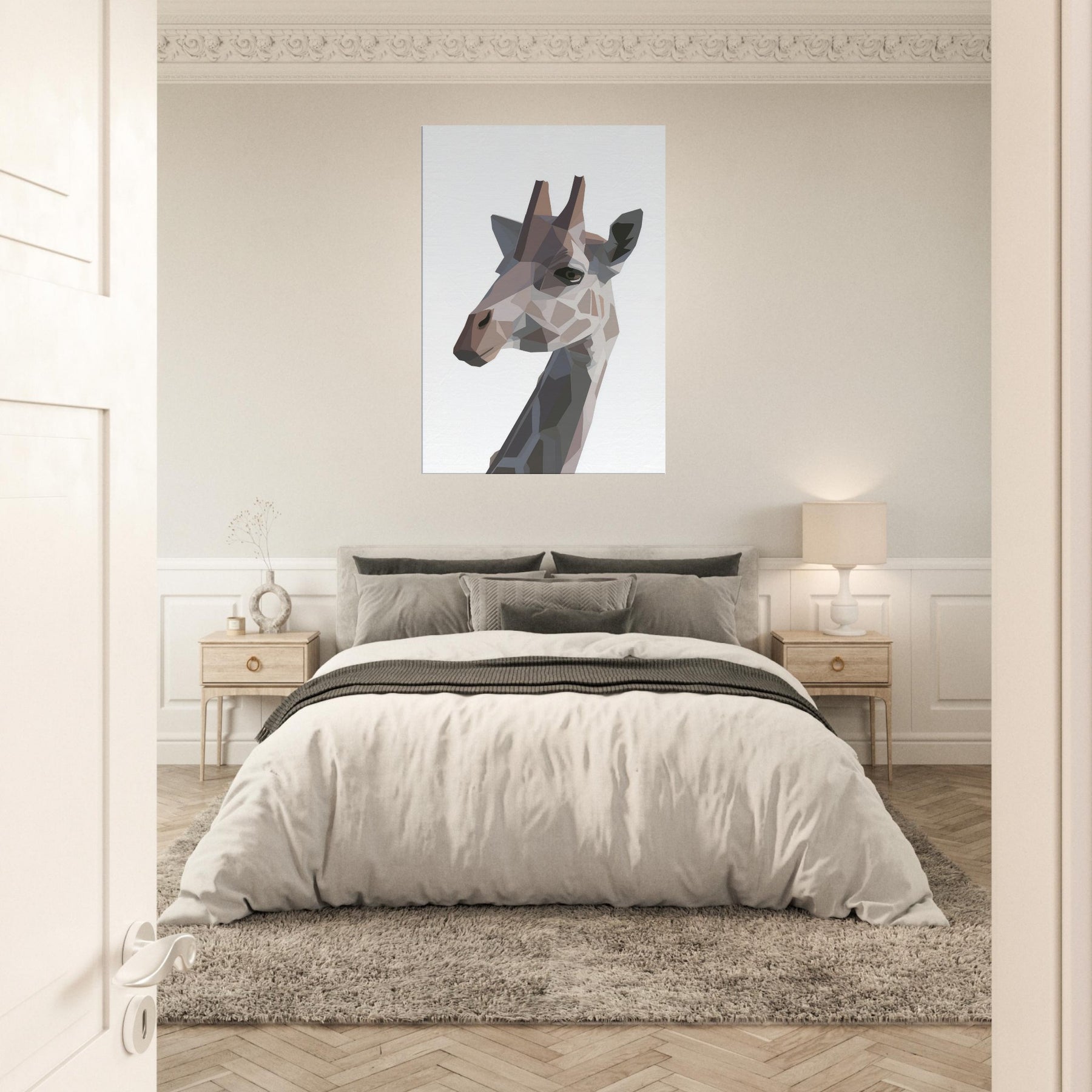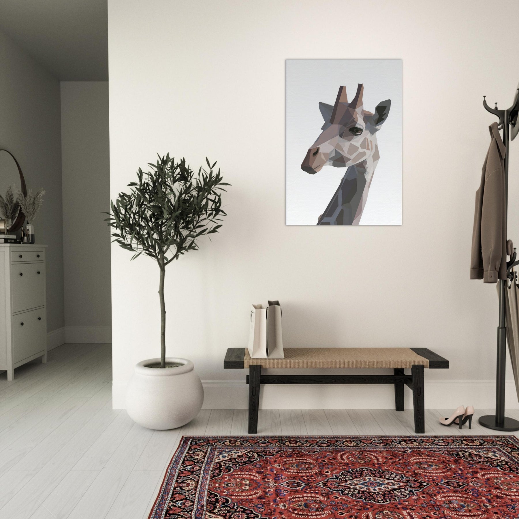 This minimalist giraffe study radiates quiet elegance. Faceted tones creamy sand, ash, and charcoal form a graceful silhouette that feels both delicate and enduring. The composition invites a soft, contemplative mood, turning a plain wall into a calm harbor for everyday life. It pairs beautifully with neutral palettes and natural textures, making rooms breathe with understated sophistication. Hang it over a sofa or in a hallway to remind the gaze to slow, while the giraffe's poised, timeless presence anchors the space with gracious restraint.