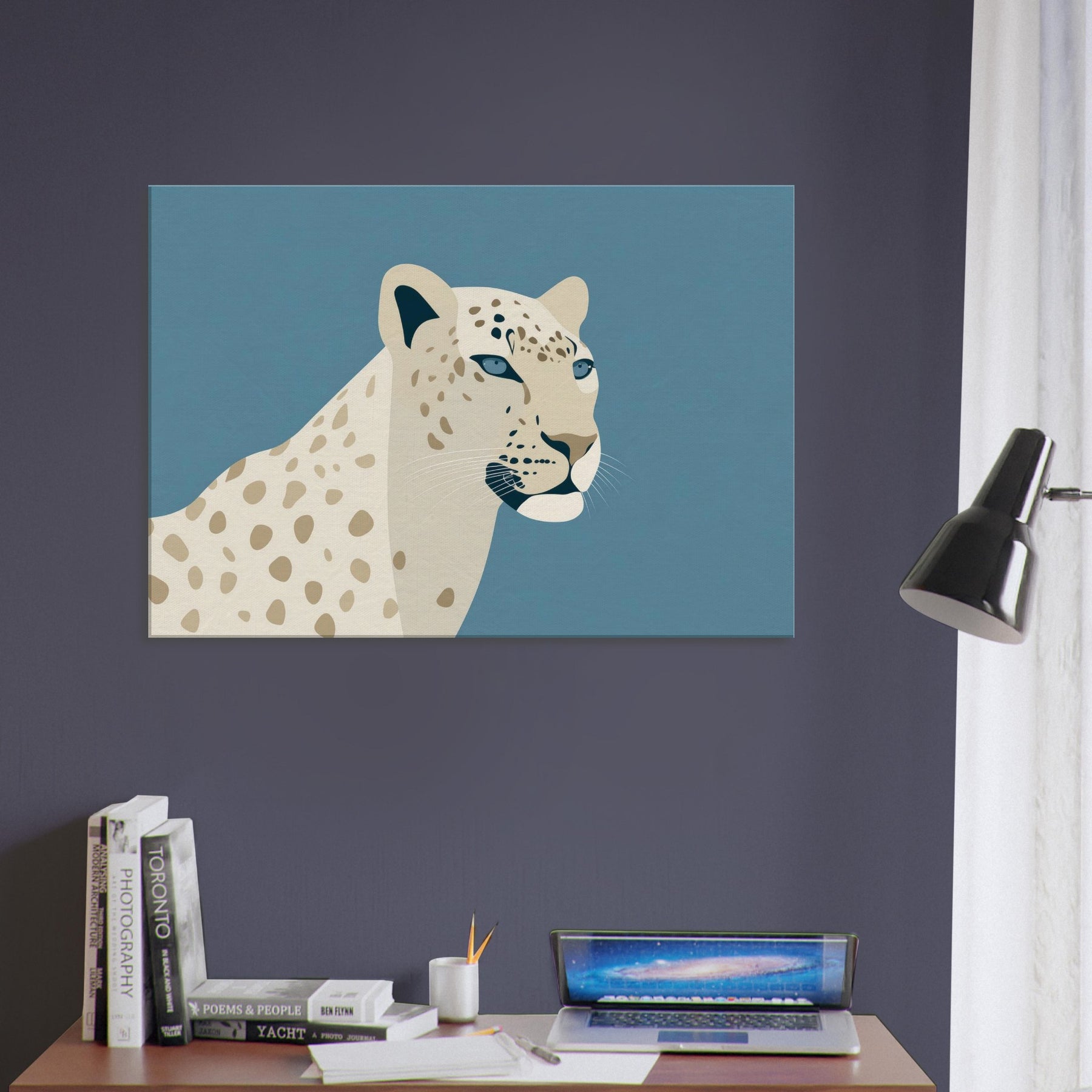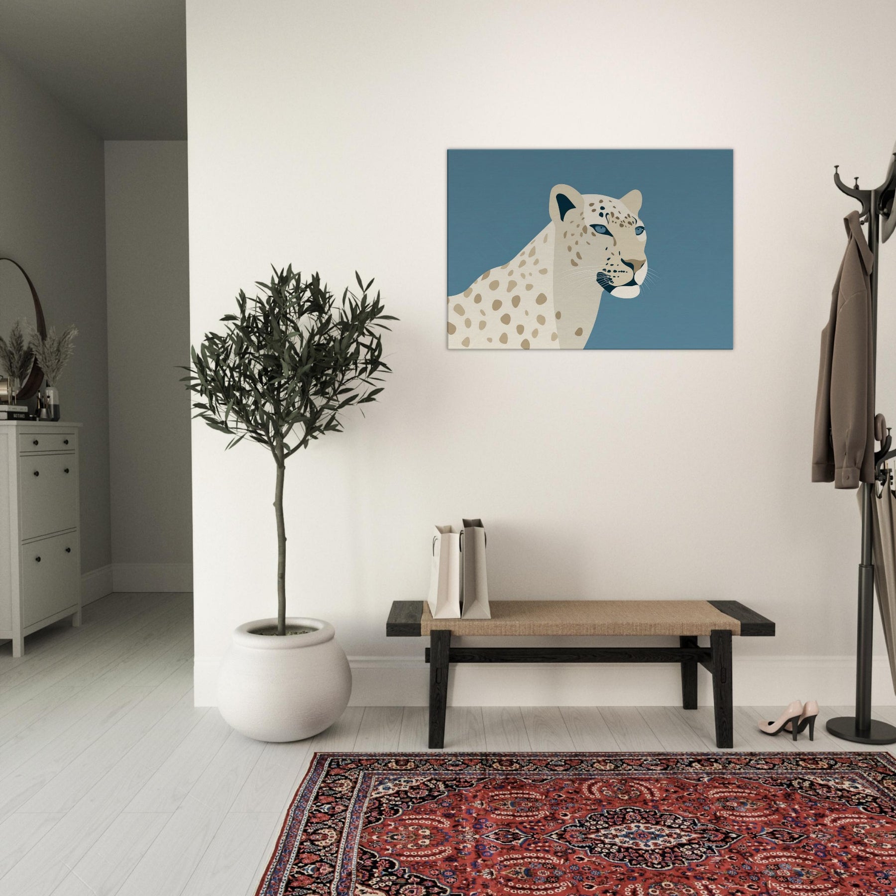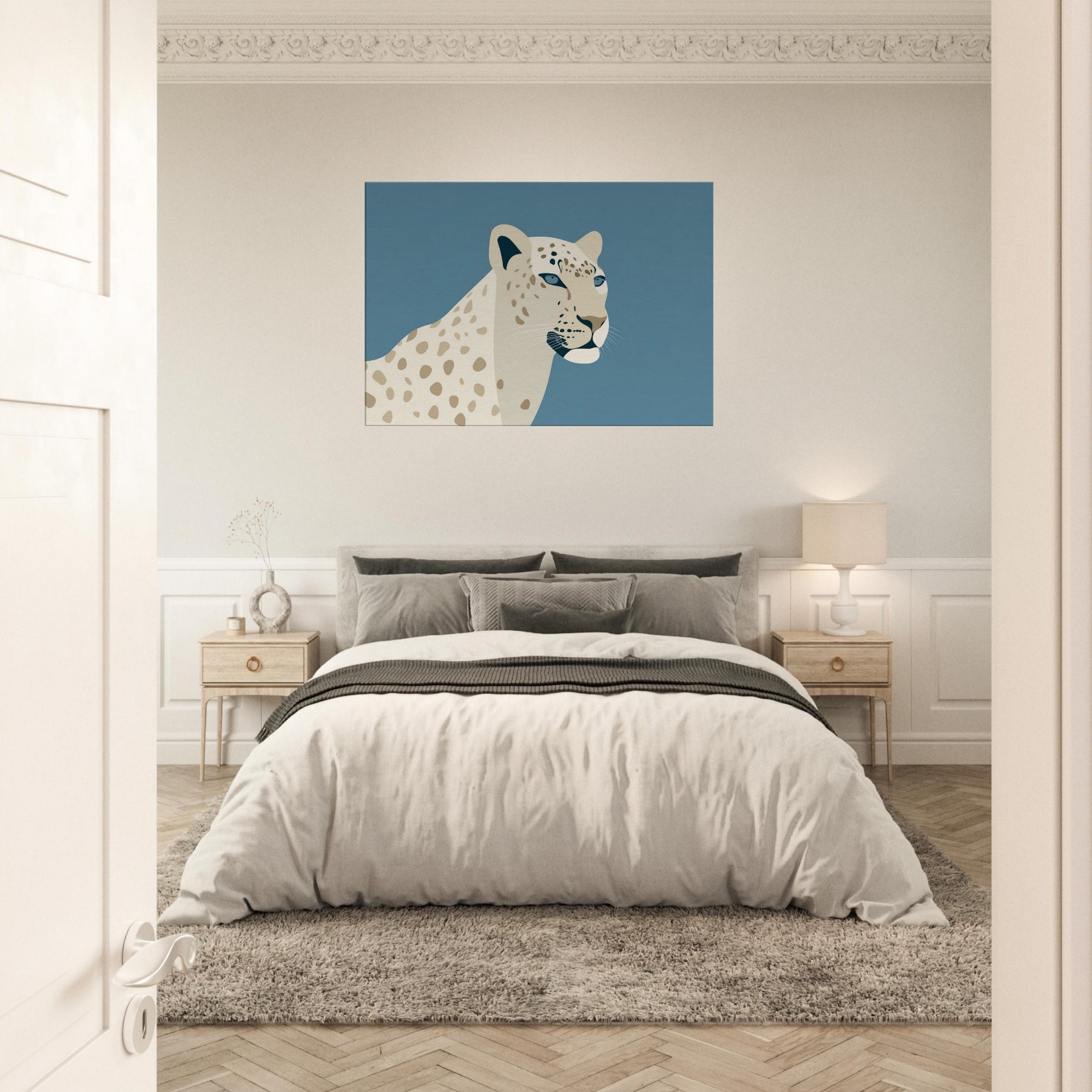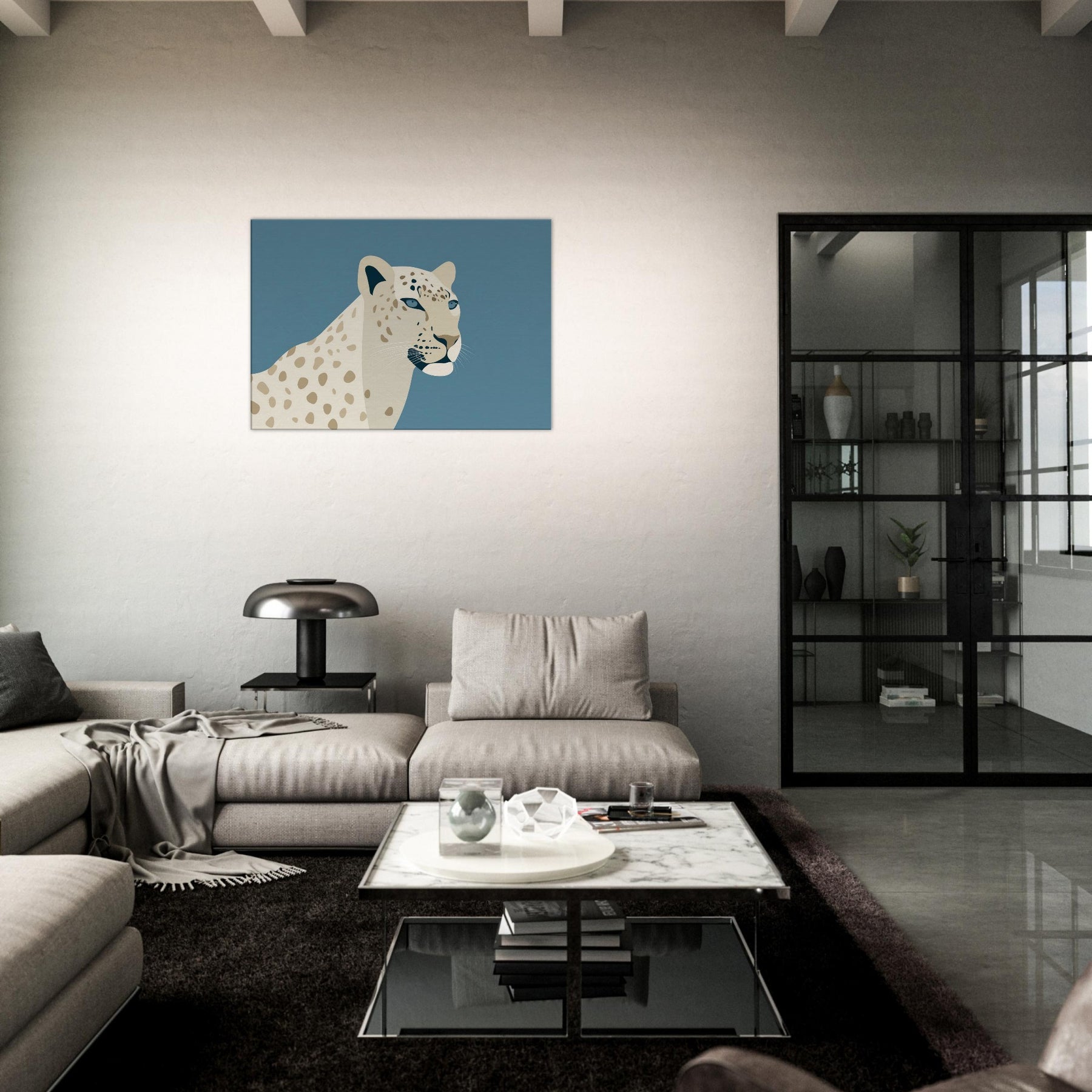Quiet and poised, this minimalist Leopard invites stillness into the room. Simplified forms, warm beige tones, and a cool blue backdrop converge to create a refined, cinematic presence without distraction. The composition feels spacious and serene, allowing light to breathe across walls as if the animal moved through a quiet dusk. Hang it in a living room or hallway to elevate modern decor with a subtle nod to the wild and a timeless sense of calm.