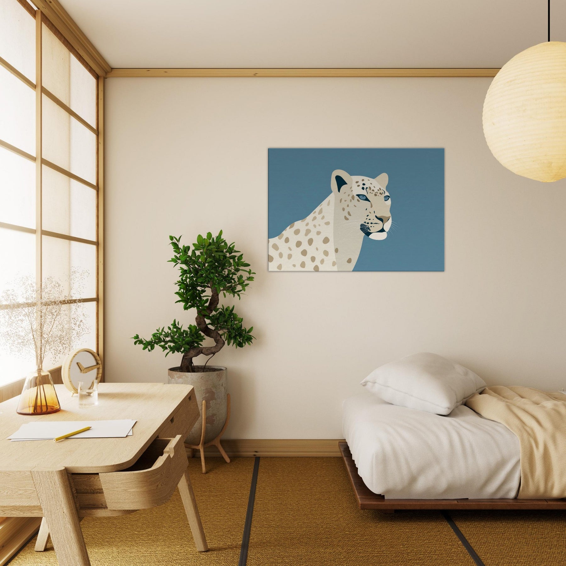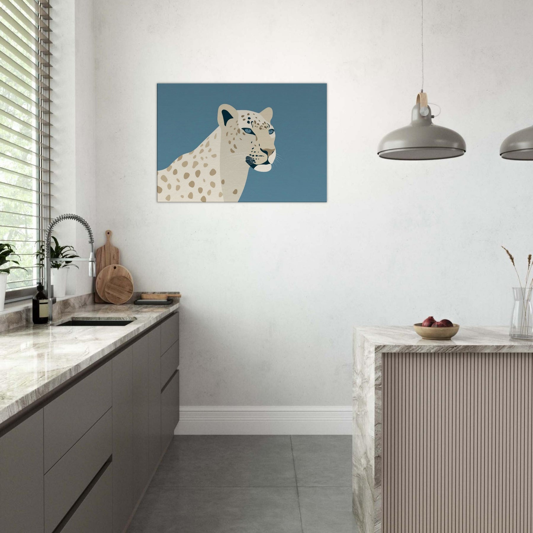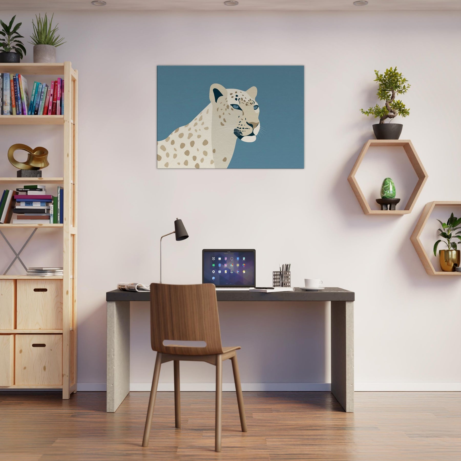 Quiet and poised, this minimalist Leopard invites stillness into the room. Simplified forms, warm beige tones, and a cool blue backdrop converge to create a refined, cinematic presence without distraction. The composition feels spacious and serene, allowing light to breathe across walls as if the animal moved through a quiet dusk. Hang it in a living room or hallway to elevate modern decor with a subtle nod to the wild and a timeless sense of calm.