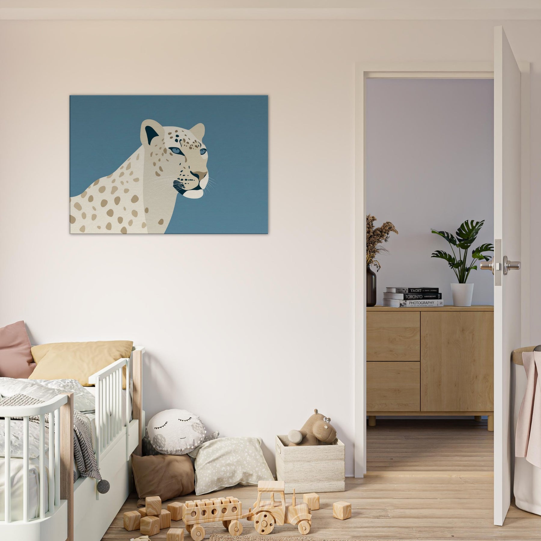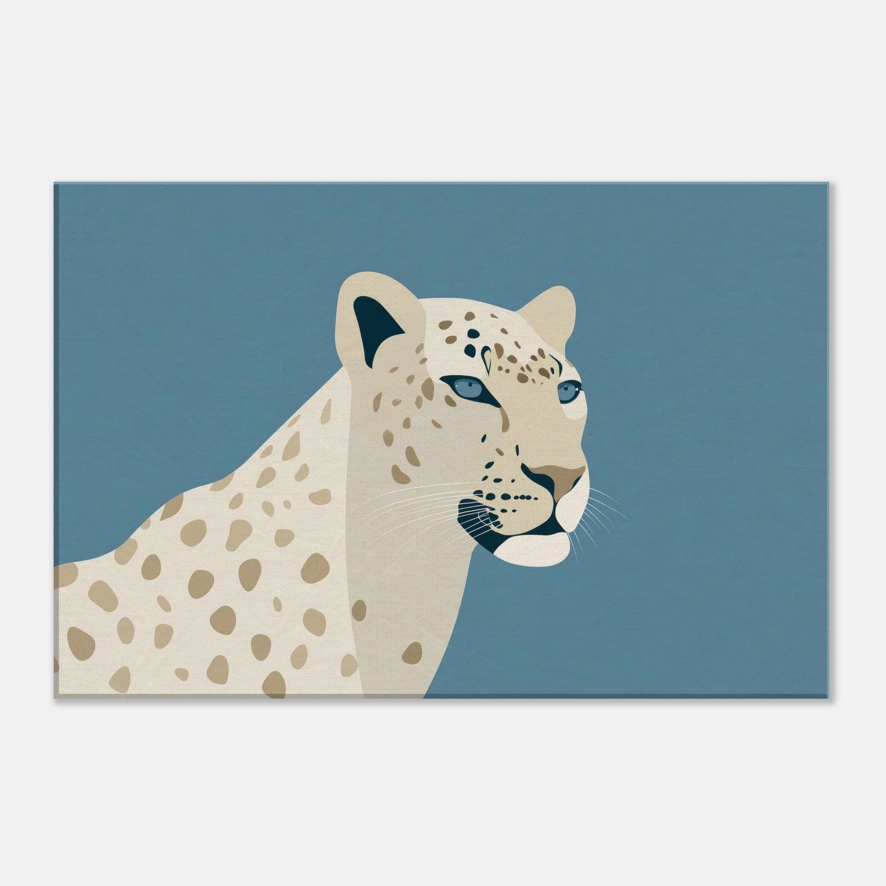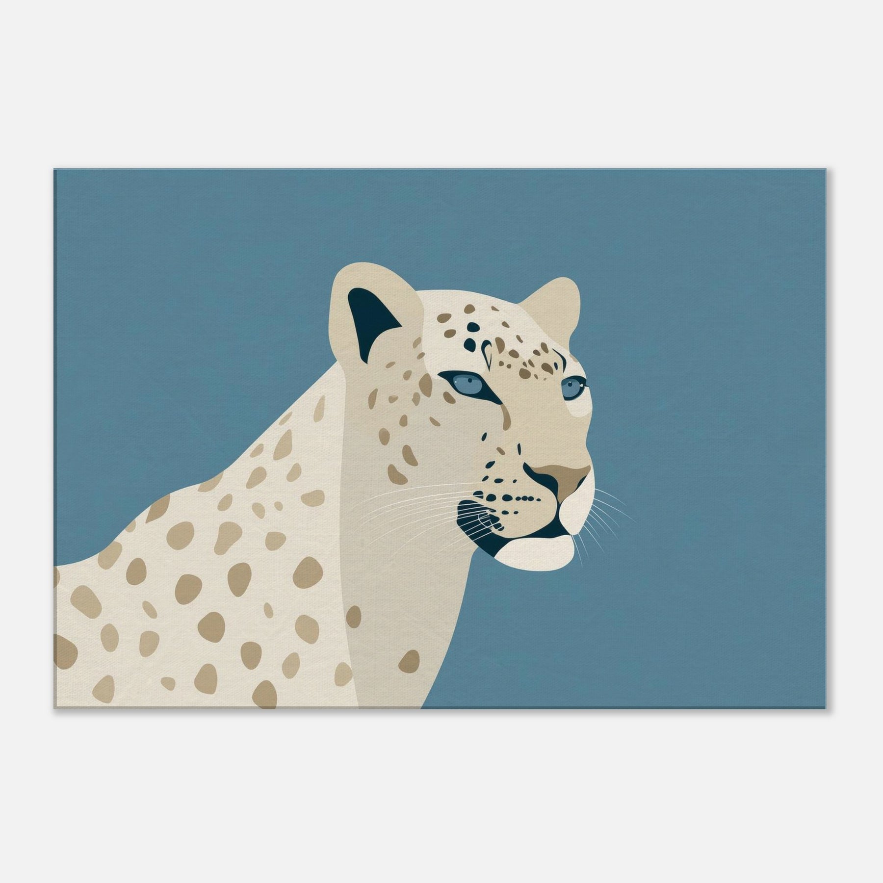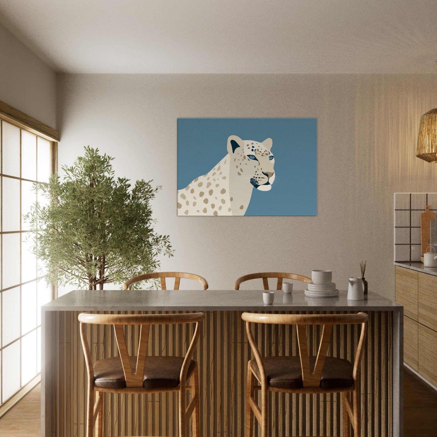 Quiet and poised, this minimalist Leopard invites stillness into the room. Simplified forms, warm beige tones, and a cool blue backdrop converge to create a refined, cinematic presence without distraction. The composition feels spacious and serene, allowing light to breathe across walls as if the animal moved through a quiet dusk. Hang it in a living room or hallway to elevate modern decor with a subtle nod to the wild and a timeless sense of calm.