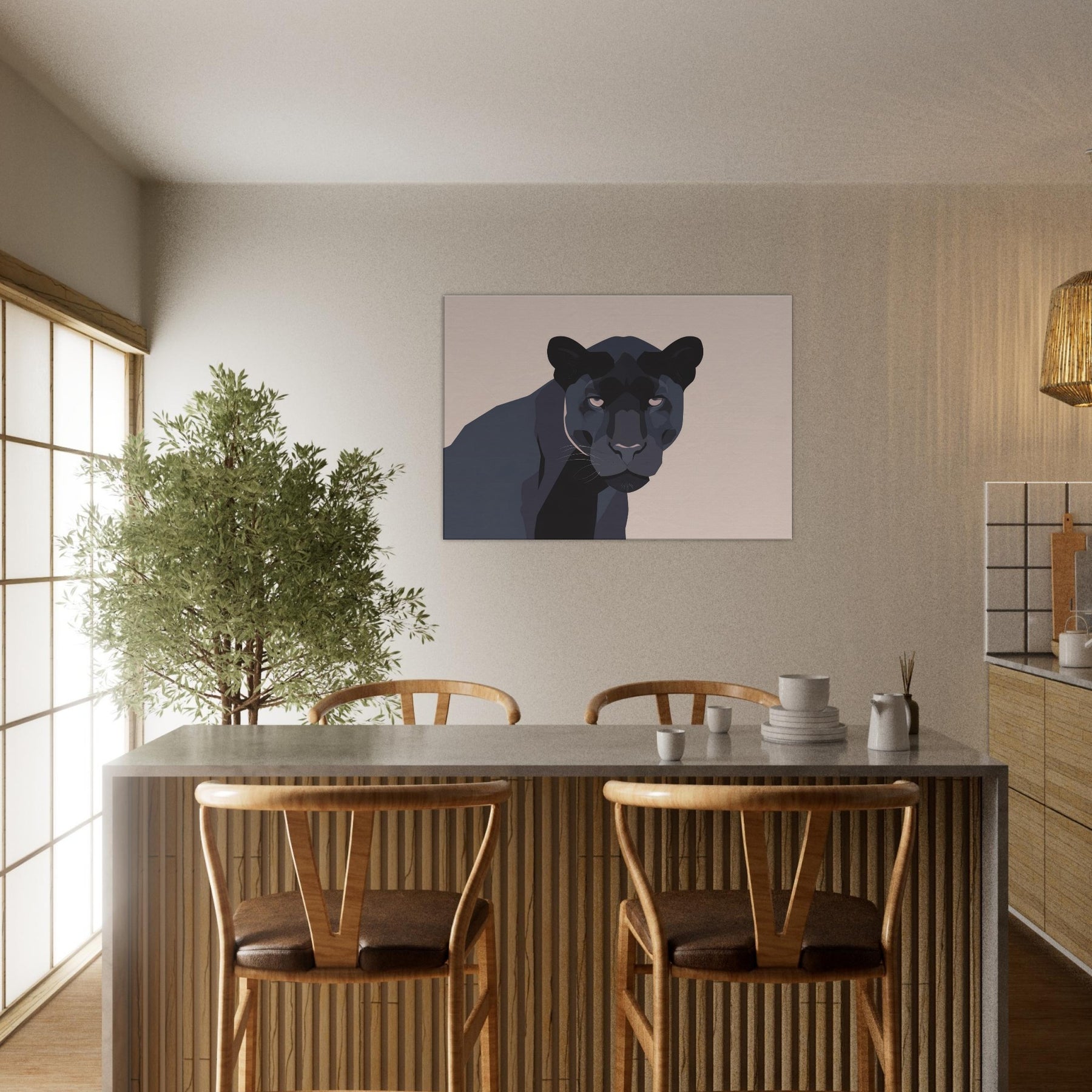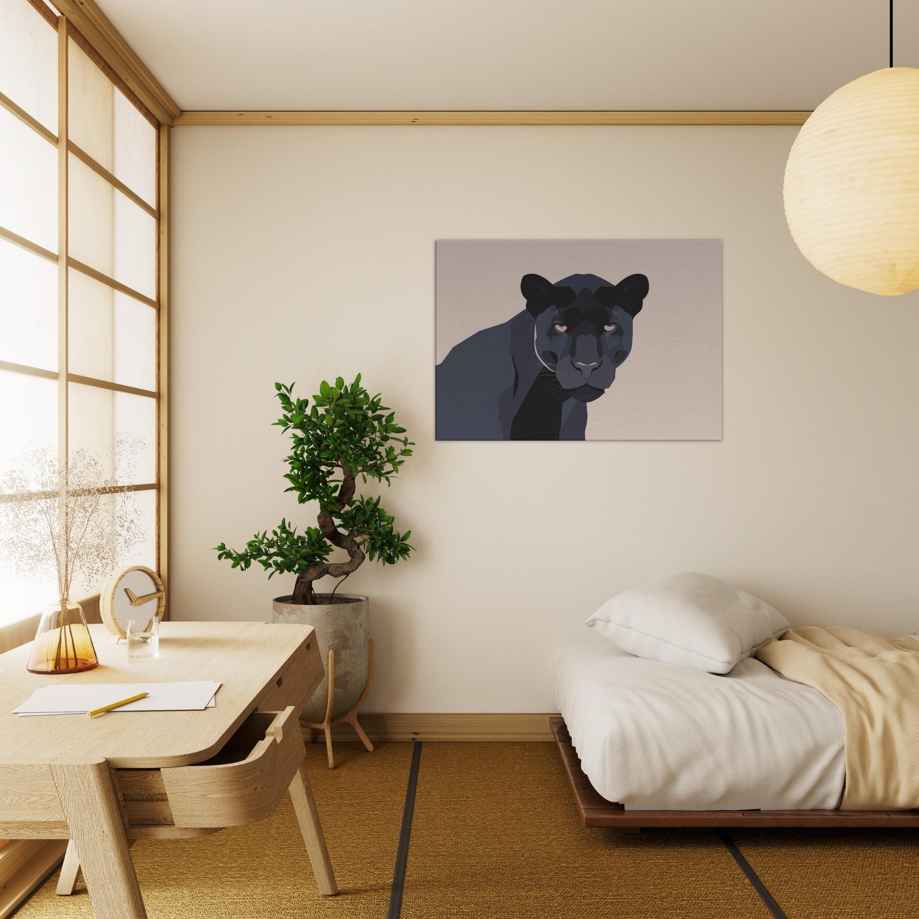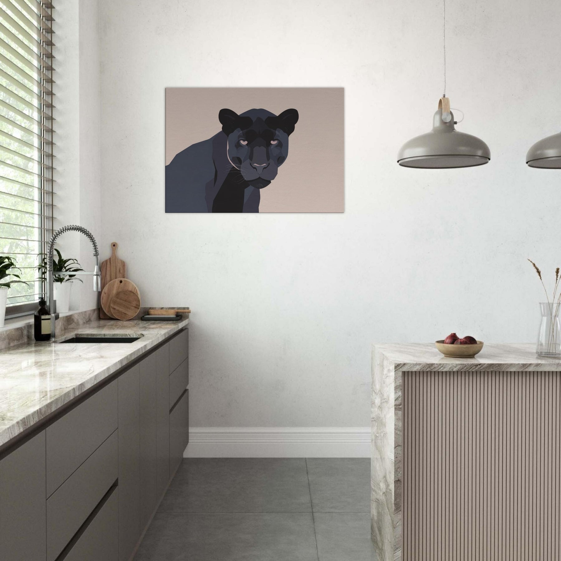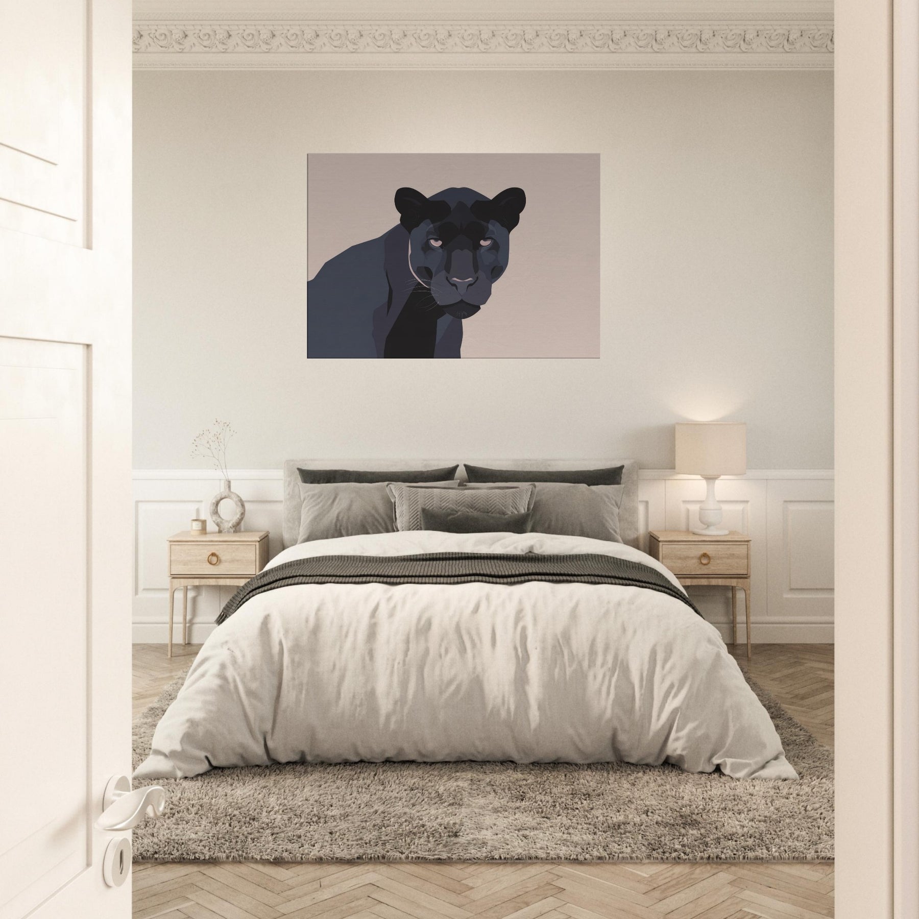 Let this minimalist Panther redefine the quiet drama of your living room. A restrained palette of charcoal, ash, and ink threads night into daylight, while clean planes and sculpted shadows suggest movement without crowding the space. The composition invites calm focus, turning walls into a stage for contemplation. Place it above a sofa or near a reading nook the Panther becomes a silent companion, adding depth, warmth, and modern sophistication to any living space.