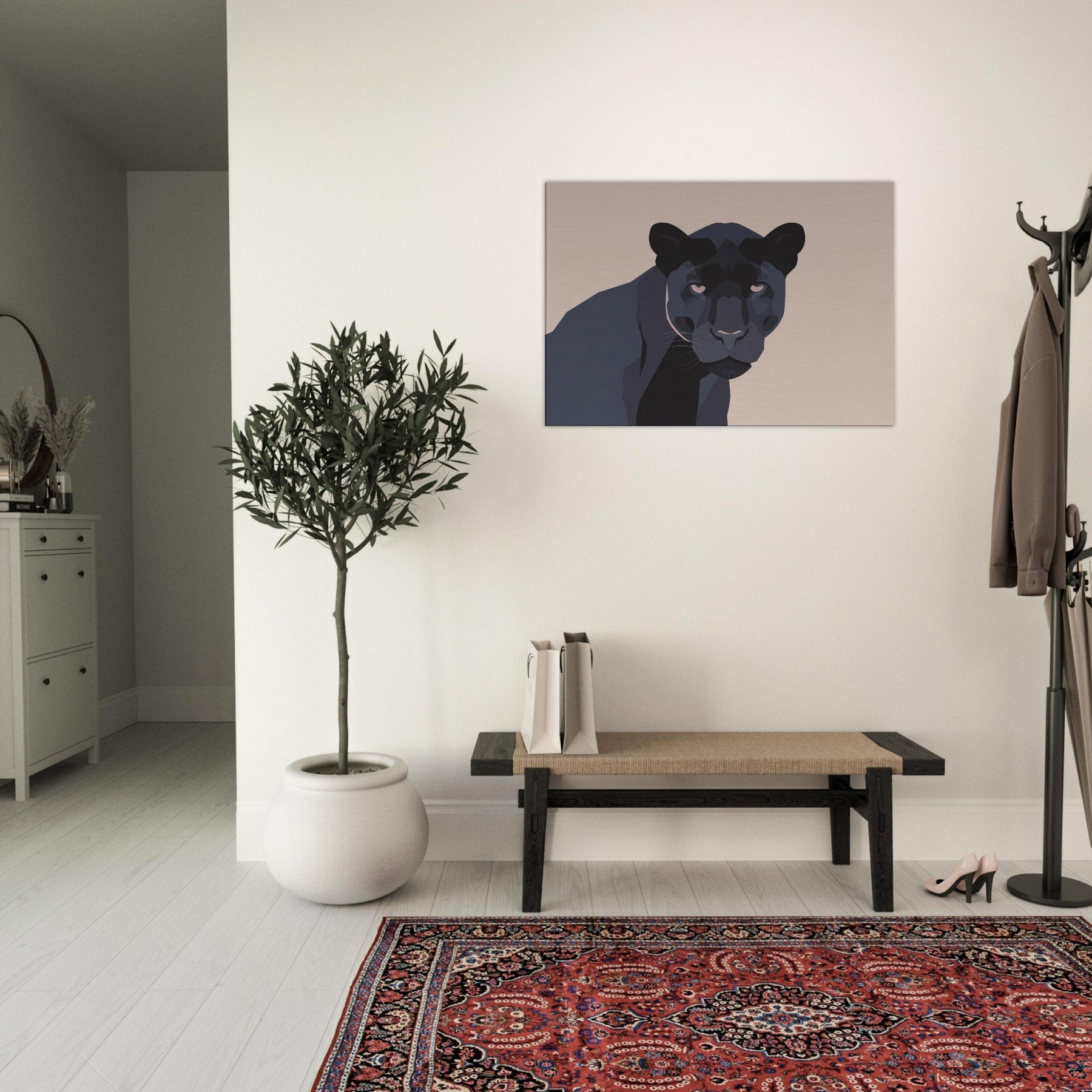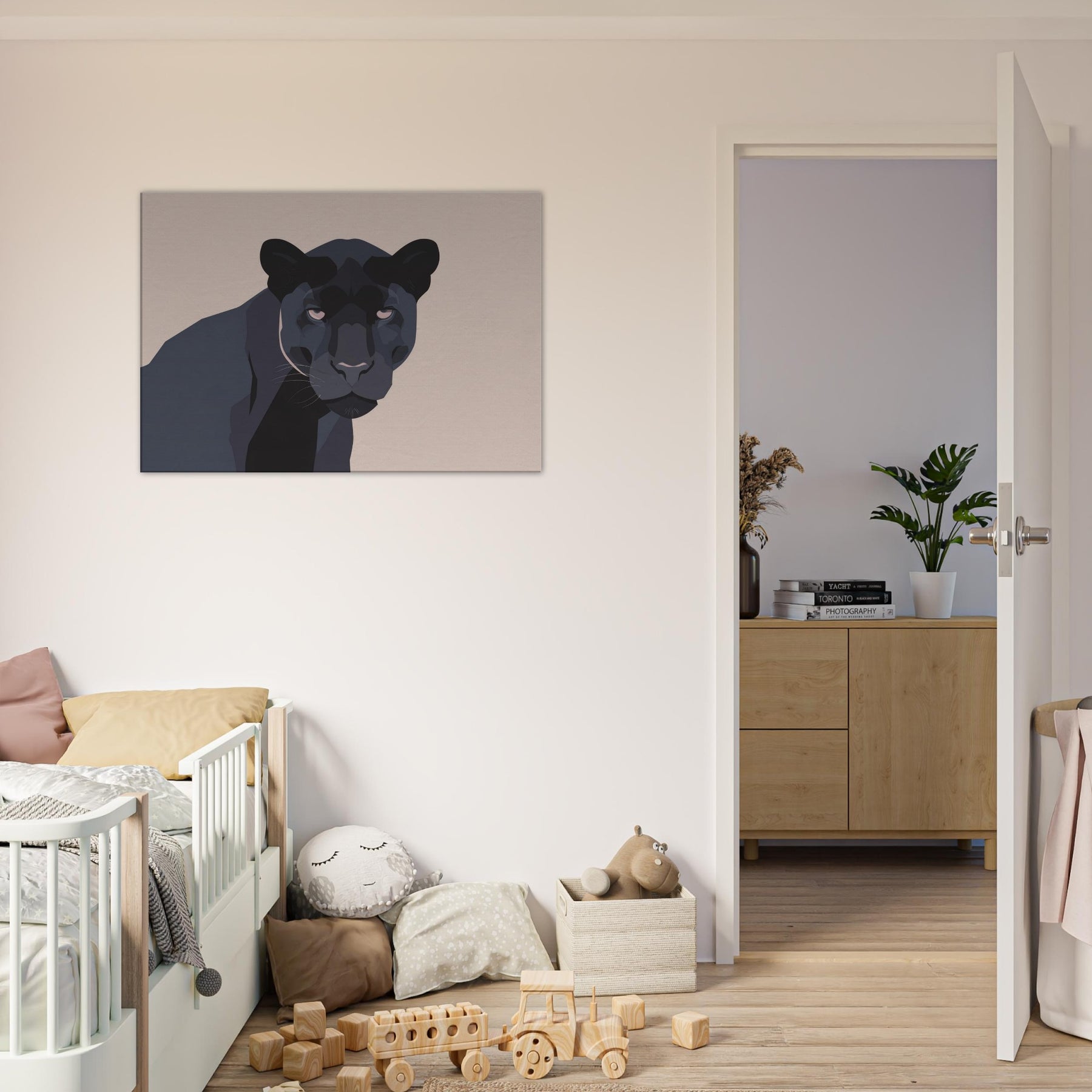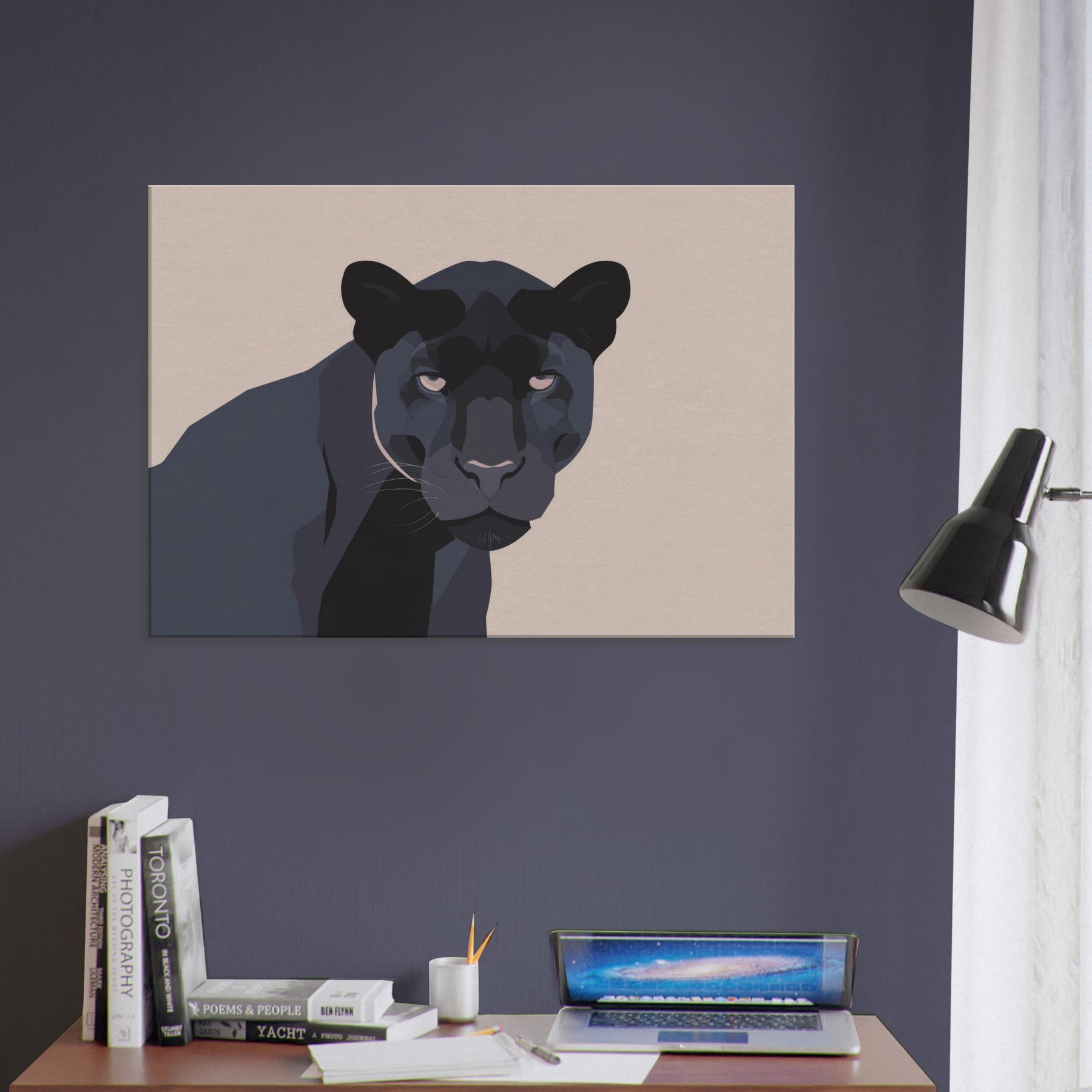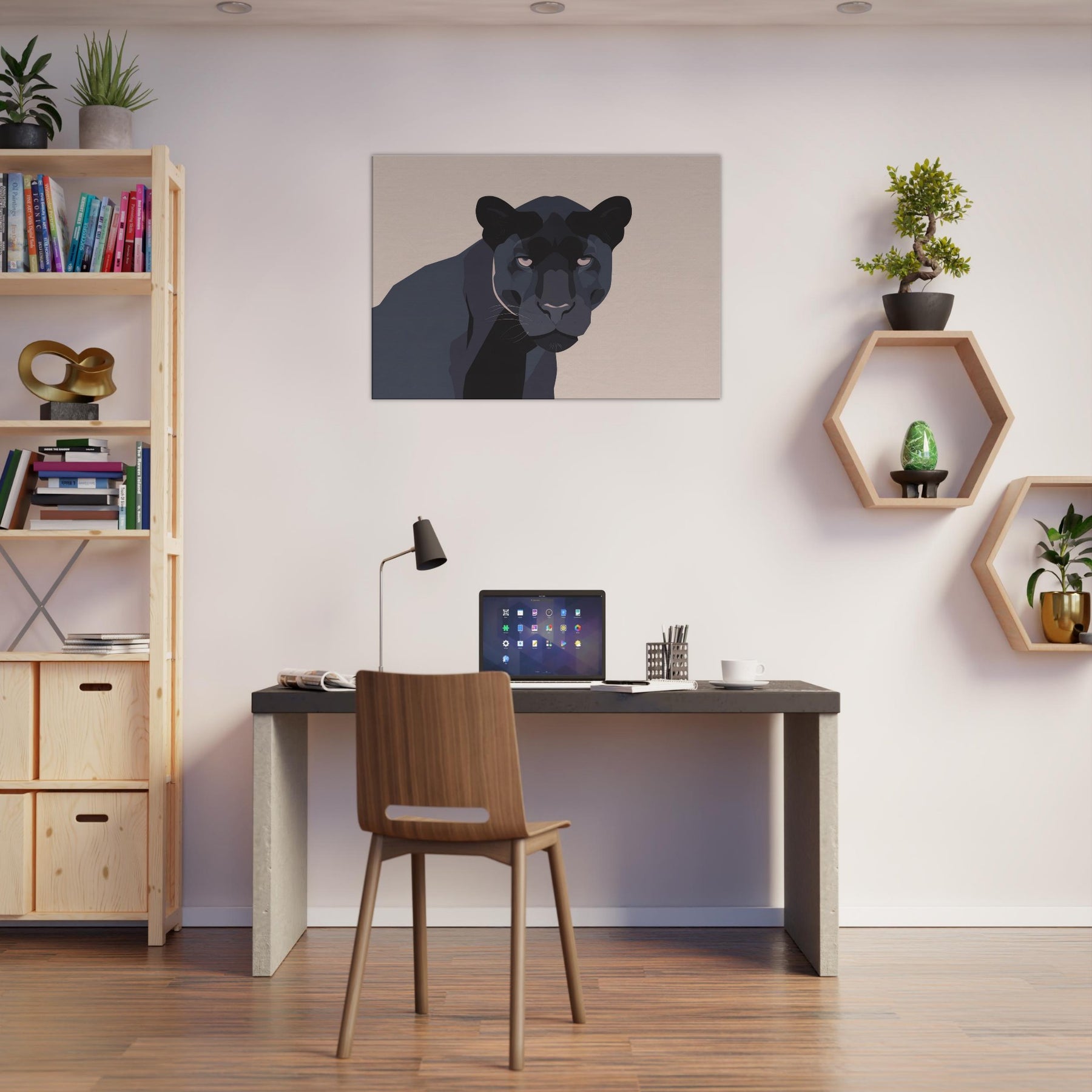 Let this minimalist Panther redefine the quiet drama of your living room. A restrained palette of charcoal, ash, and ink threads night into daylight, while clean planes and sculpted shadows suggest movement without crowding the space. The composition invites calm focus, turning walls into a stage for contemplation. Place it above a sofa or near a reading nook the Panther becomes a silent companion, adding depth, warmth, and modern sophistication to any living space.