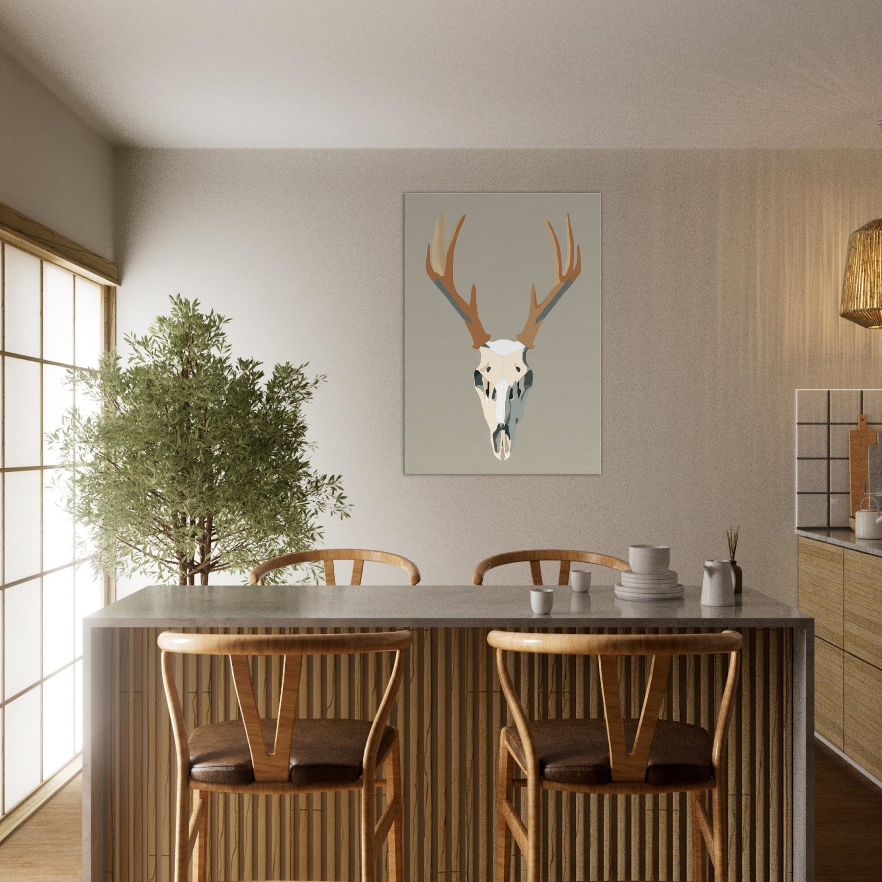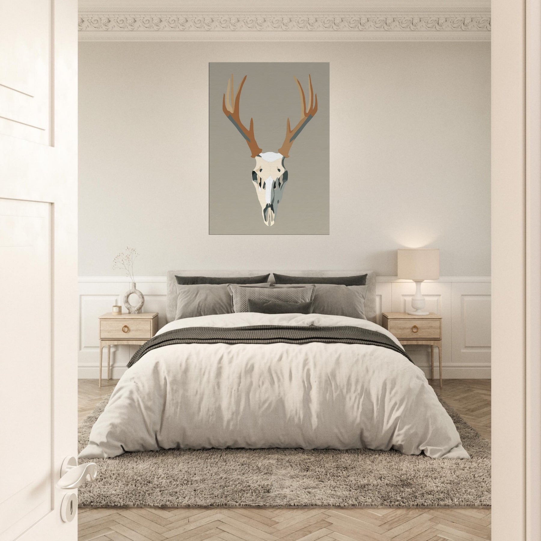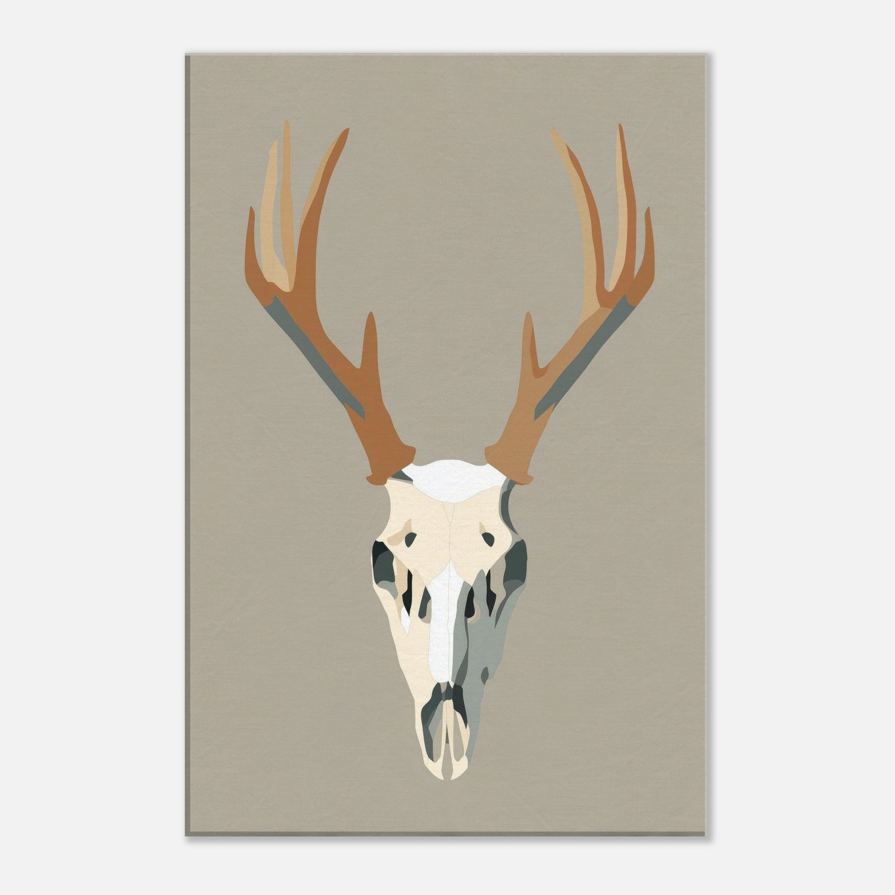 This graphic stag skull rises with quiet authority against a neutral field, a study in clean lines and soft contrast. The minimalist form condenses the animal into a sculptural centerpiece, inviting silence and reflection. In a living room or hallway, its restrained palette casts light and shadow like a quiet drumbeat, grounding the space with modern elegance. The piece carries a sense of wilderness and memory, turning walls into a gallery of restraint and presence. The central subject is Stag/Deer Skull (Graphic).