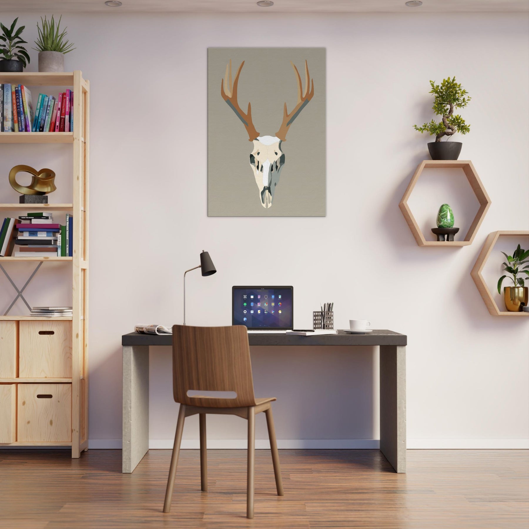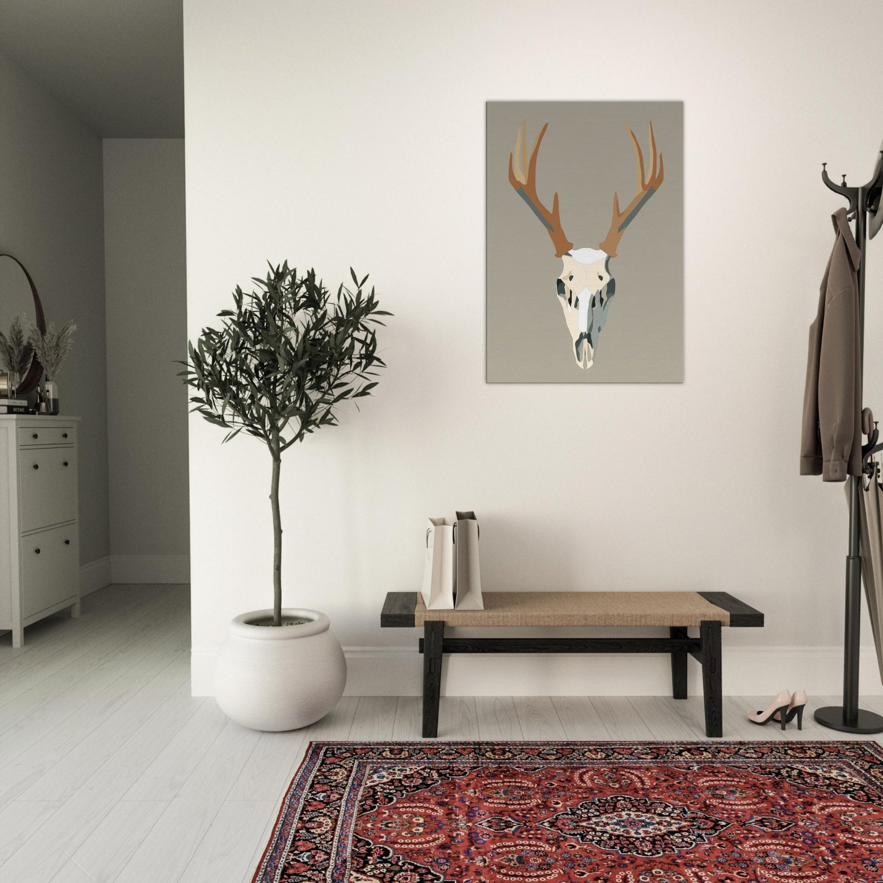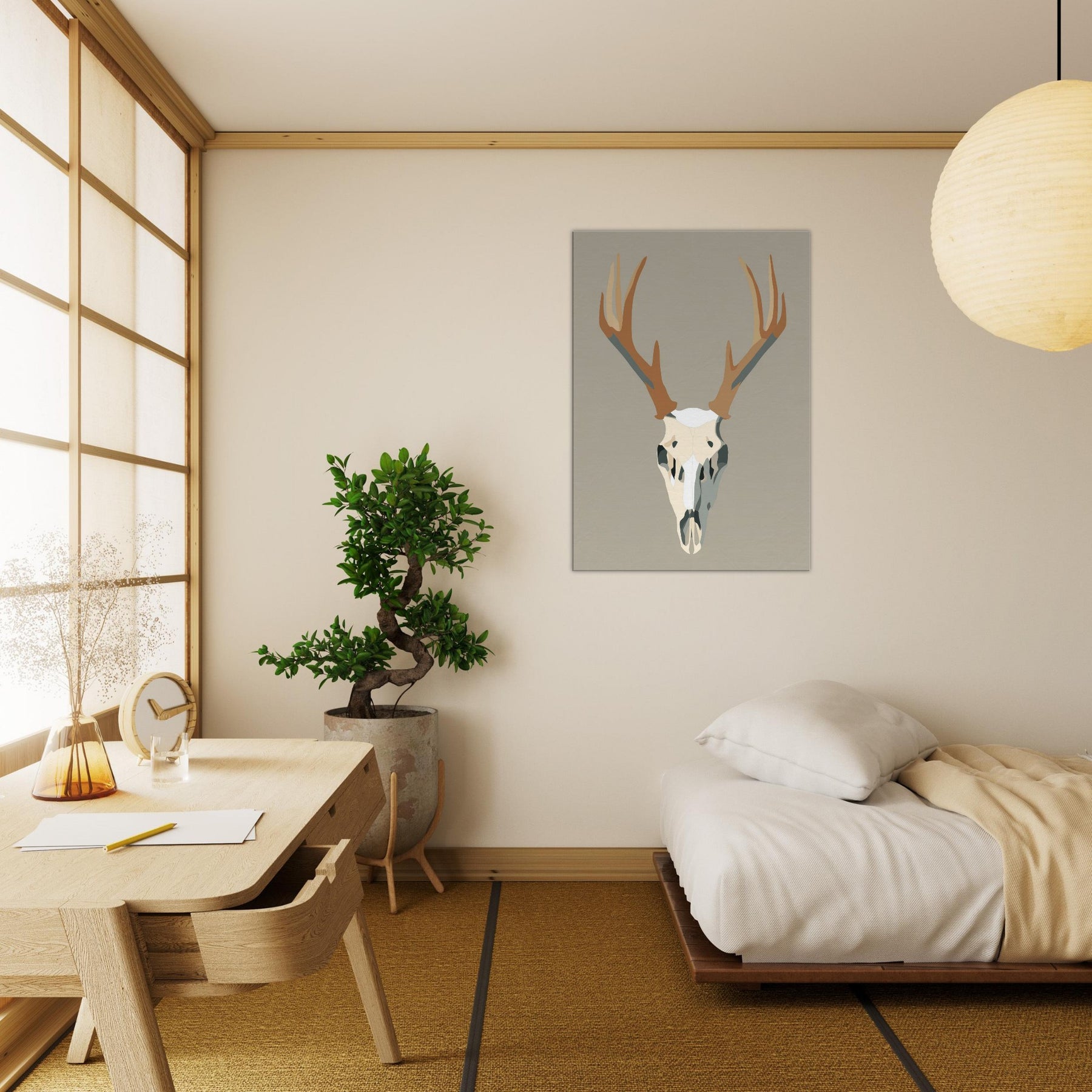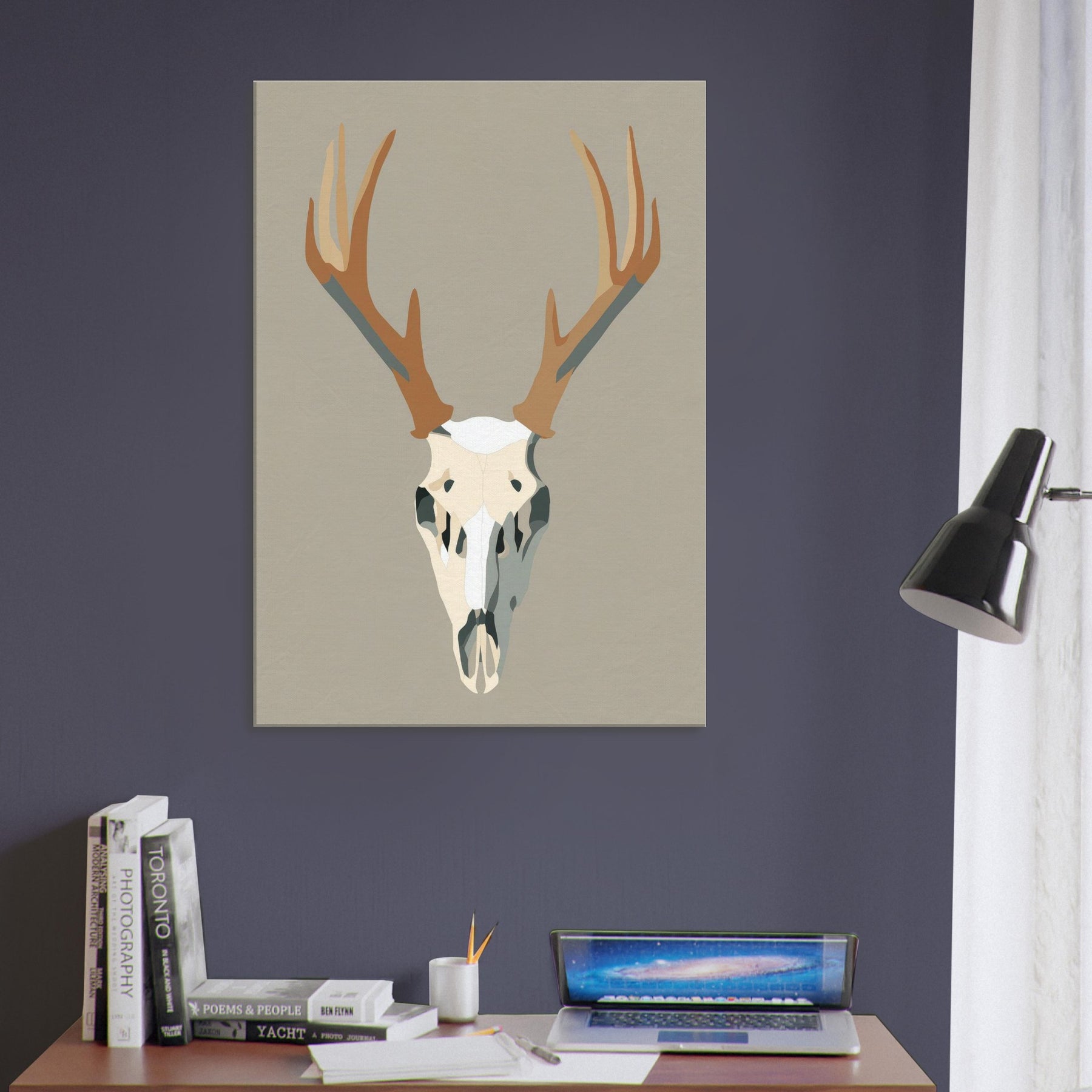 This graphic stag skull rises with quiet authority against a neutral field, a study in clean lines and soft contrast. The minimalist form condenses the animal into a sculptural centerpiece, inviting silence and reflection. In a living room or hallway, its restrained palette casts light and shadow like a quiet drumbeat, grounding the space with modern elegance. The piece carries a sense of wilderness and memory, turning walls into a gallery of restraint and presence. The central subject is Stag/Deer Skull (Graphic).