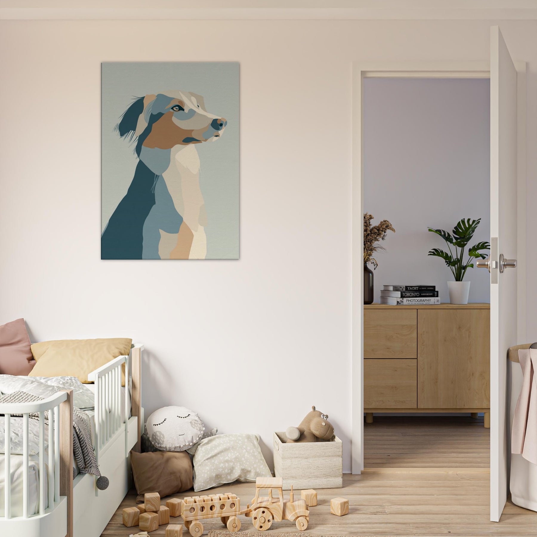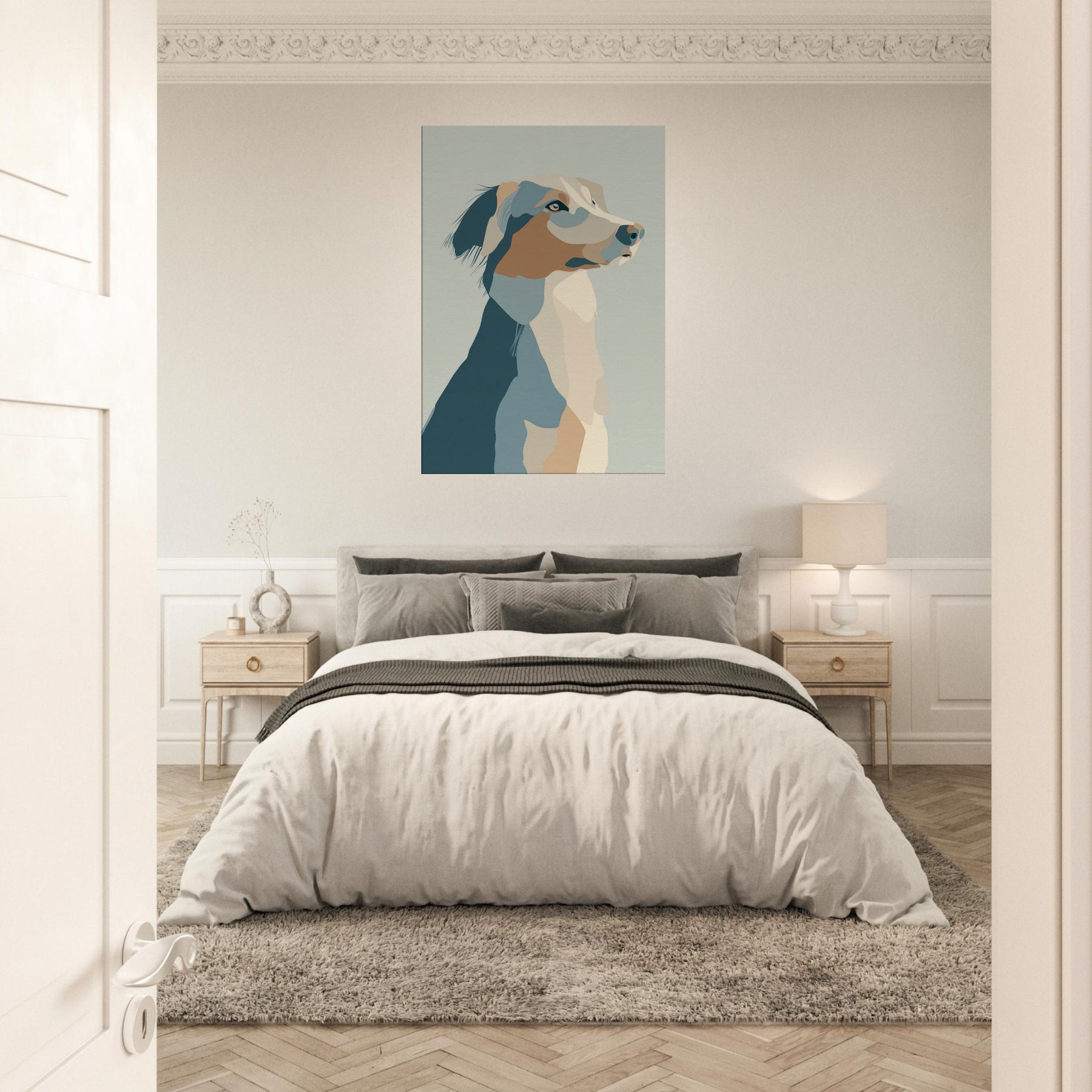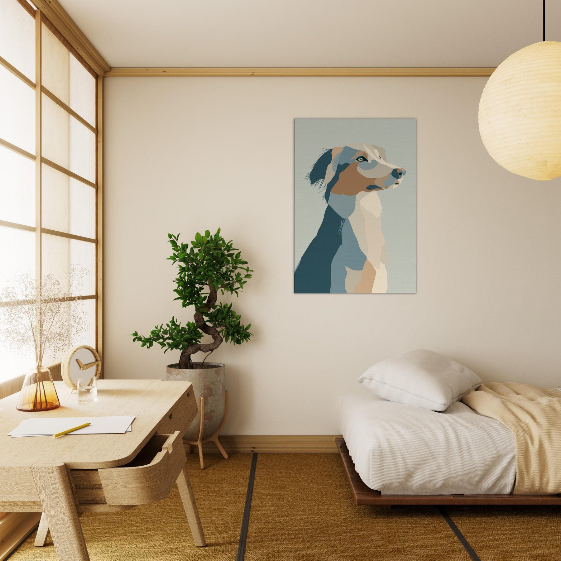 In a hush of color and line, this minimalist study of a dog radiates calm and quiet confidence. The soft palette of sage, slate, and warm sand evokes morning light brushing along a sun drenched wall, turning space into a breathing . The Dog's poised, forward gaze anchors a room, inviting pause and reflection without shouting. Perfect for a living room or study, it pairs with natural textures and clean furniture to create a serene corner where everyday moments feel elevated.