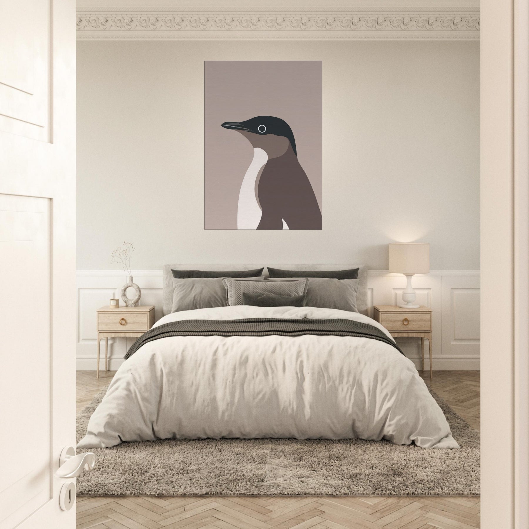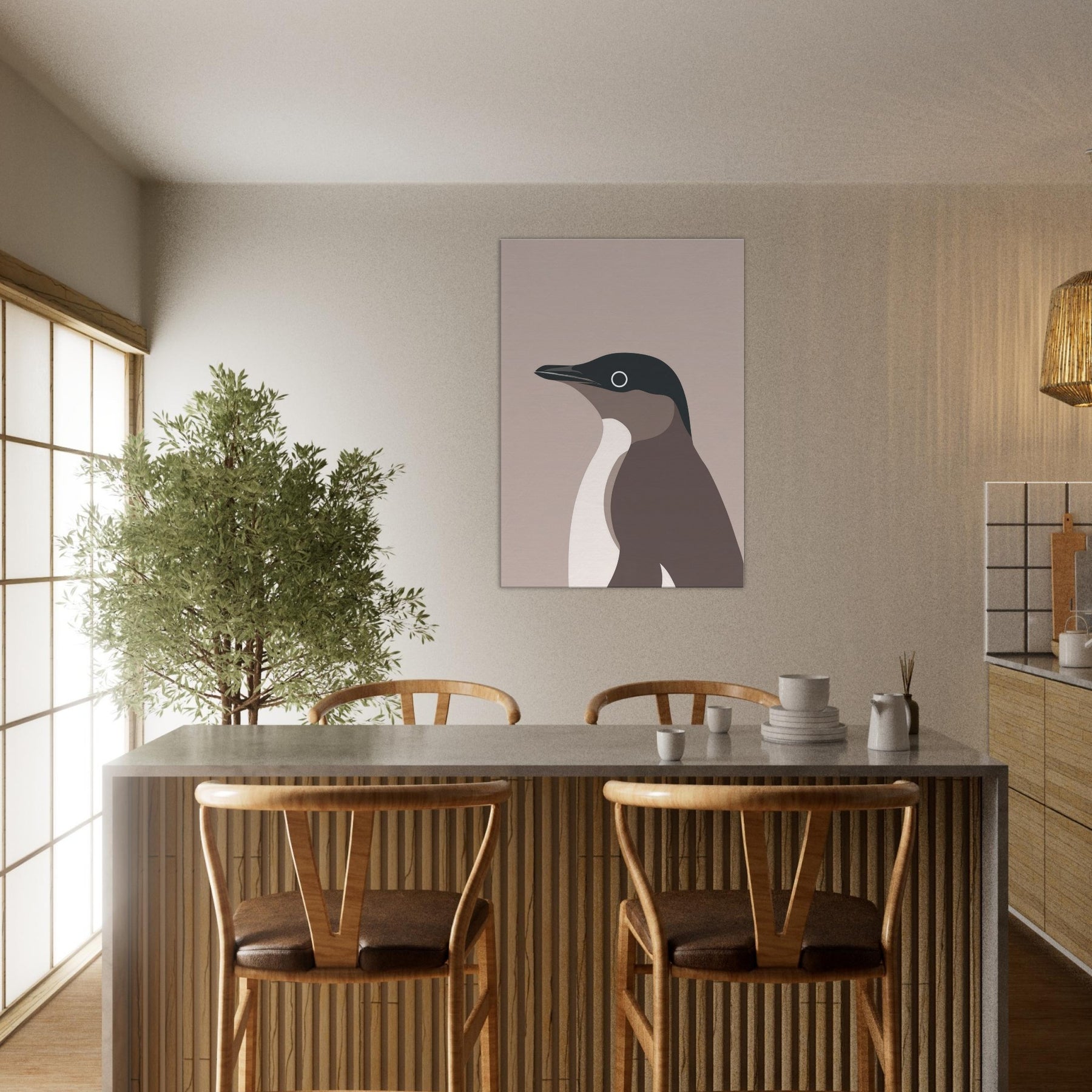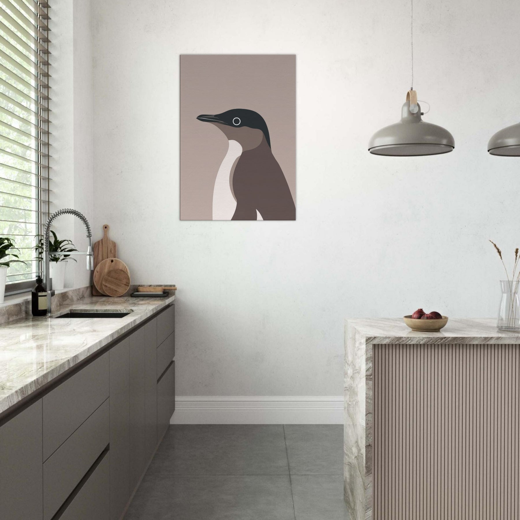 Feel the hush of a frosted morning with this minimalist penguin art, where simple shapes carve a quiet, confident presence in any room. The restrained palette deep slate, warm taupe, and creamy ivory balances space and light, inviting reflection rather than loud proclamation. Hung in a living room or study, it creates a calm focal point that enhances textures, fabrics, and natural wood. This penguin speaks in soft tones, a subtle reminder of resilience and grace in everyday life.