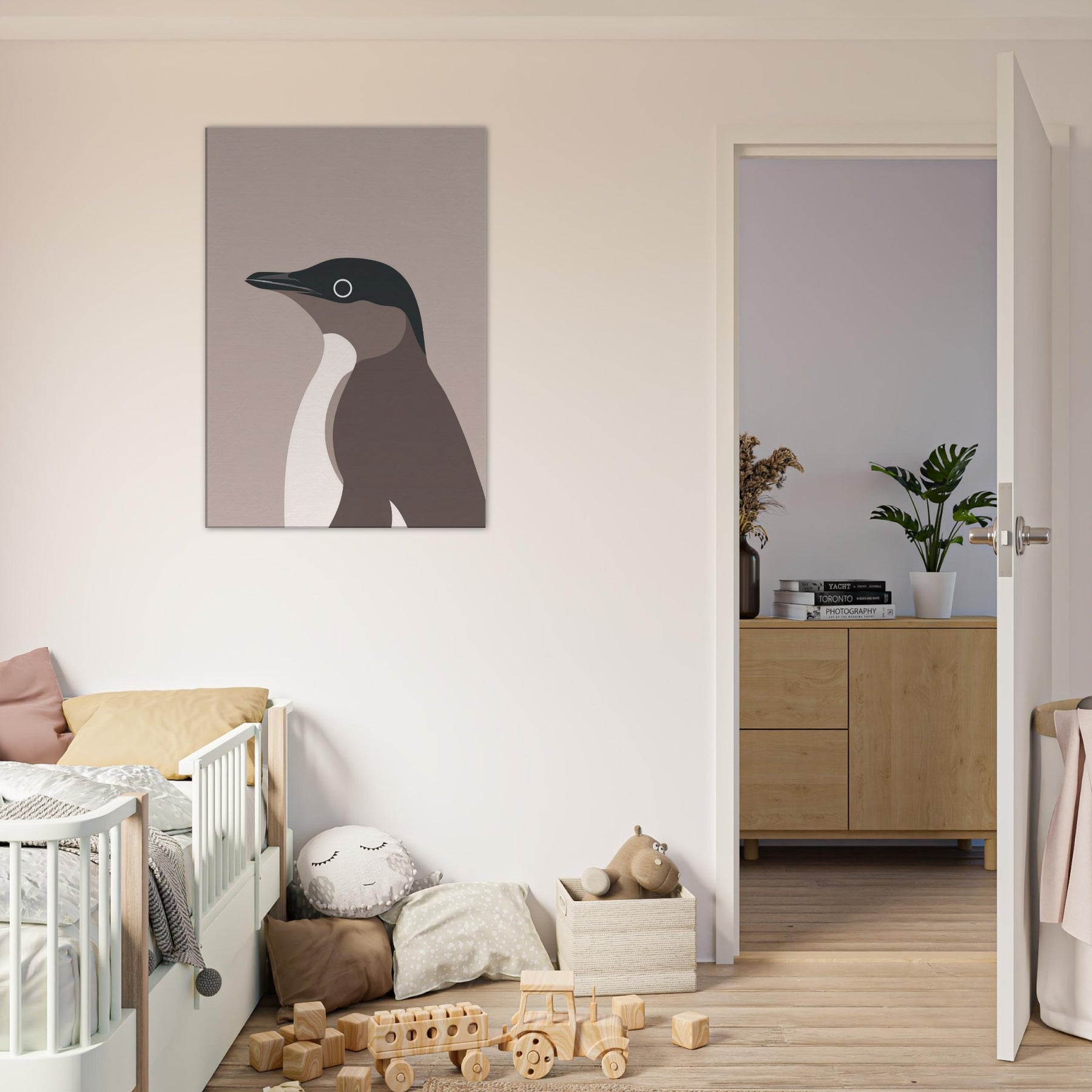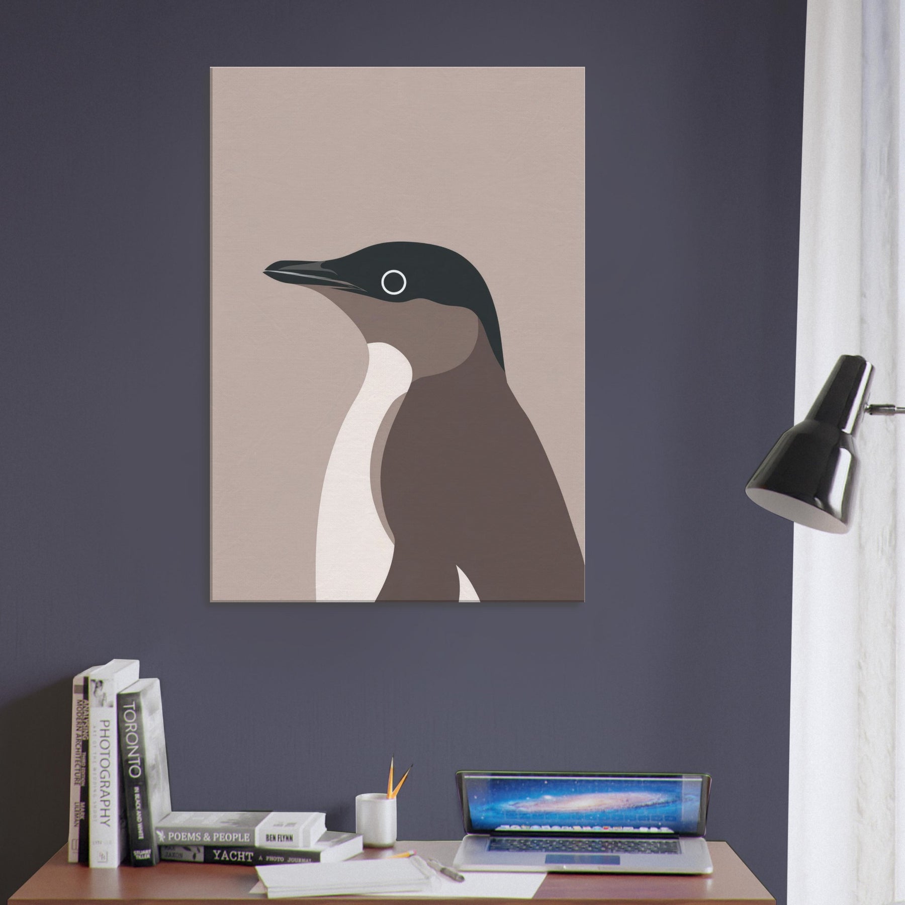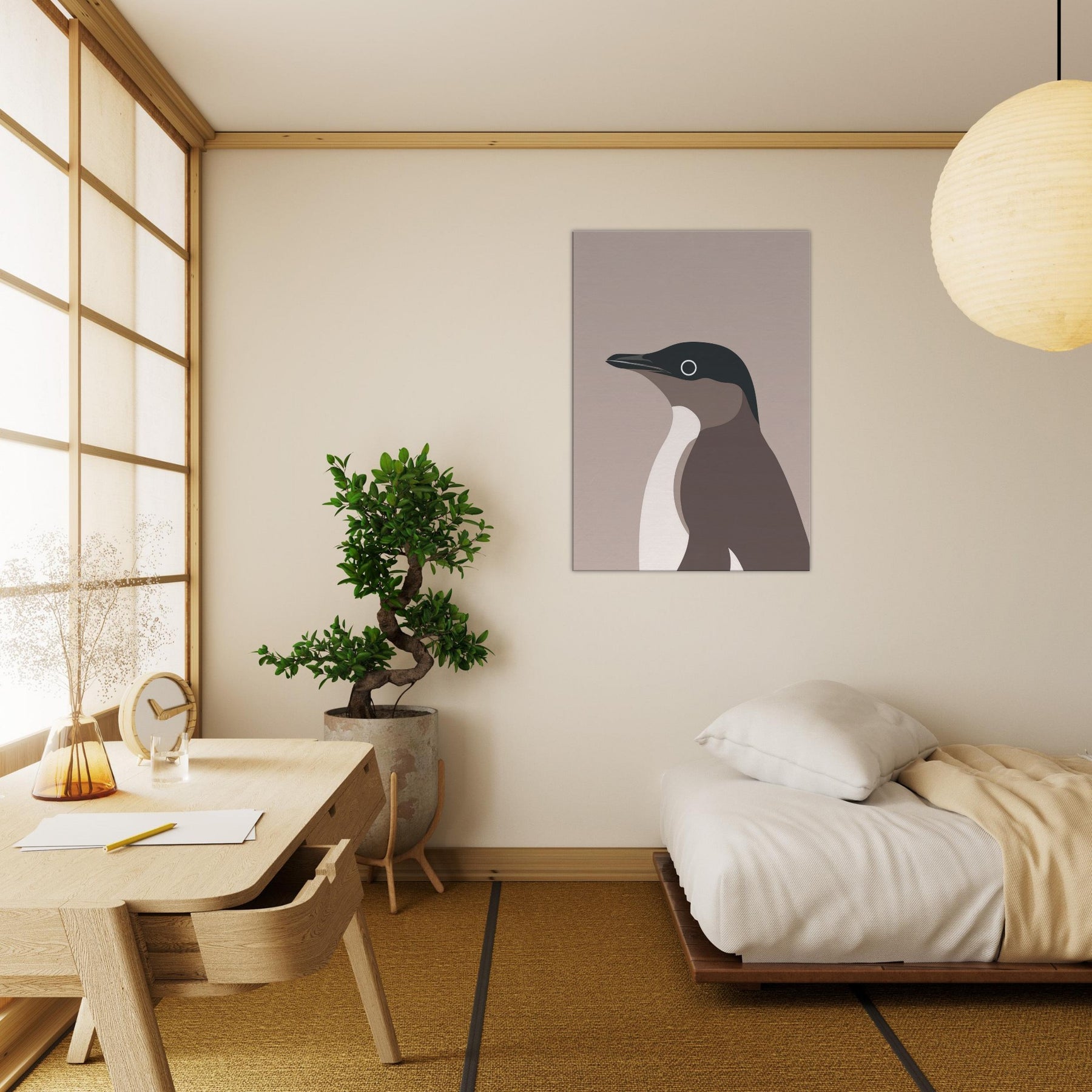 Feel the hush of a frosted morning with this minimalist penguin art, where simple shapes carve a quiet, confident presence in any room. The restrained palette deep slate, warm taupe, and creamy ivory balances space and light, inviting reflection rather than loud proclamation. Hung in a living room or study, it creates a calm focal point that enhances textures, fabrics, and natural wood. This penguin speaks in soft tones, a subtle reminder of resilience and grace in everyday life.