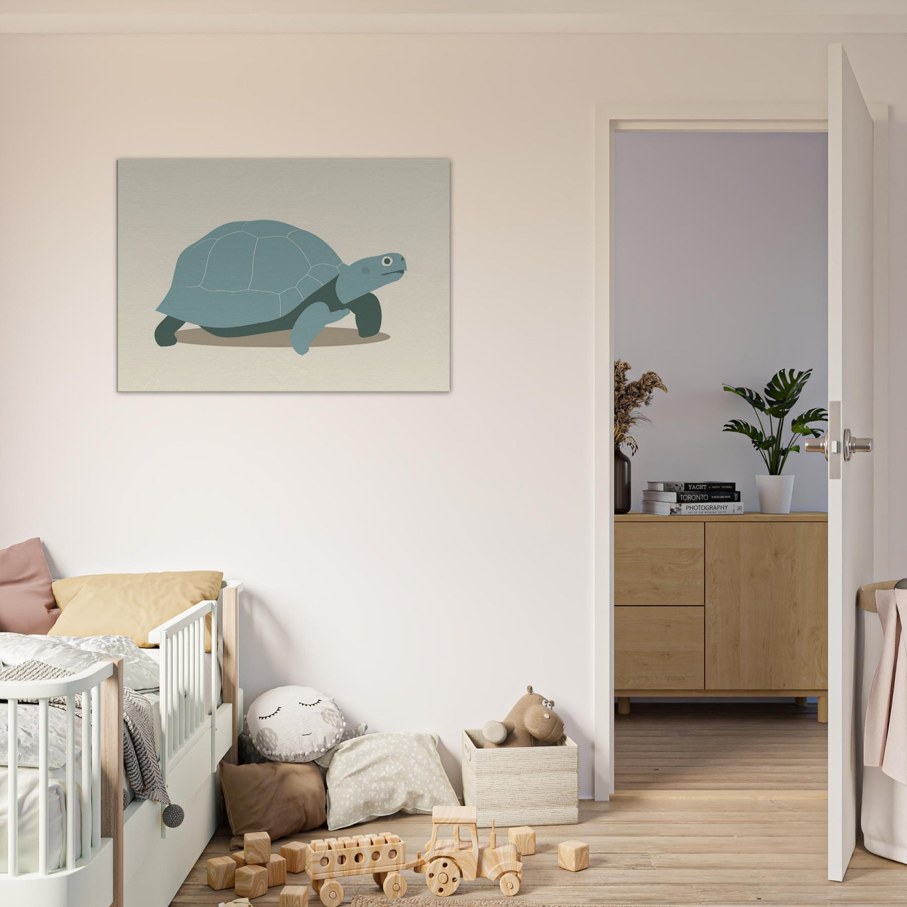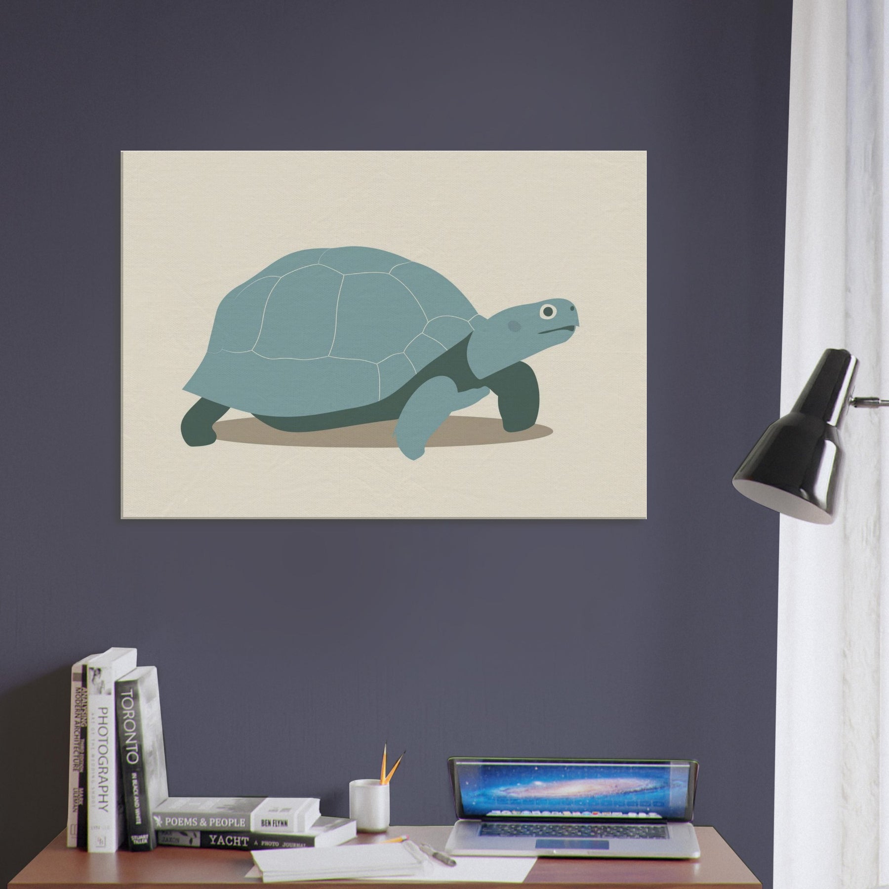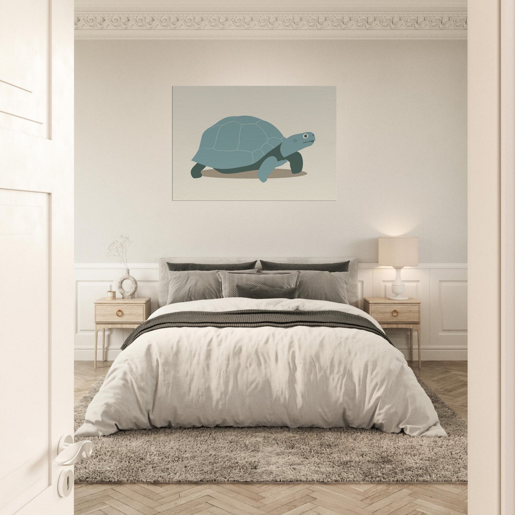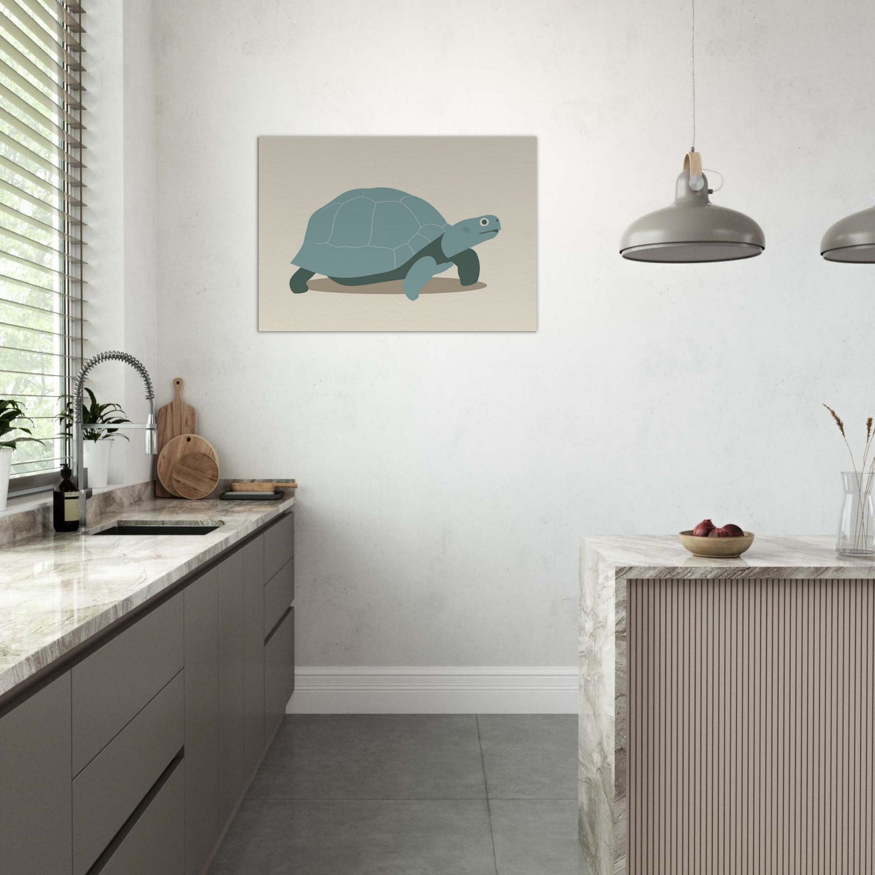 Softly monumental, this minimalist Turtle glides across a quiet shore of negative space. The shell is rendered in gentle teal panels, edged by delicate lines that read as a memory of tides. The restrained palette and clean shapes invite calm, making the wall feel like a coastal room where time slows. Perfect for a living space, it pairs with natural textures and warm lighting, turning everyday moments into a serene, contemplative atmosphere centered on the Turtle.
