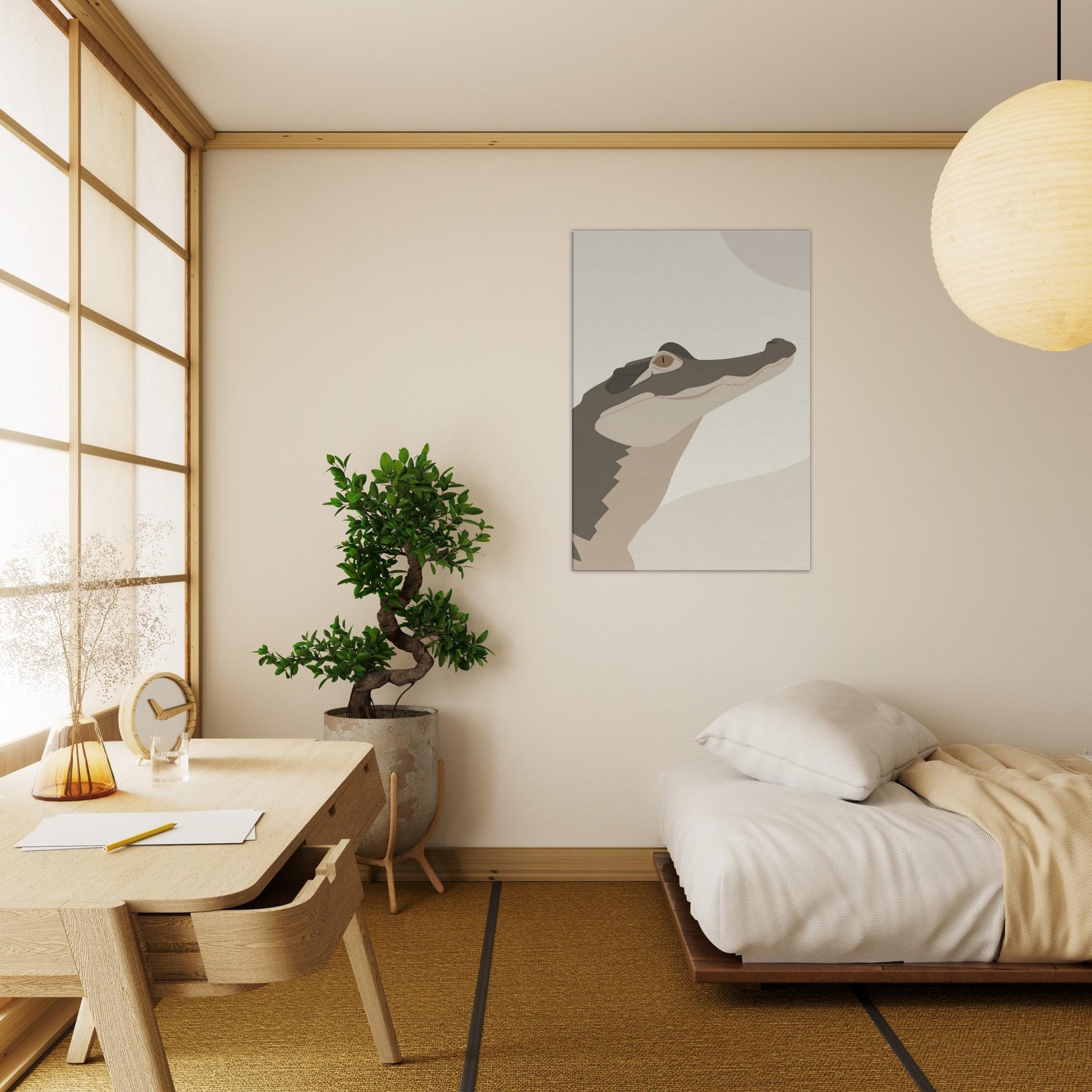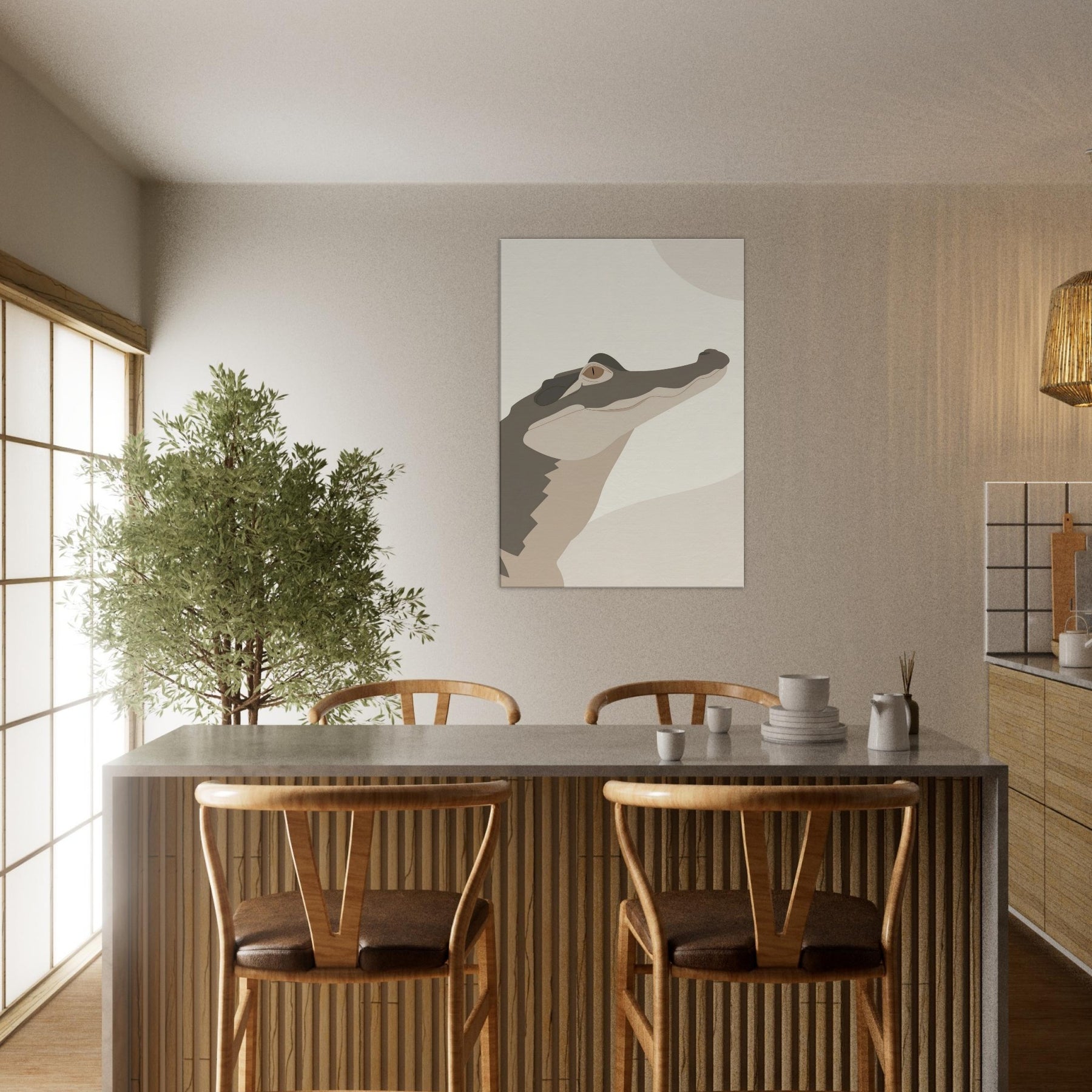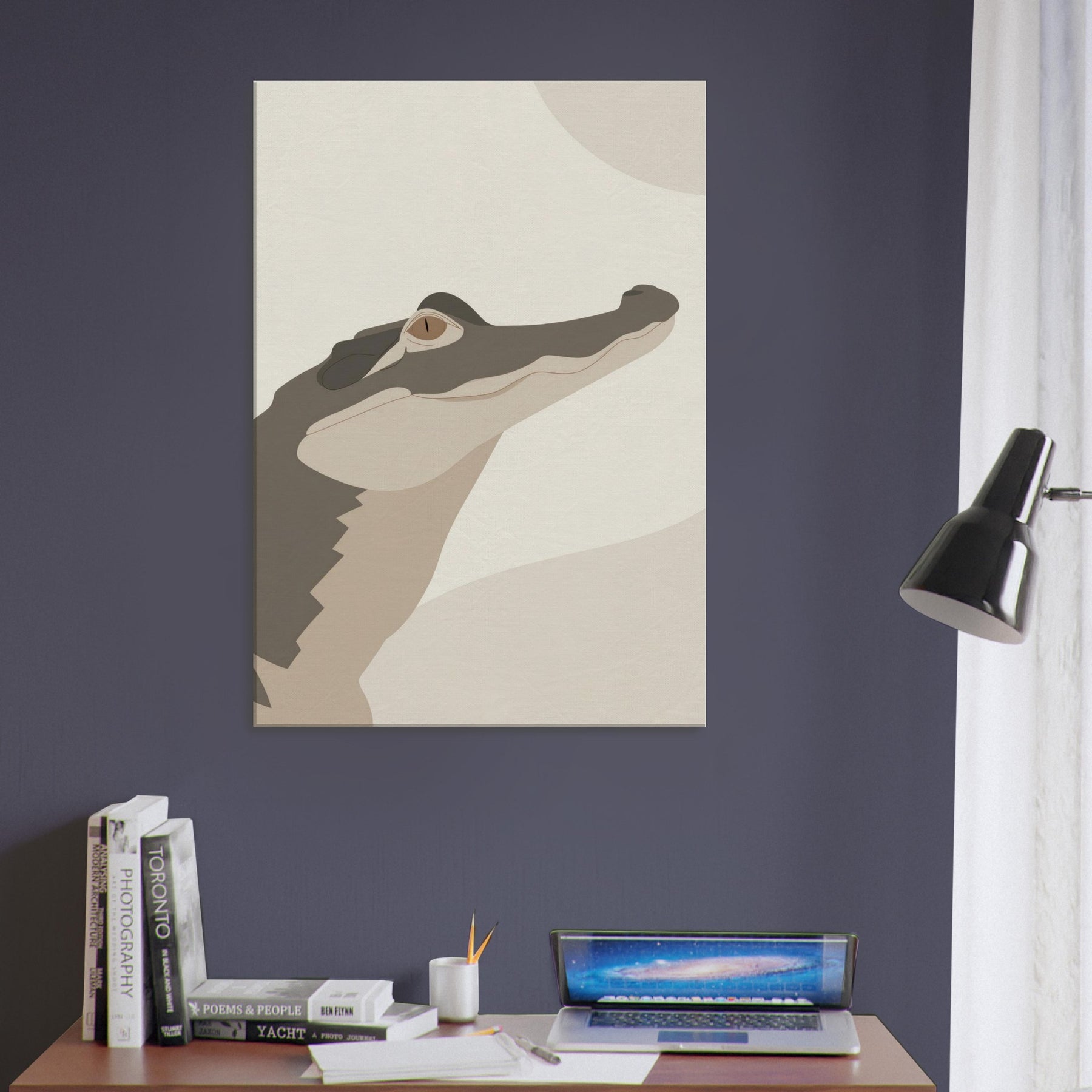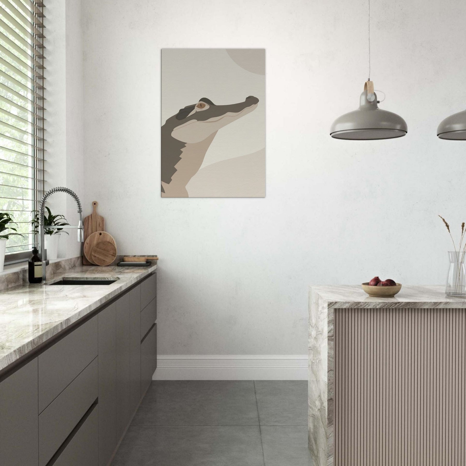 Between pale sands and a quiet horizon, this minimalist Alligator invites a breath of still water into your space. The composed lines trace the Alligator's arc with serene confidence, capturing its presence without clutter. Its subdued palette of earthy beiges and taupes glows softly in morning light, turning a wall into a calming perch for contemplation. Perfect over a sofa or console, it pairs with natural textures and warm wood, elevating living spaces with quiet, refined energy.