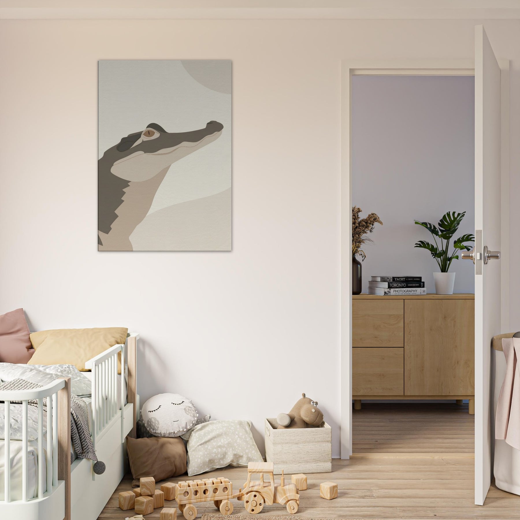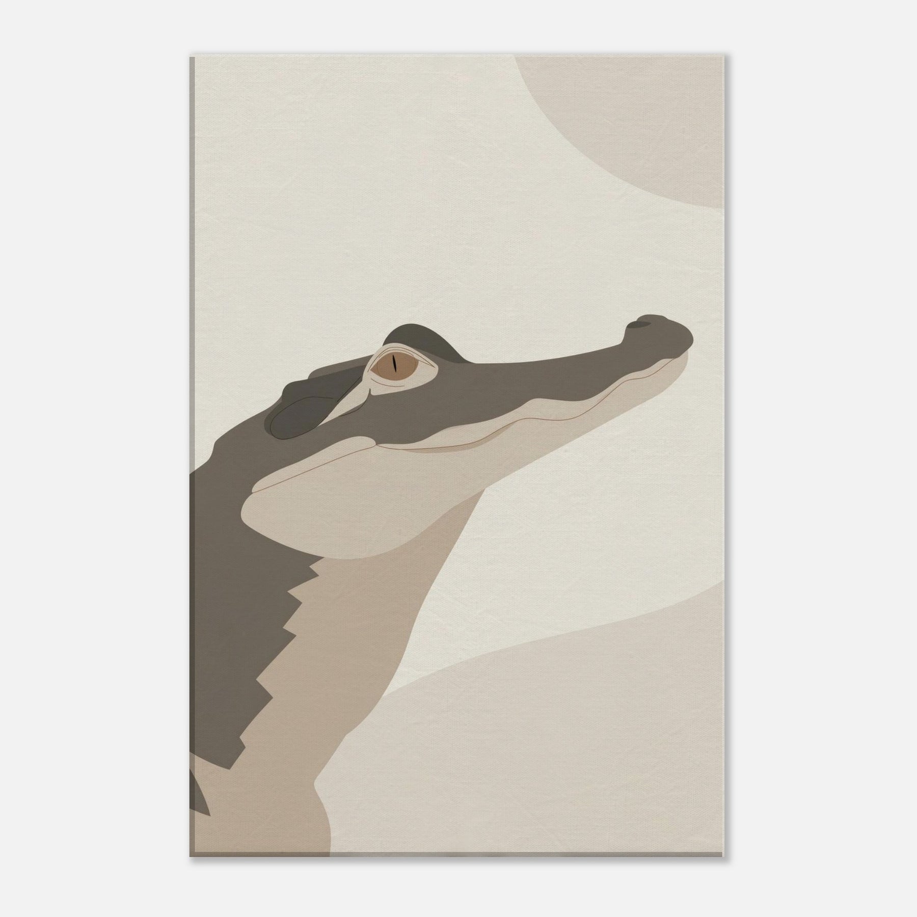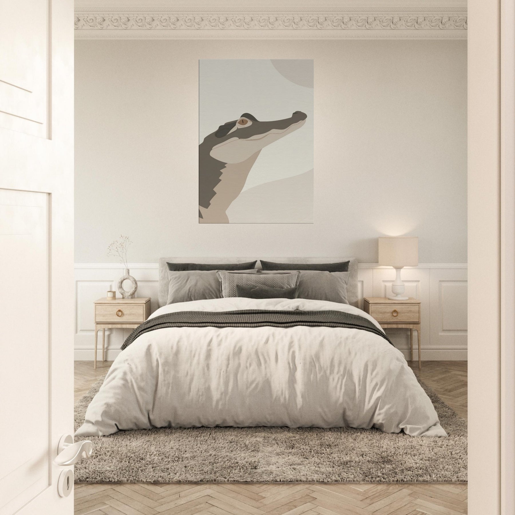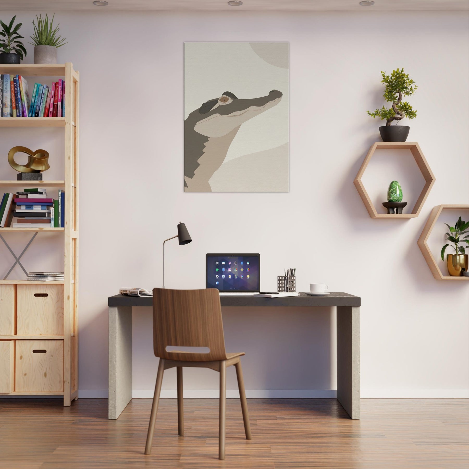 Between pale sands and a quiet horizon, this minimalist Alligator invites a breath of still water into your space. The composed lines trace the Alligator's arc with serene confidence, capturing its presence without clutter. Its subdued palette of earthy beiges and taupes glows softly in morning light, turning a wall into a calming perch for contemplation. Perfect over a sofa or console, it pairs with natural textures and warm wood, elevating living spaces with quiet, refined energy.