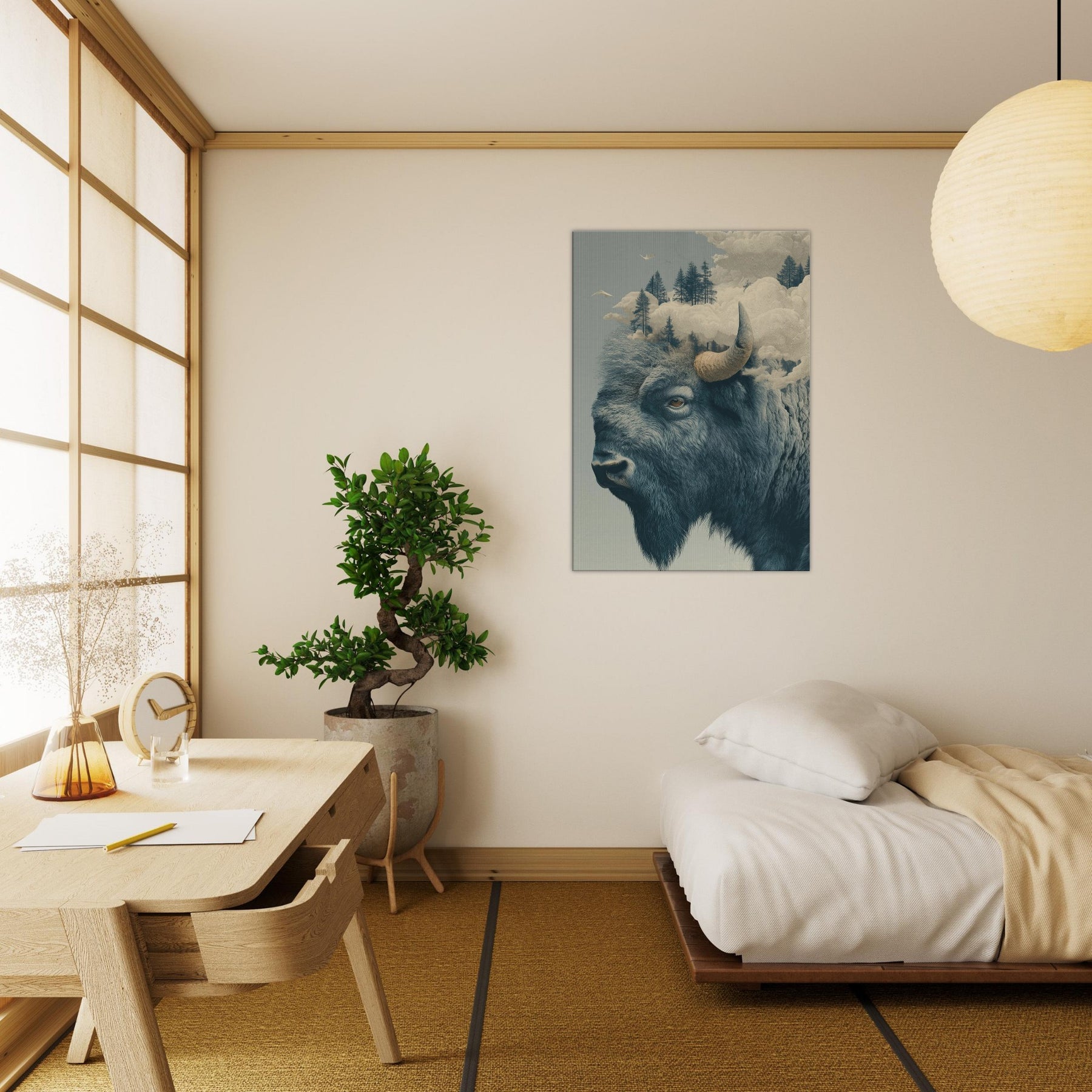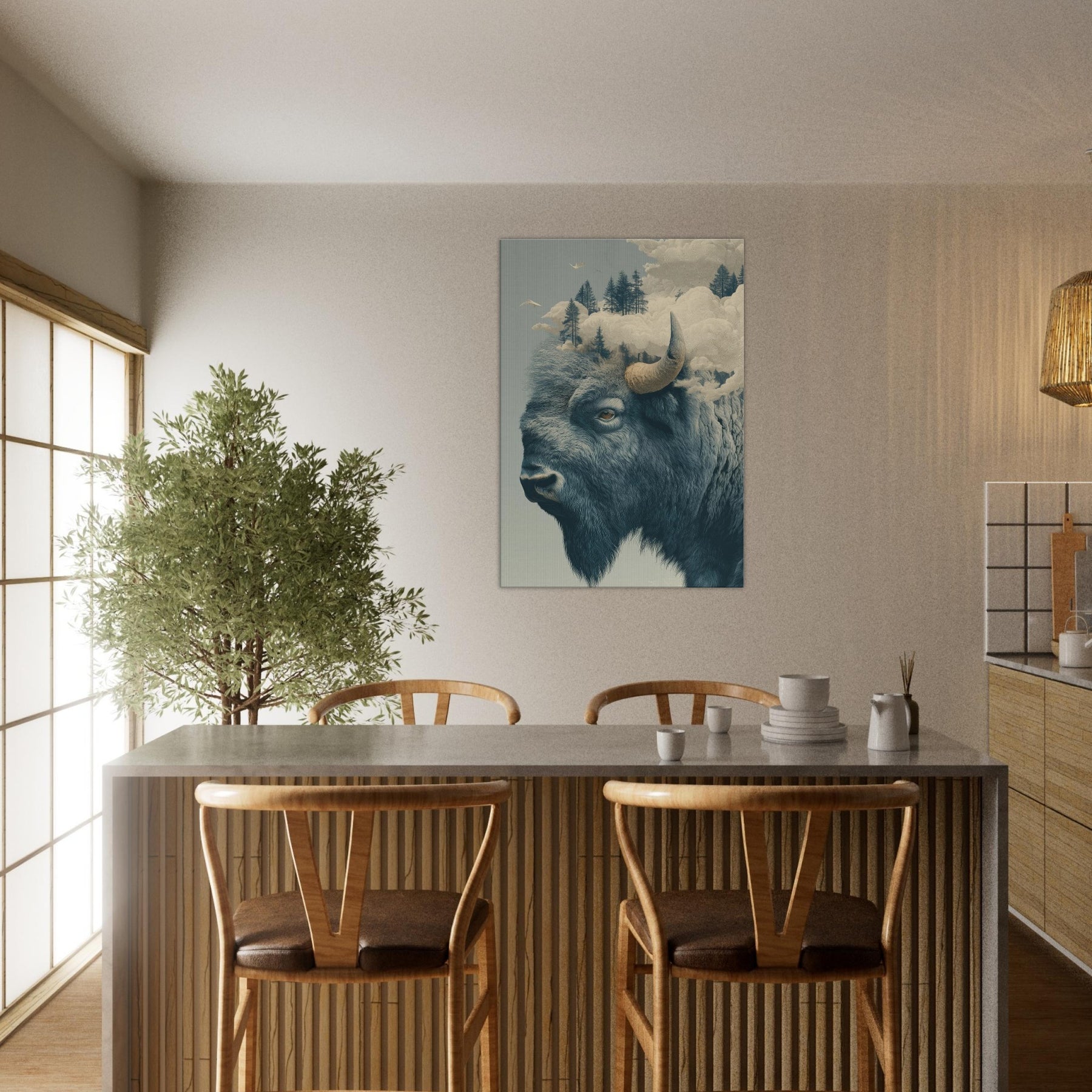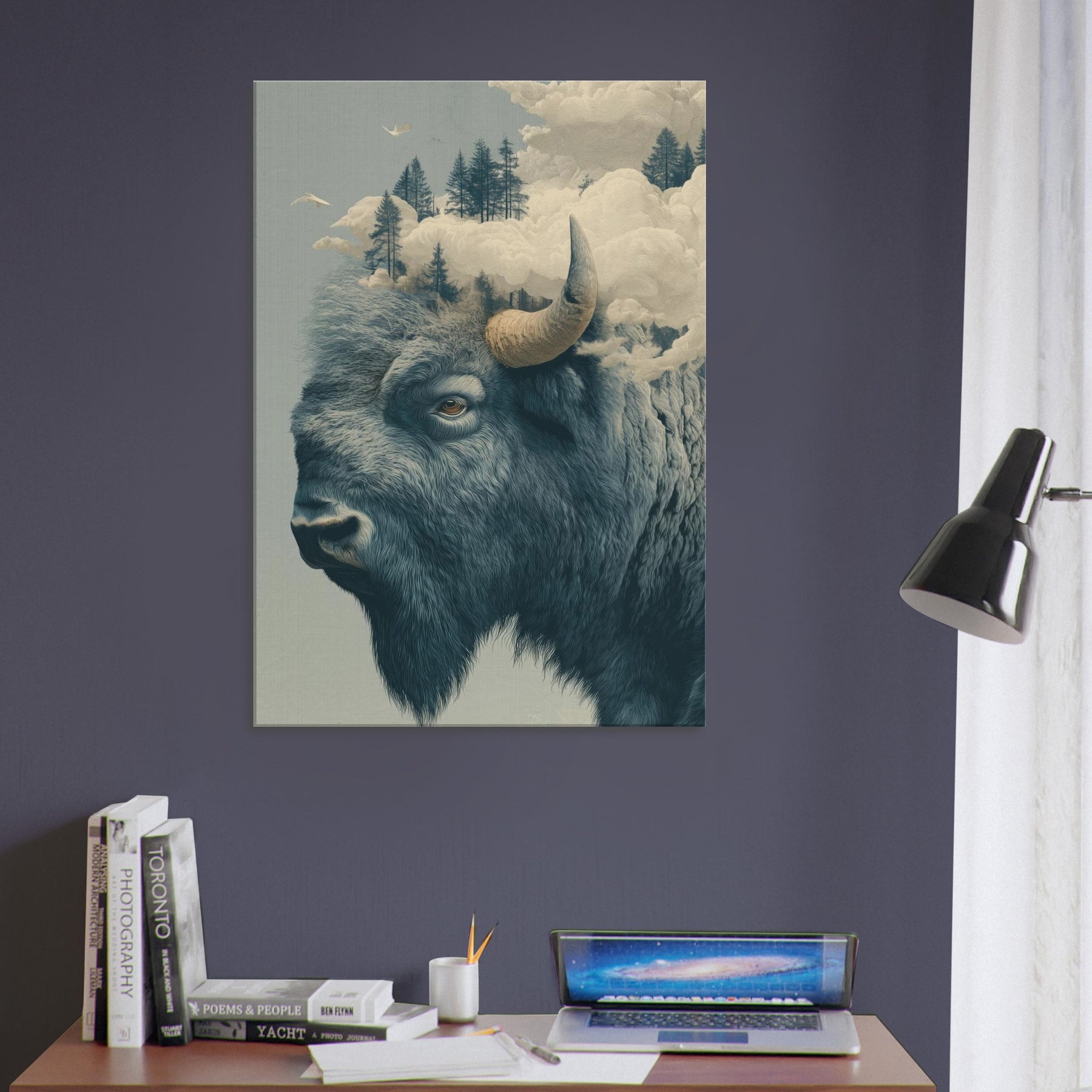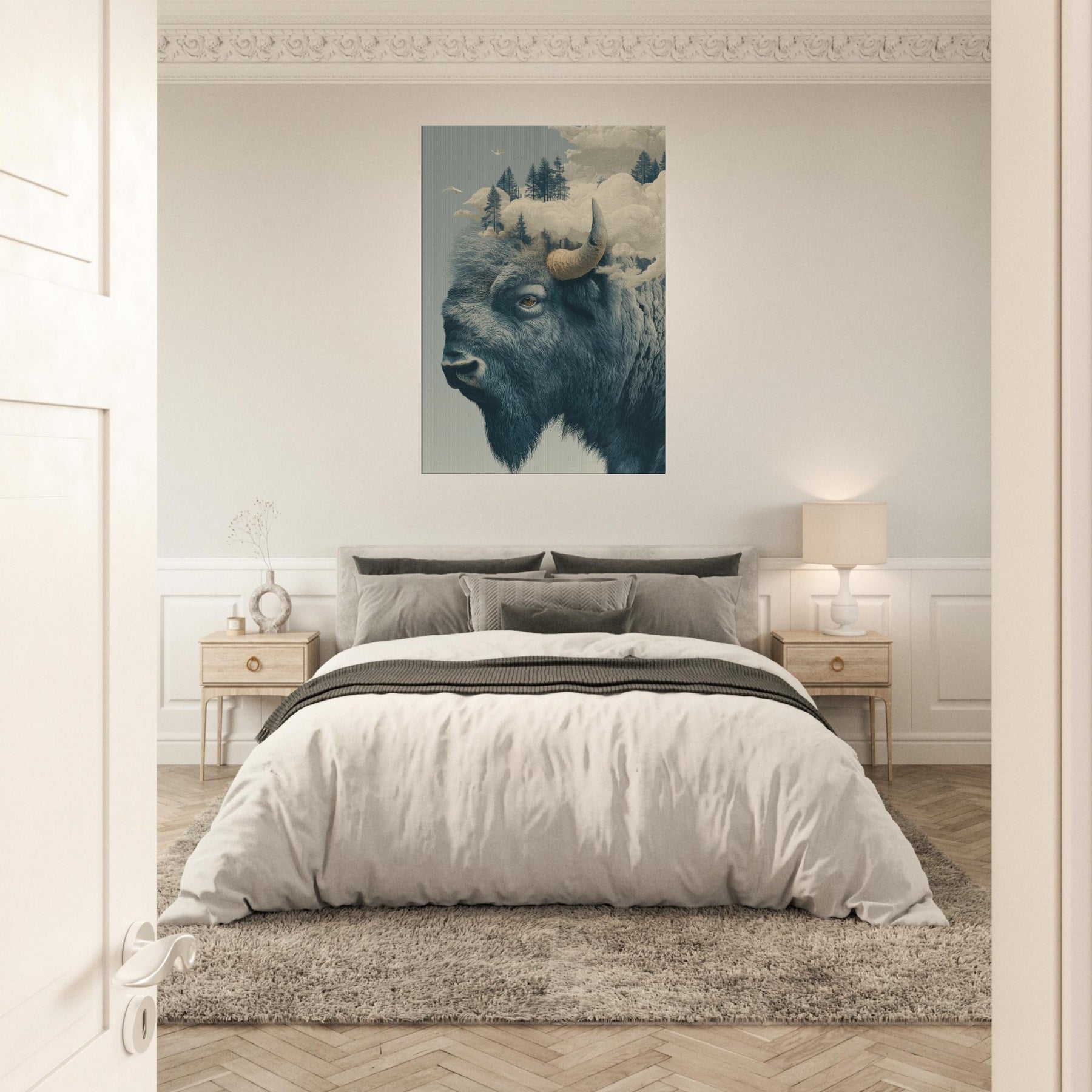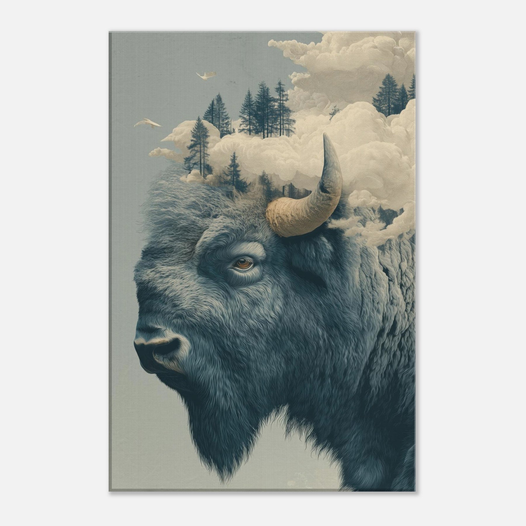 An expansive Bison rises from a dreamlike horizon, where pines float on soft fog and clouds sculpt the air into a quiet cathedral. This surreal tableau fuses rugged northern silence with a delicate, almost ethereal light, inviting the room to breathe with you. The bison's grave, knowing gaze anchors the space, while the shifting sky suggests memory and motion. Hang it where you seek contemplation or conversation this piece welcomes slow mornings and late evenings, turning a corridor or living room into a lyrical sanctuary of atmosphere.