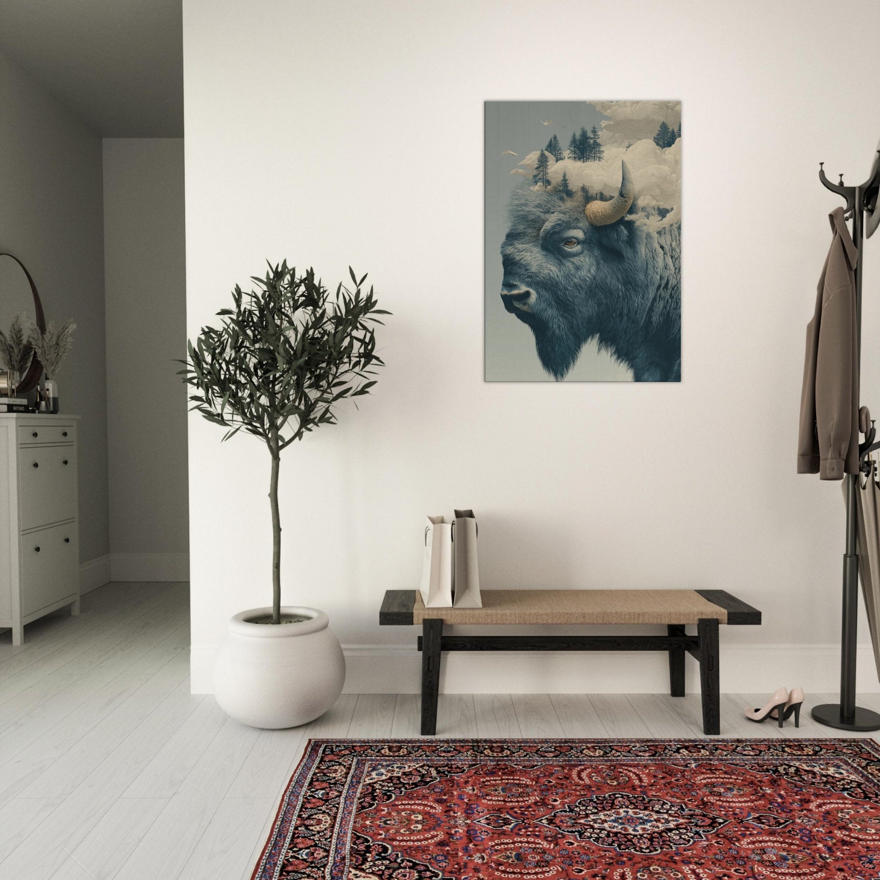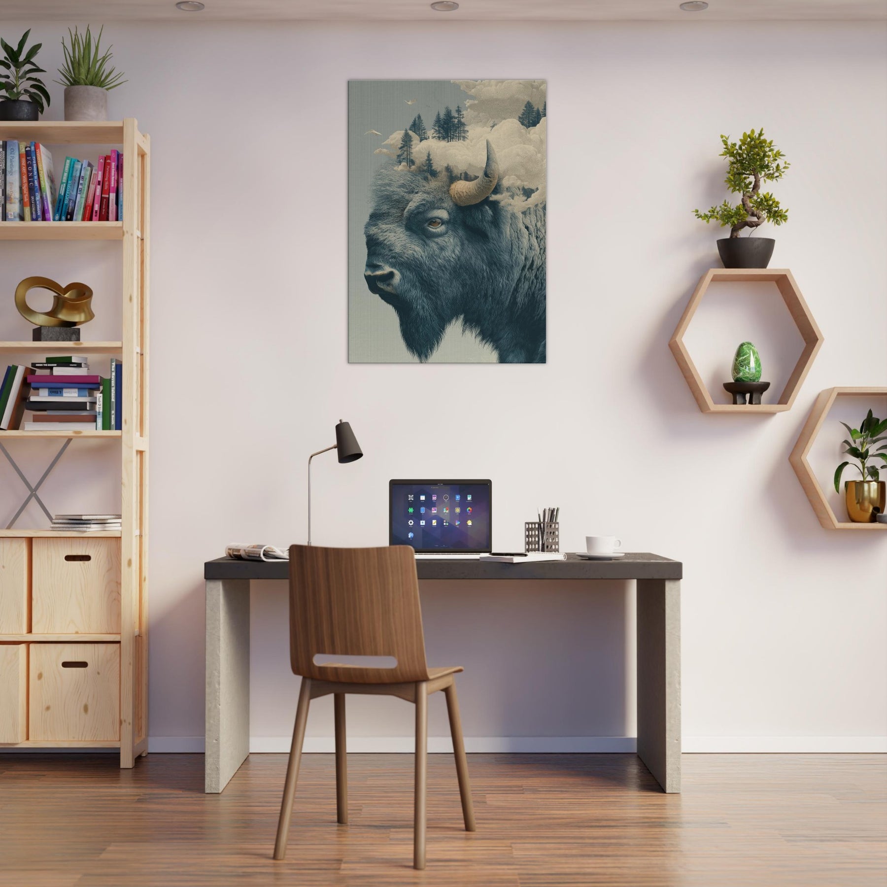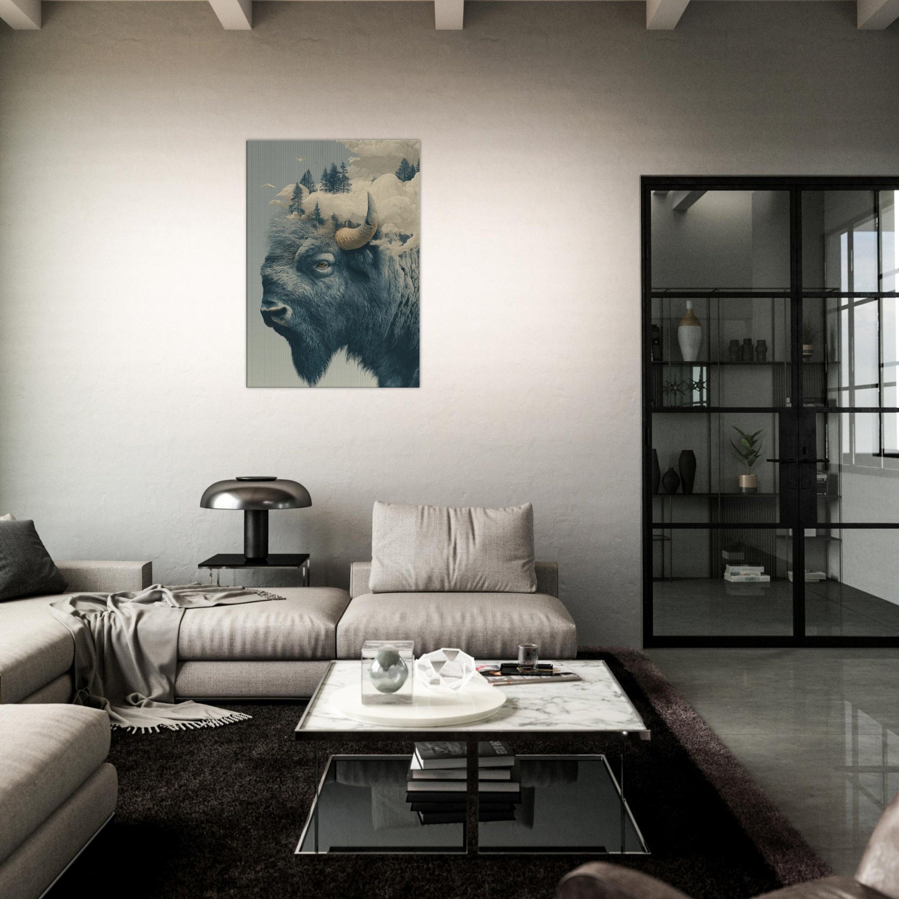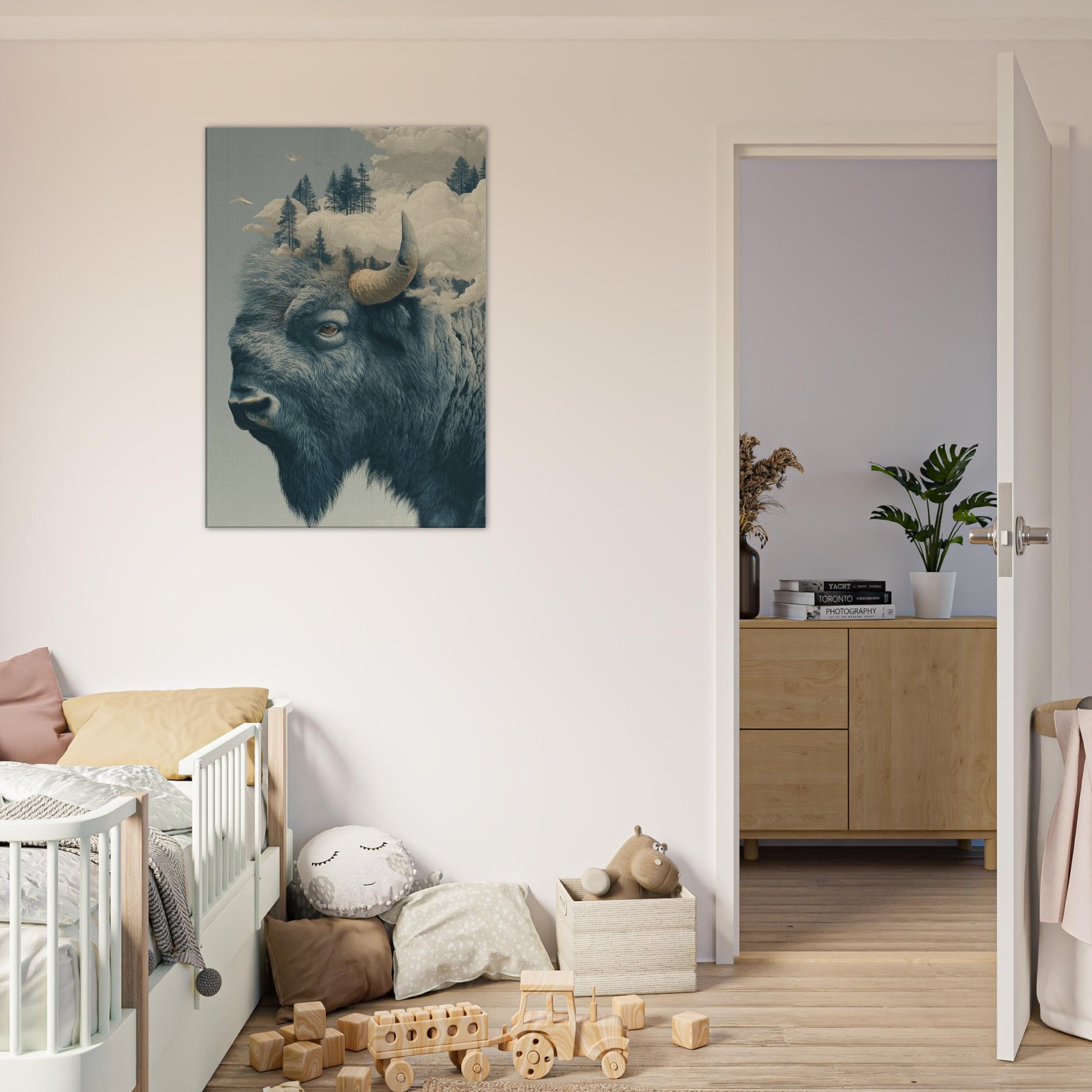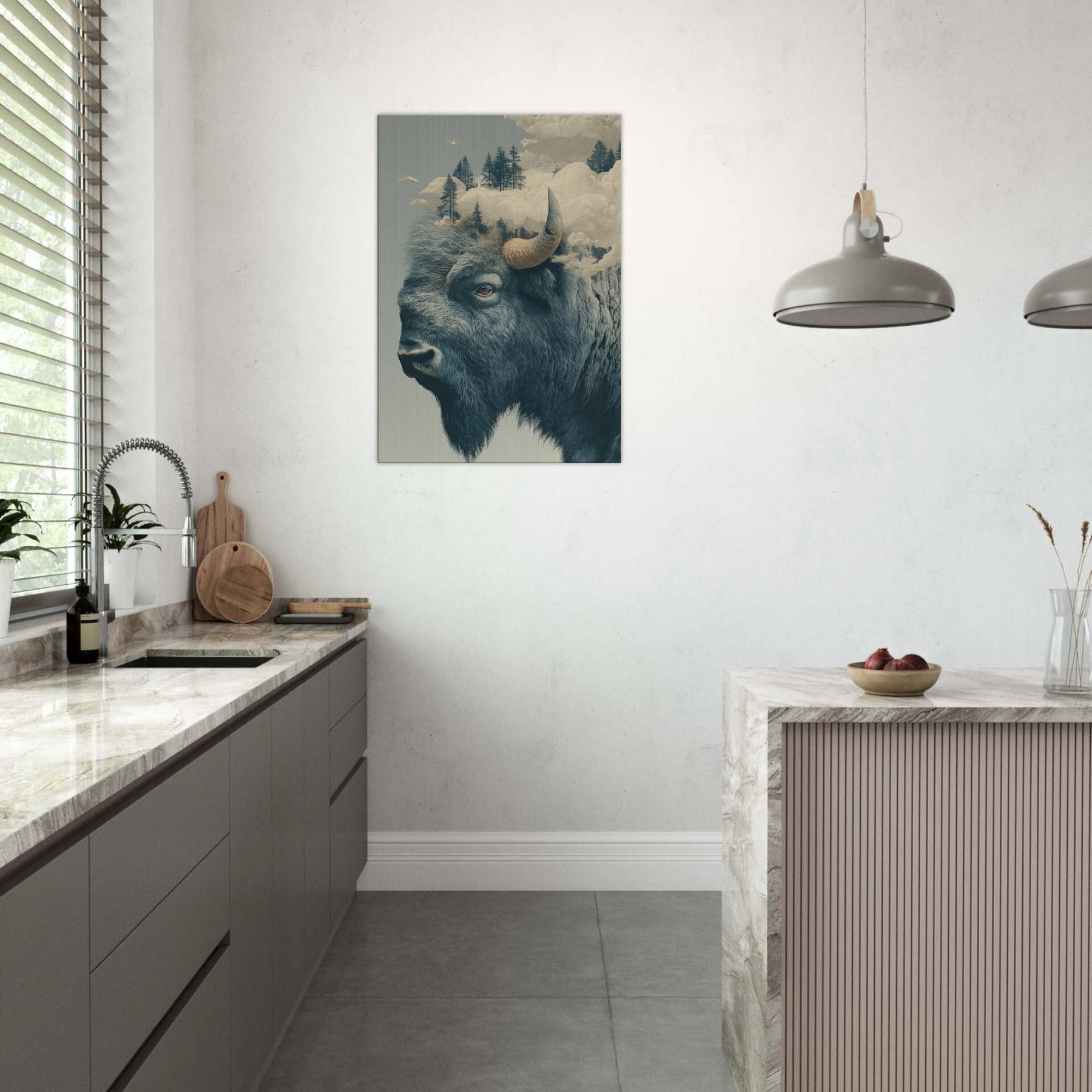 An expansive Bison rises from a dreamlike horizon, where pines float on soft fog and clouds sculpt the air into a quiet cathedral. This surreal tableau fuses rugged northern silence with a delicate, almost ethereal light, inviting the room to breathe with you. The bison's grave, knowing gaze anchors the space, while the shifting sky suggests memory and motion. Hang it where you seek contemplation or conversation this piece welcomes slow mornings and late evenings, turning a corridor or living room into a lyrical sanctuary of atmosphere.
