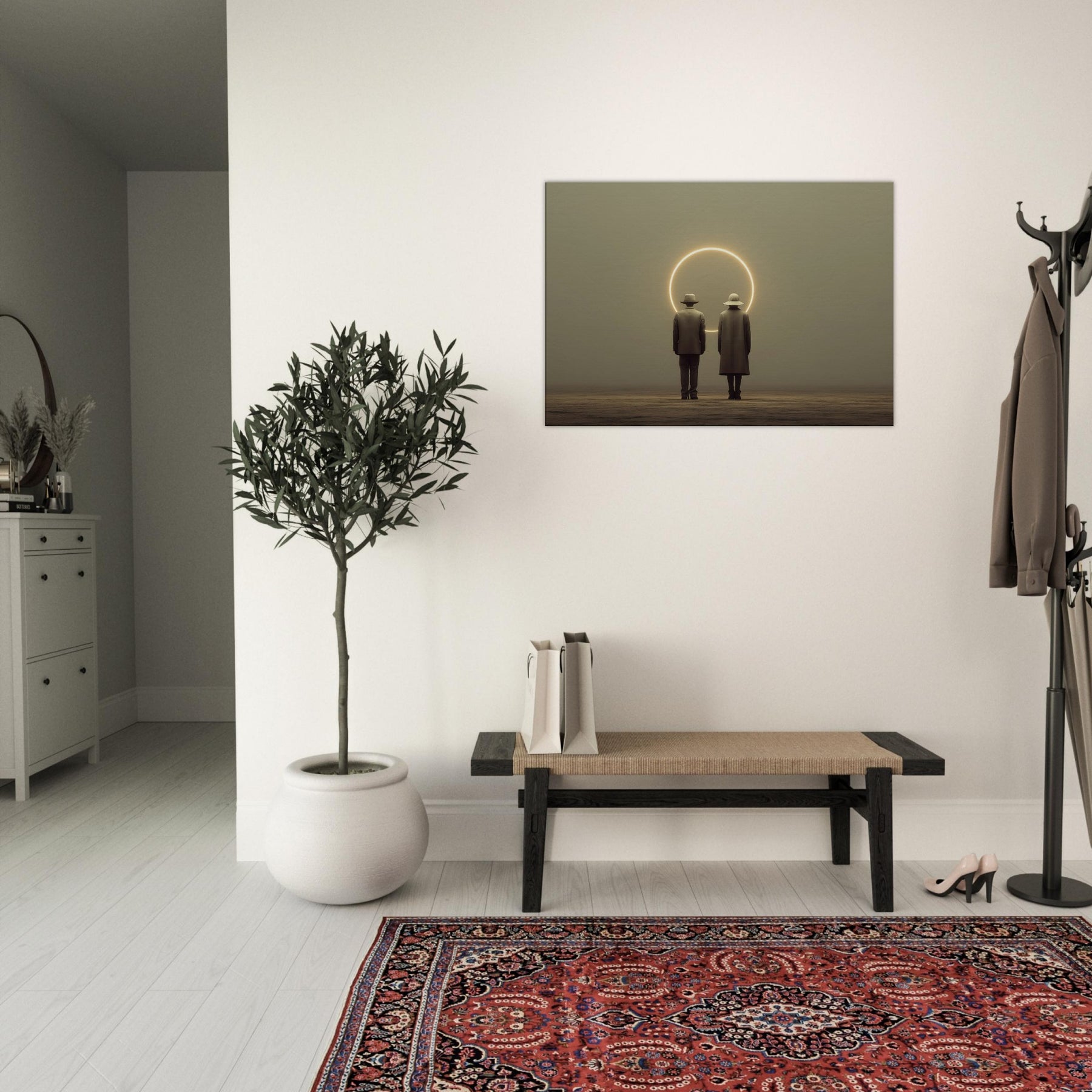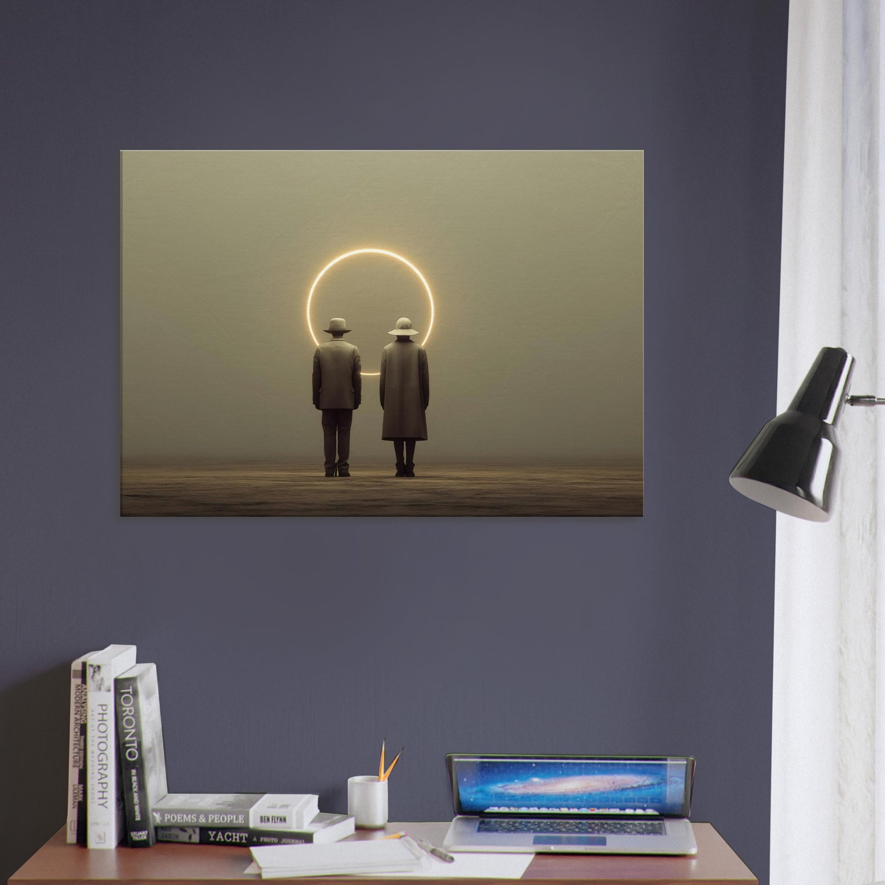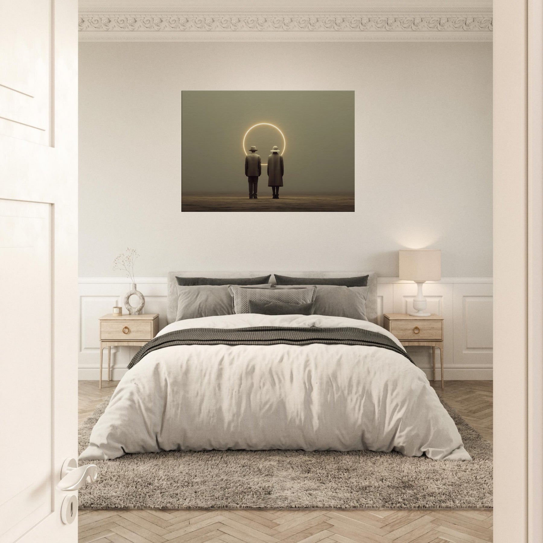Pendulum (Divination) takes the stage in a desert hush, where two muted figures stand before a halo of light. The scene feels suspended between memory and prophecy, a surreal invitation to listen to what time tells us. The soft glow and restrained palette bathe a room in a meditative calm, turning walls into a gateway for contemplation. This piece invites stillness, making living spaces feel like a quiet sanctuary for dreams, decisions, and the unseen.