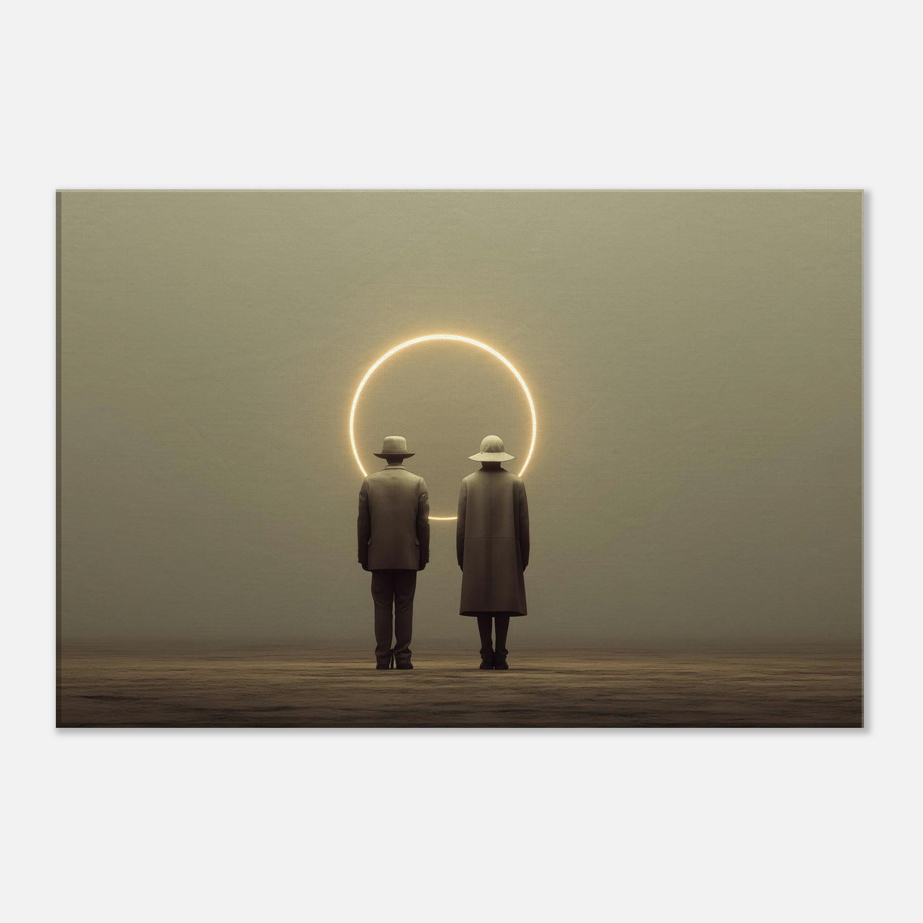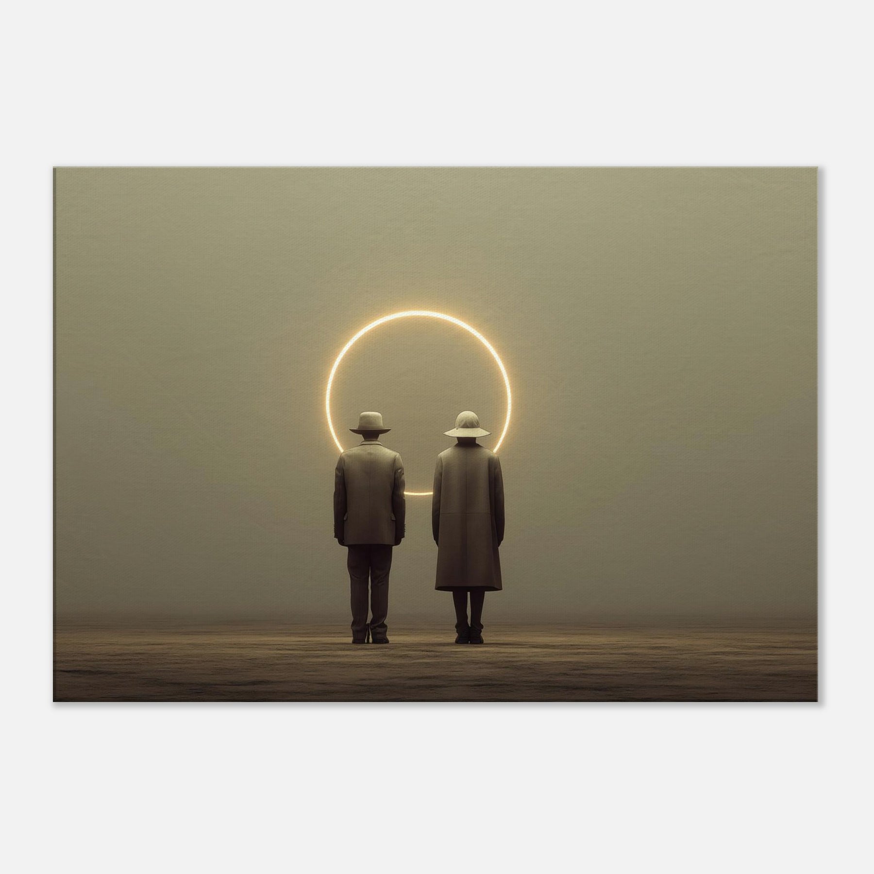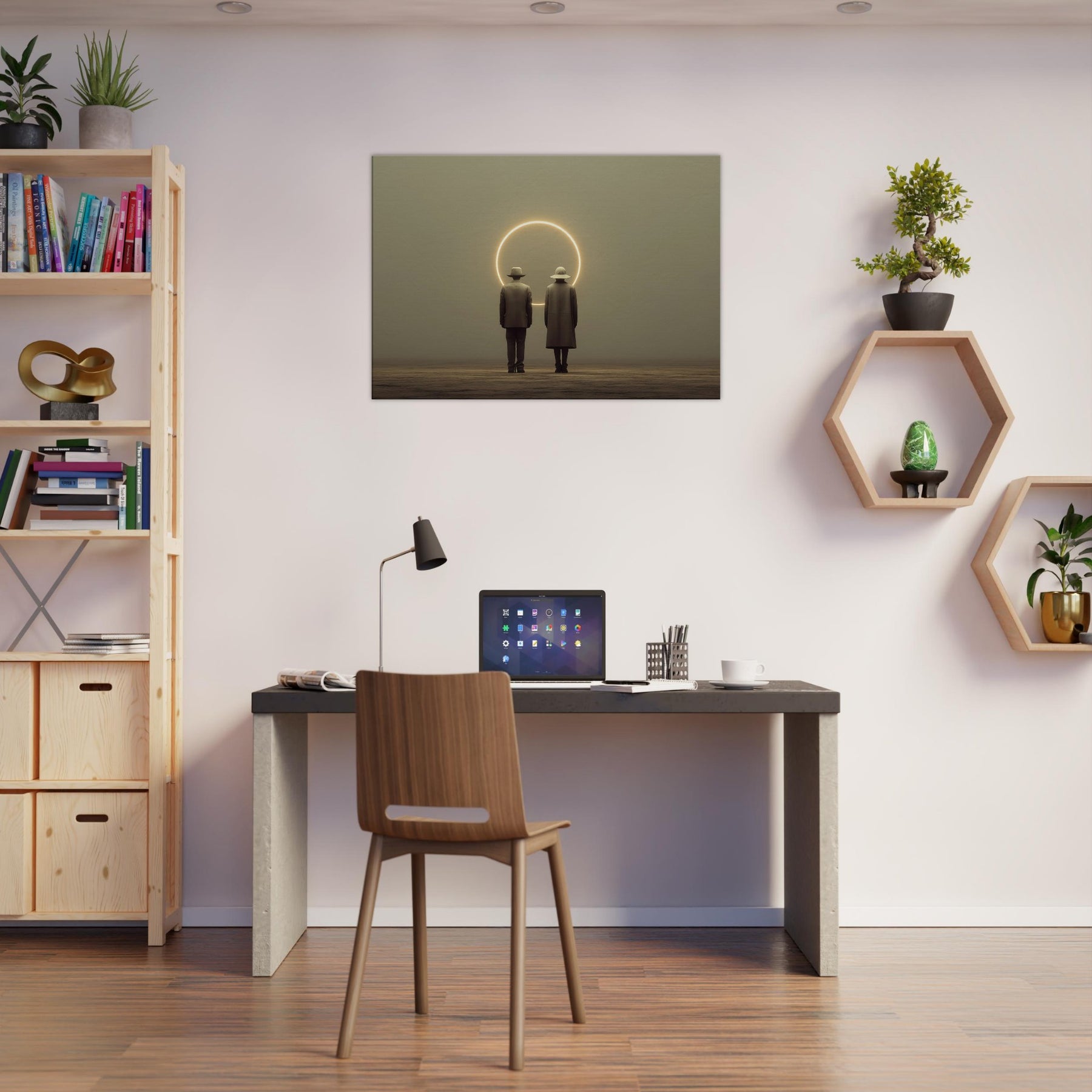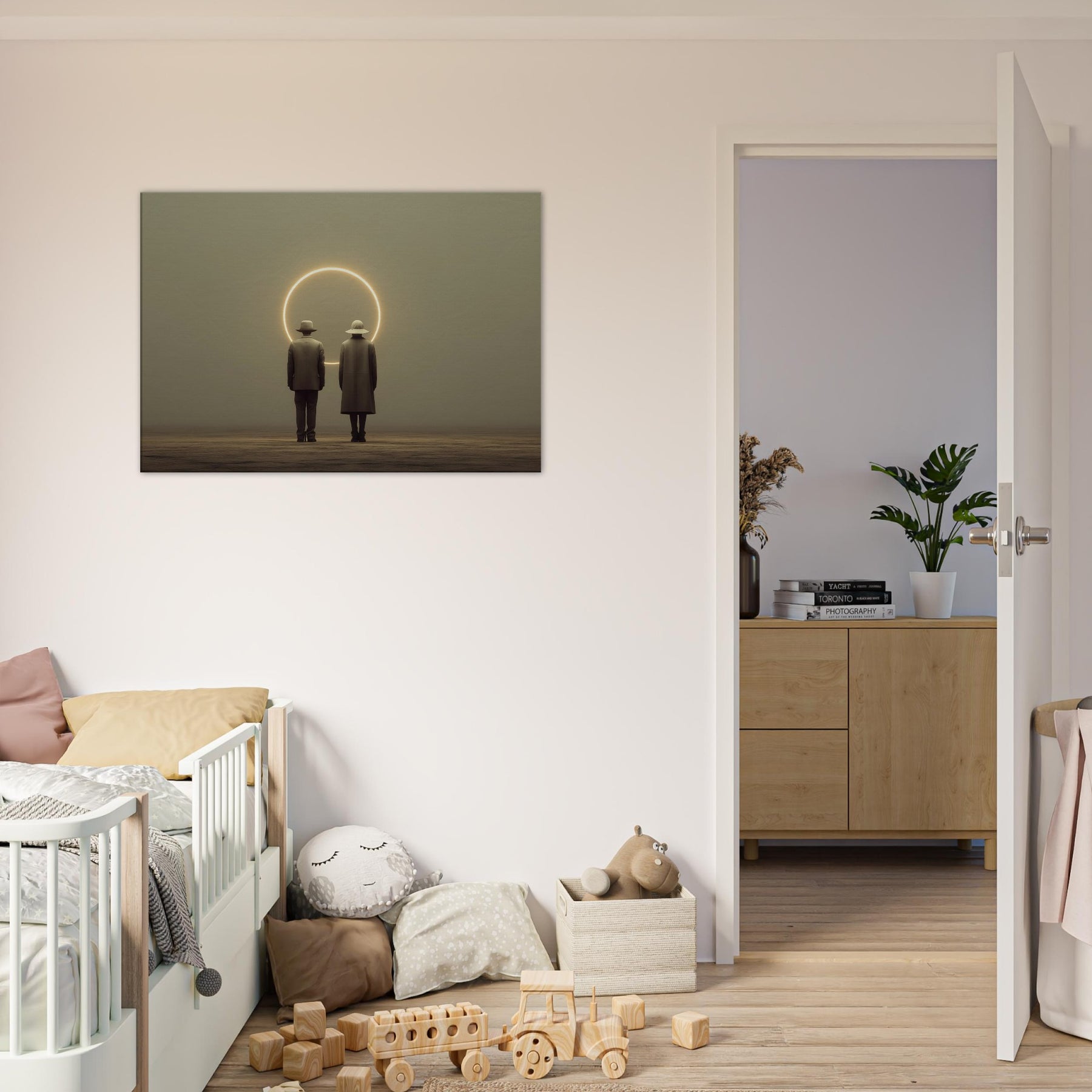 Pendulum (Divination) takes the stage in a desert hush, where two muted figures stand before a halo of light. The scene feels suspended between memory and prophecy, a surreal invitation to listen to what time tells us. The soft glow and restrained palette bathe a room in a meditative calm, turning walls into a gateway for contemplation. This piece invites stillness, making living spaces feel like a quiet sanctuary for dreams, decisions, and the unseen.
