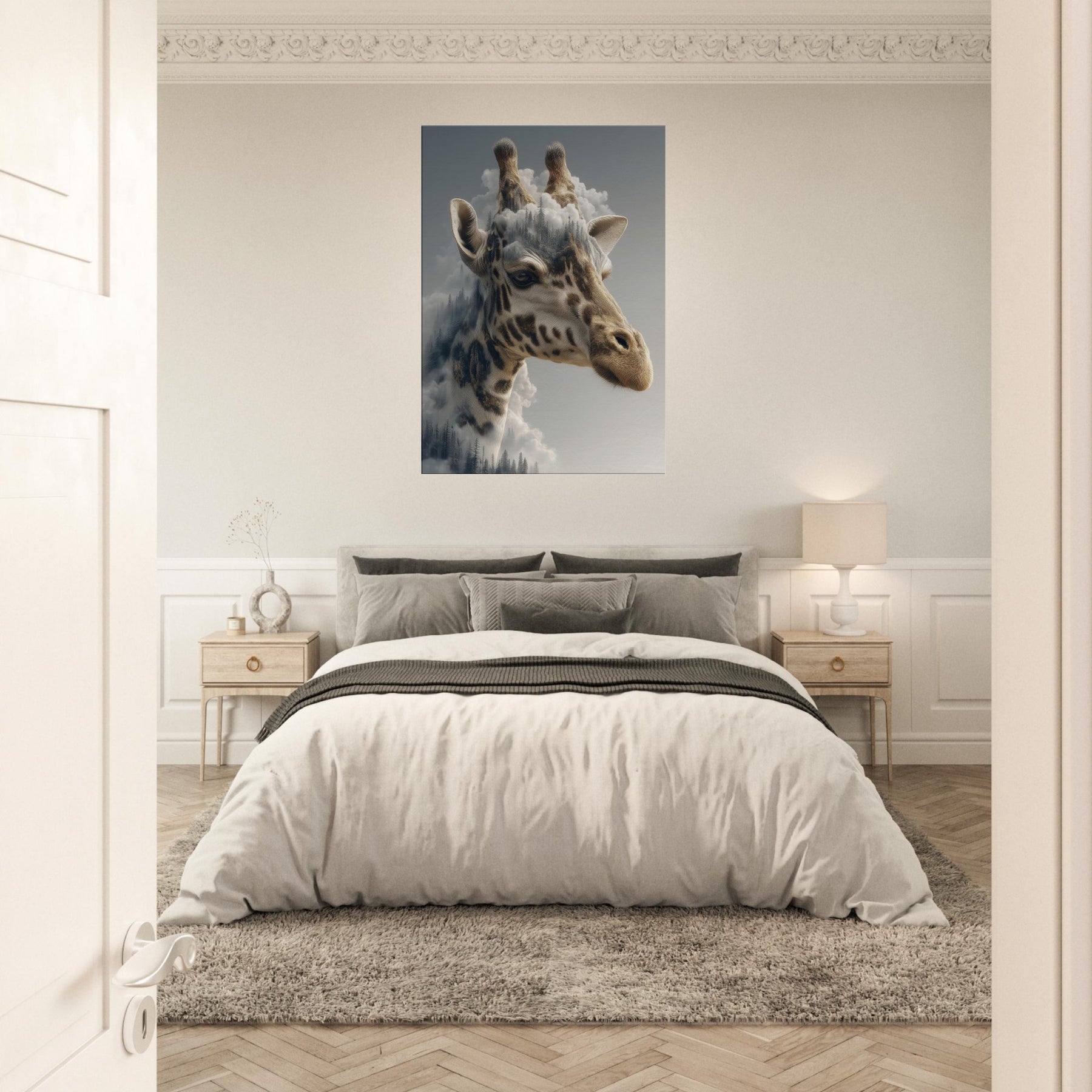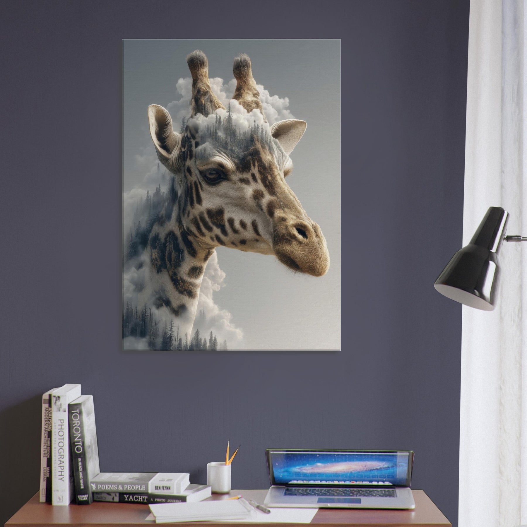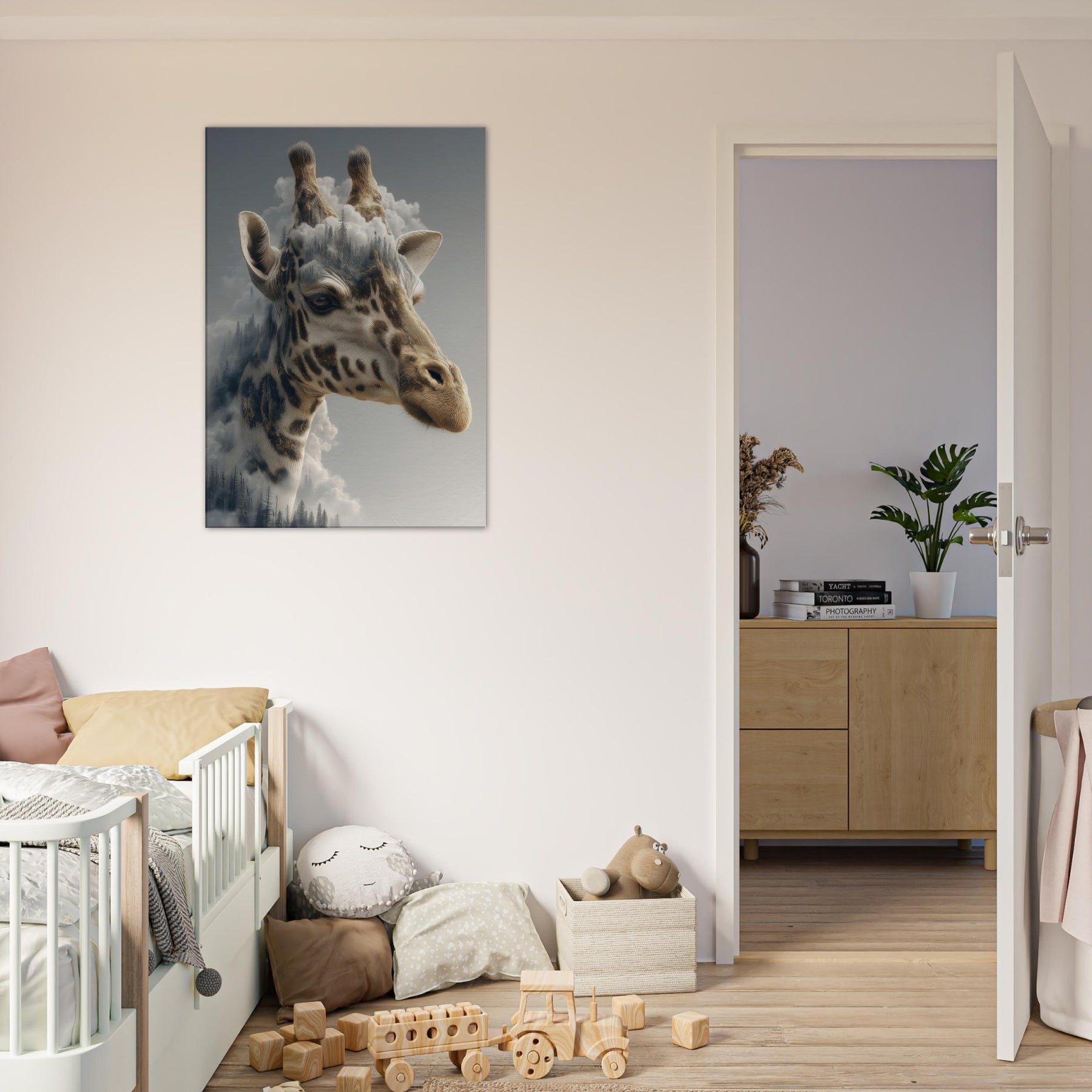 Step into a waking dream where a giraffe meets the weathered edge of a pine forest, clouds curling around each horn. This surreal scene folds nature and memory into one quiet presence, inviting a contemplative breath into your living space. The Primary Subject the giraffe looms with gentle curiosity, while mist and trees melt into its skin like a soft, living canvas. Hang this piece where soft morning light can coax a serenade of texture and wonder.