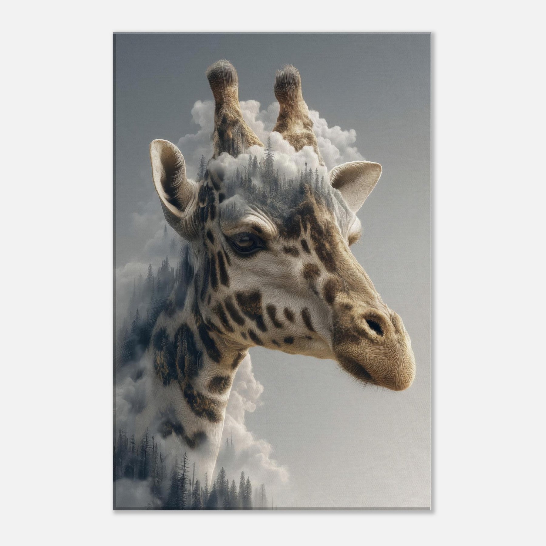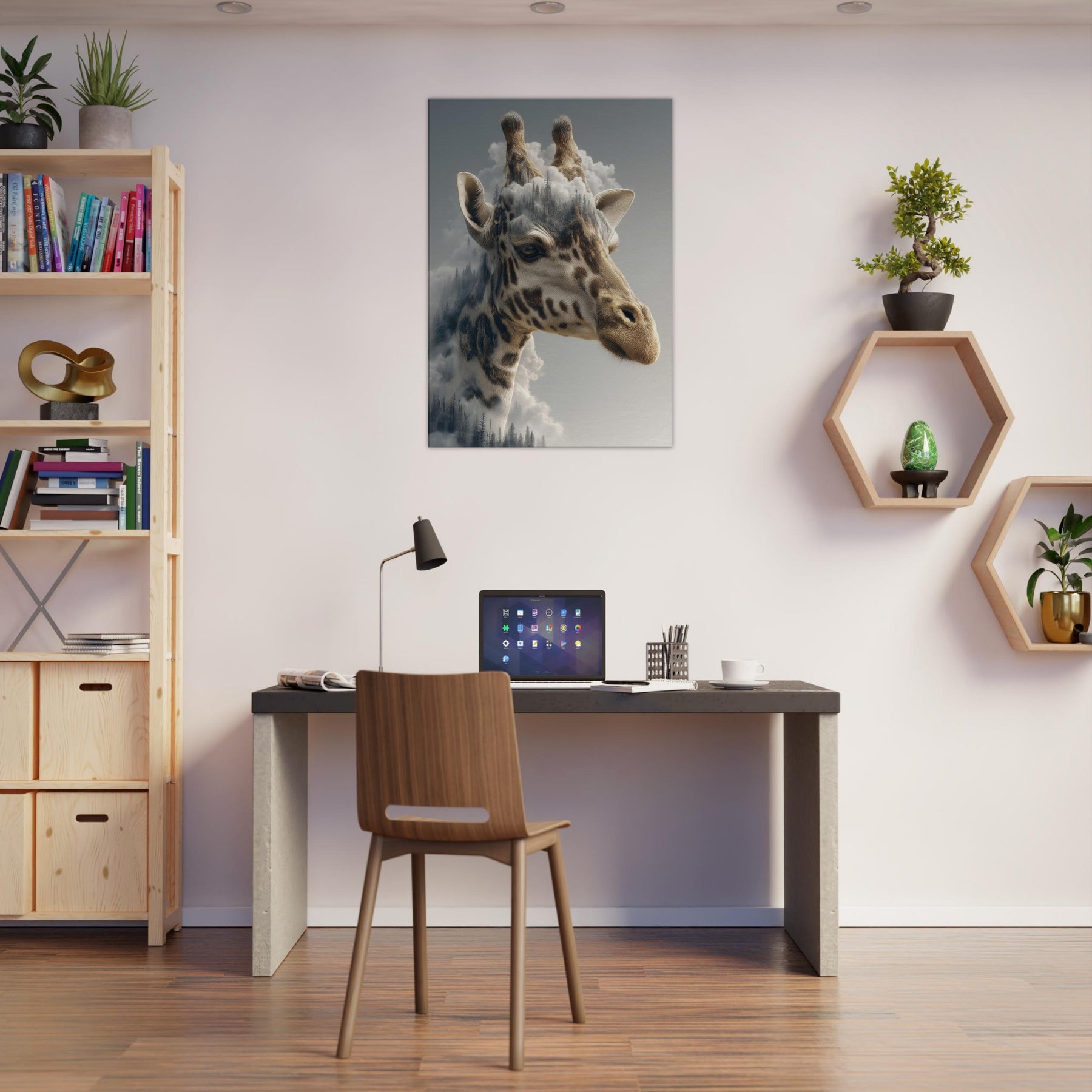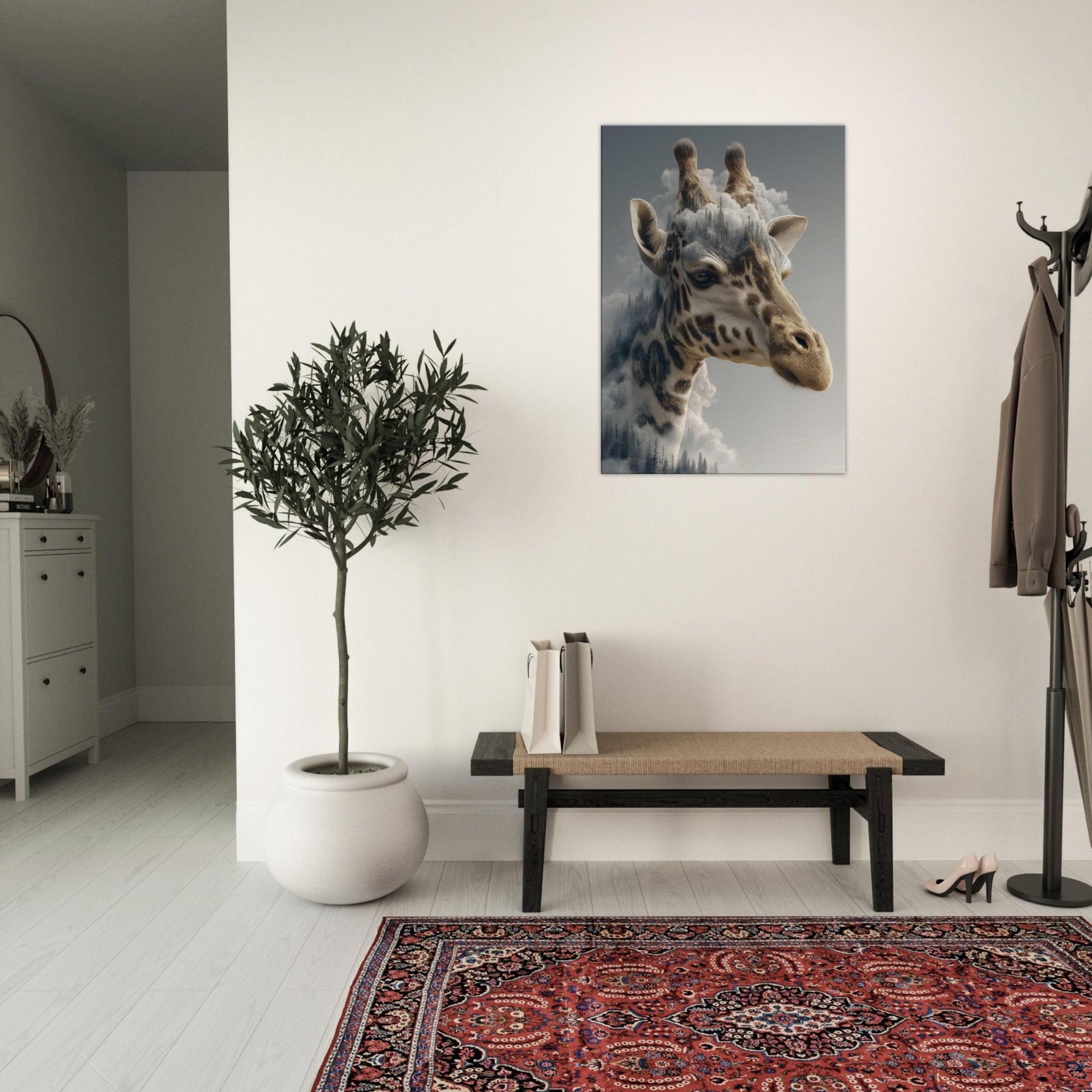 Step into a waking dream where a giraffe meets the weathered edge of a pine forest, clouds curling around each horn. This surreal scene folds nature and memory into one quiet presence, inviting a contemplative breath into your living space. The Primary Subject the giraffe looms with gentle curiosity, while mist and trees melt into its skin like a soft, living canvas. Hang this piece where soft morning light can coax a serenade of texture and wonder.