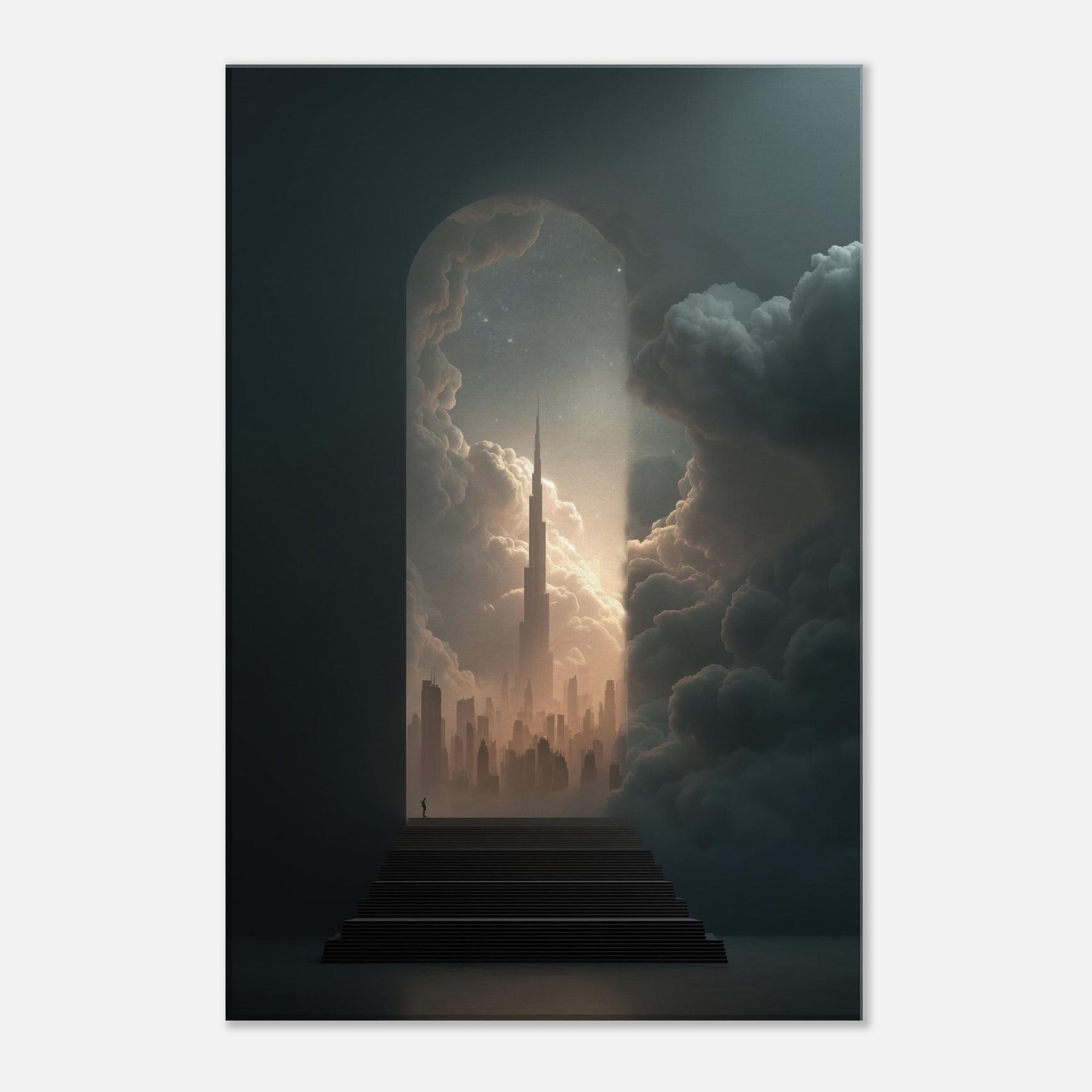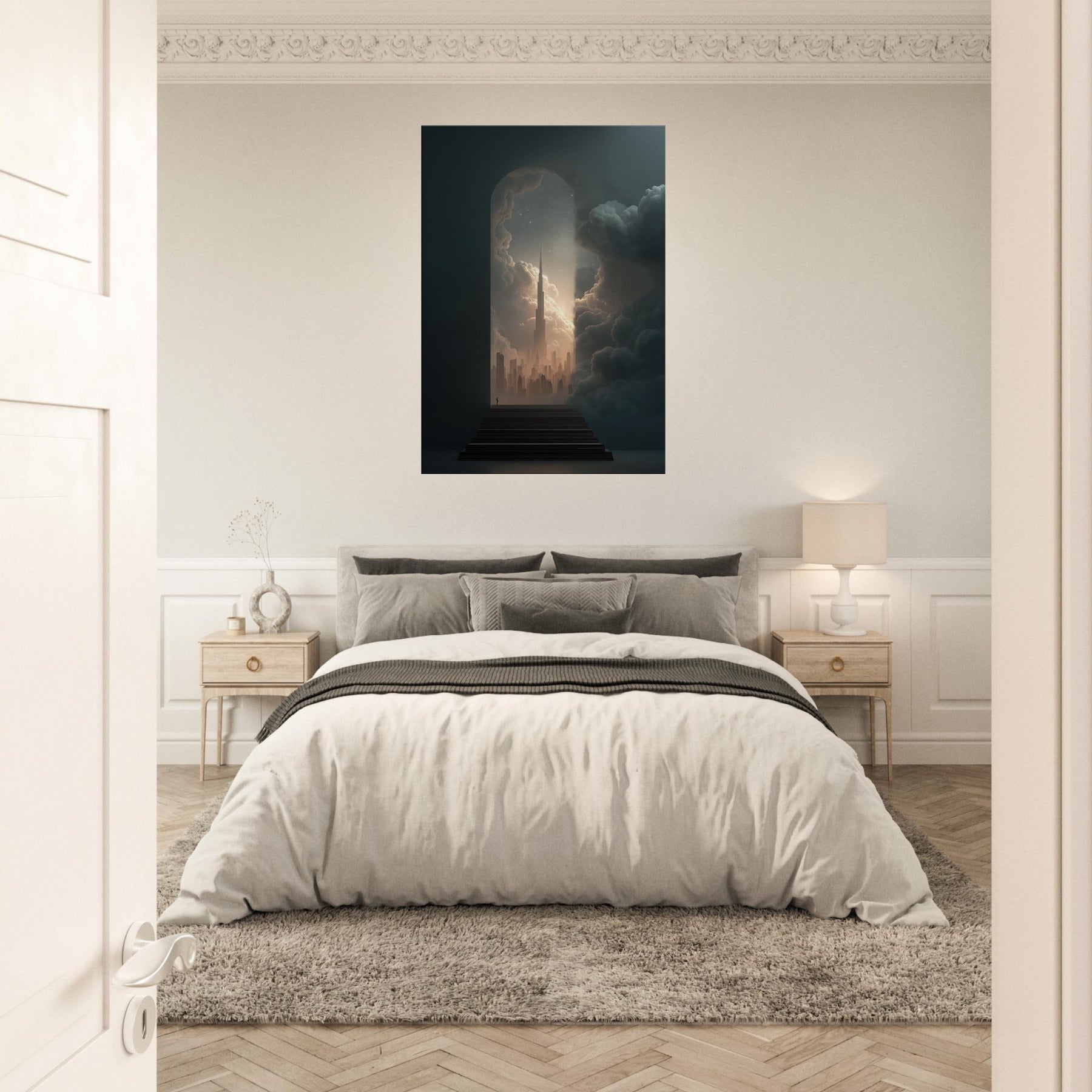 Burj Khalifa rises through a dawn bright arch of clouds, a dreamlike city breathing above the room. A stairway opens toward the glow, inviting a measured ascent as distant towers melt into gold haze. This surreal cityscape bathes walls in cinematic warmth, giving living spaces a horizon that feels both intimate and expansive. A lone figure anchors the scene, offering scale and calm perfect for interiors seeking depth, elegance, and a refined, imaginative mood.