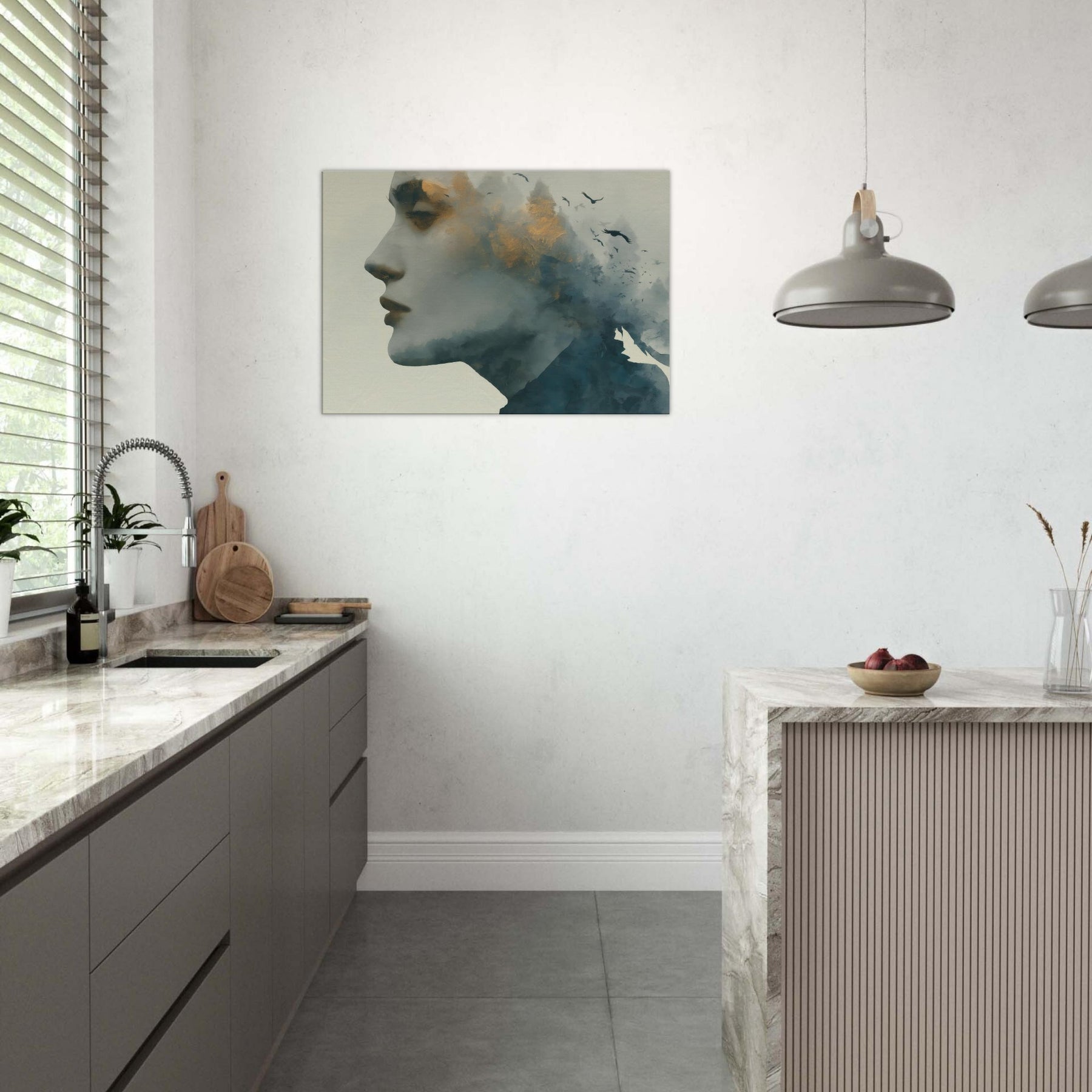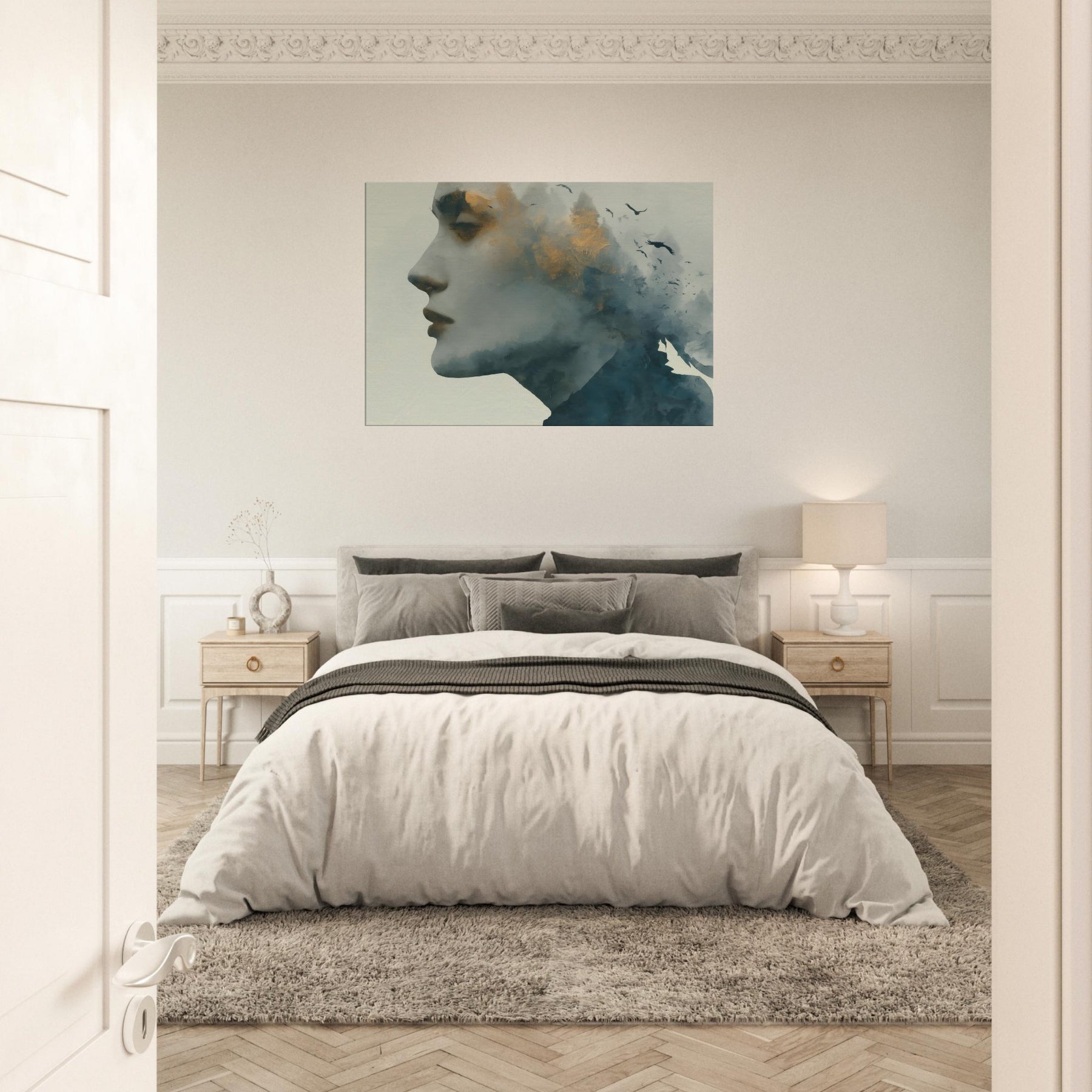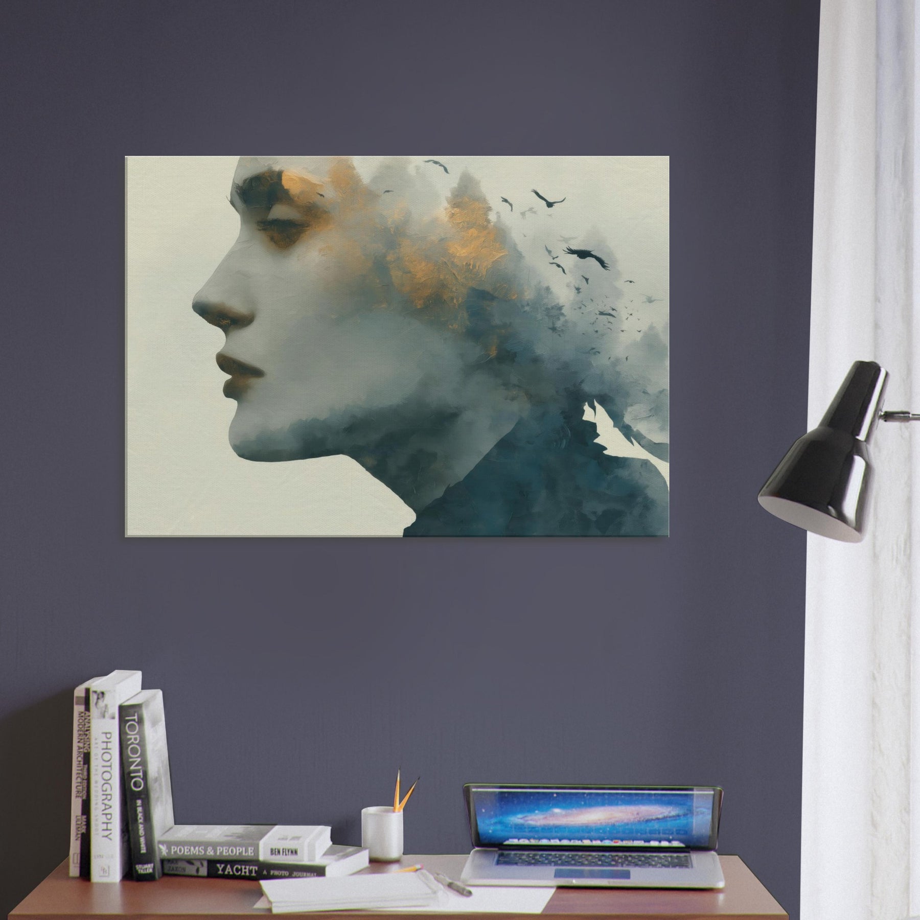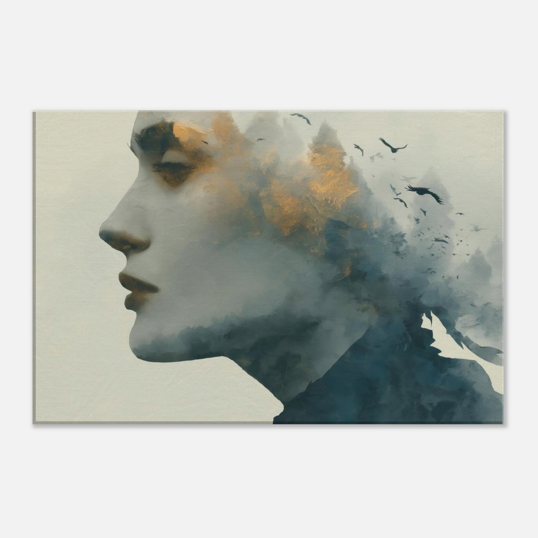 Abstract Female Face takes center stage in a dreamlike mise en scene where mist, gold flecks, and shadow converge. This Surrealism inspired wall art invites the eye to wander, letting memory drift with the birds that skim the horizon. The piece thrives in softly lit spaces, pairing well with warm neutrals or velvet textures, turning hallways into pause points and living rooms into intimate galleries.