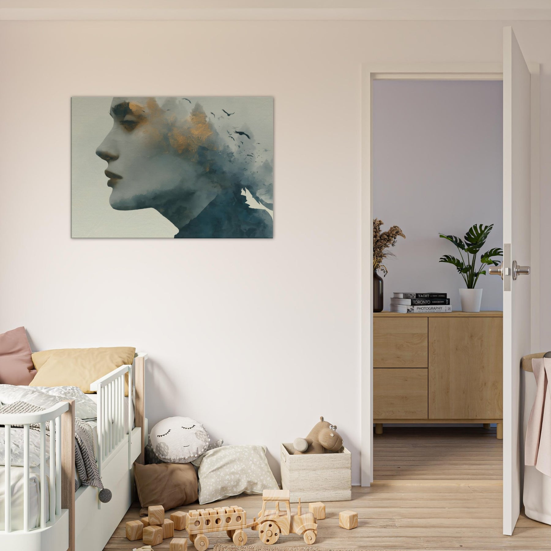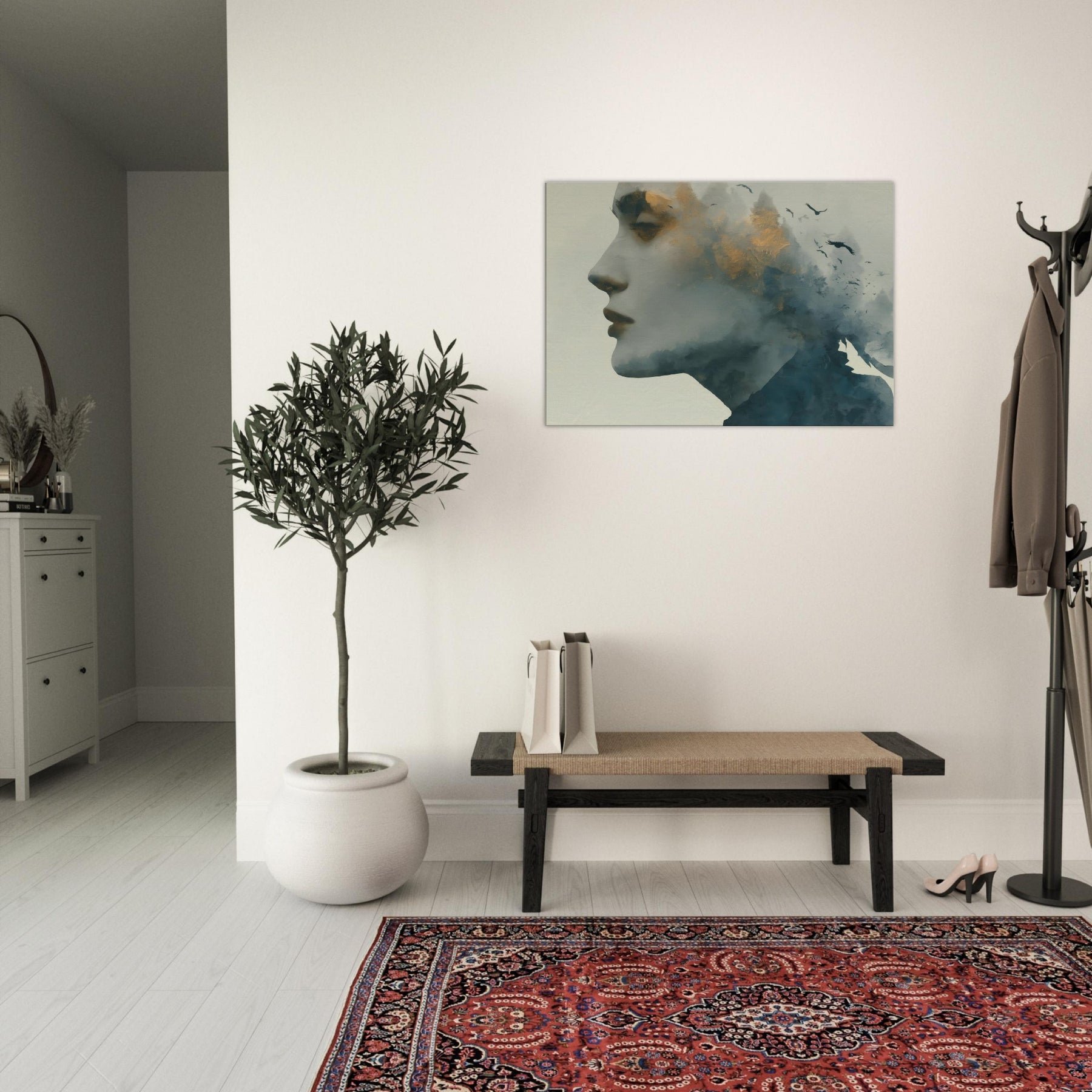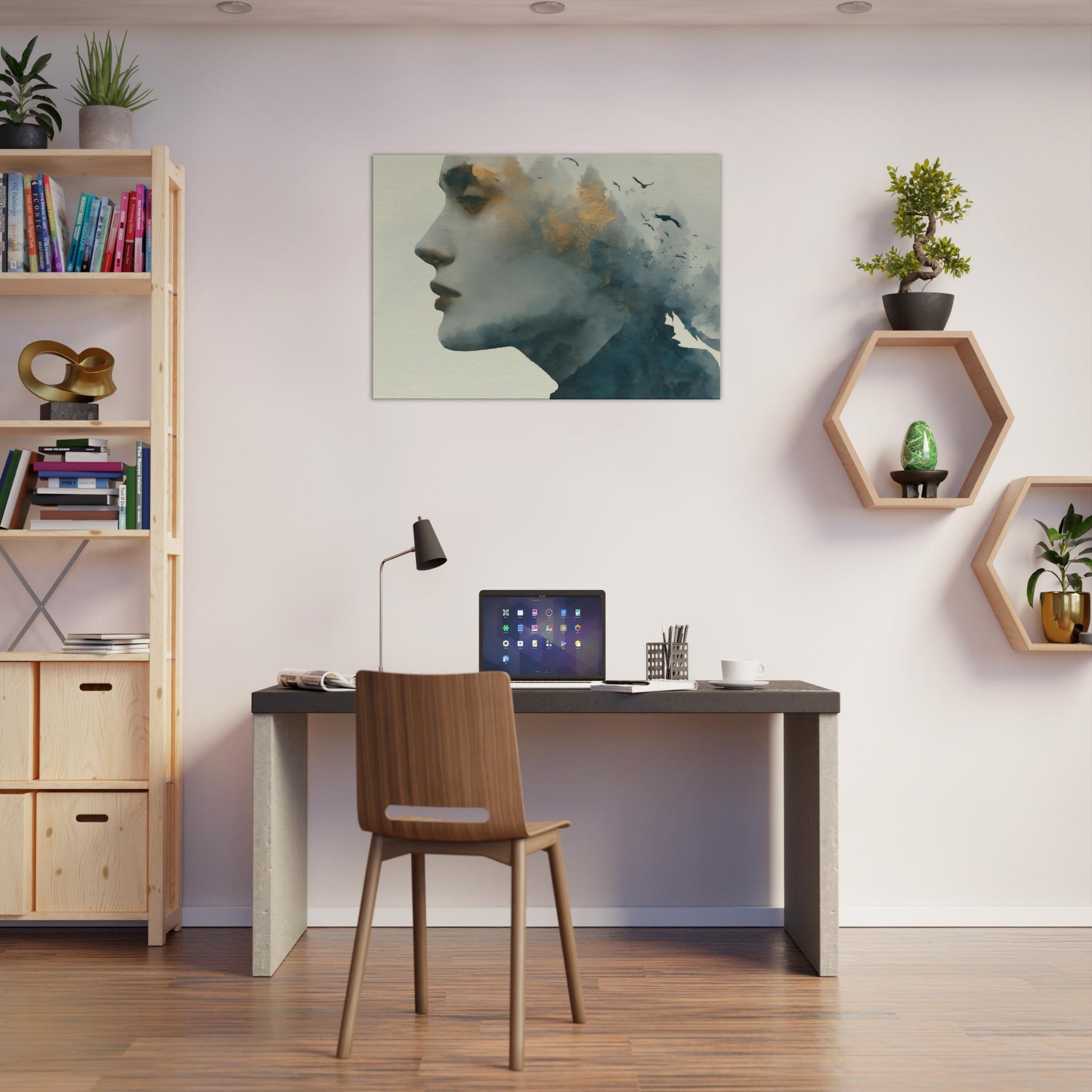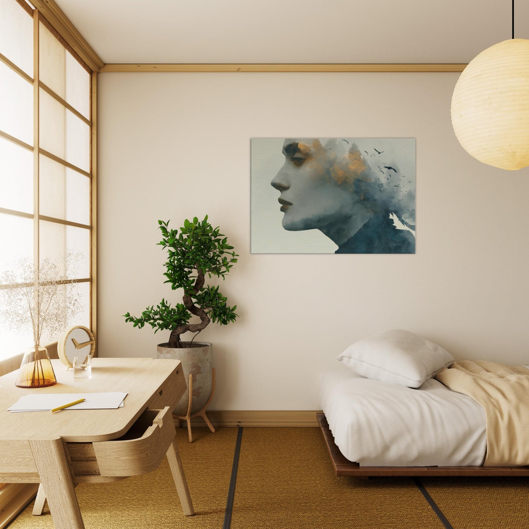 Abstract Female Face takes center stage in a dreamlike mise en scene where mist, gold flecks, and shadow converge. This Surrealism inspired wall art invites the eye to wander, letting memory drift with the birds that skim the horizon. The piece thrives in softly lit spaces, pairing well with warm neutrals or velvet textures, turning hallways into pause points and living rooms into intimate galleries.